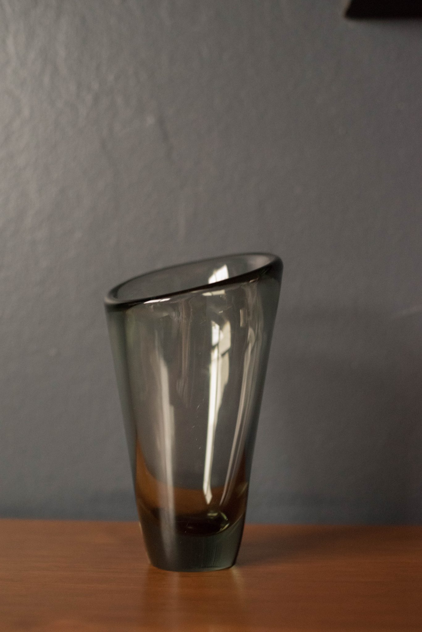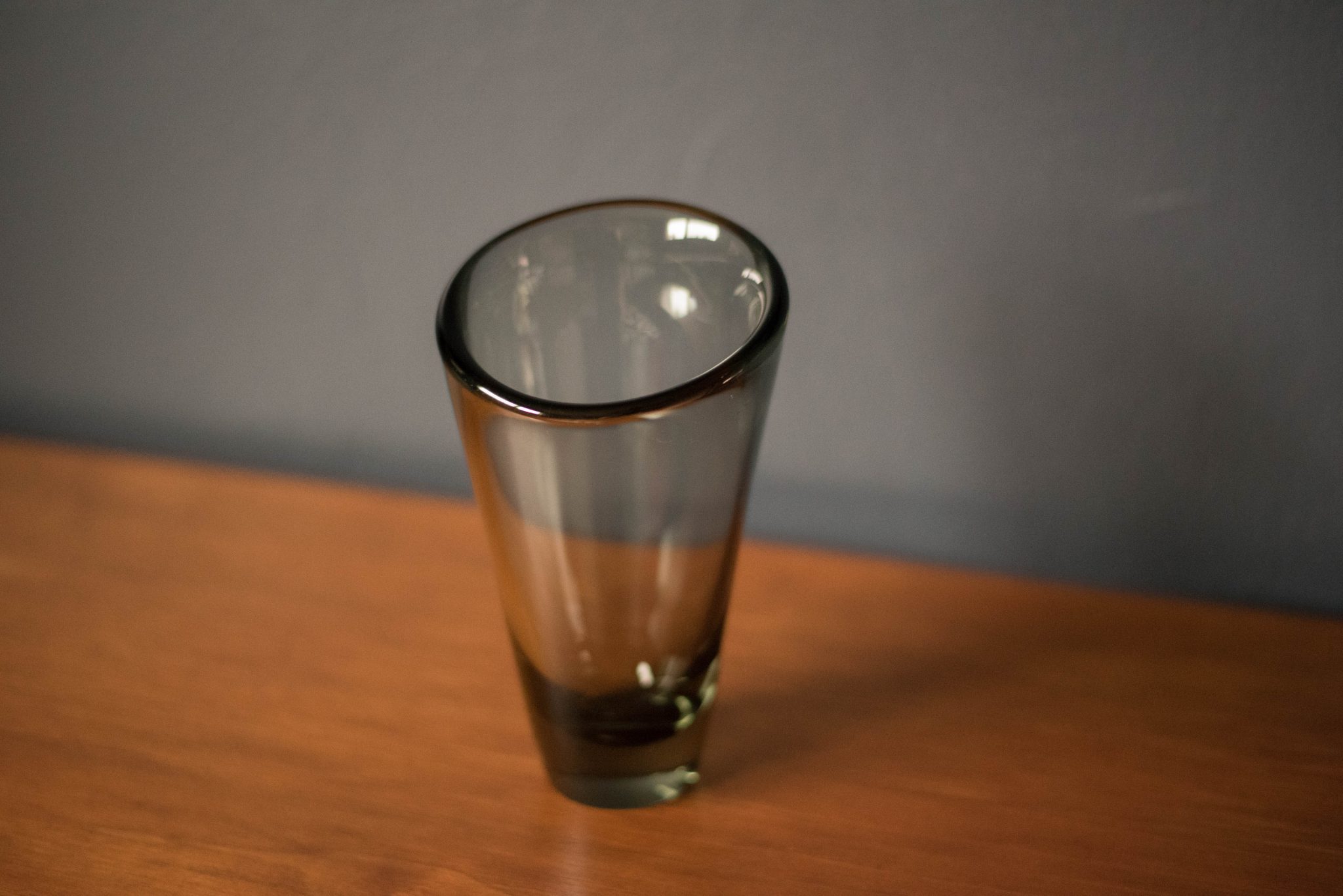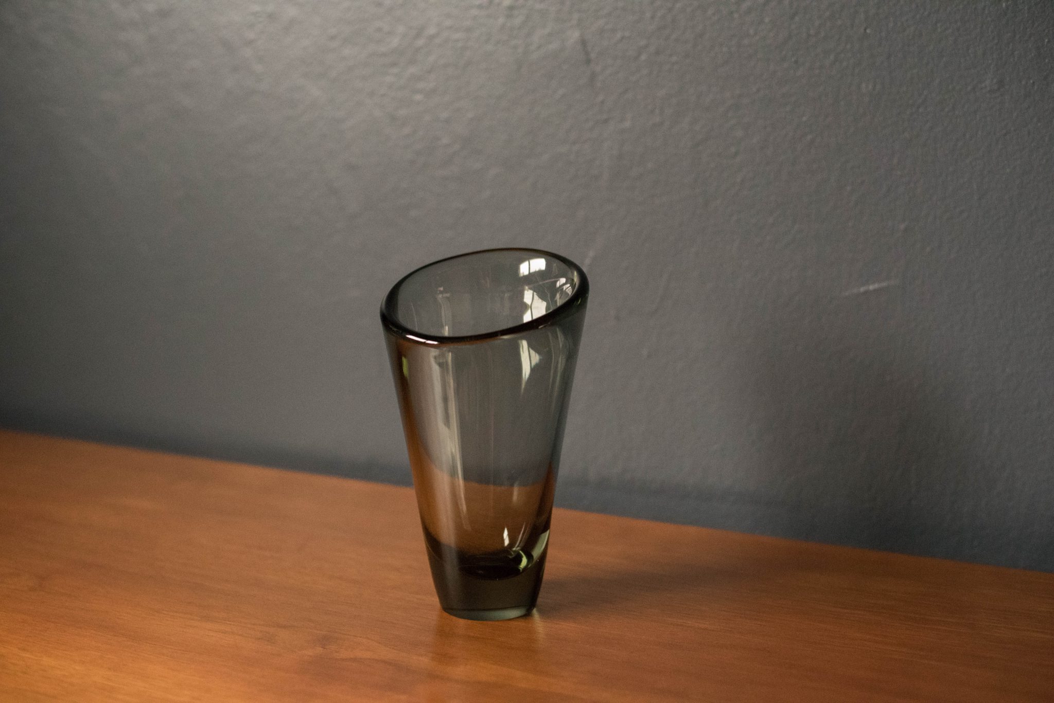 Mid-Century Modern Scandinavian “Thule” vase designed by Per Lutken for Holmegaard. This blown glass piece has a thick sculptural design tinted in smoke grey.
