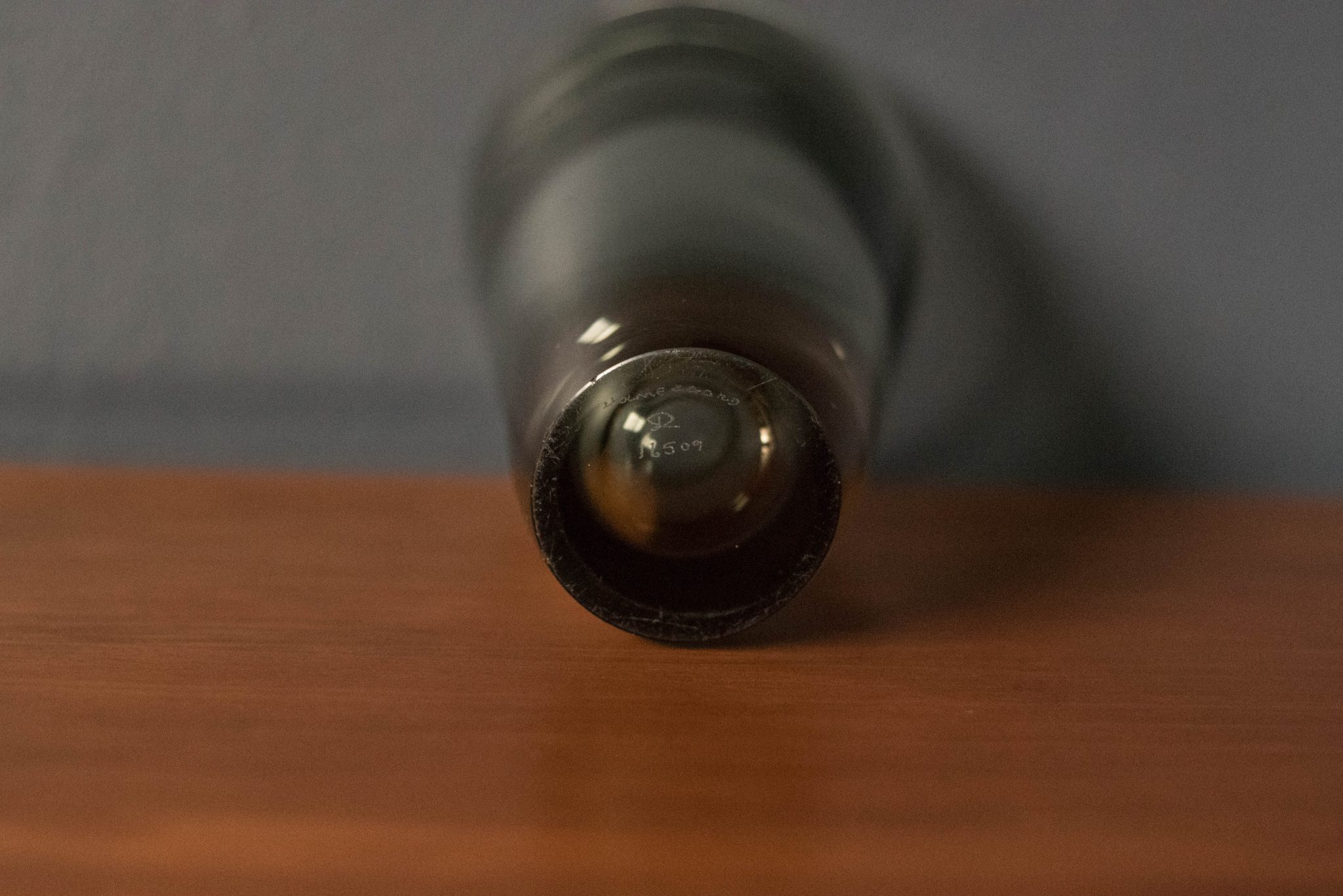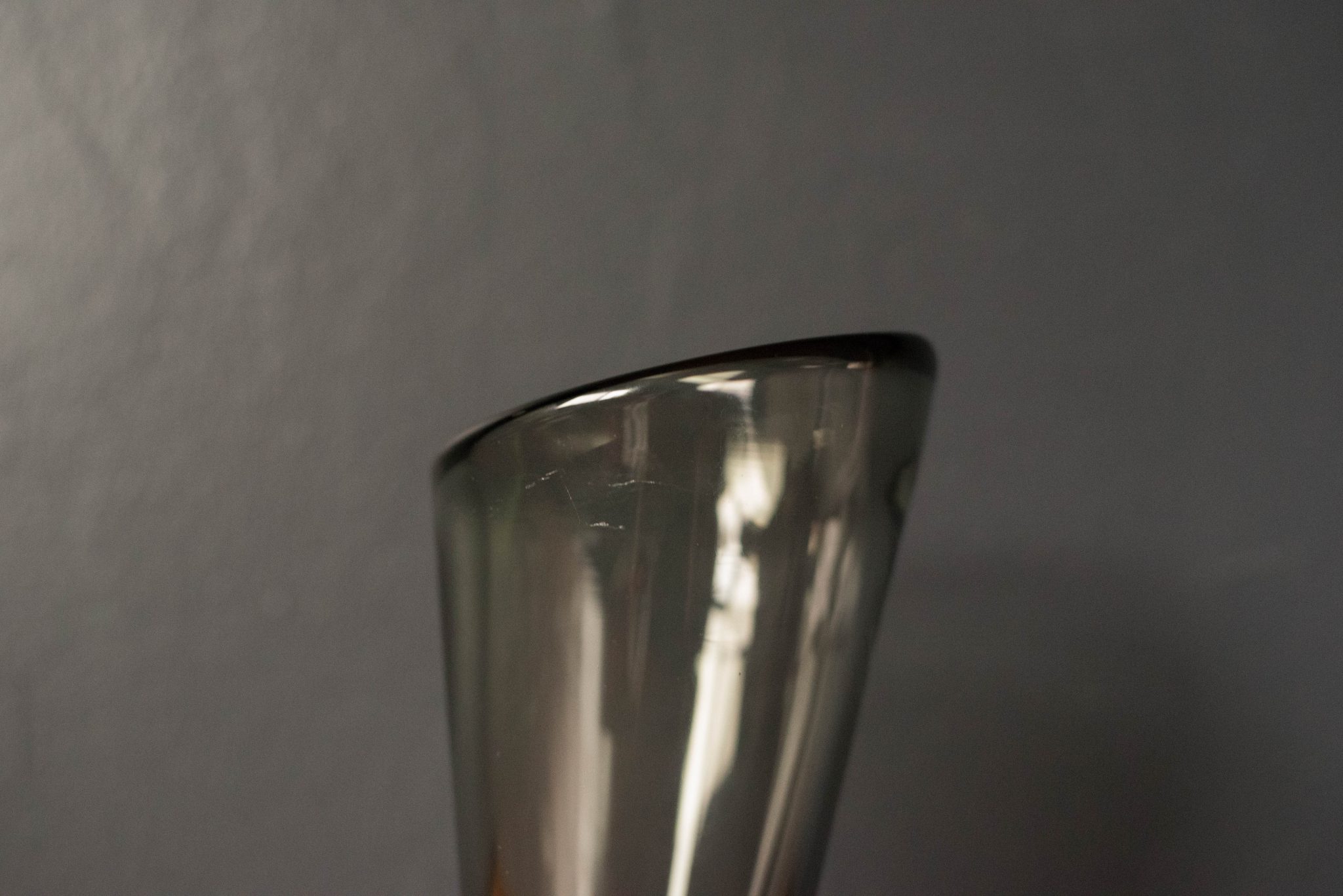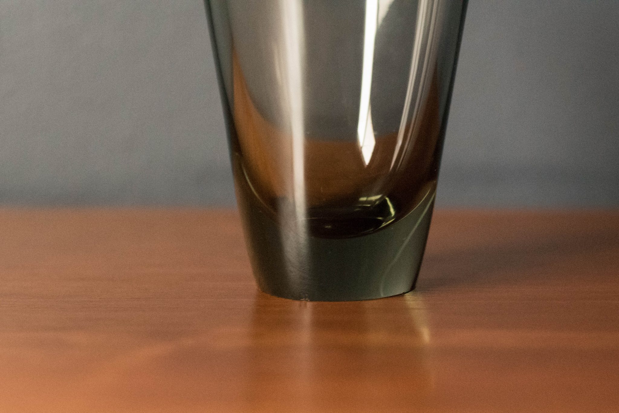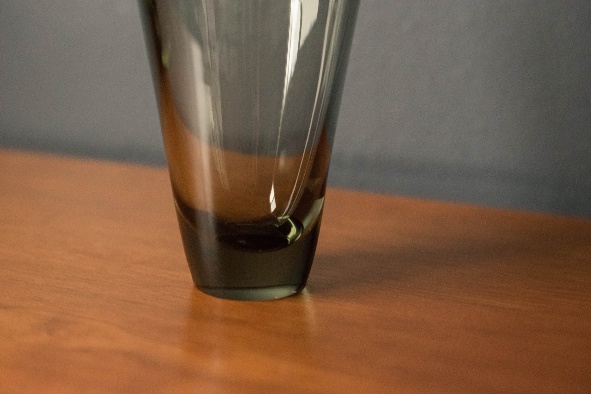 Mid-Century Modern Scandinavian “Thule” vase designed by Per Lutken for Holmegaard. This blown glass piece has a thick sculptural design tinted in smoke grey.