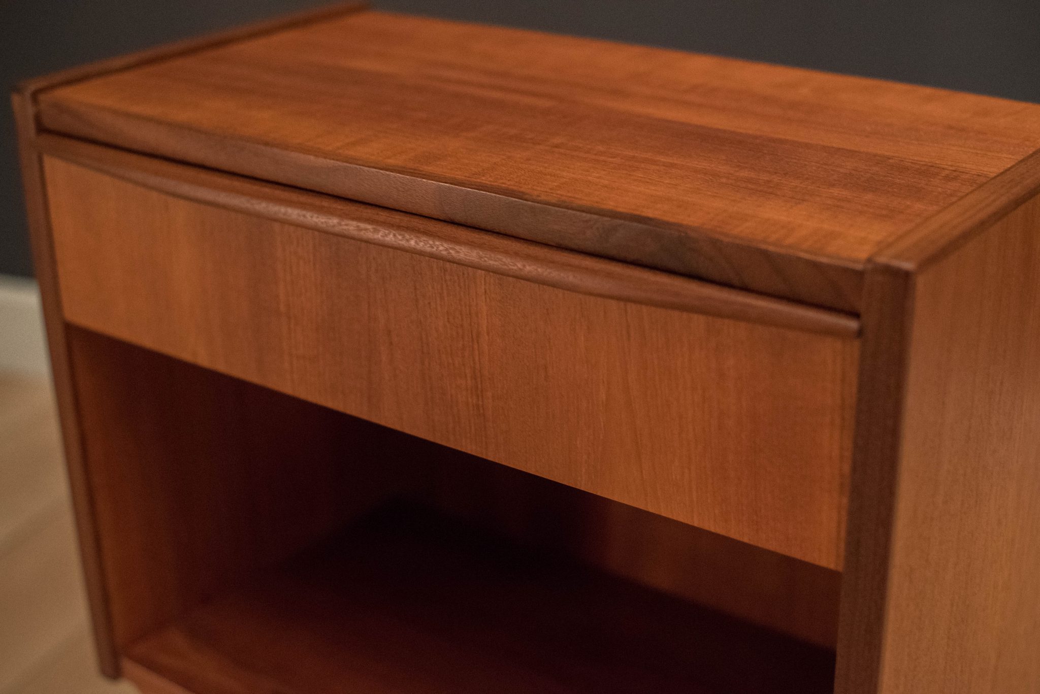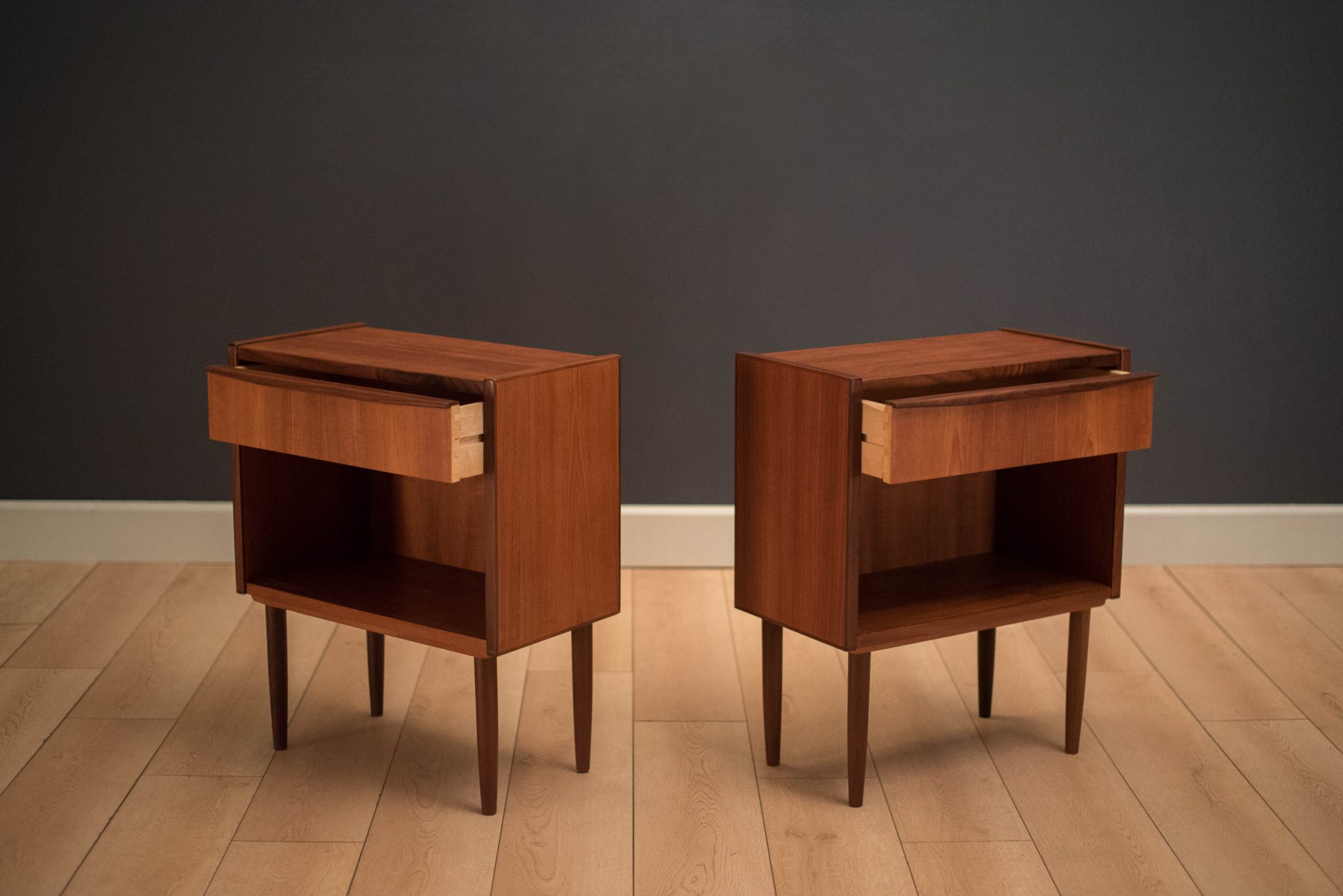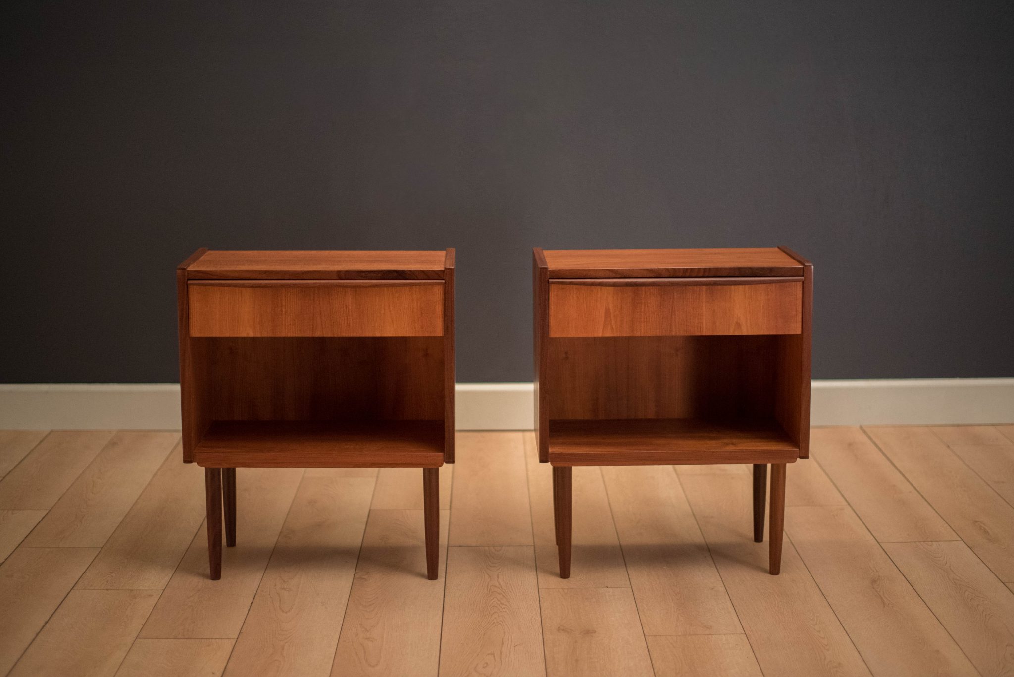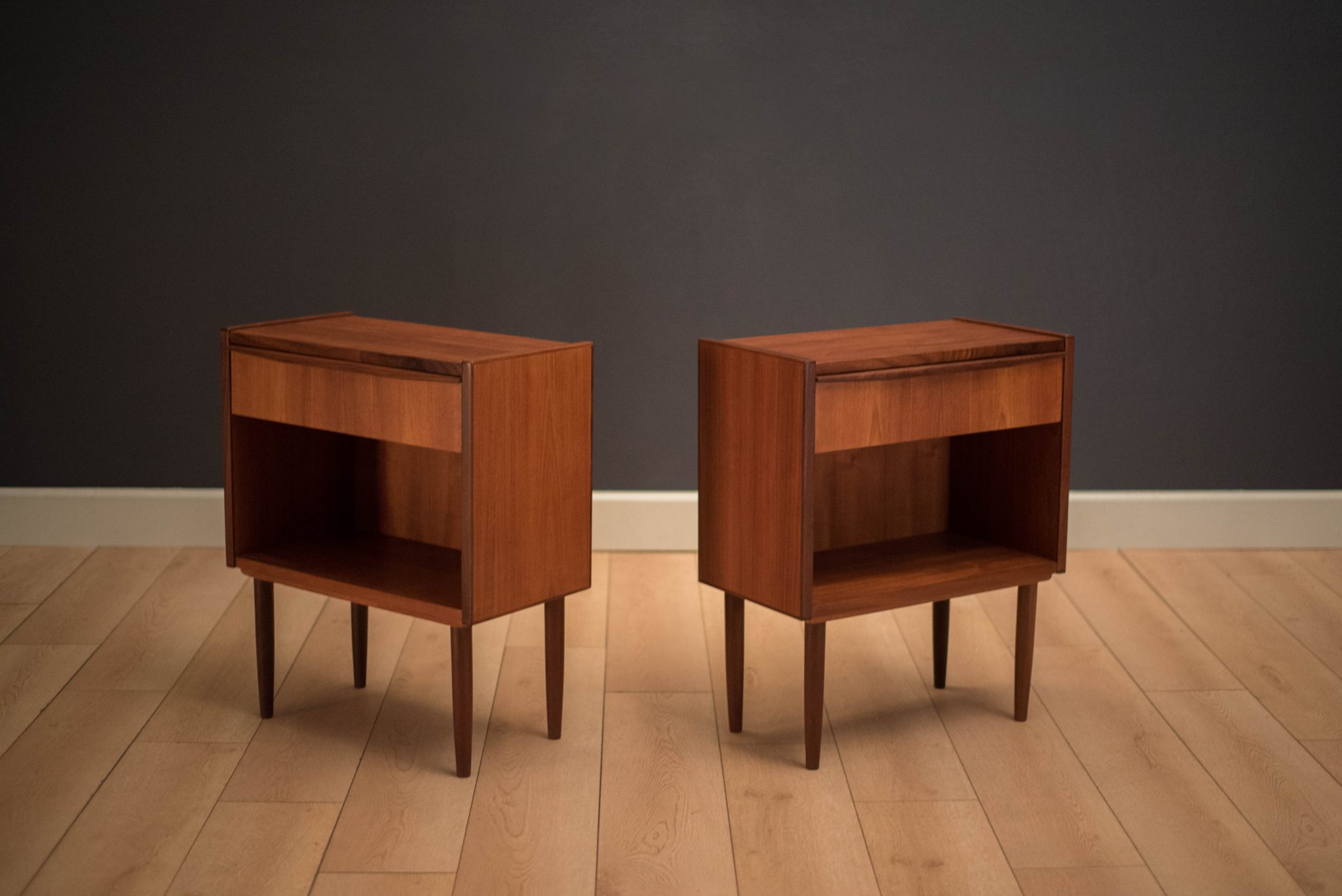 Mid century pair of bedside tables in teak made in Denmark. Each nightstand includes one dovetailed drawer with a sculpted teak handle and a lower open display shelf. Price is for the pair.