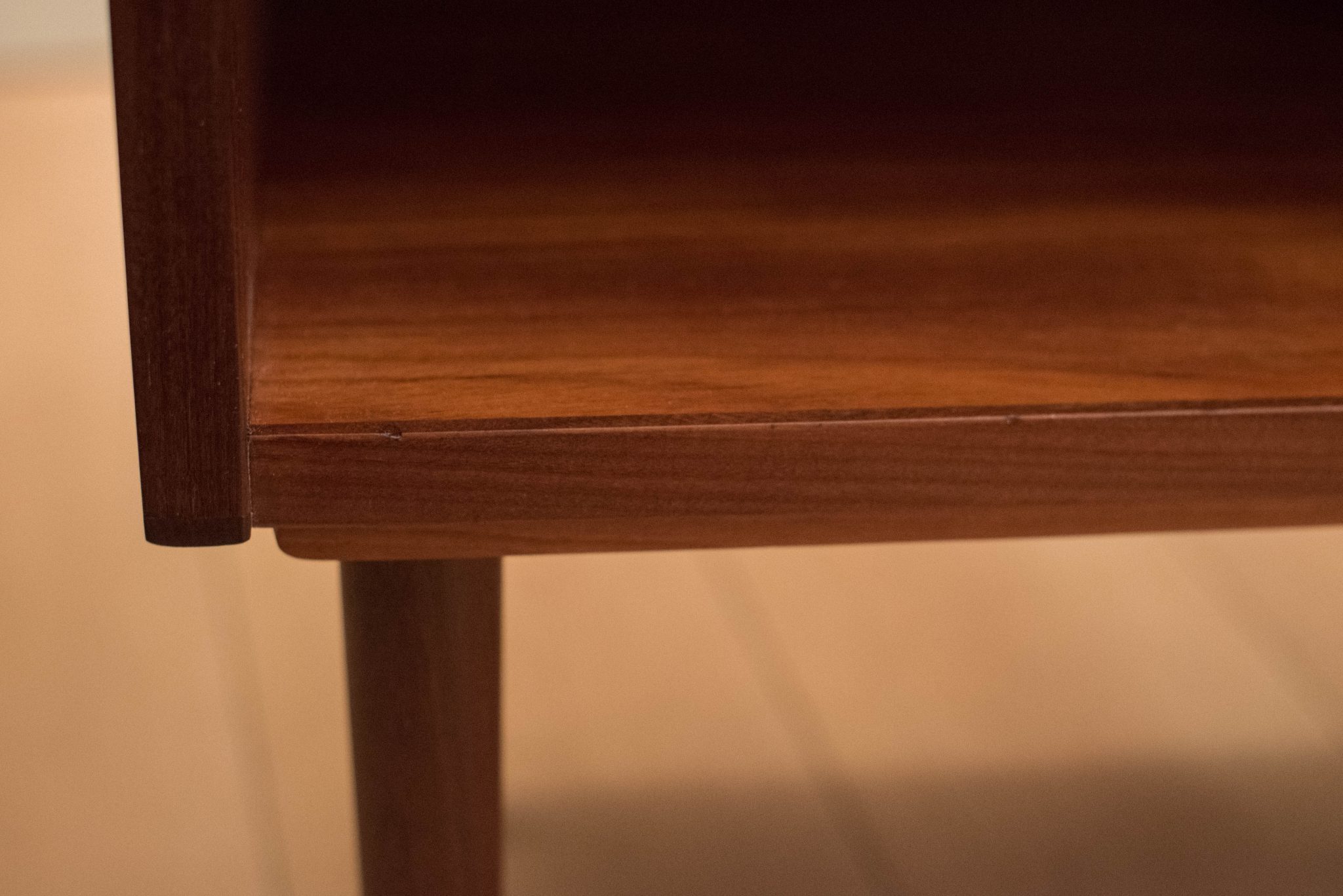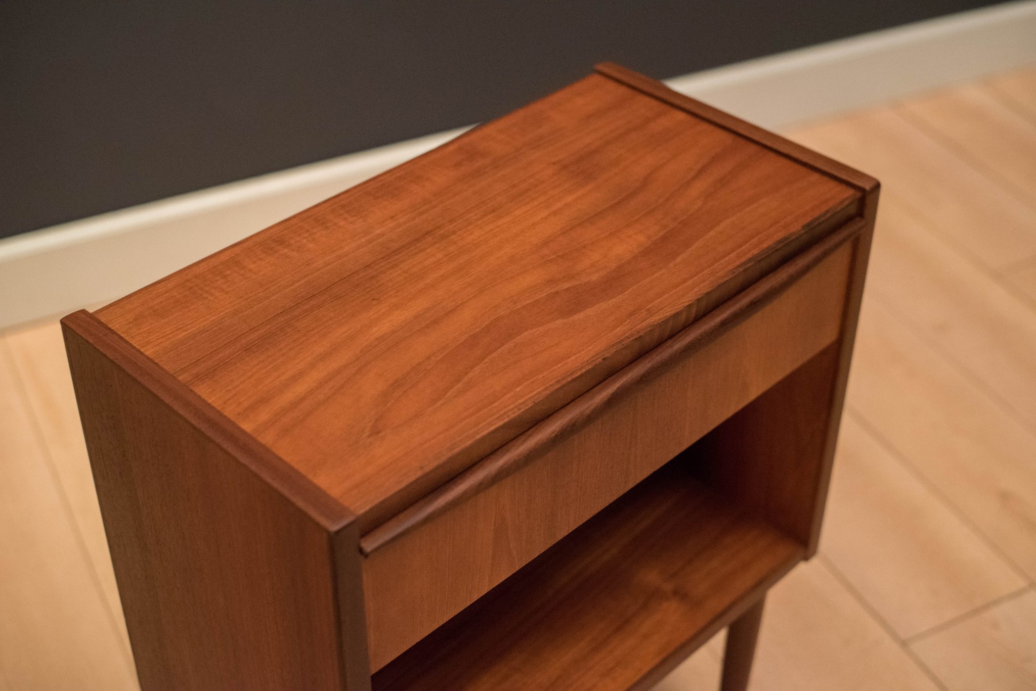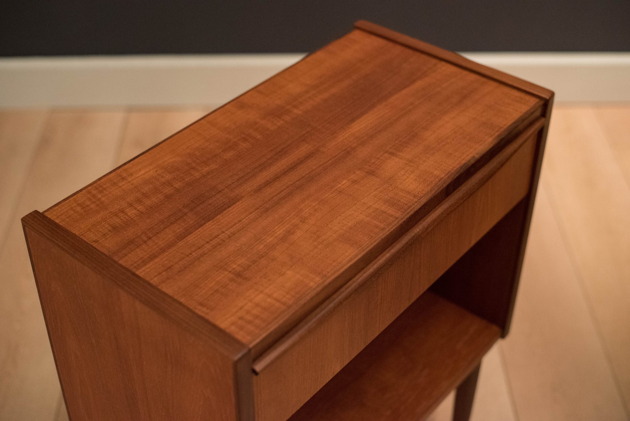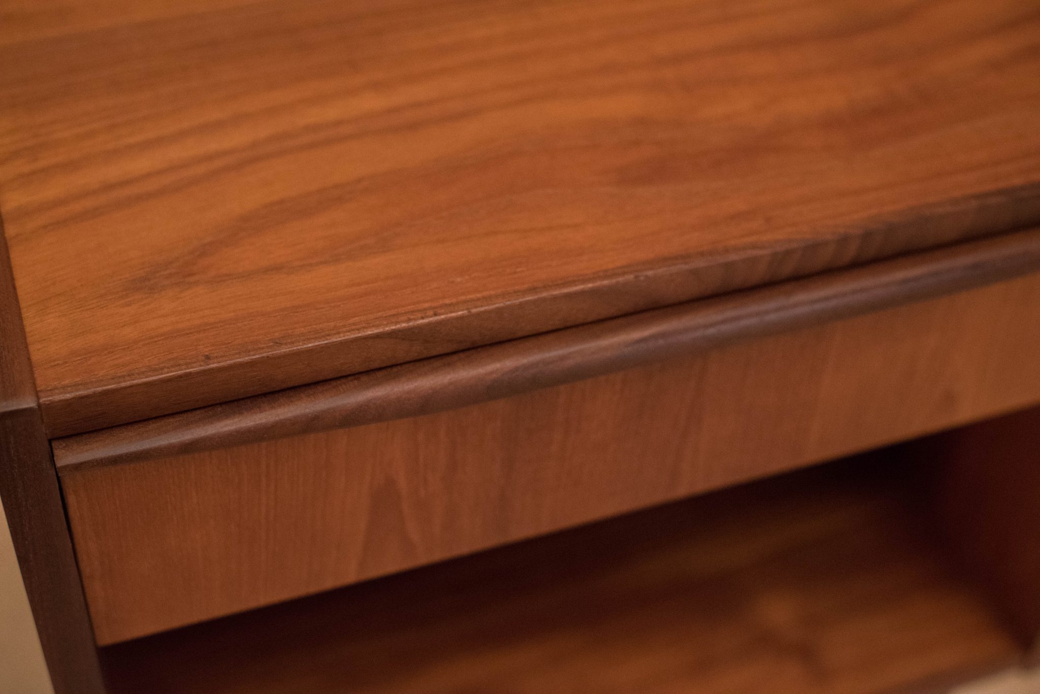 Mid century pair of bedside tables in teak made in Denmark. Each nightstand includes one dovetailed drawer with a sculpted teak handle and a lower open display shelf. Price is for the pair.