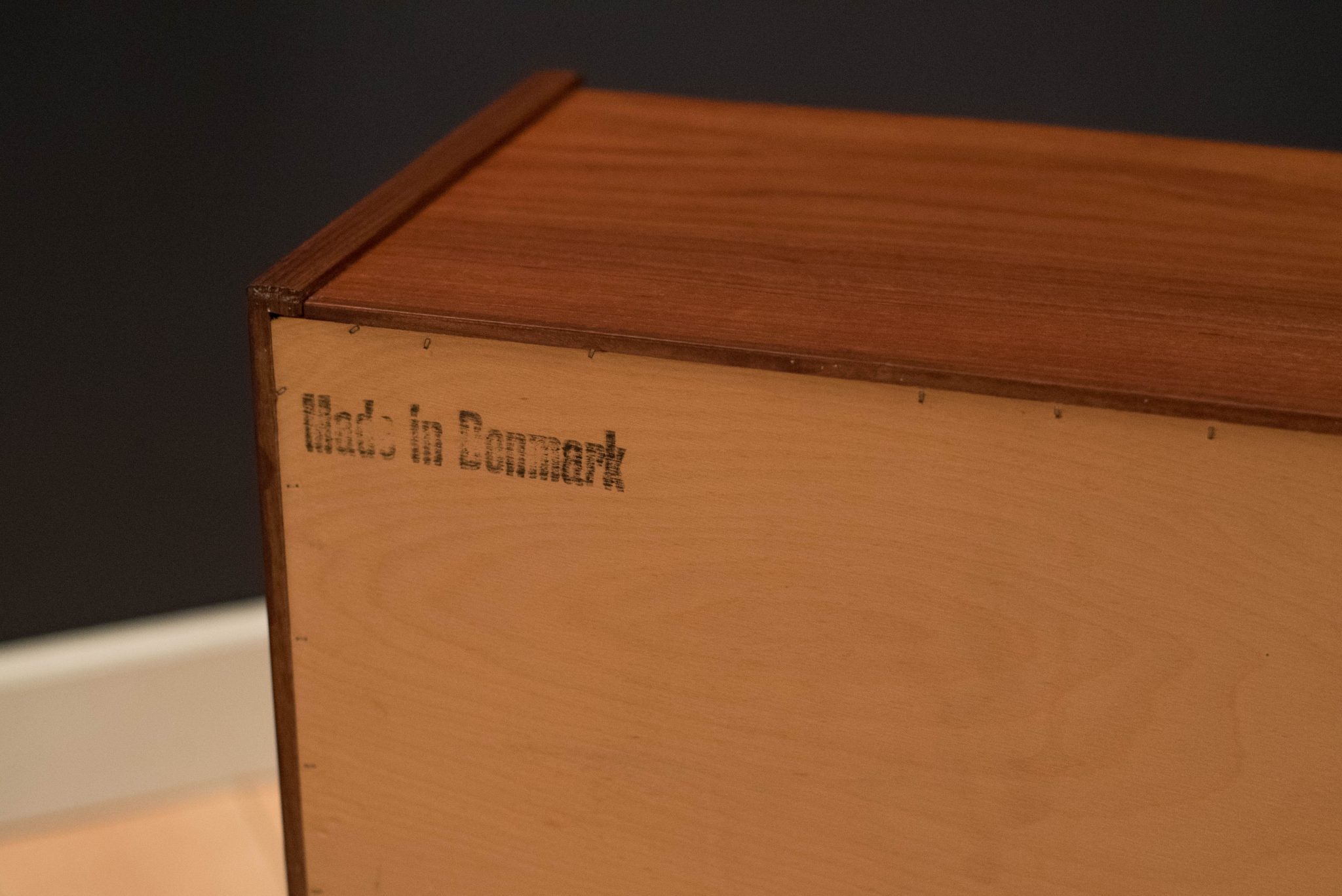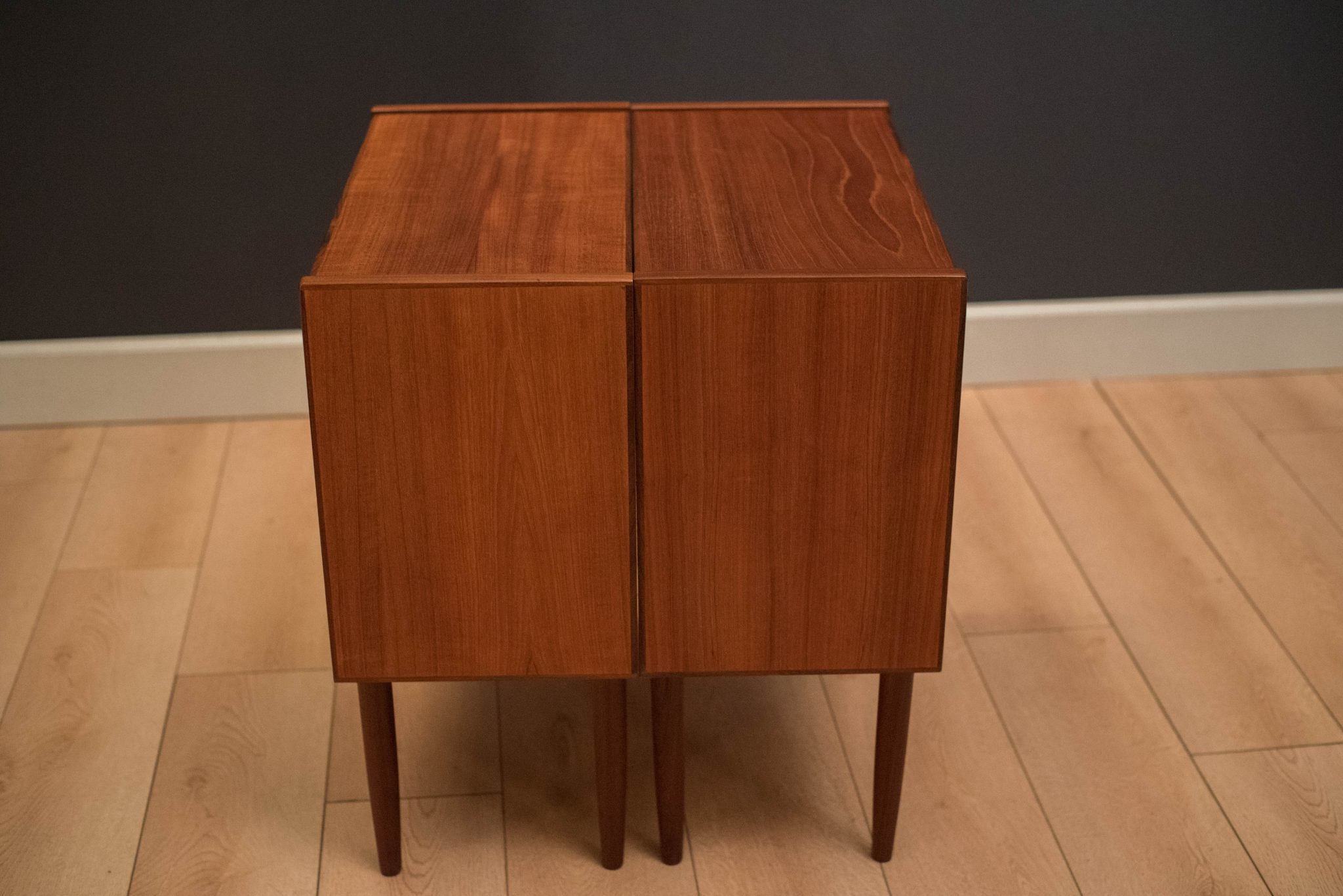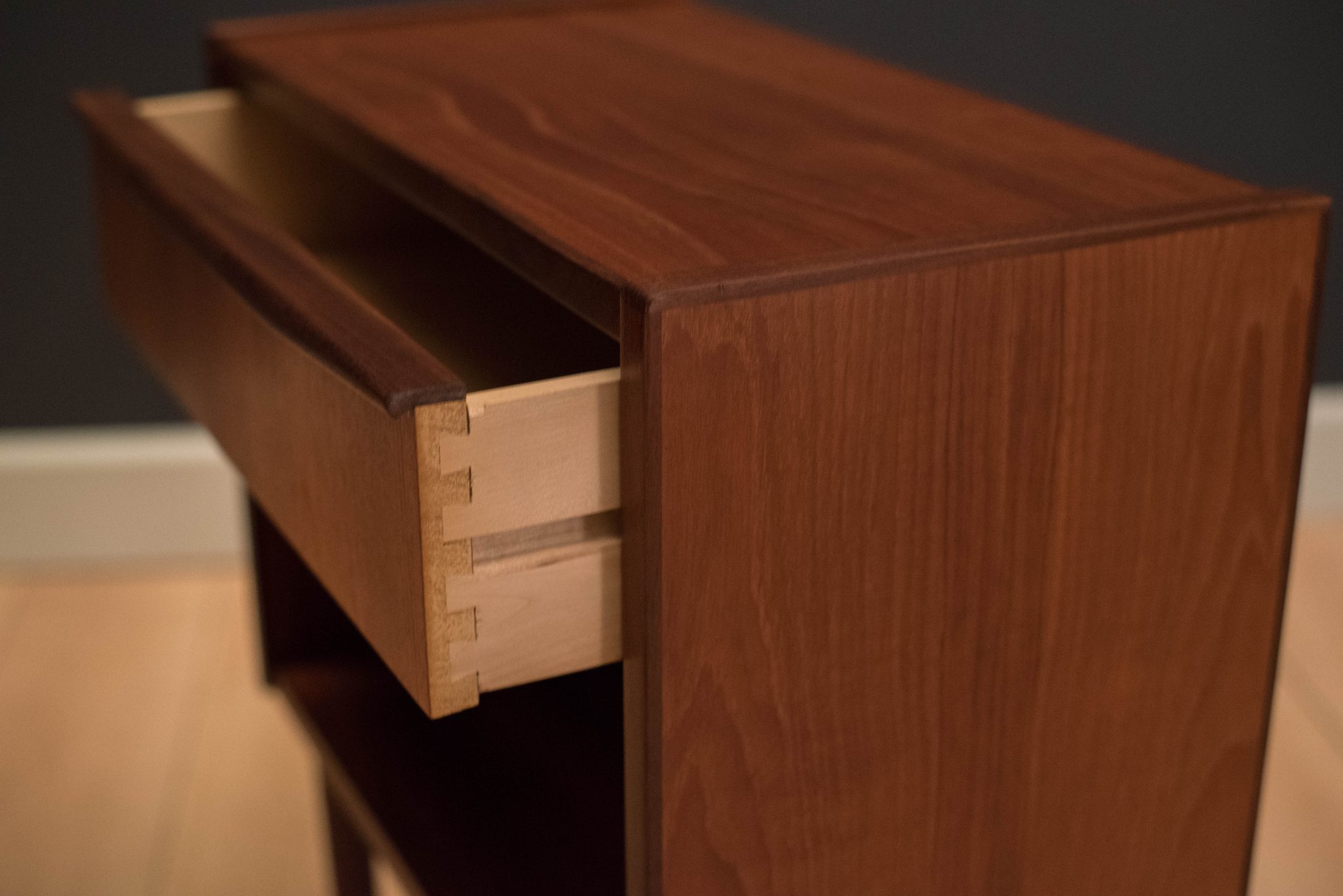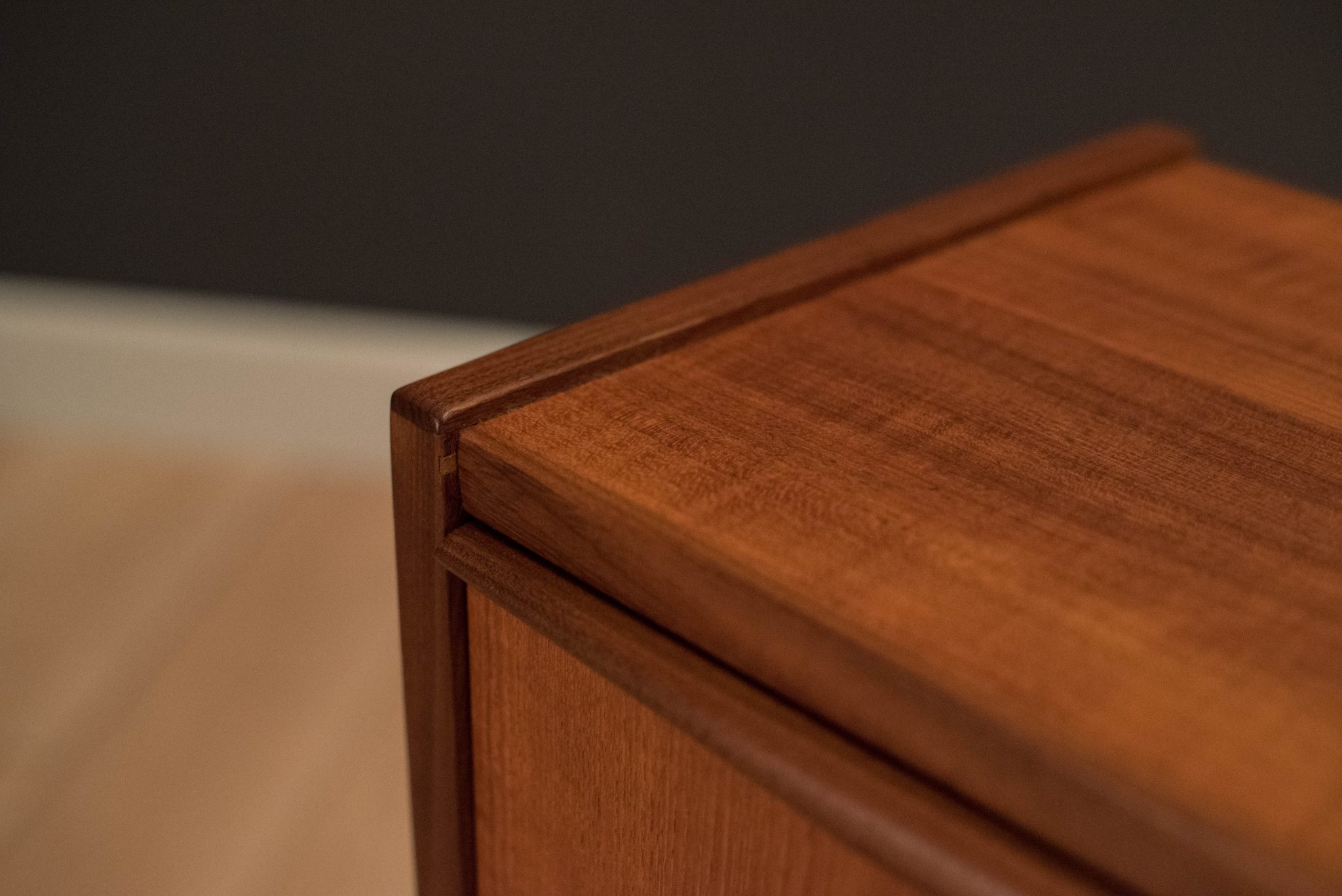 Mid century pair of bedside tables in teak made in Denmark. Each nightstand includes one dovetailed drawer with a sculpted teak handle and a lower open display shelf. Price is for the pair.