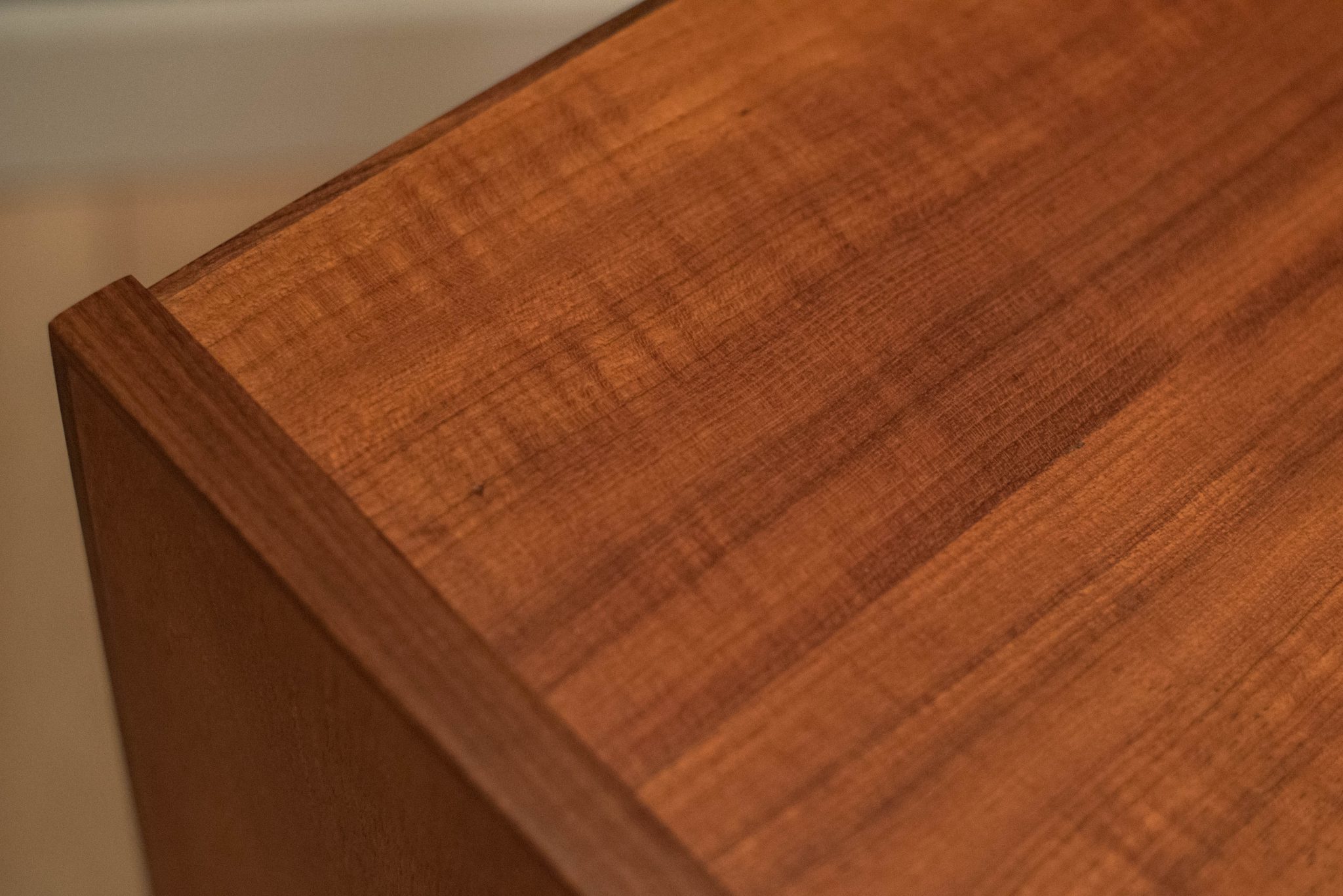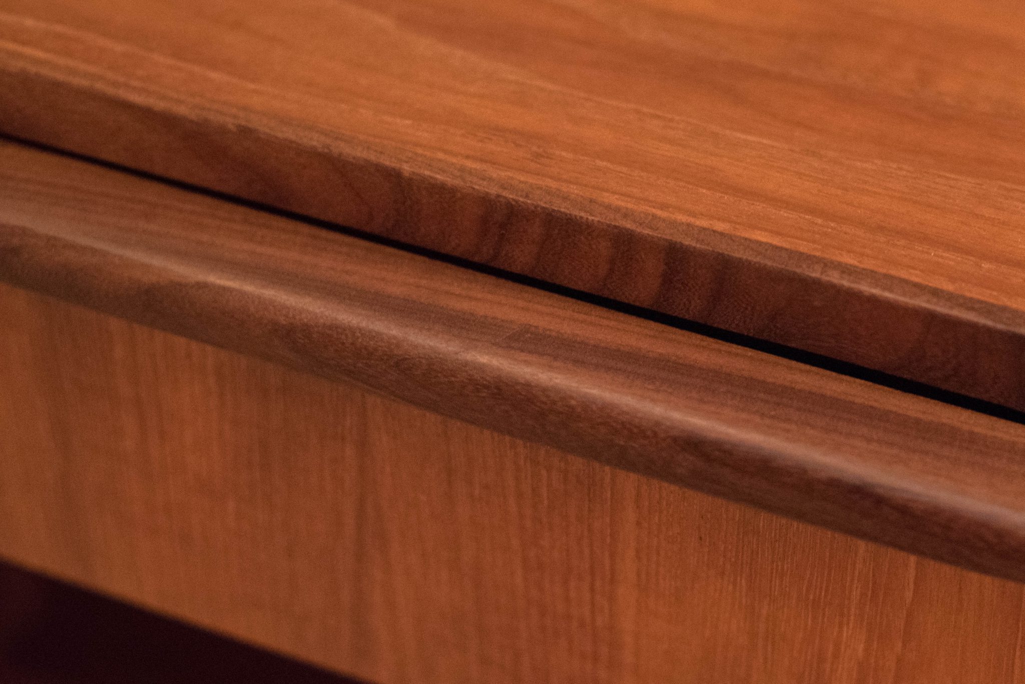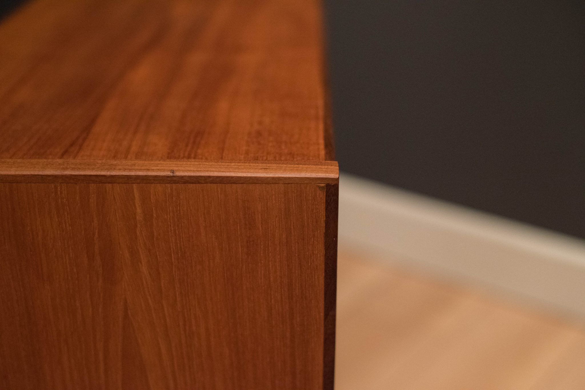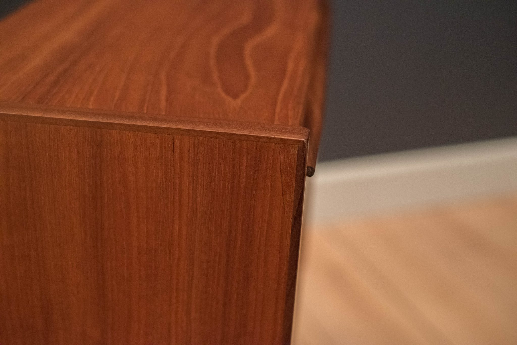 Mid century pair of bedside tables in teak made in Denmark. Each nightstand includes one dovetailed drawer with a sculpted teak handle and a lower open display shelf. Price is for the pair.
