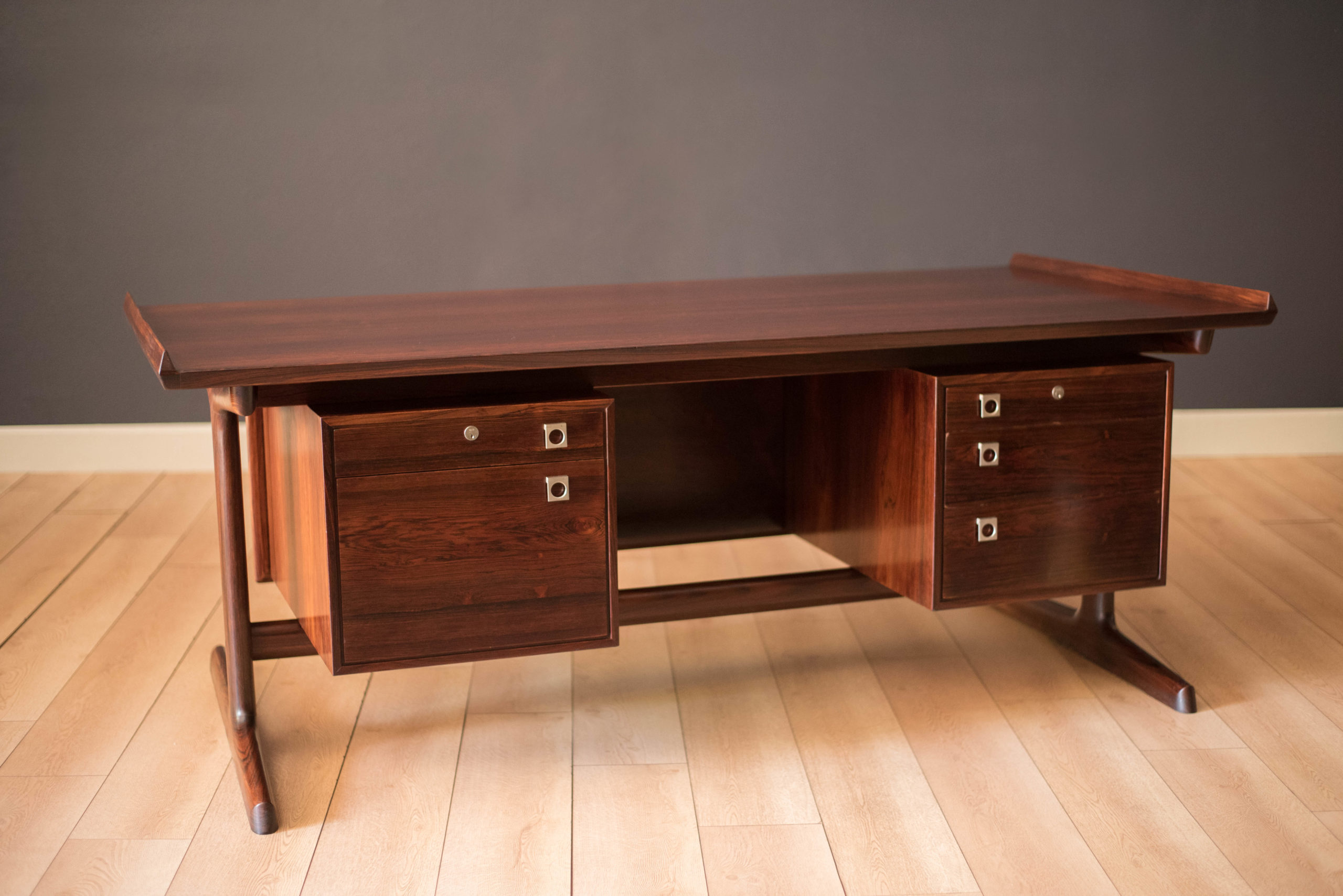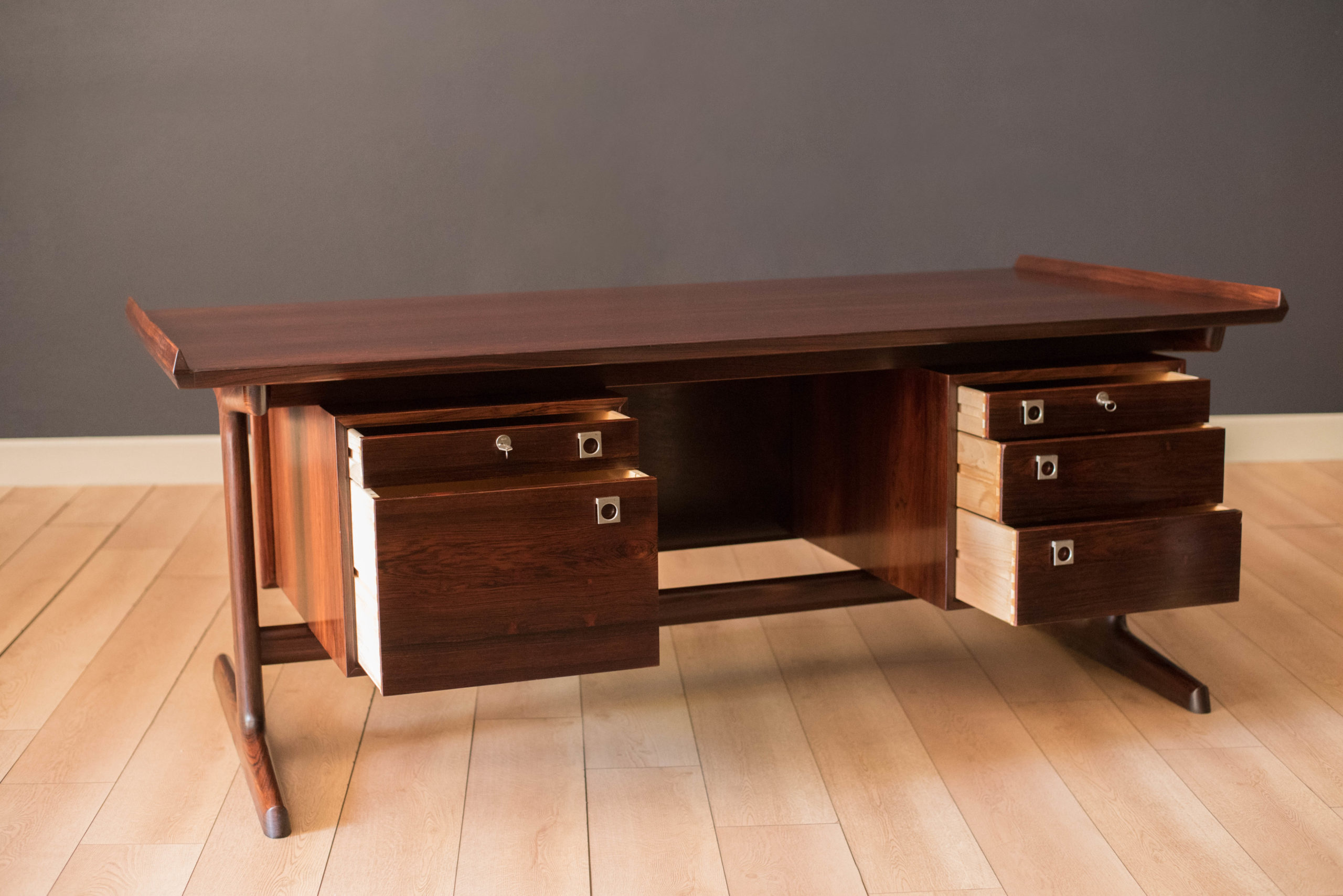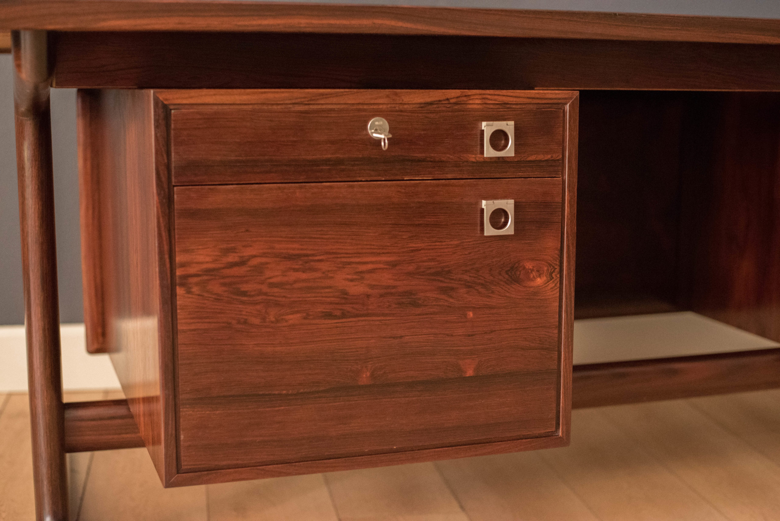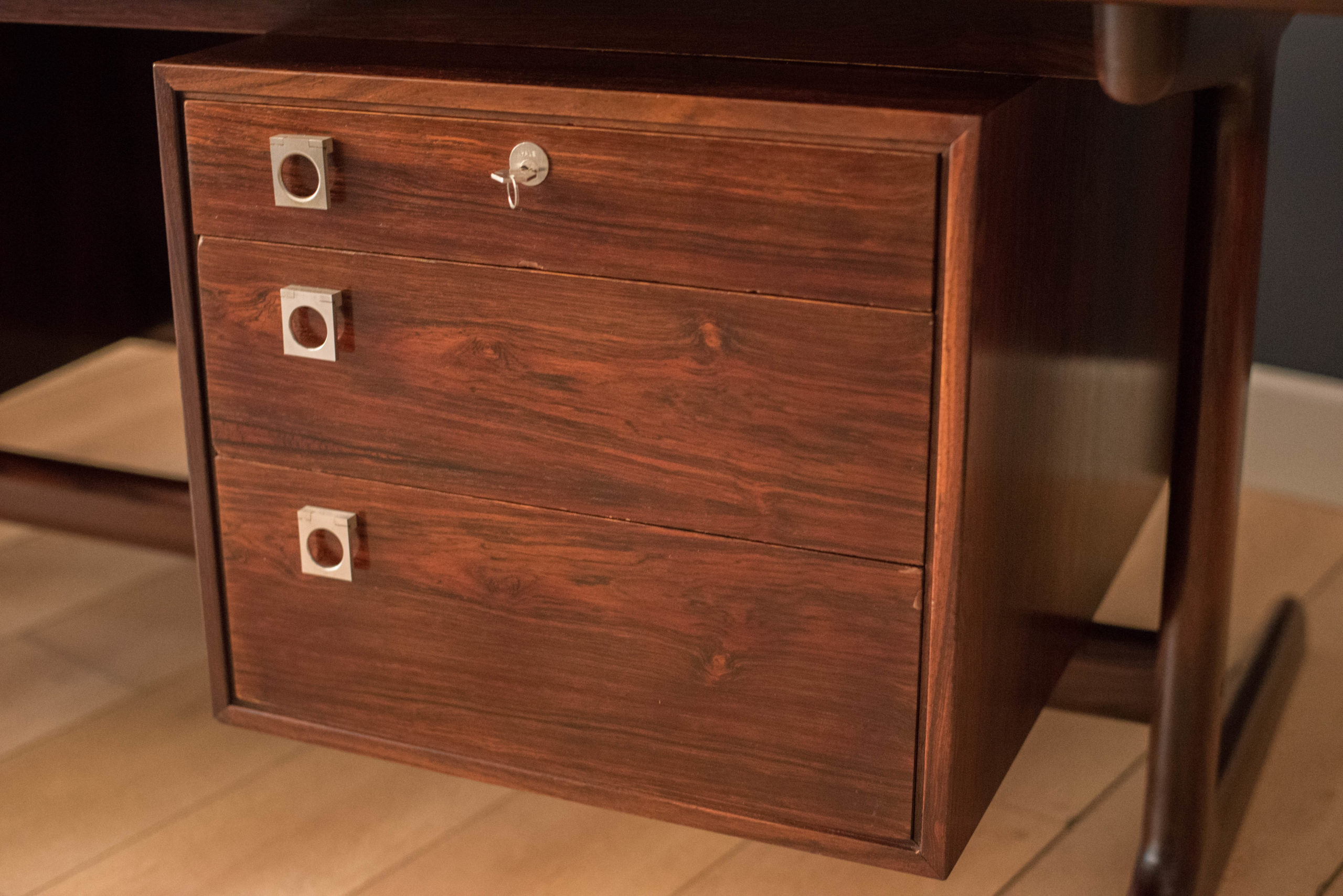 Mid-Century Modern executive desk in rosewood by H.P. Hansen, Denmark circa 1960s. Features a floating top with raised lip edges and a unique external supporting leg base. This piece offers plenty of storage equipped with five dovetailed drawers accented with steel pulls including one deep file drawer. Complete with a finished backside making it easy to showcase from any angle. Original locking keys included.