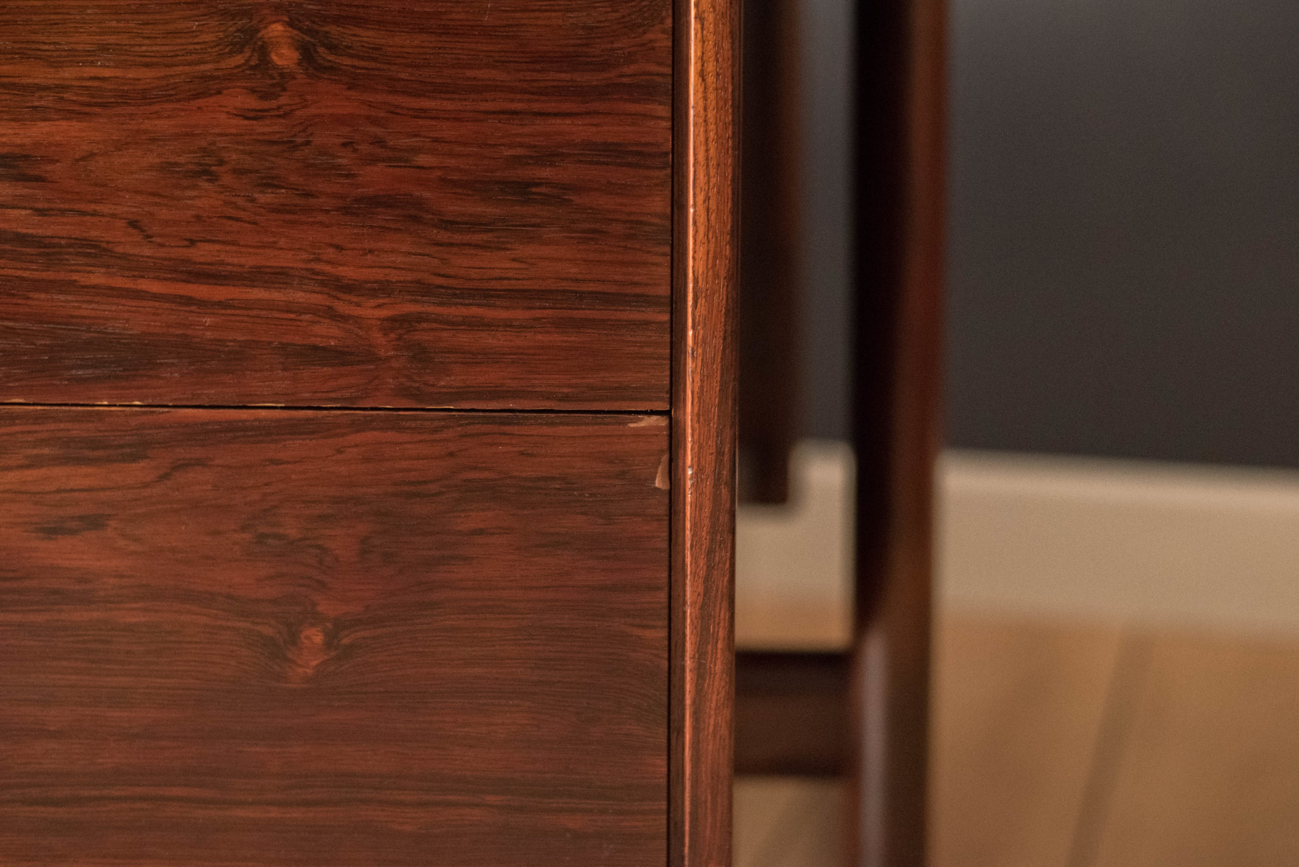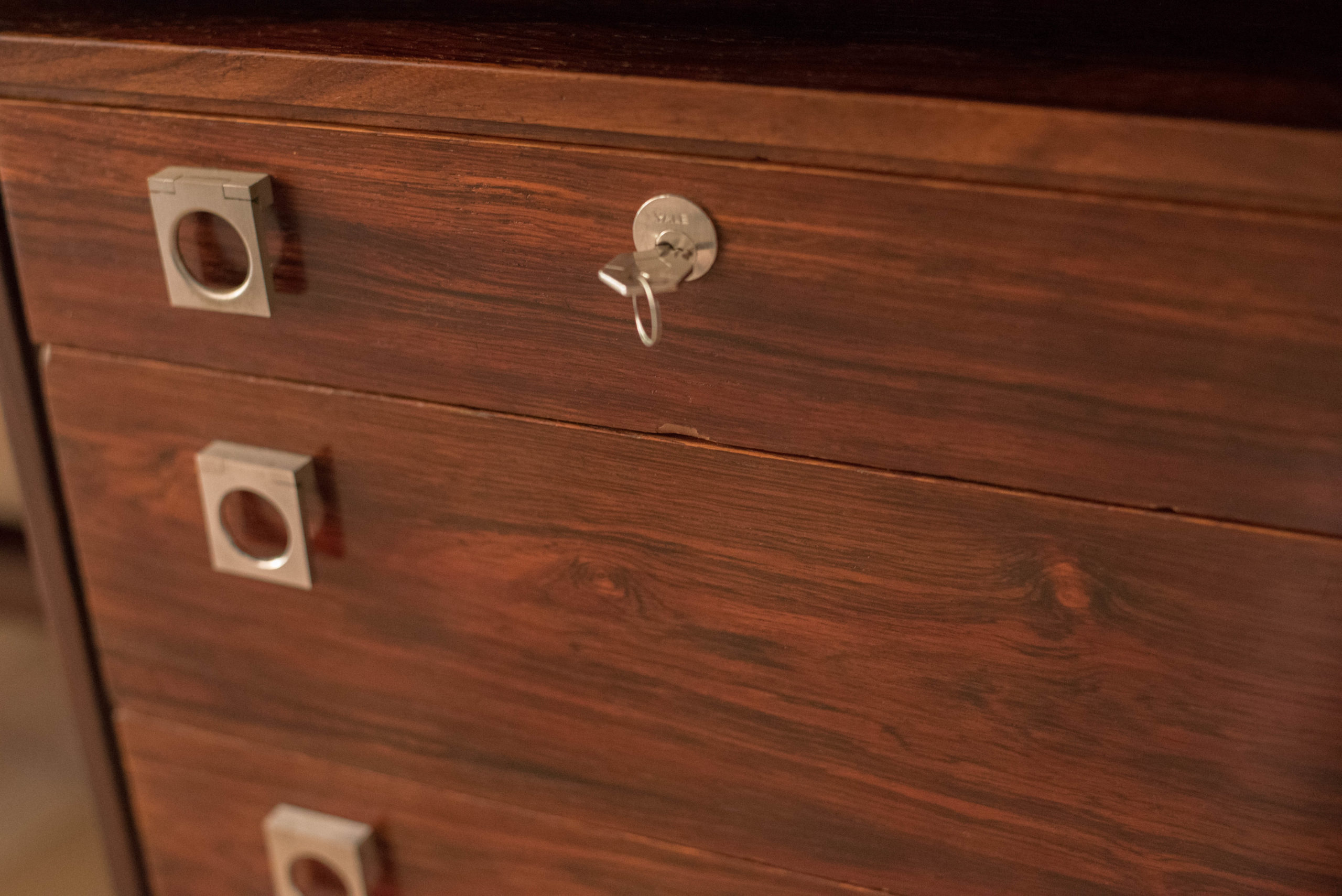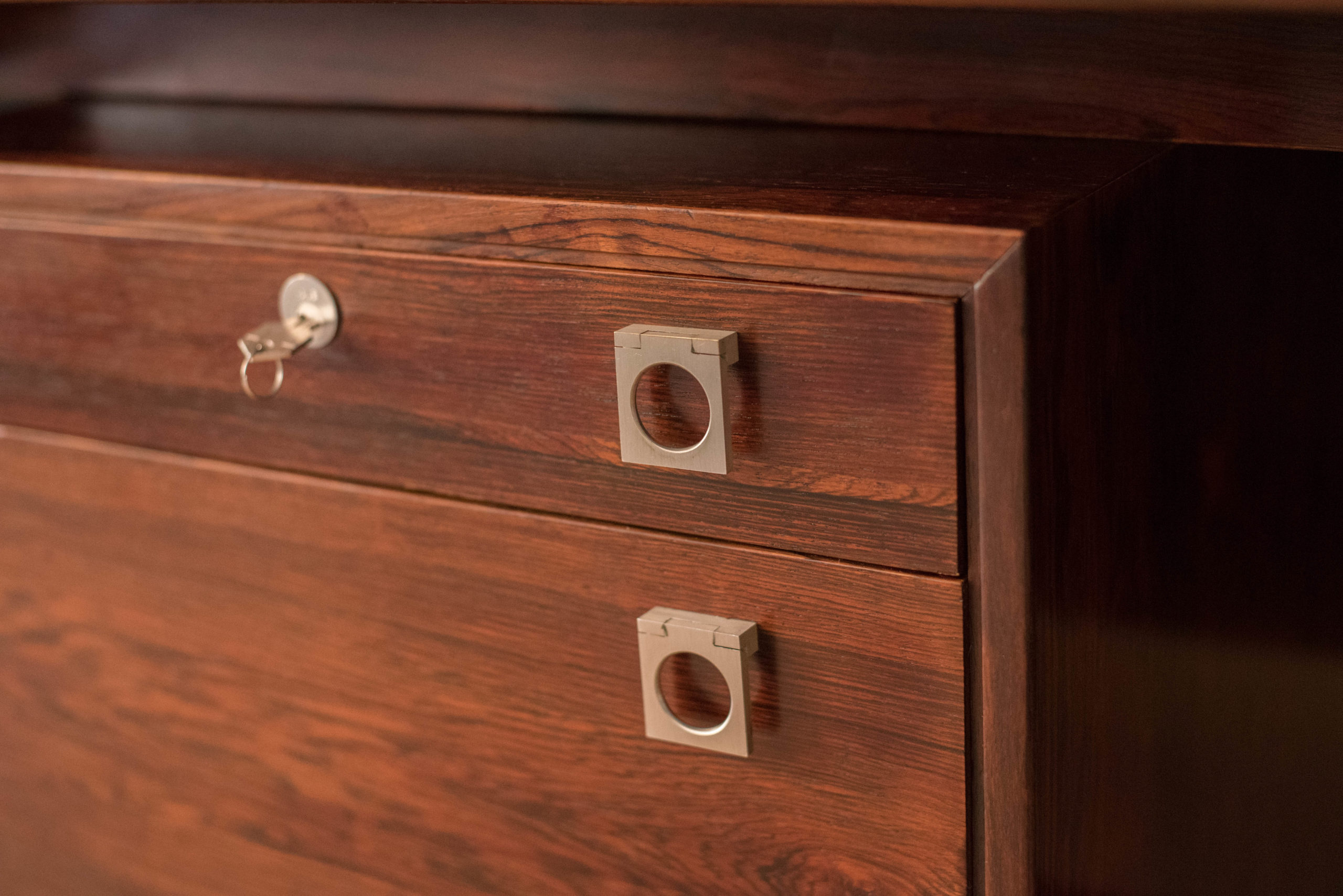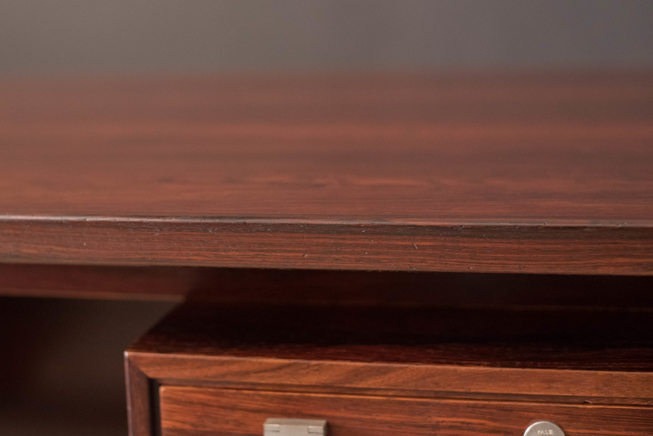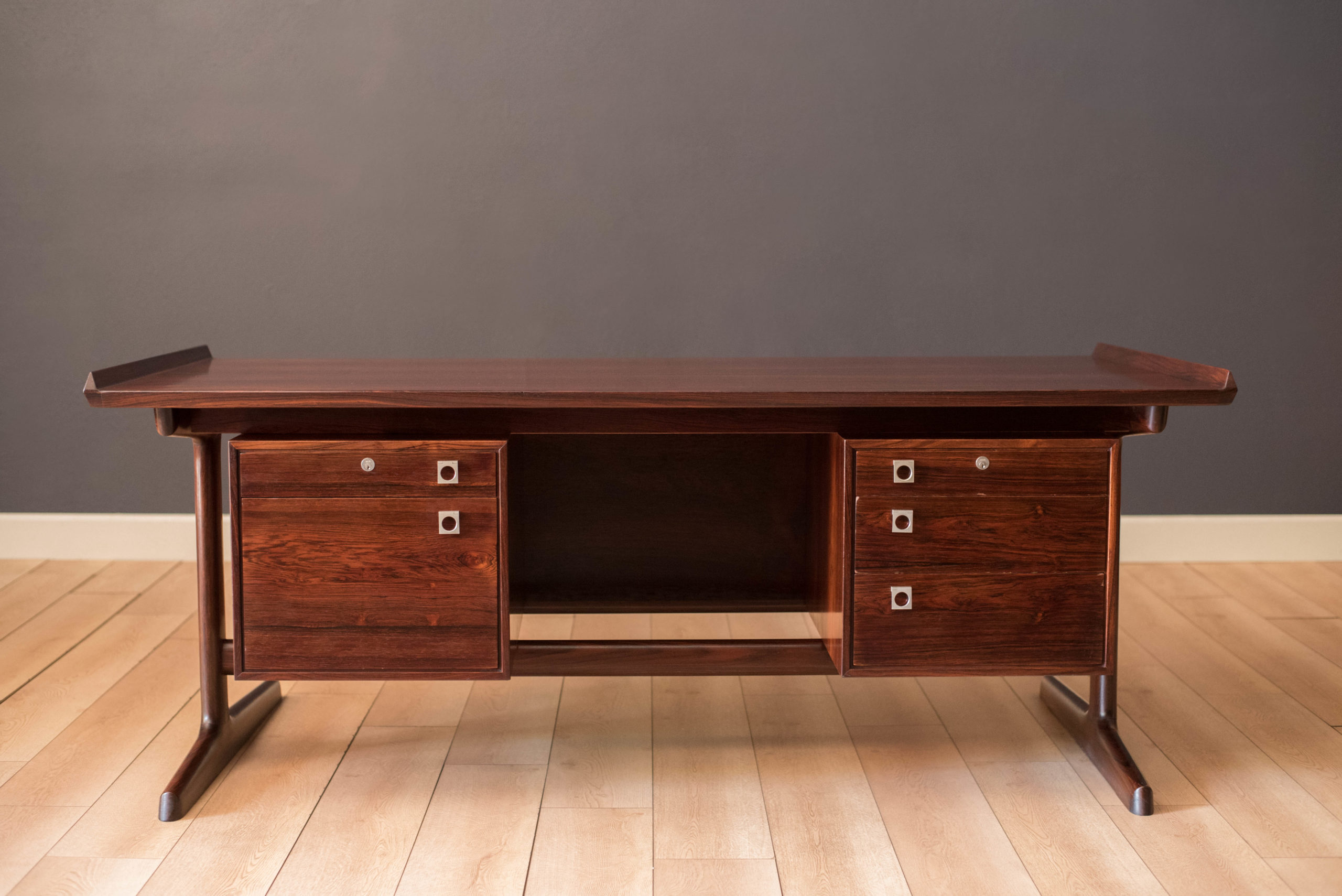 Mid-Century Modern executive desk in rosewood by H.P. Hansen, Denmark circa 1960s. Features a floating top with raised lip edges and a unique external supporting leg base. This piece offers plenty of storage equipped with five dovetailed drawers accented with steel pulls including one deep file drawer. Complete with a finished backside making it easy to showcase from any angle. Original locking keys included.