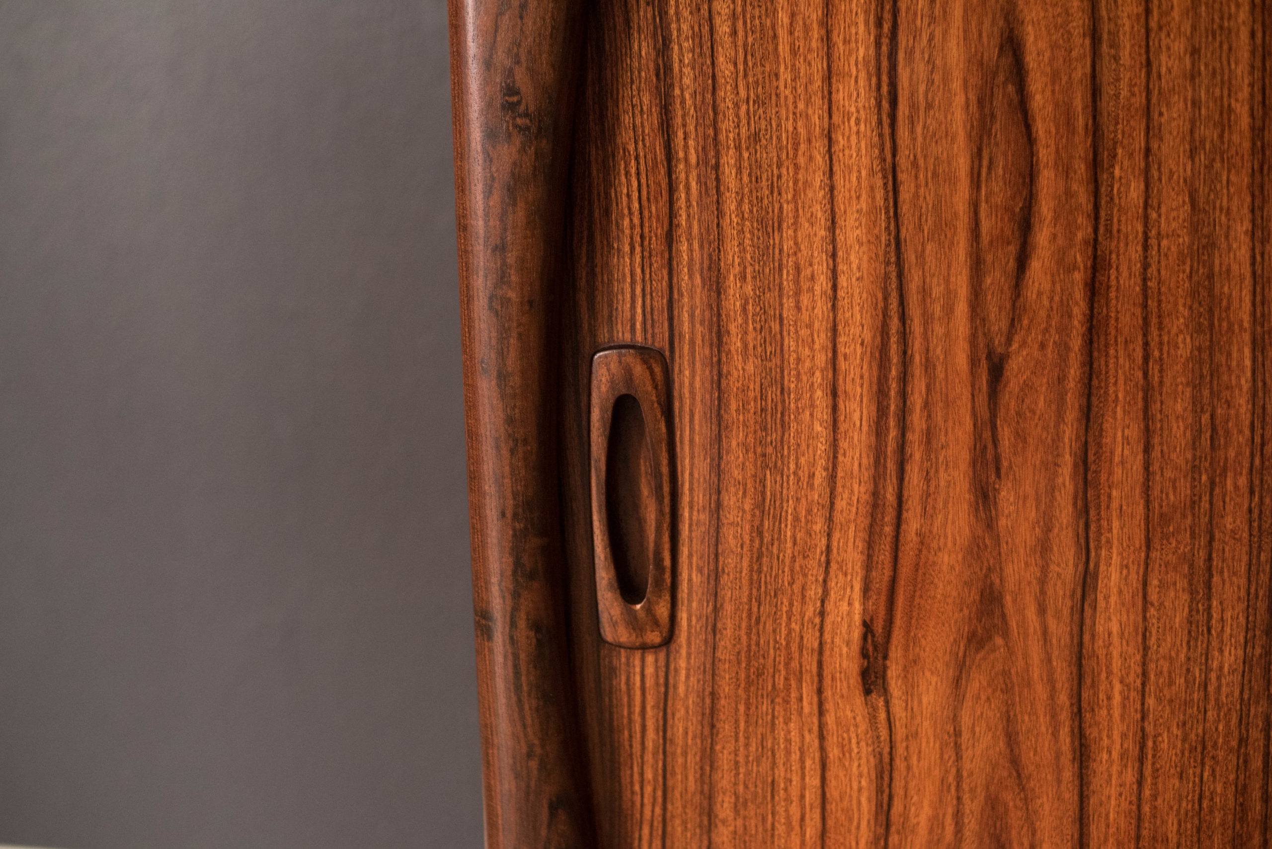 Mid-Century Modern credenza sideboard buffet by H.P. Hansen in rosewood, circa 1960s. Features solid sculpted pulls and space saving sliding doors that offer hidden storage with adjustable shelving. This versatile piece can be used as a media console, dining room buffet, or living room credenza.