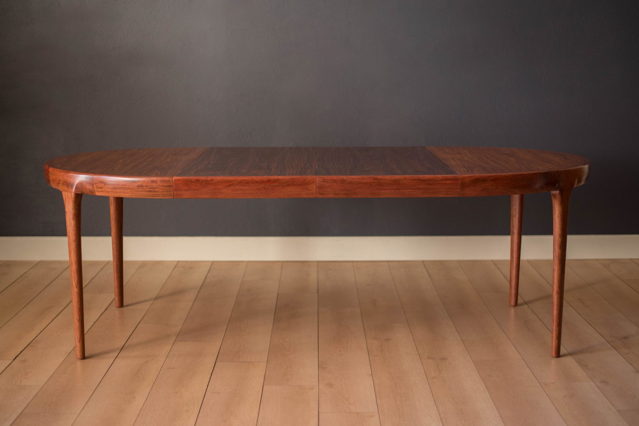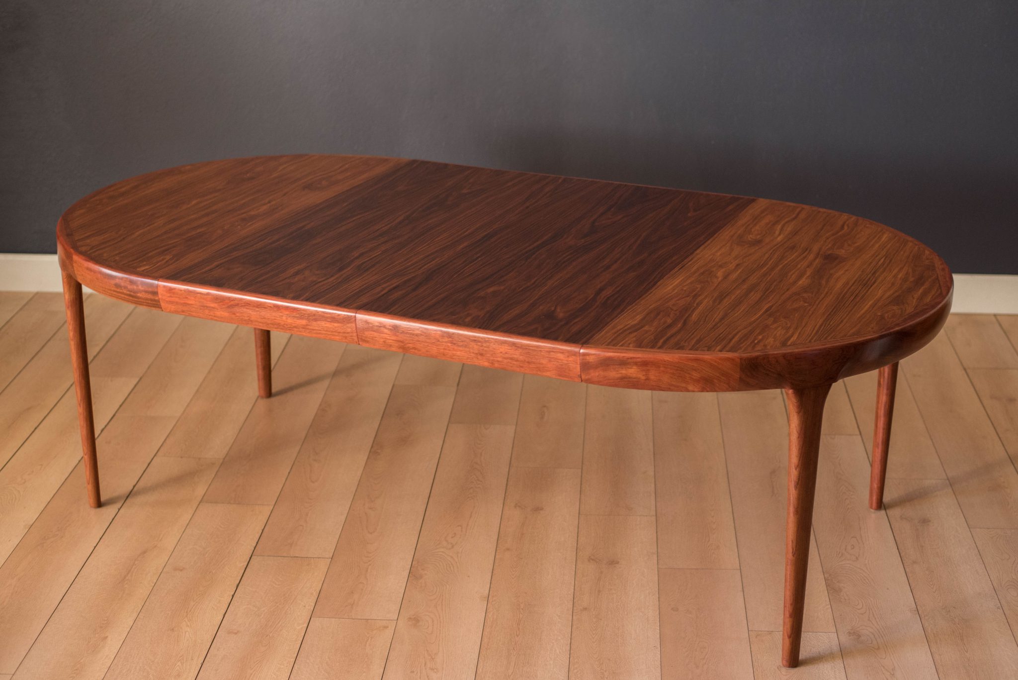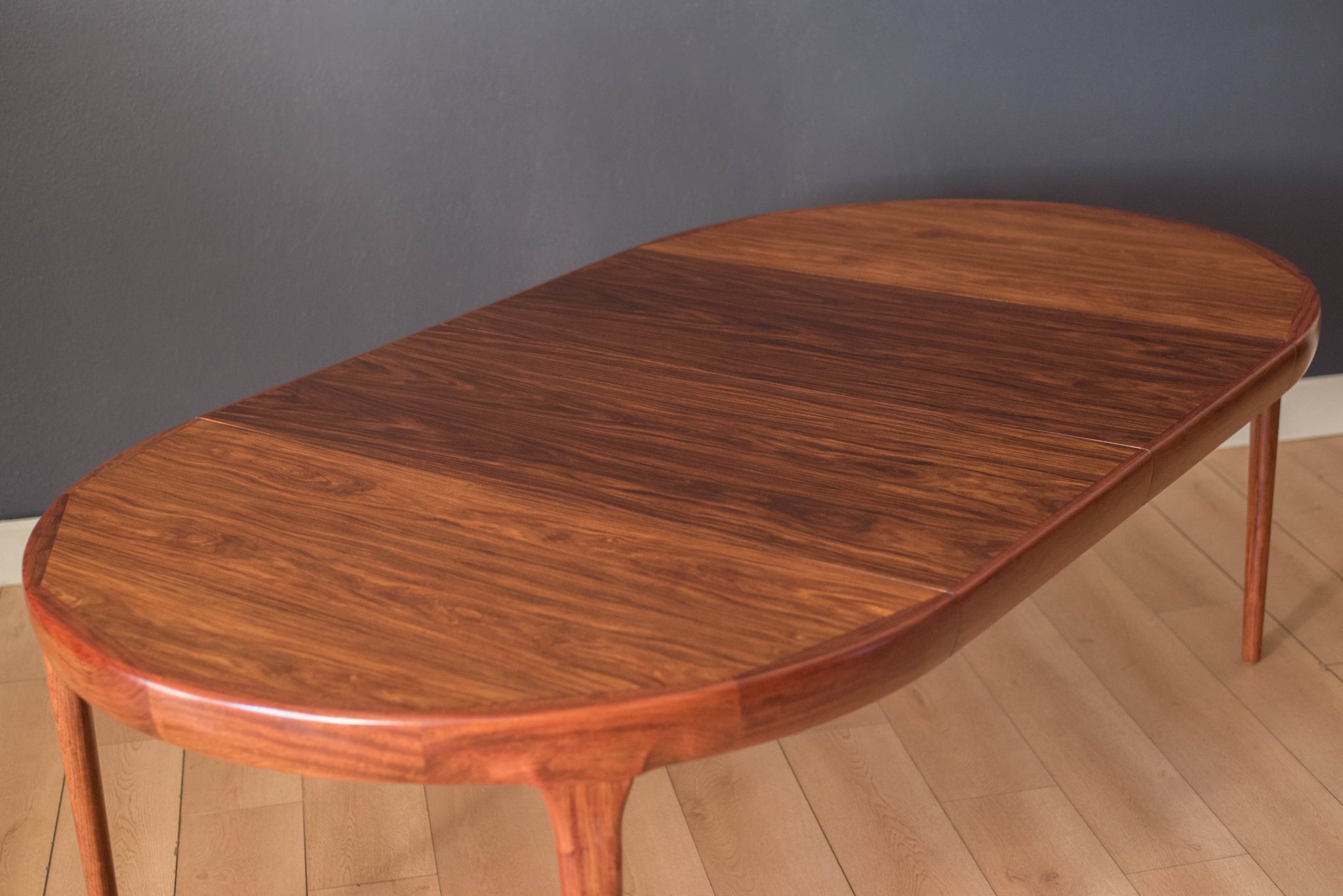 Mid-Century Modern dining table designed by Ib Kofod-Larsen for Faarup Møbelfabrik. This piece displays continuous Brazilian rosewood grains with solid edge banding and a seamless sculpted apron. The table extends with two leaves that can fit up to eight seats.