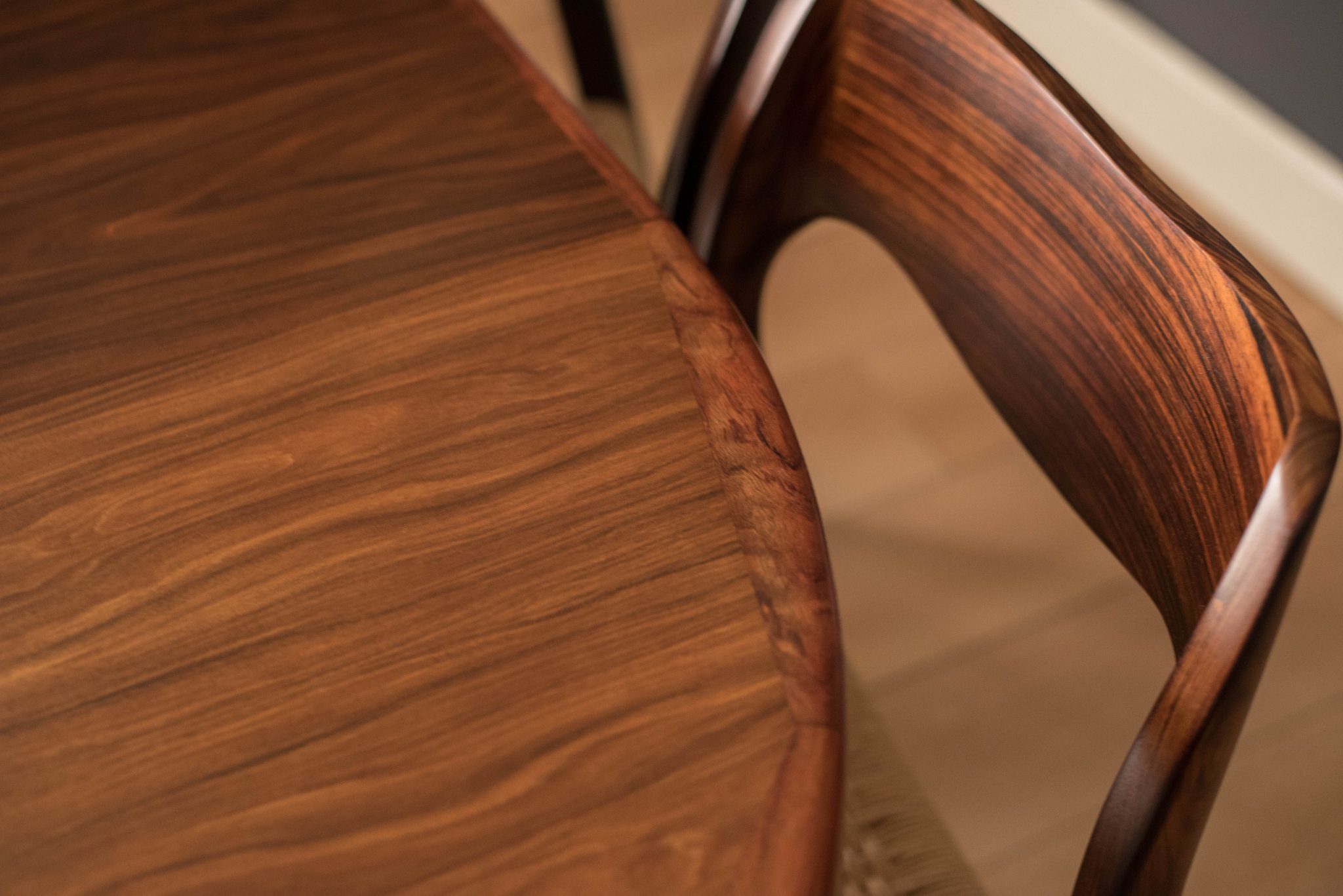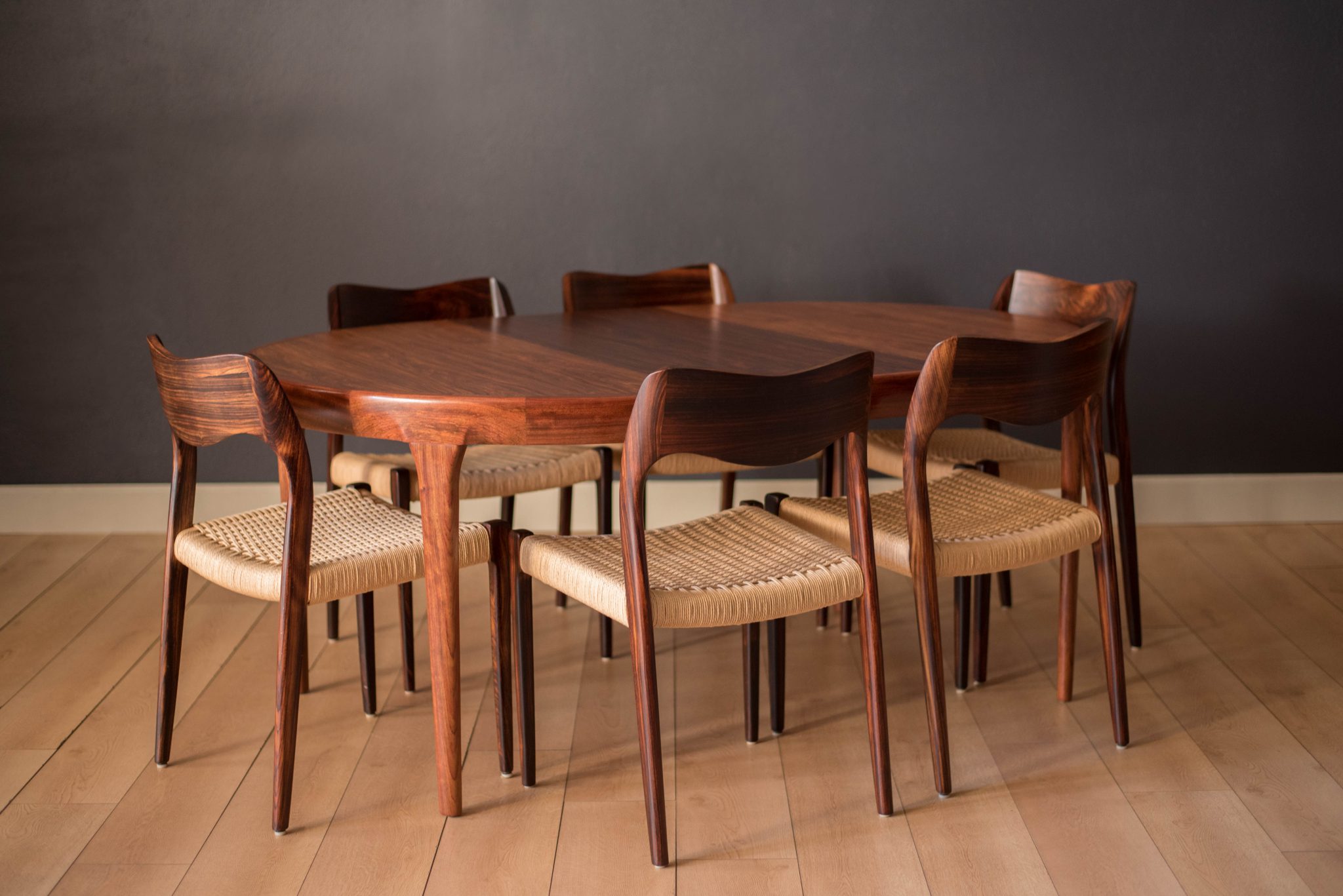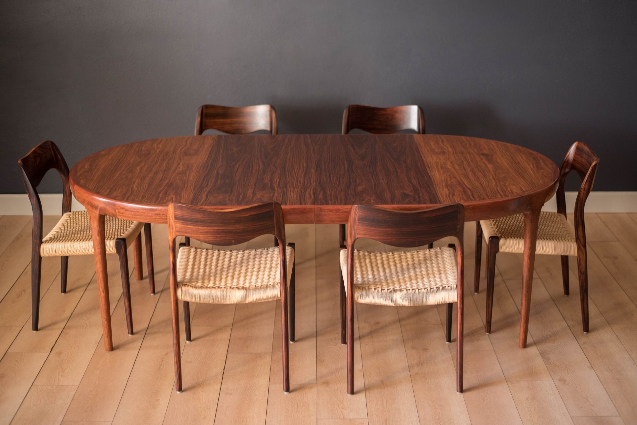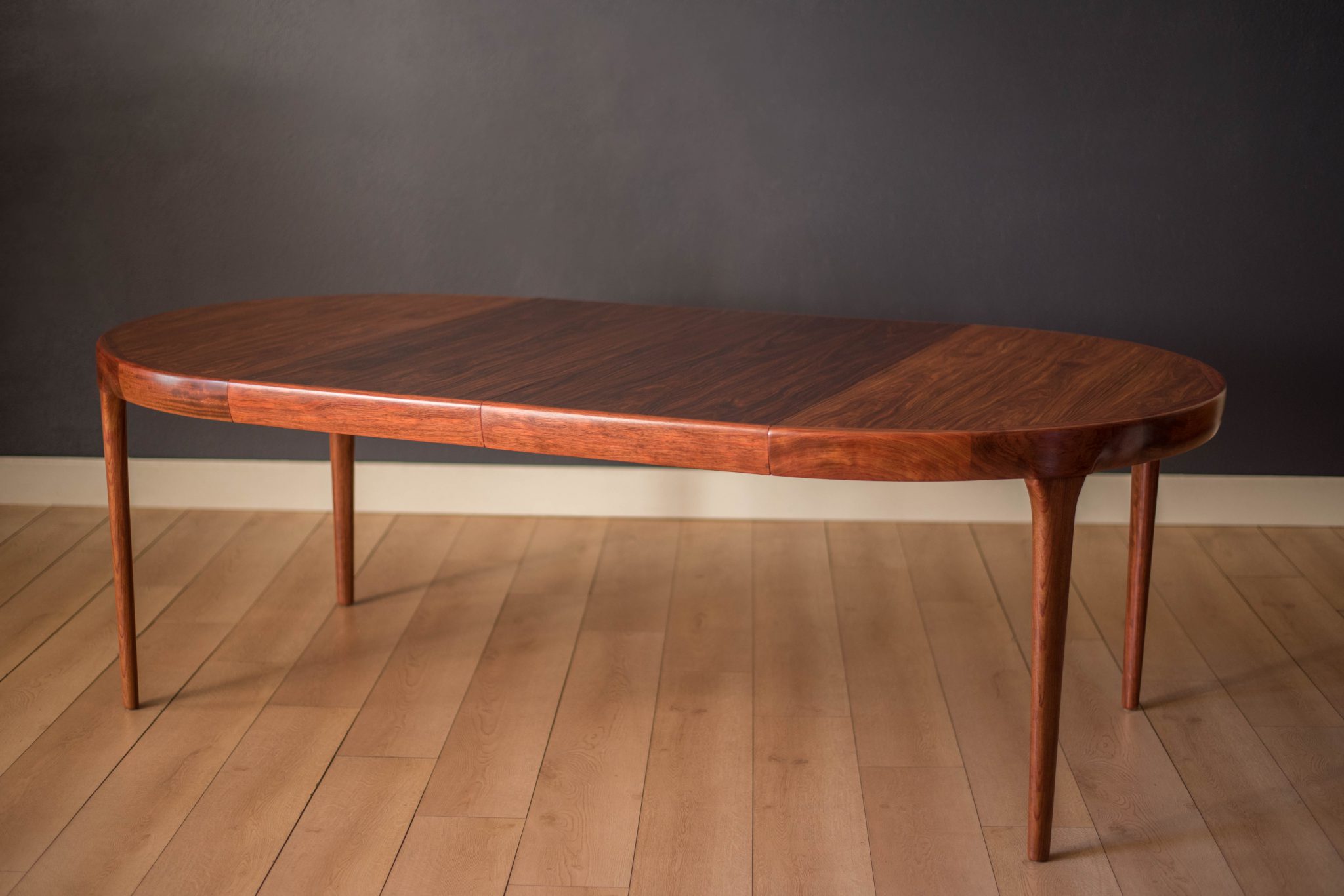 Mid-Century Modern dining table designed by Ib Kofod-Larsen for Faarup Møbelfabrik. This piece displays continuous Brazilian rosewood grains with solid edge banding and a seamless sculpted apron. The table extends with two leaves that can fit up to eight seats.