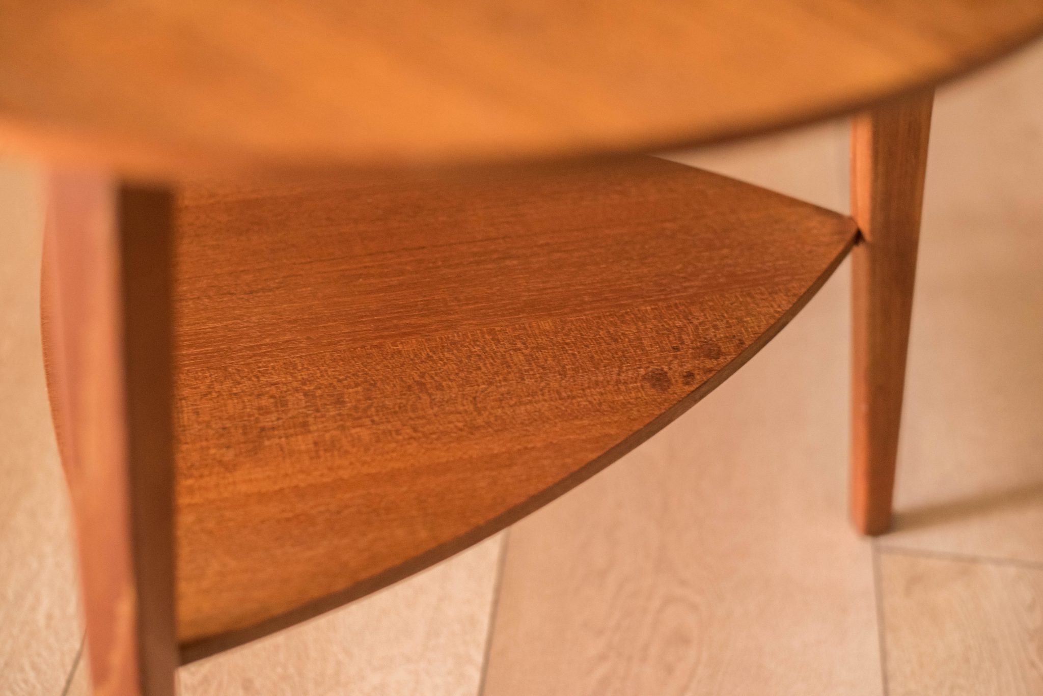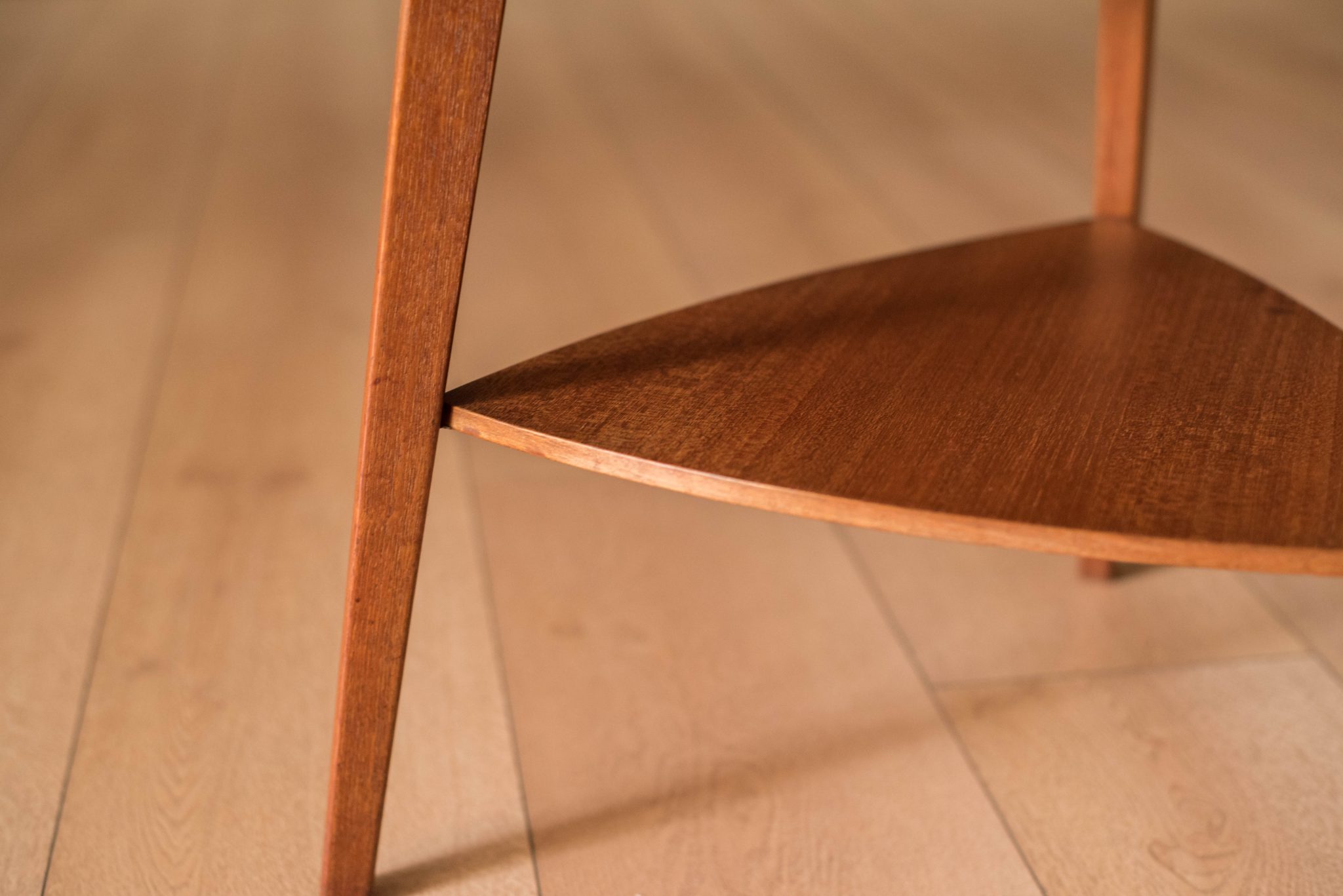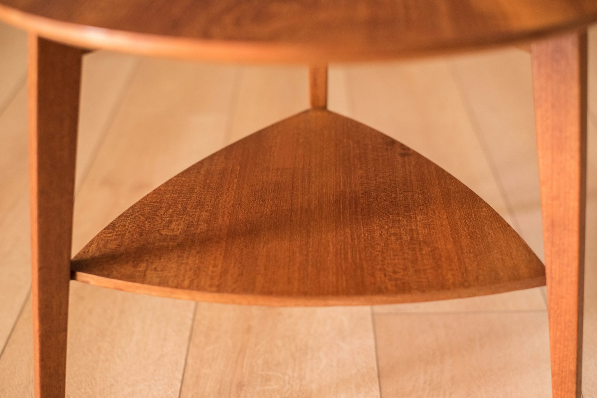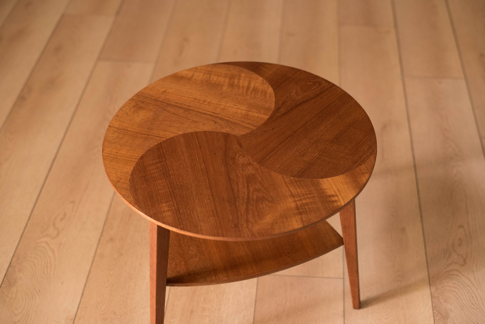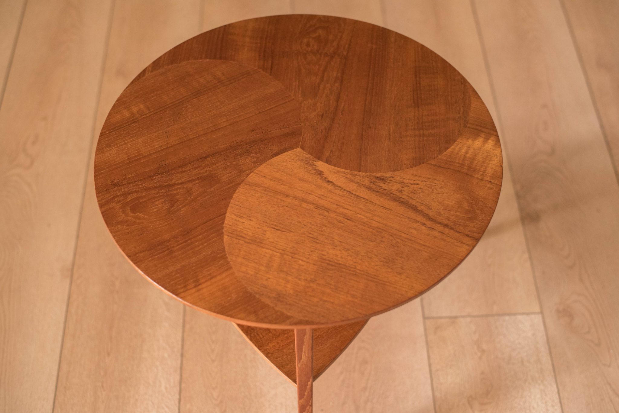Mid-Century Modern round occasional side table manufactured by Mobelintarsia, Denmark. This two-tier piece features a contrasting teak round top with a lower triangular shelf.