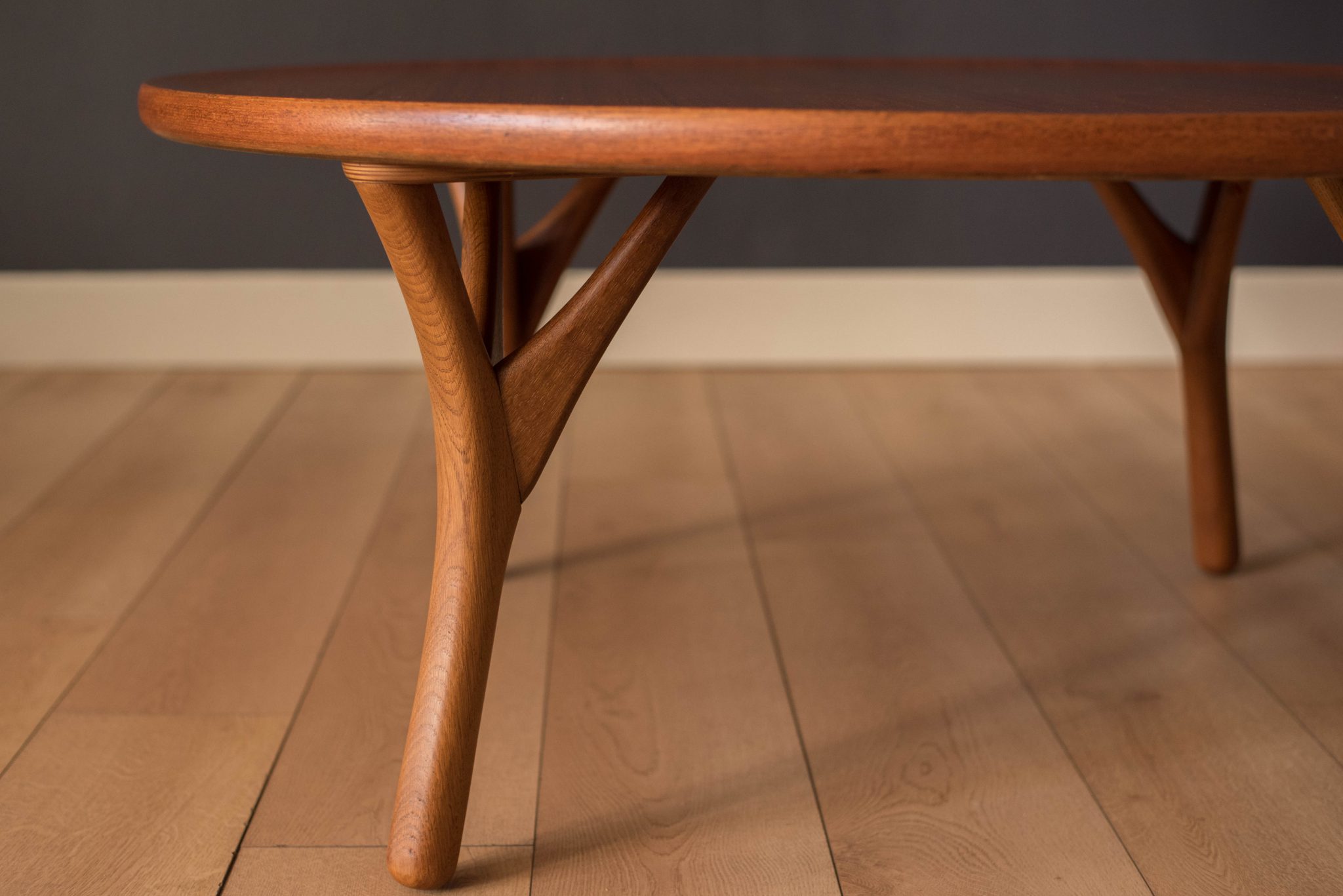 Mid-Century Modern coffee table in teak made in Denmark, circa 1950s. This statement piece has a unique sculpted raised edge and contrasting solid oak tripod legs.