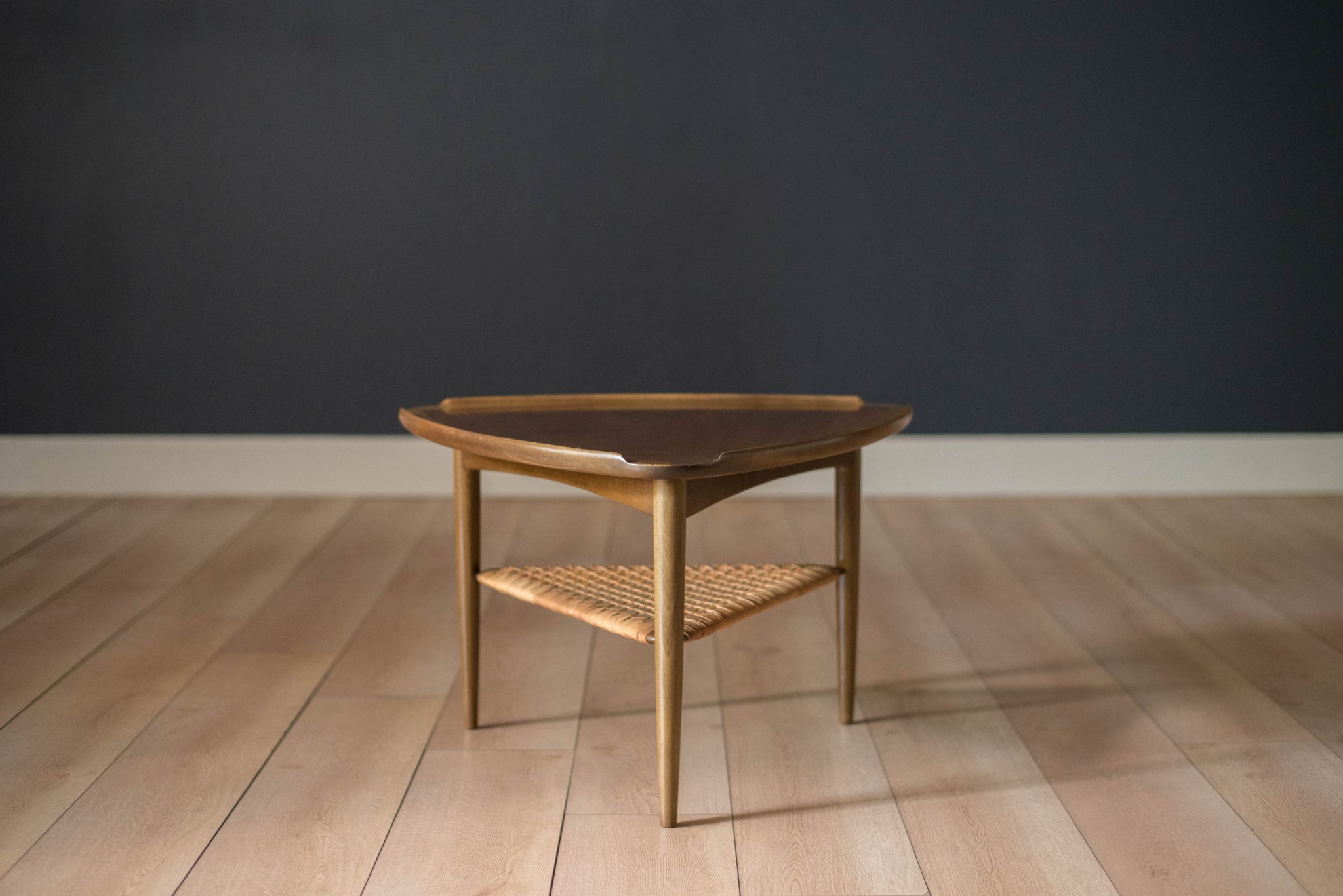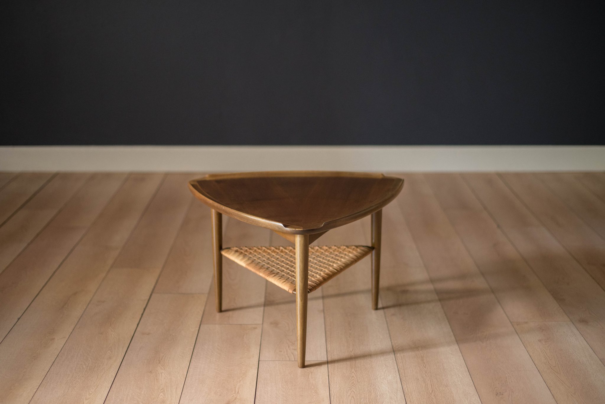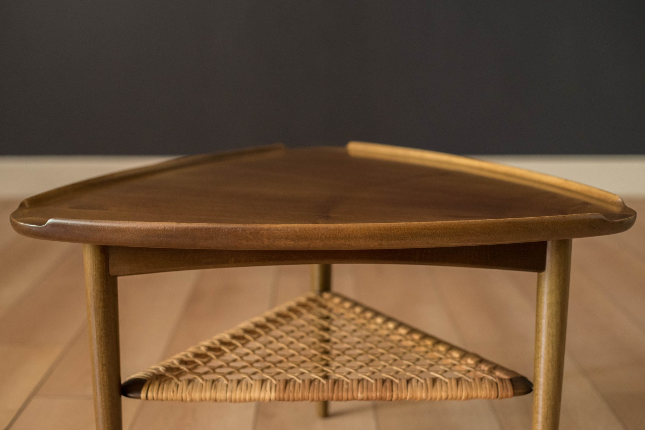 Mid century triangular occasional table or guitar pick side table designed by Poul Jensen imported by Selig, Denmark. This piece features a unique walnut raised edge top and lower tier magazine shelf made of woven cane.
