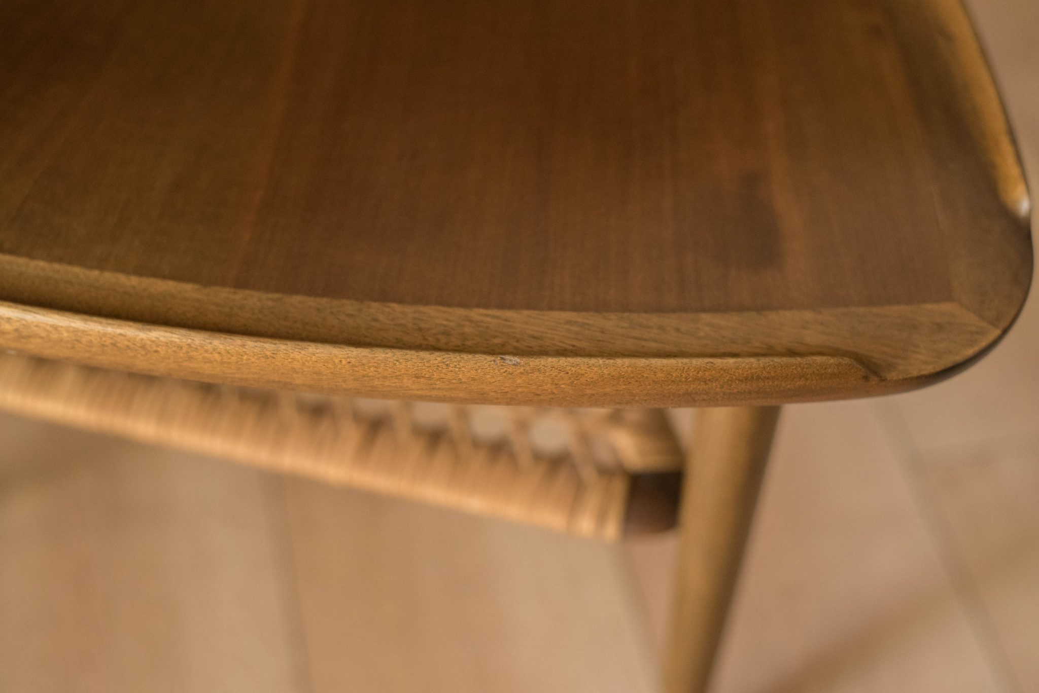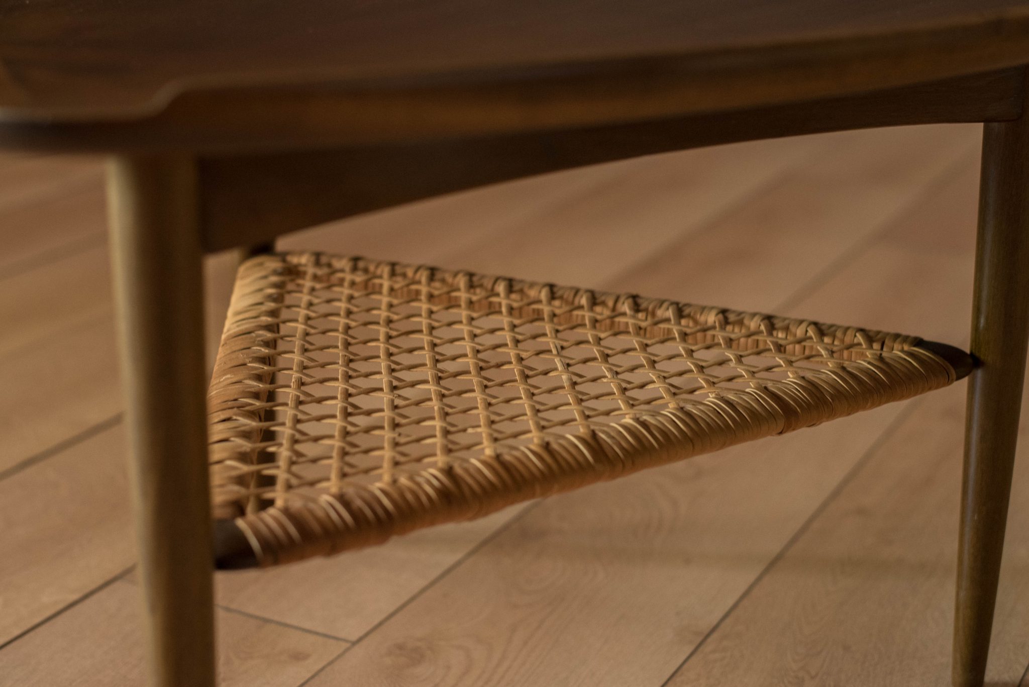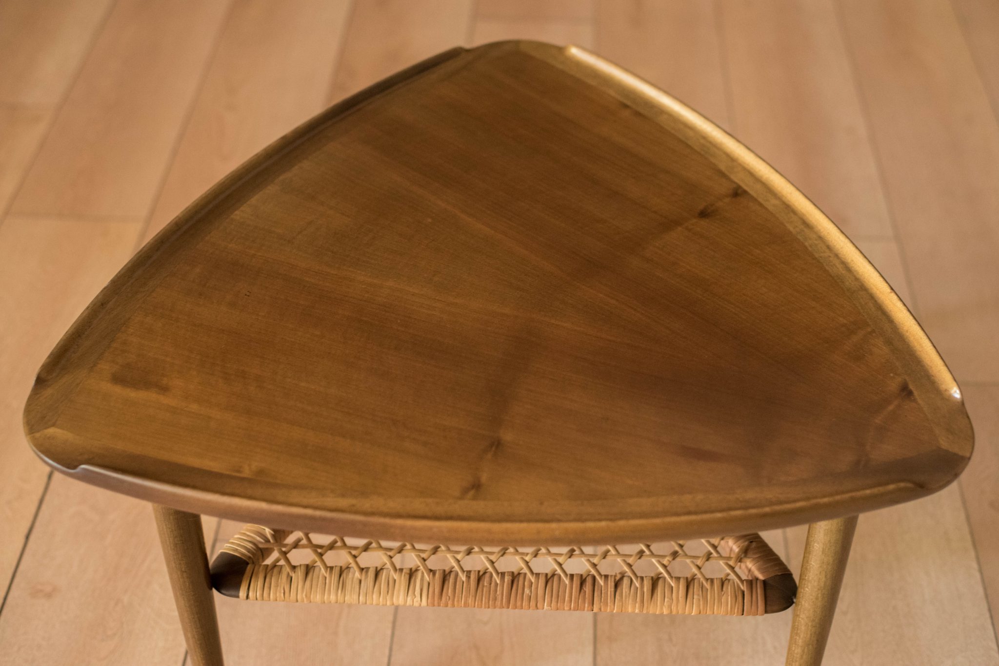 Mid century triangular occasional table or guitar pick side table designed by Poul Jensen imported by Selig, Denmark. This piece features a unique walnut raised edge top and lower tier magazine shelf made of woven cane.