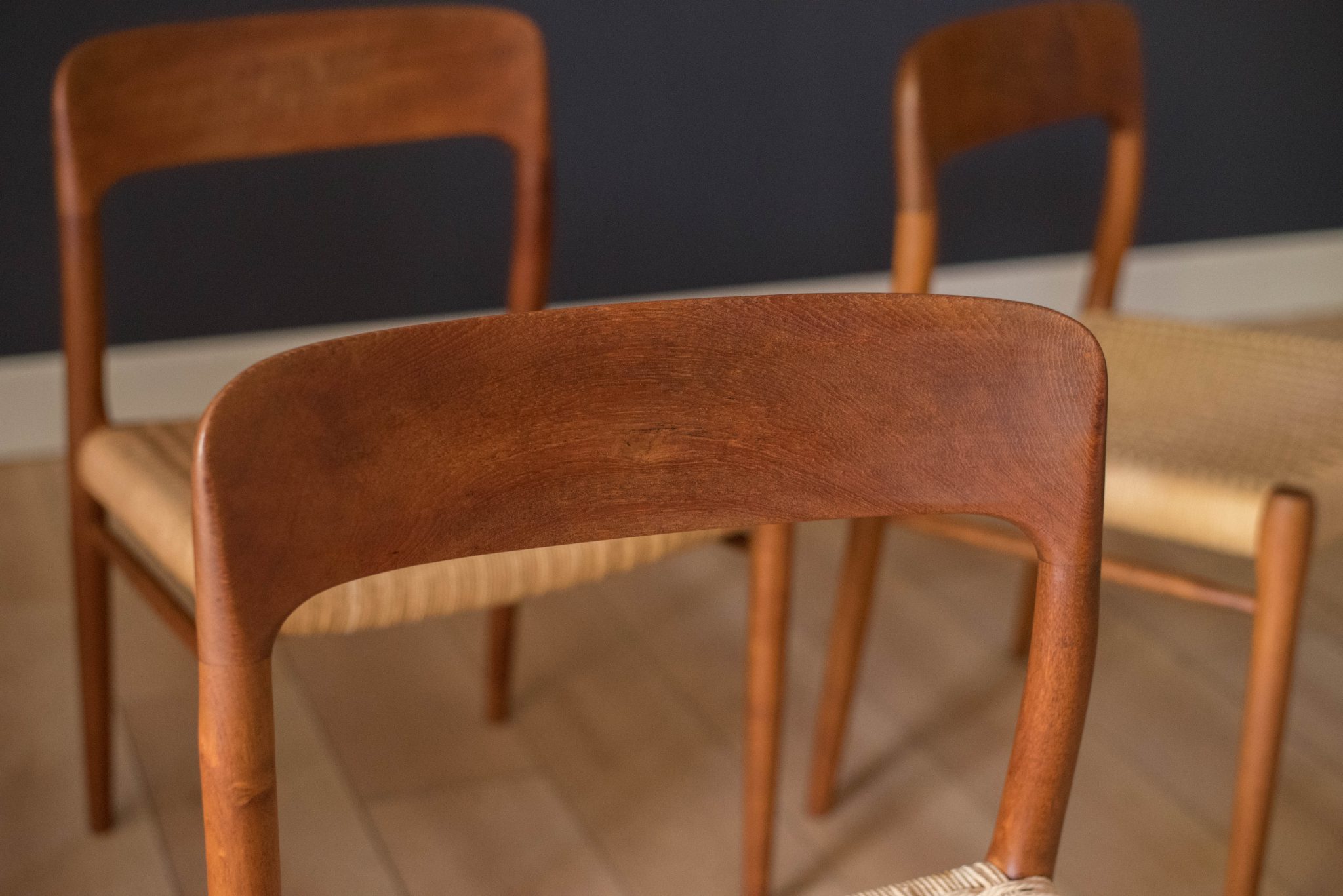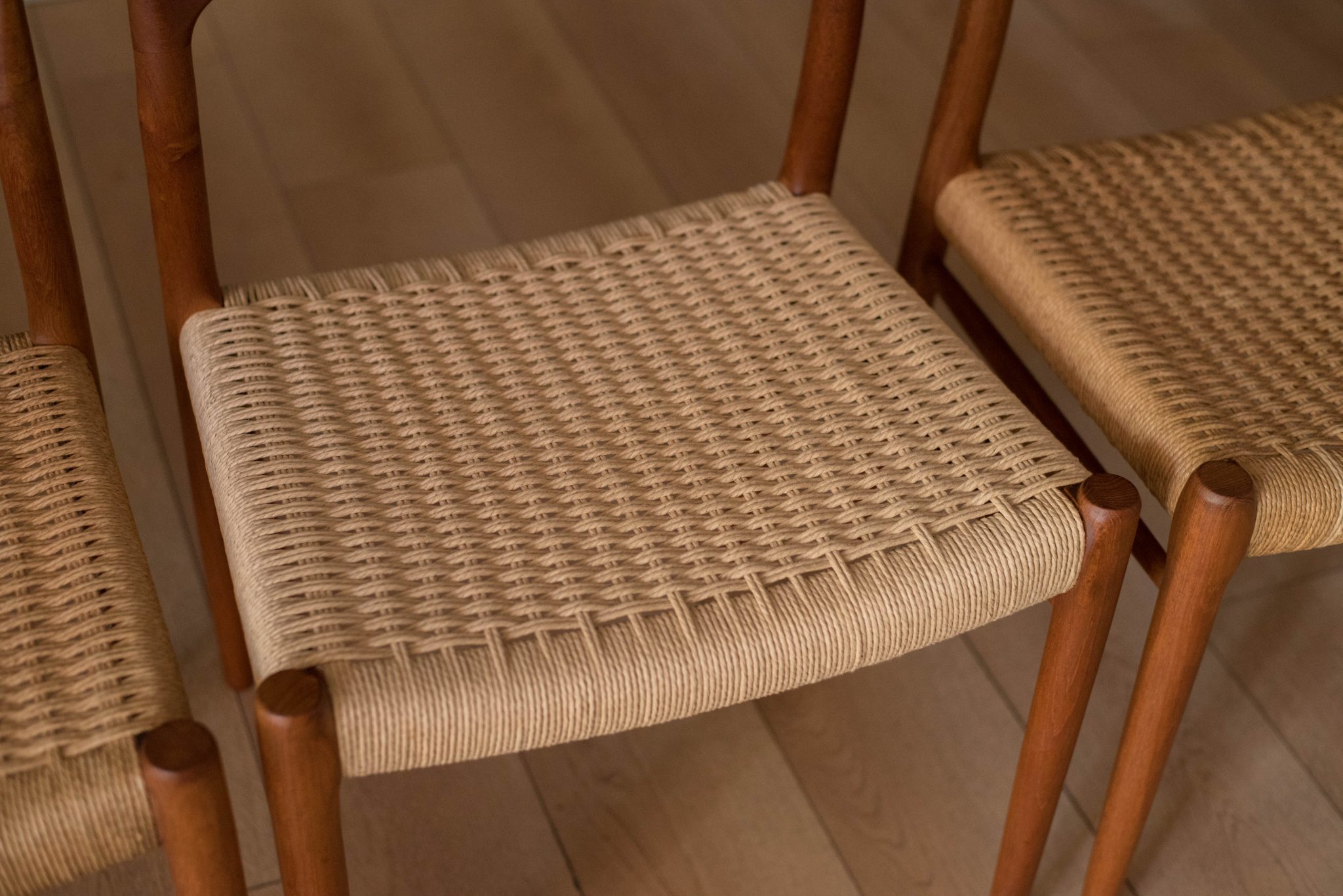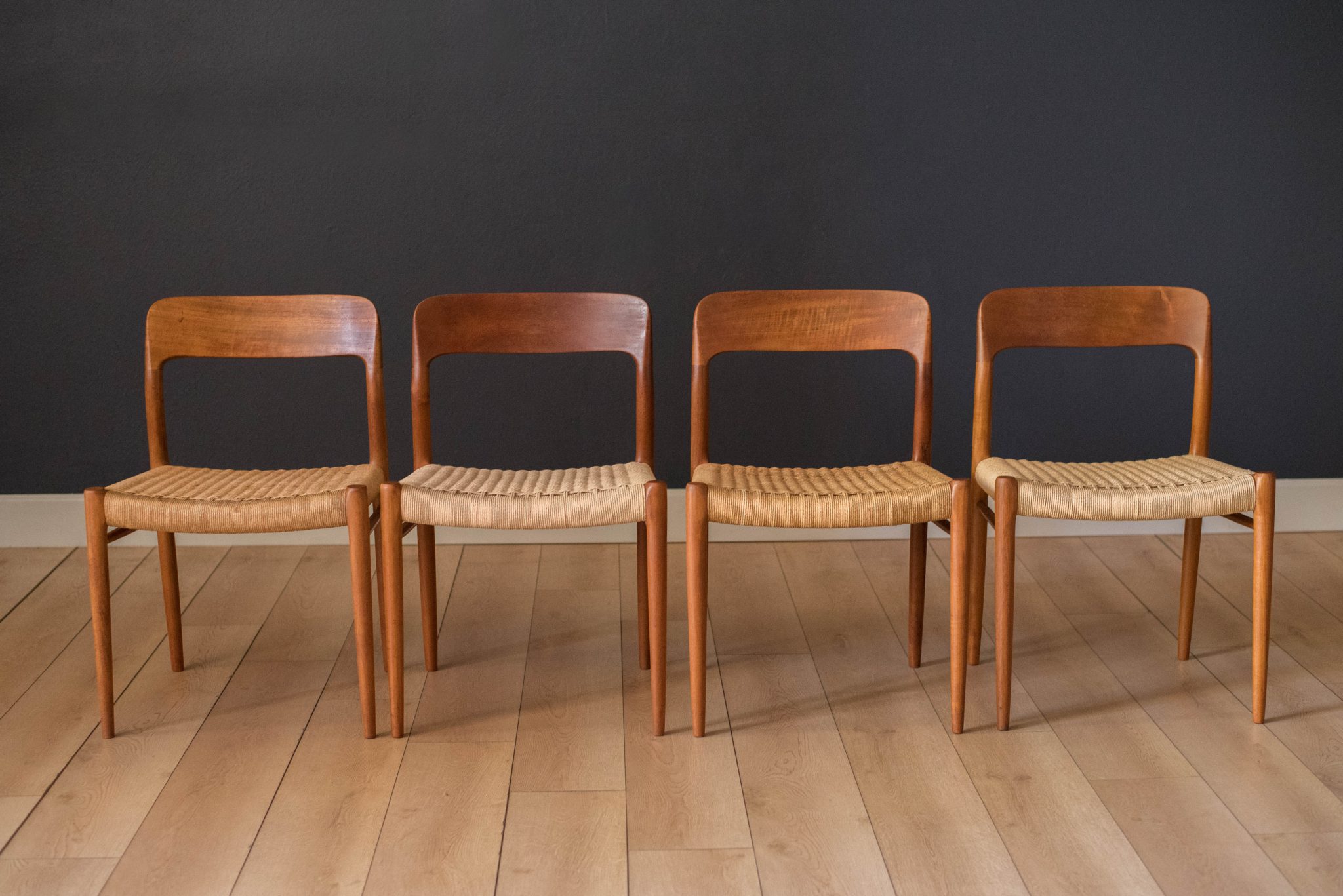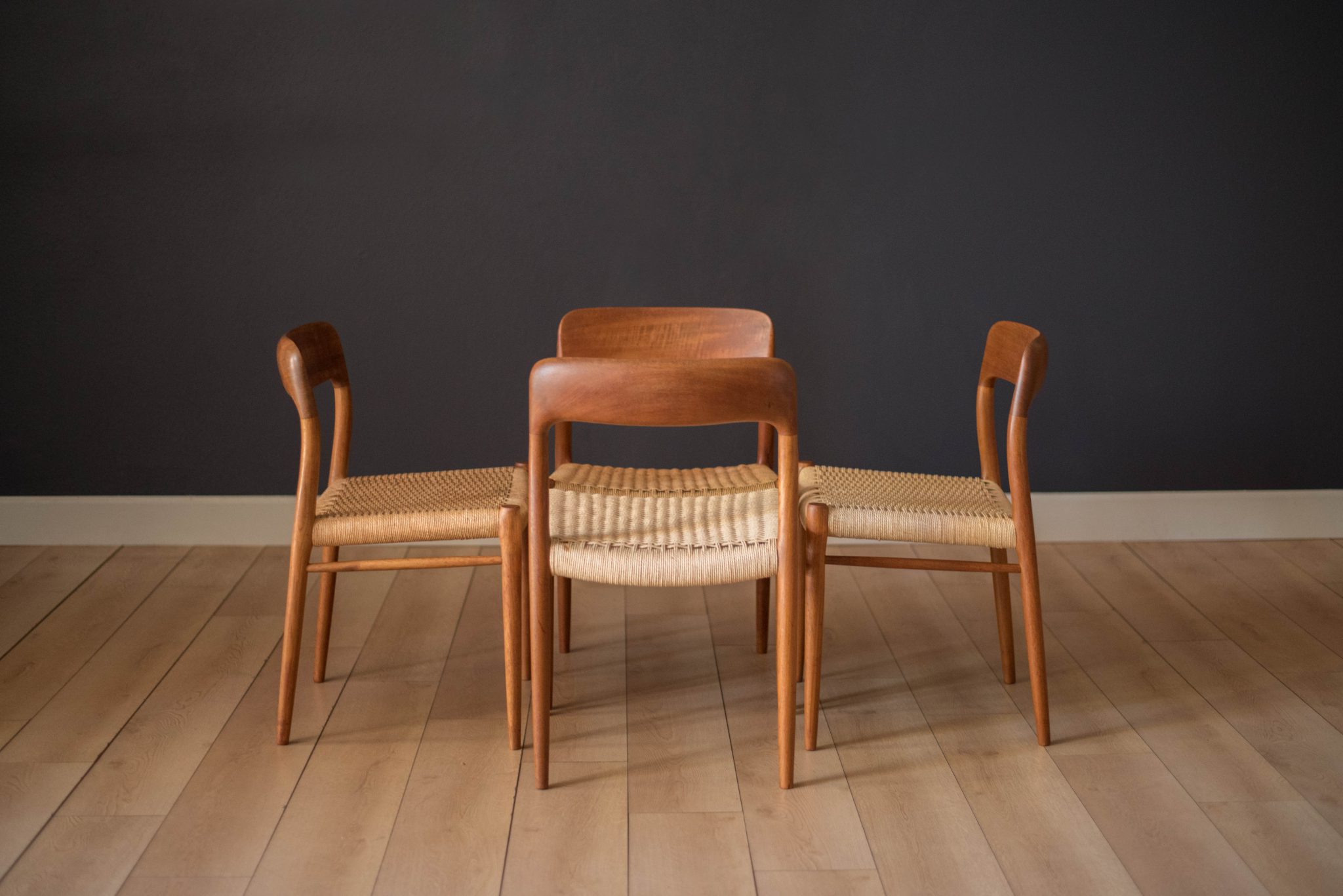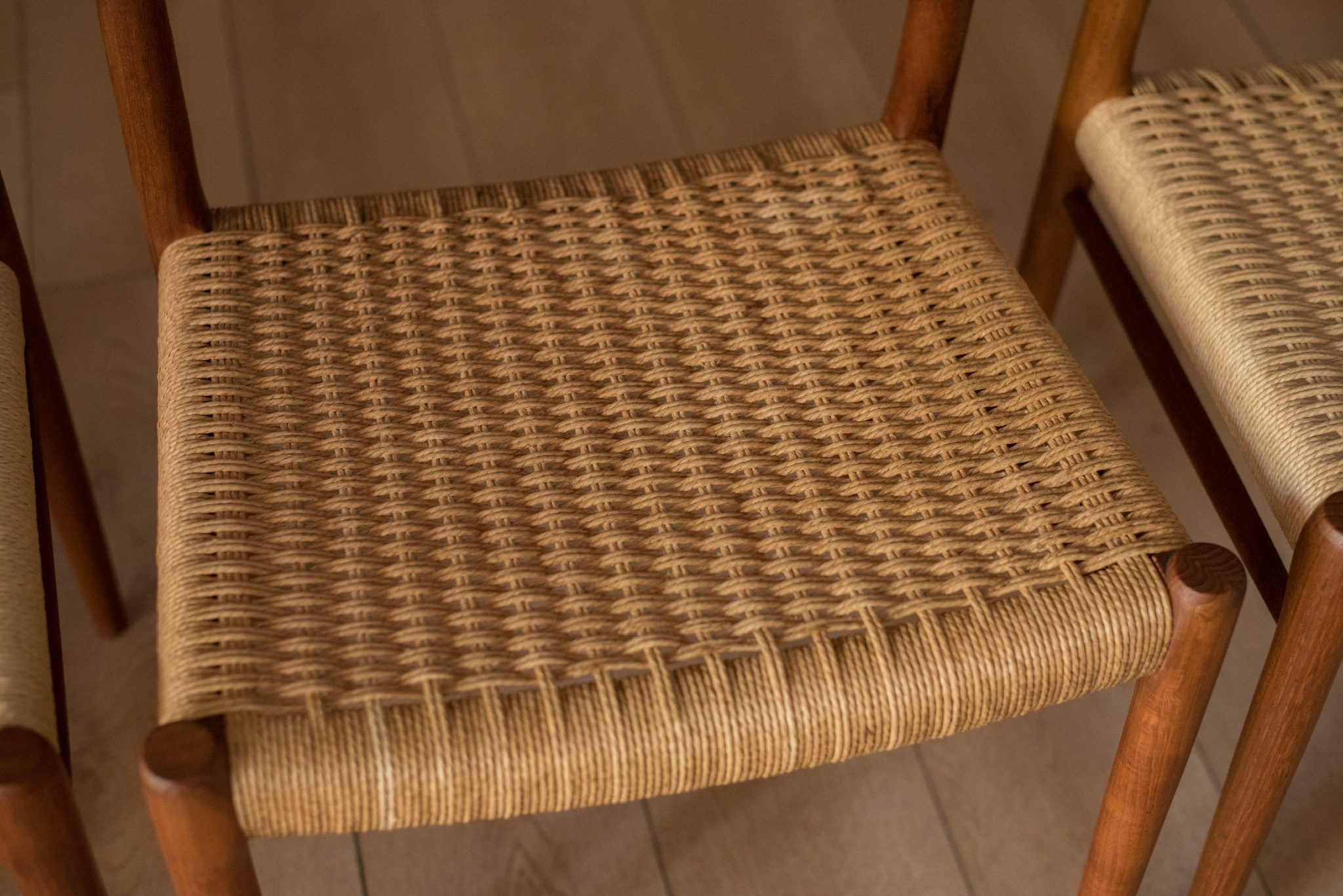 Mid-Century Niels Møller dining chairs for J.L. Møller Møbelfabrik model #75 in teak. This set includes four chairs that have intact papercord seating. Matching teak dining table is available in separate listing.