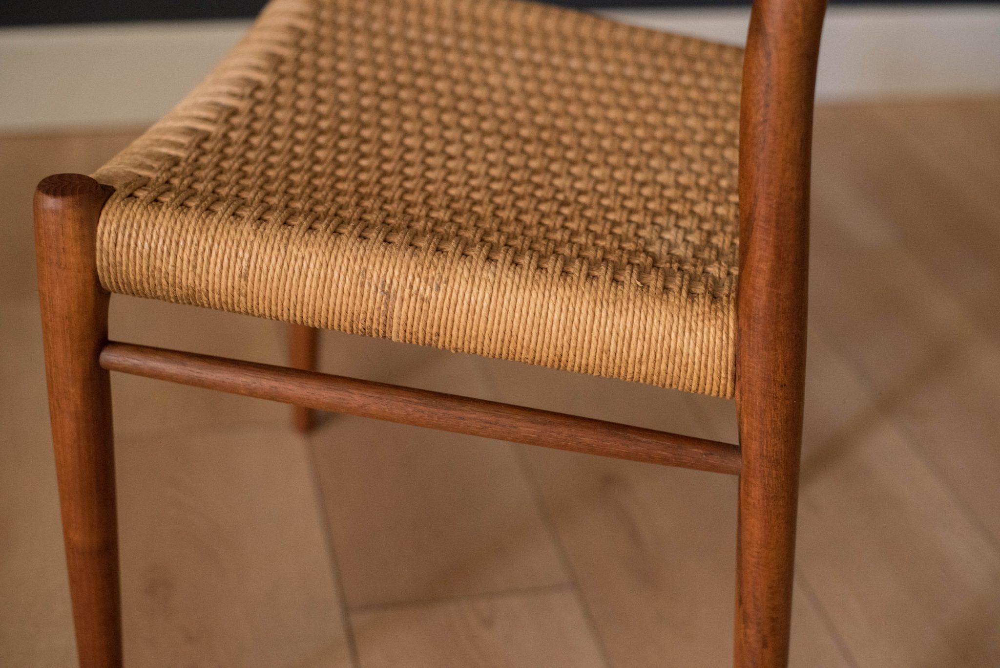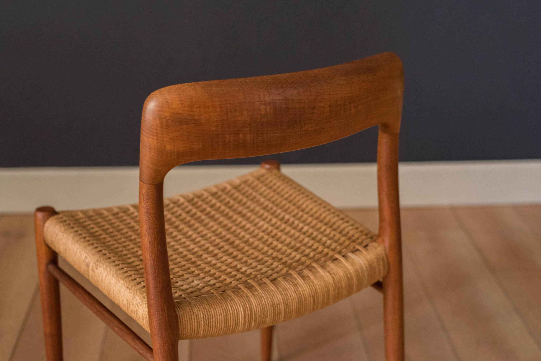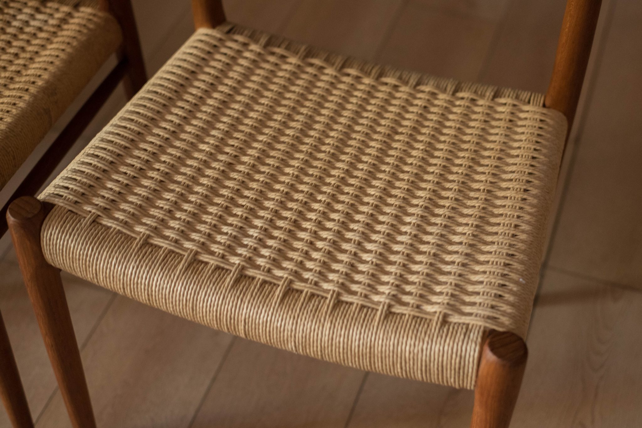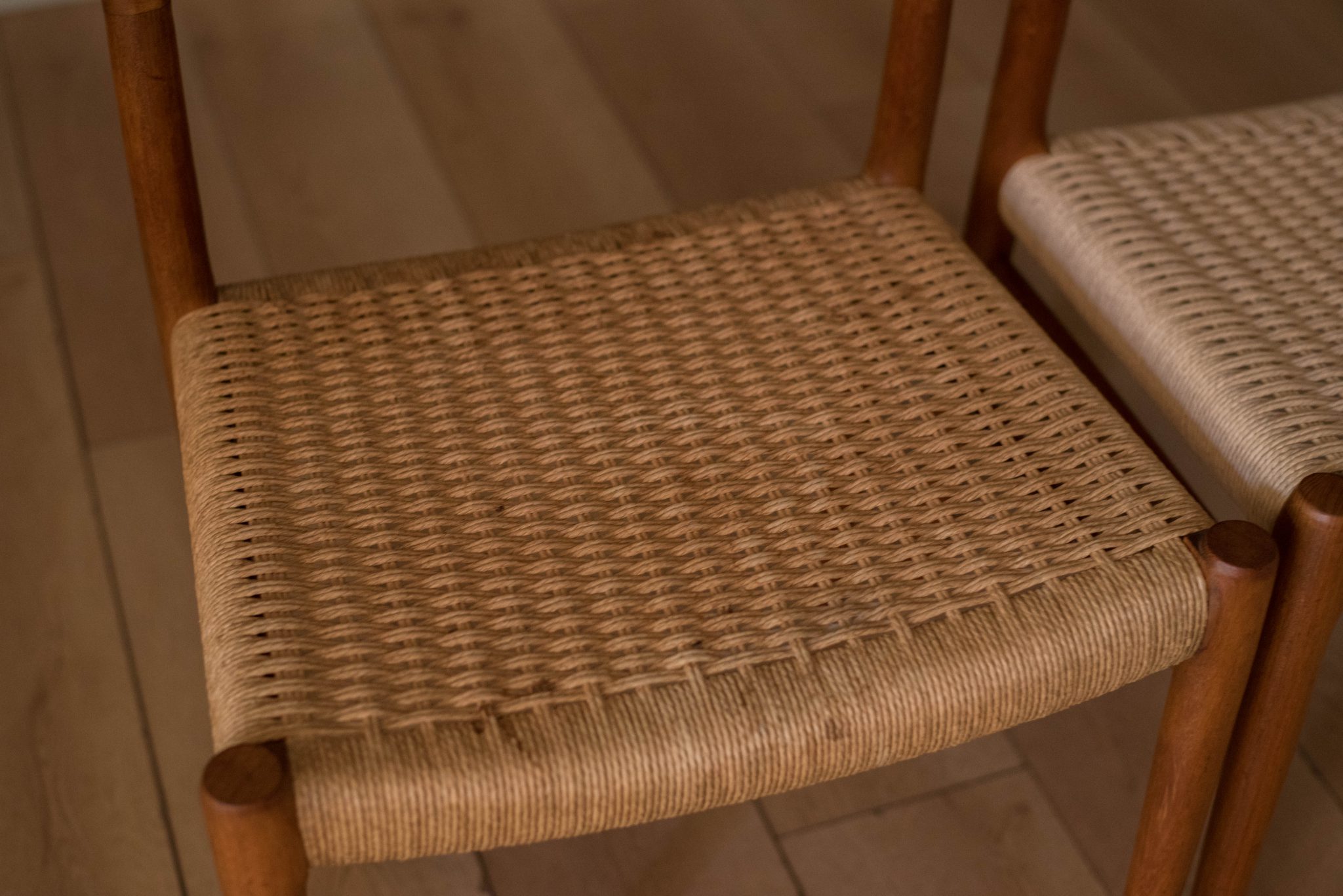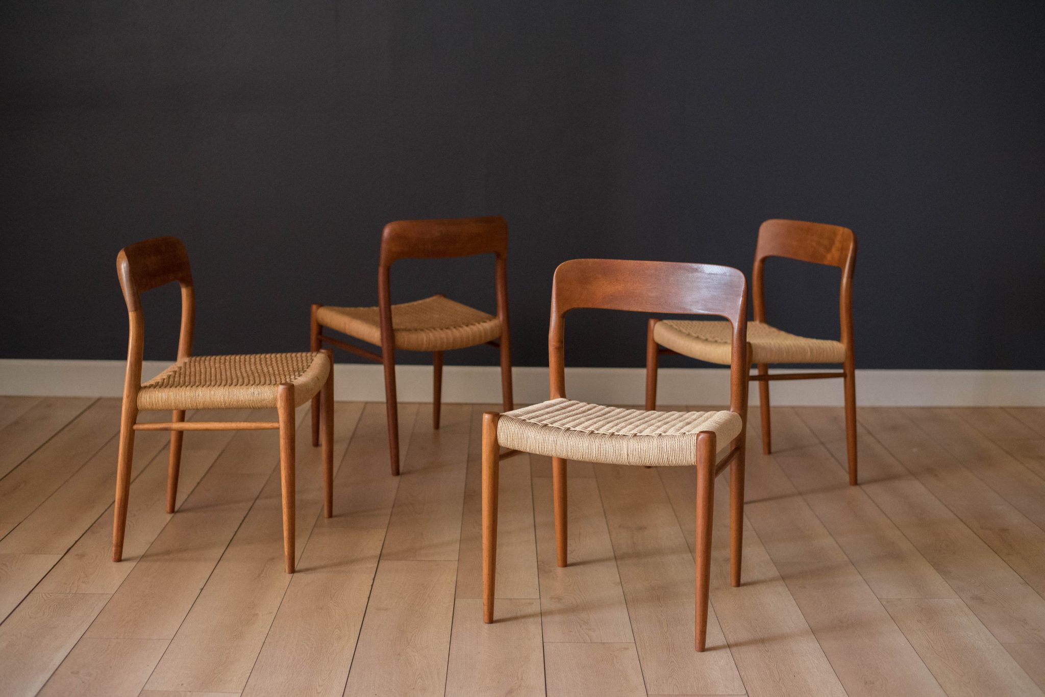 Mid-Century Niels Møller dining chairs for J.L. Møller Møbelfabrik model #75 in teak. This set includes four chairs that have intact papercord seating. Matching teak dining table is available in separate listing.