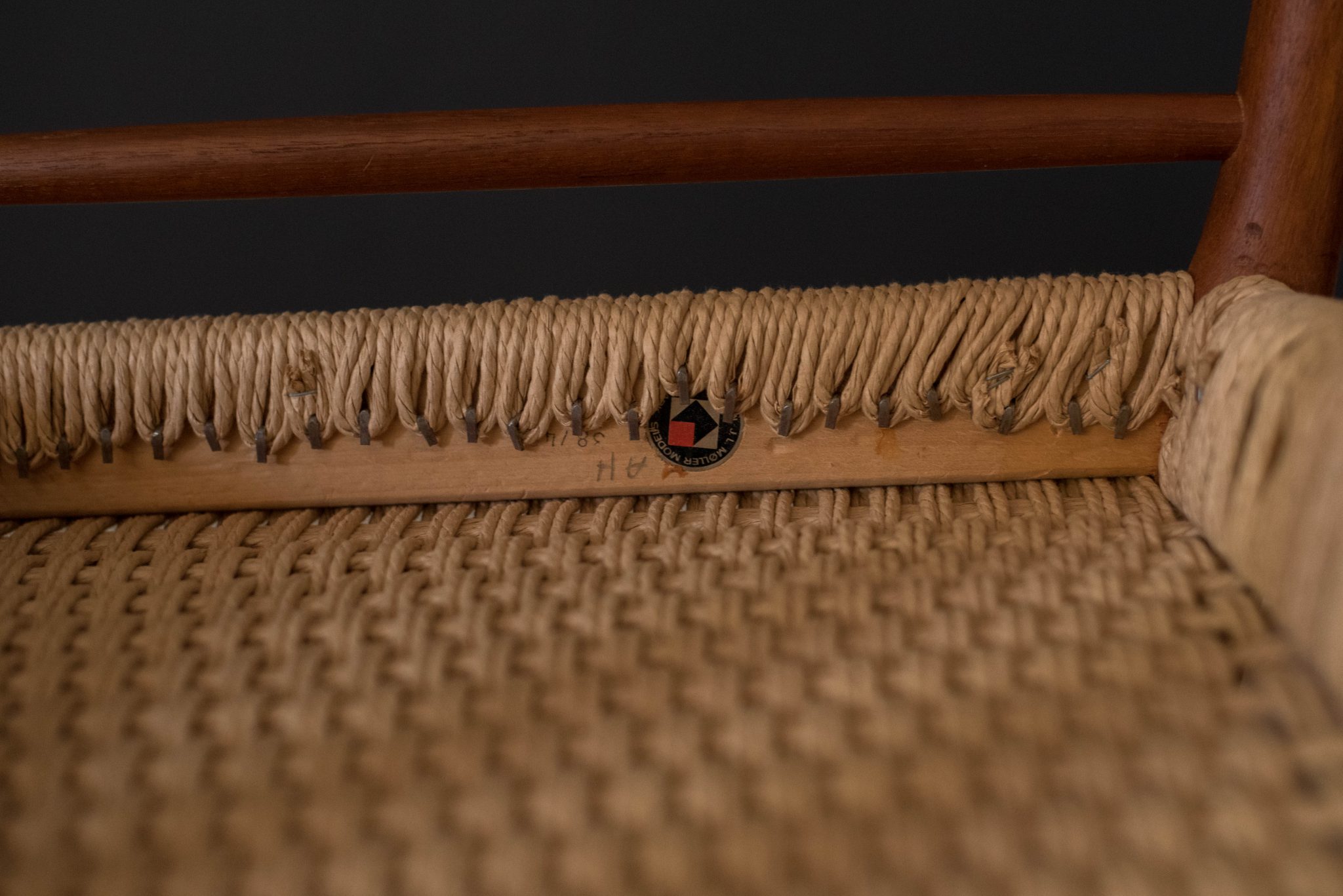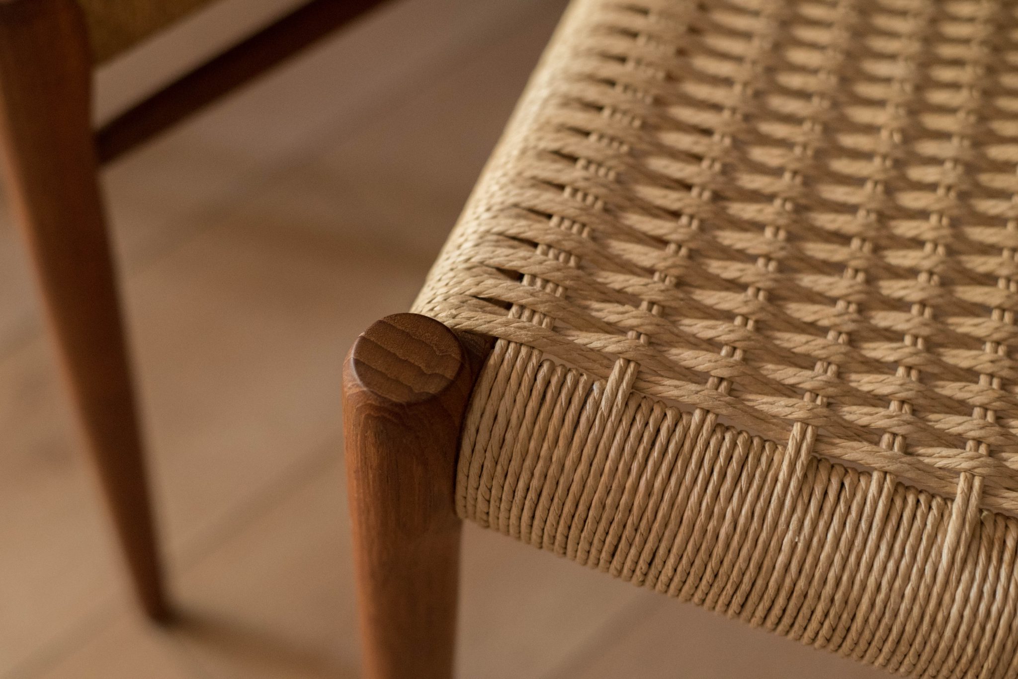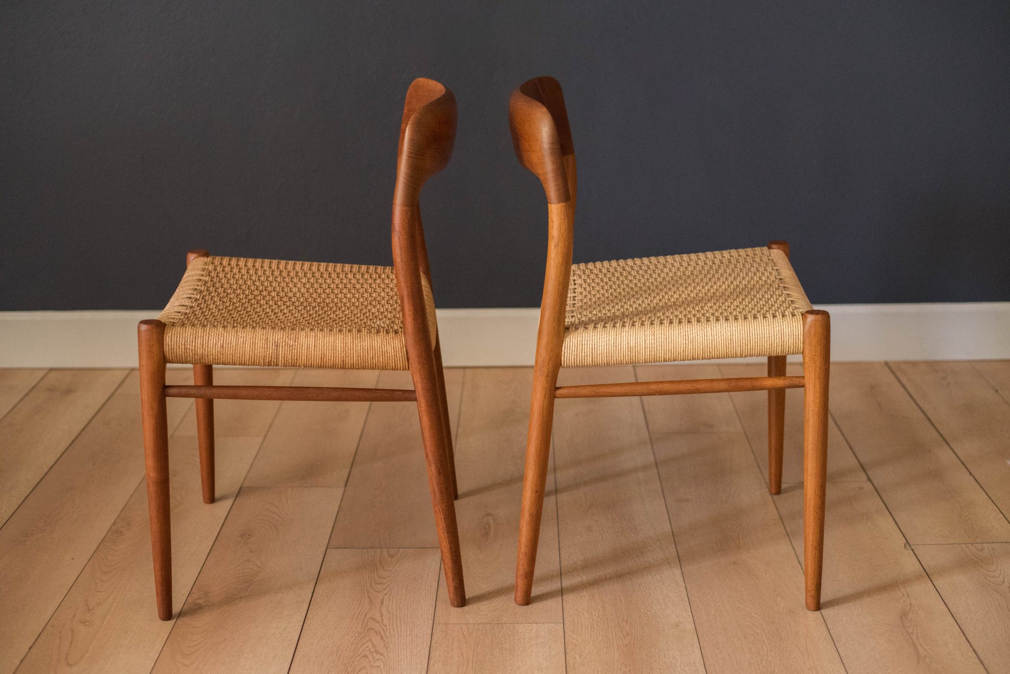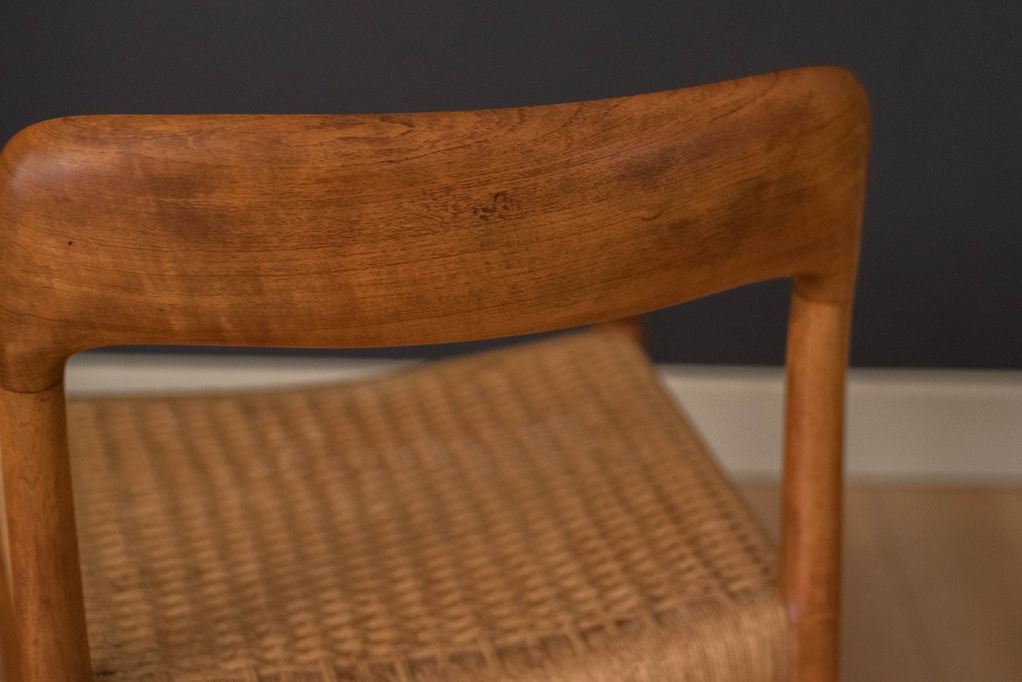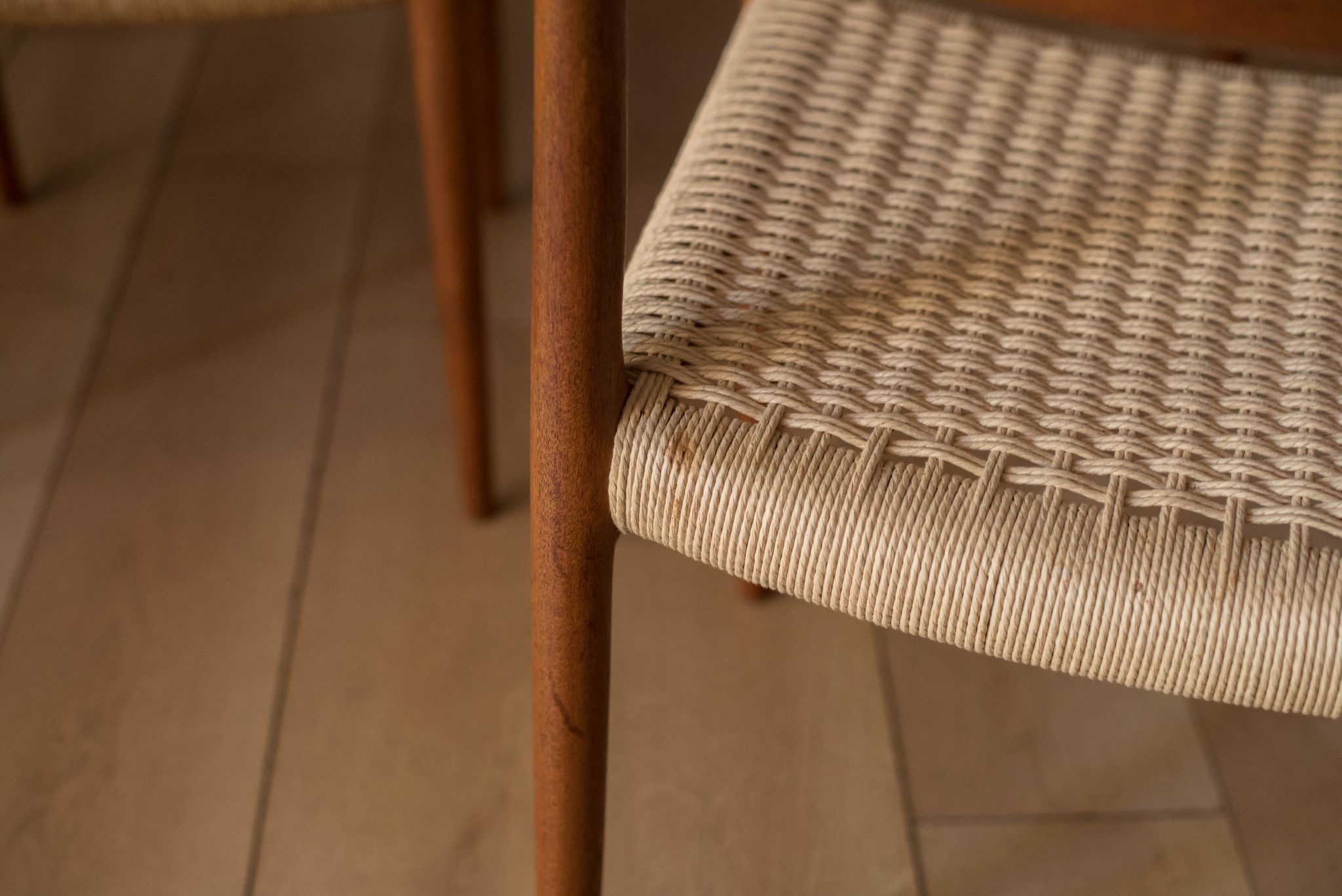 Mid-Century Niels Møller dining chairs for J.L. Møller Møbelfabrik model #75 in teak. This set includes four chairs that have intact papercord seating. Matching teak dining table is available in separate listing.