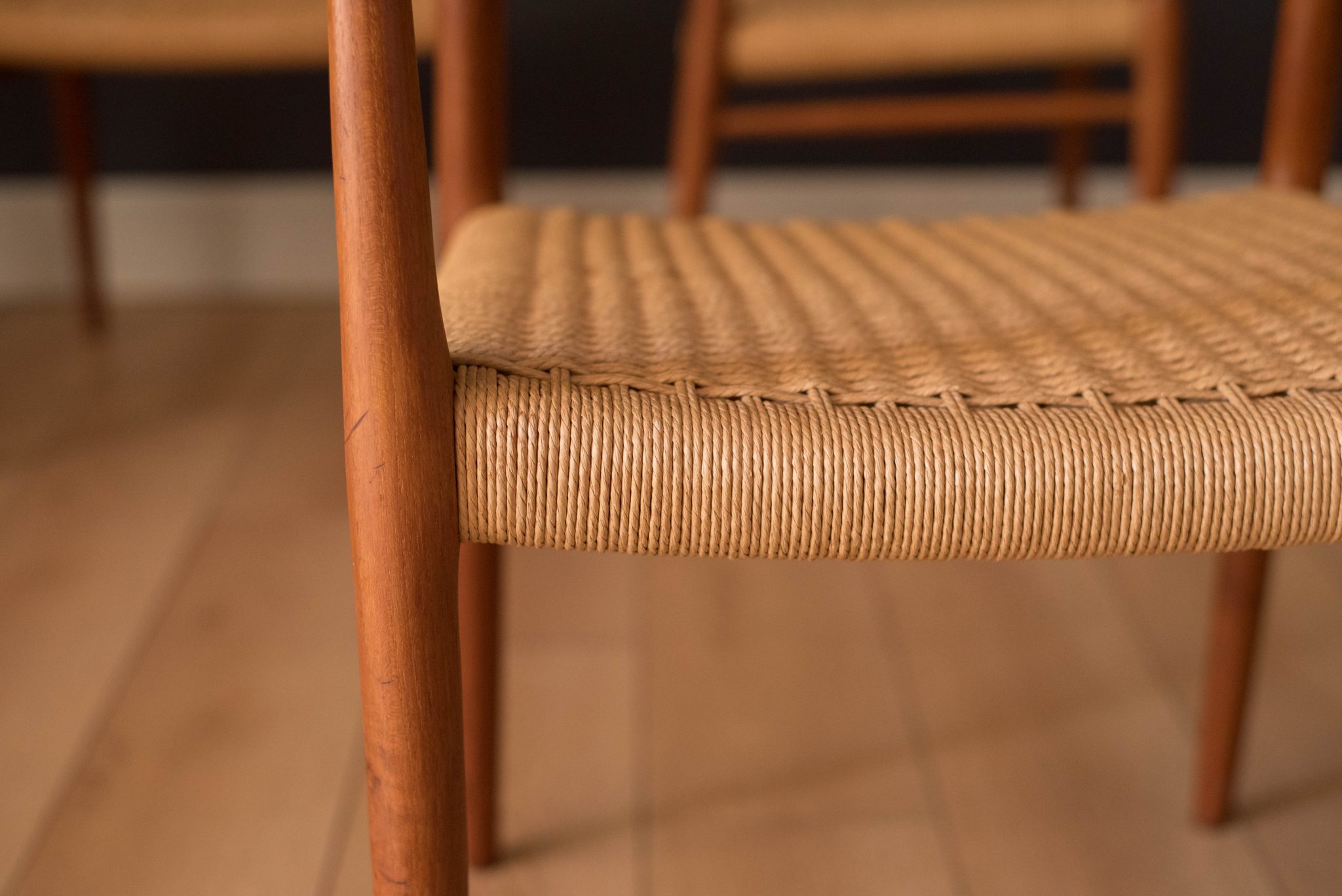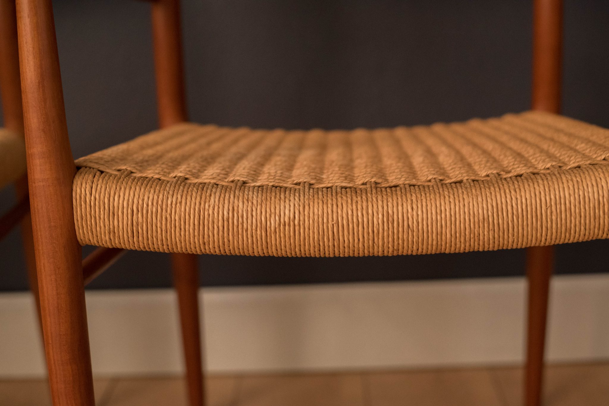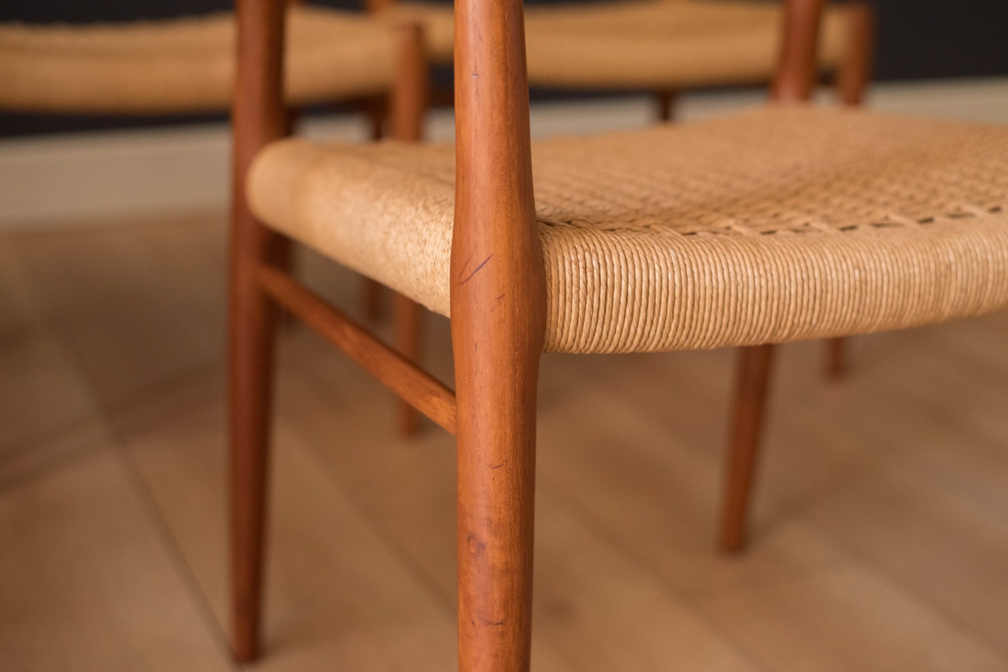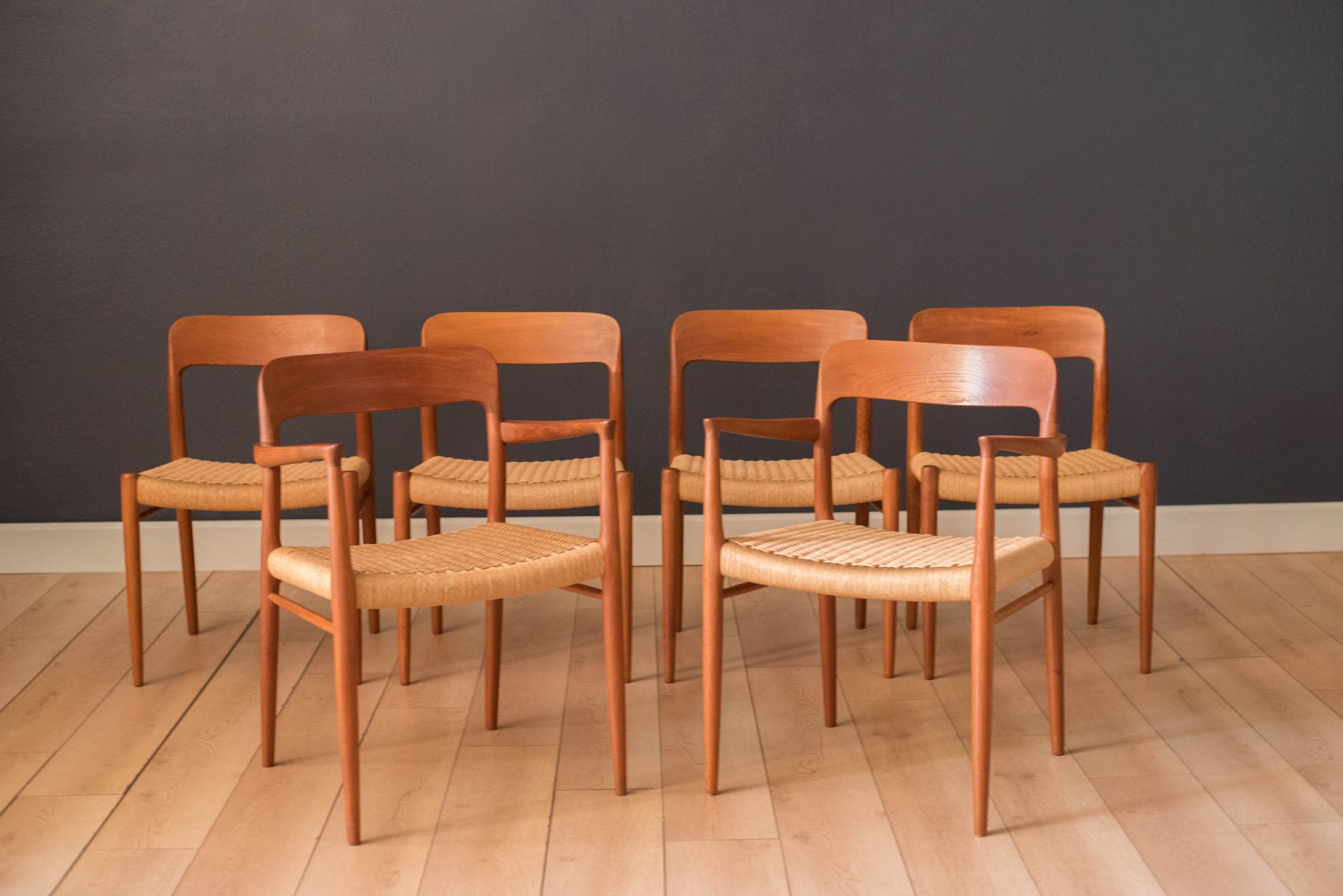 Mid-Century Modern Niels O. Møller dining chairs for J.L. Møller Møbelfabrik in teak. This set includes four Moller no. 75 side chairs and two no. 56 armchairs. Seats have original papercord seating all intact.