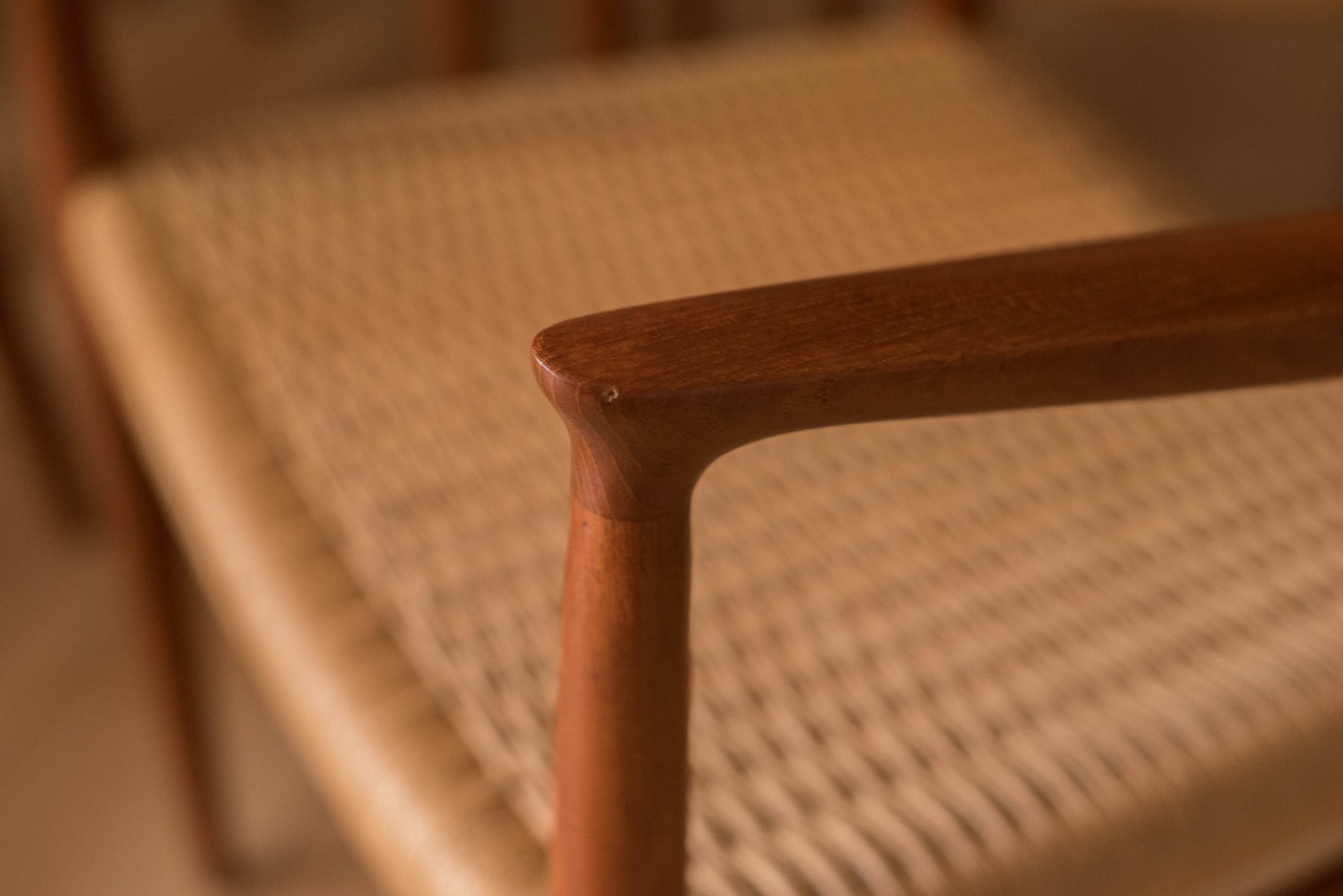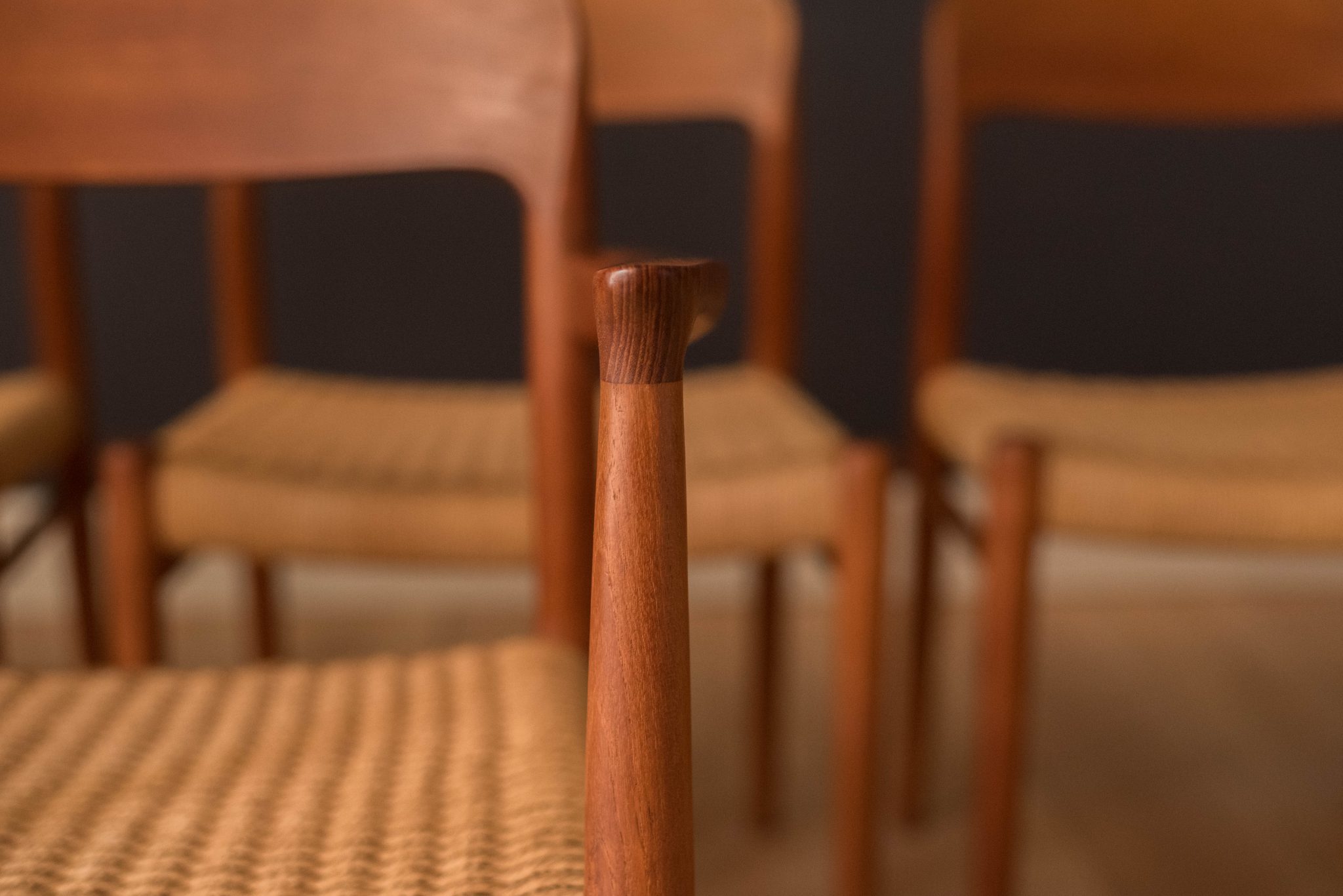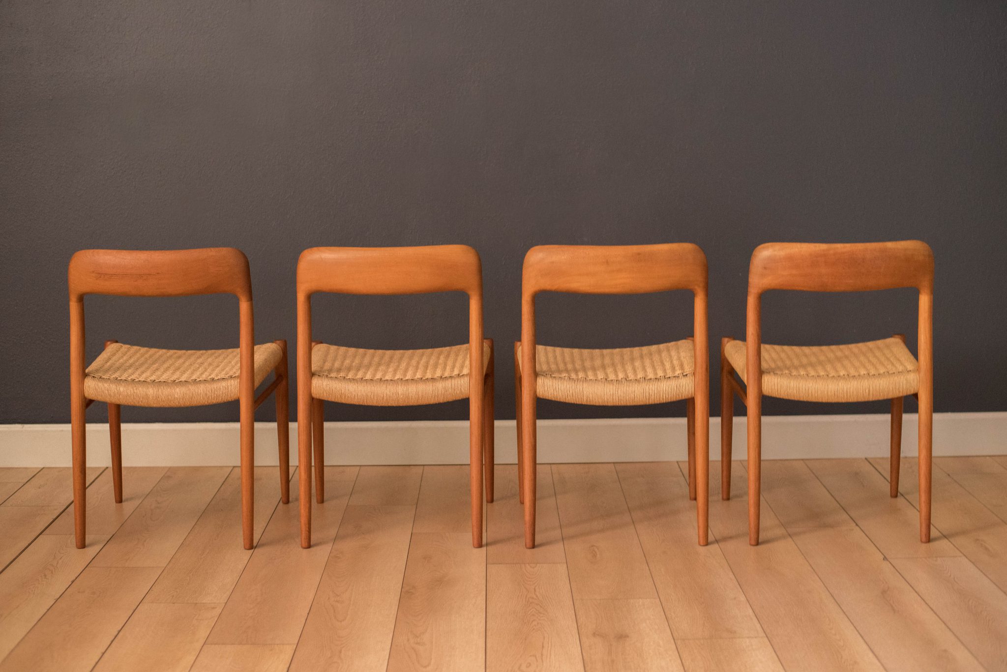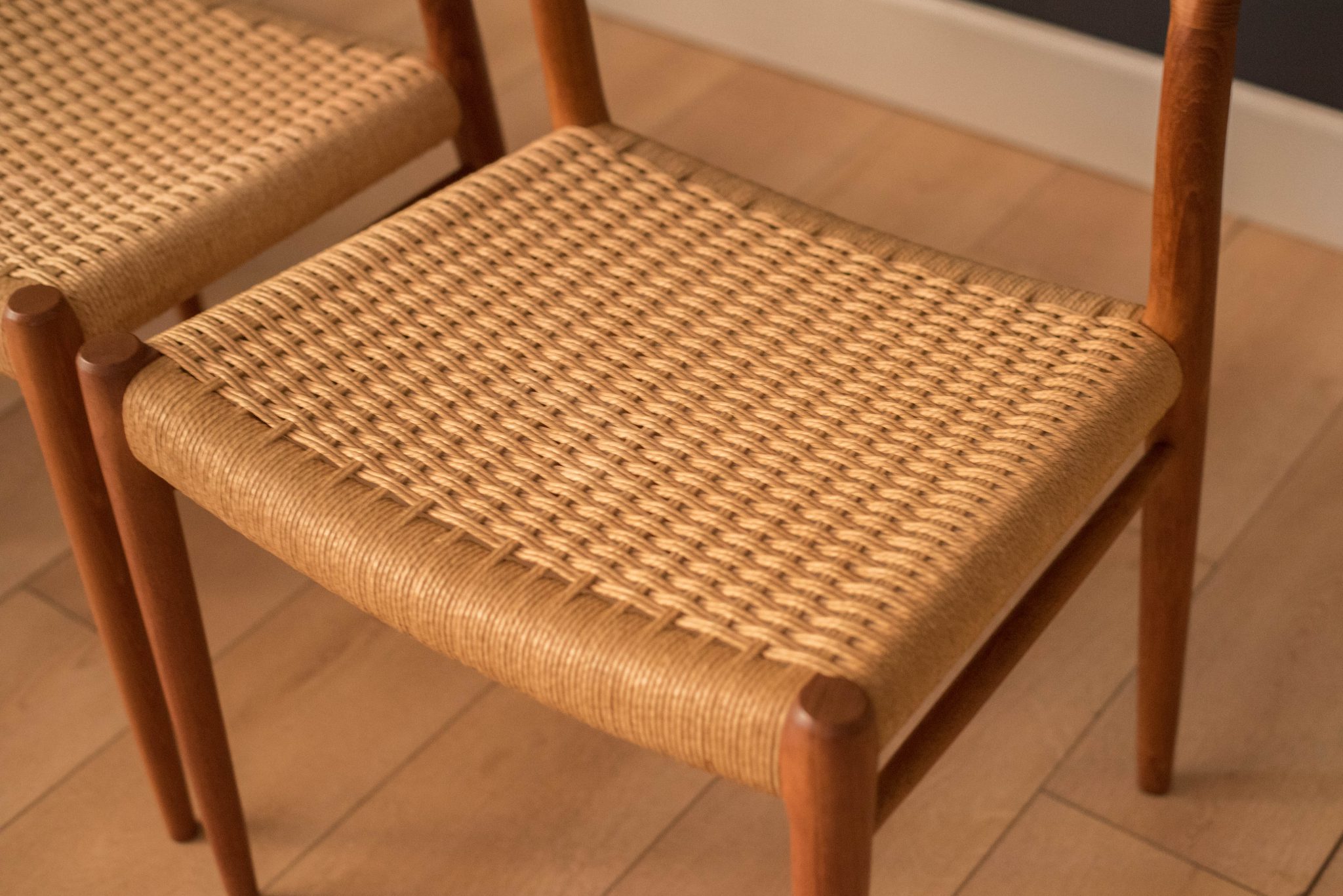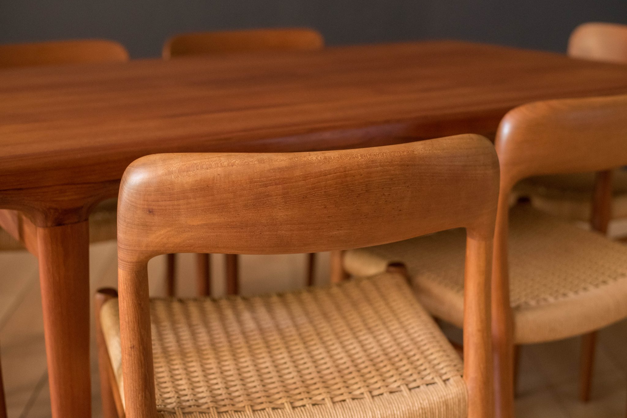Mid-Century Modern Niels O. Møller dining chairs for J.L. Møller Møbelfabrik in teak. This set includes four Moller no. 75 side chairs and two no. 56 armchairs. Seats have original papercord seating all intact.