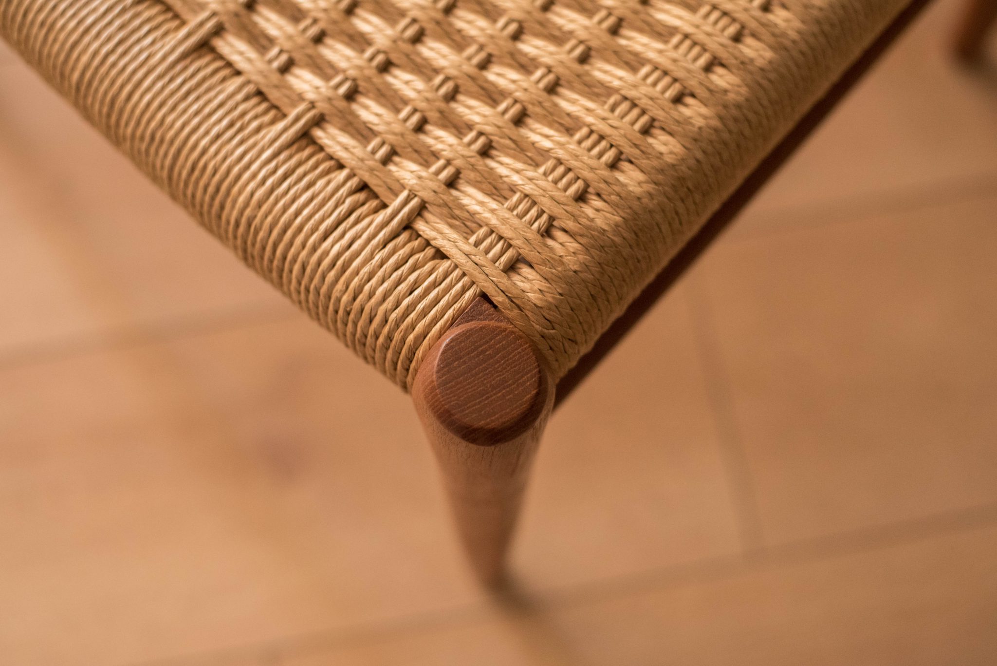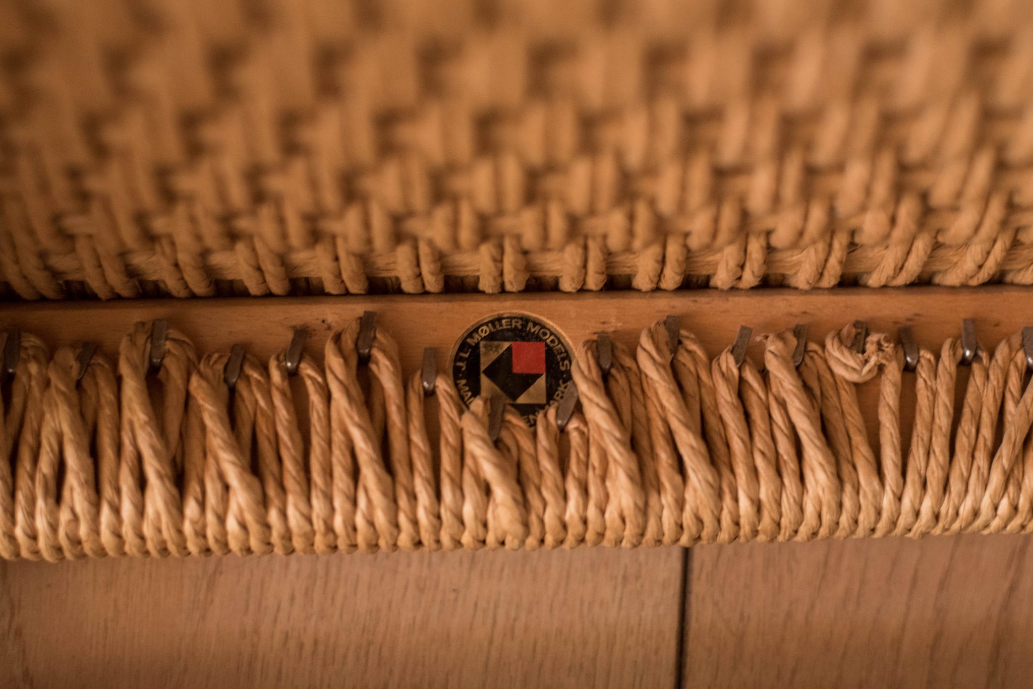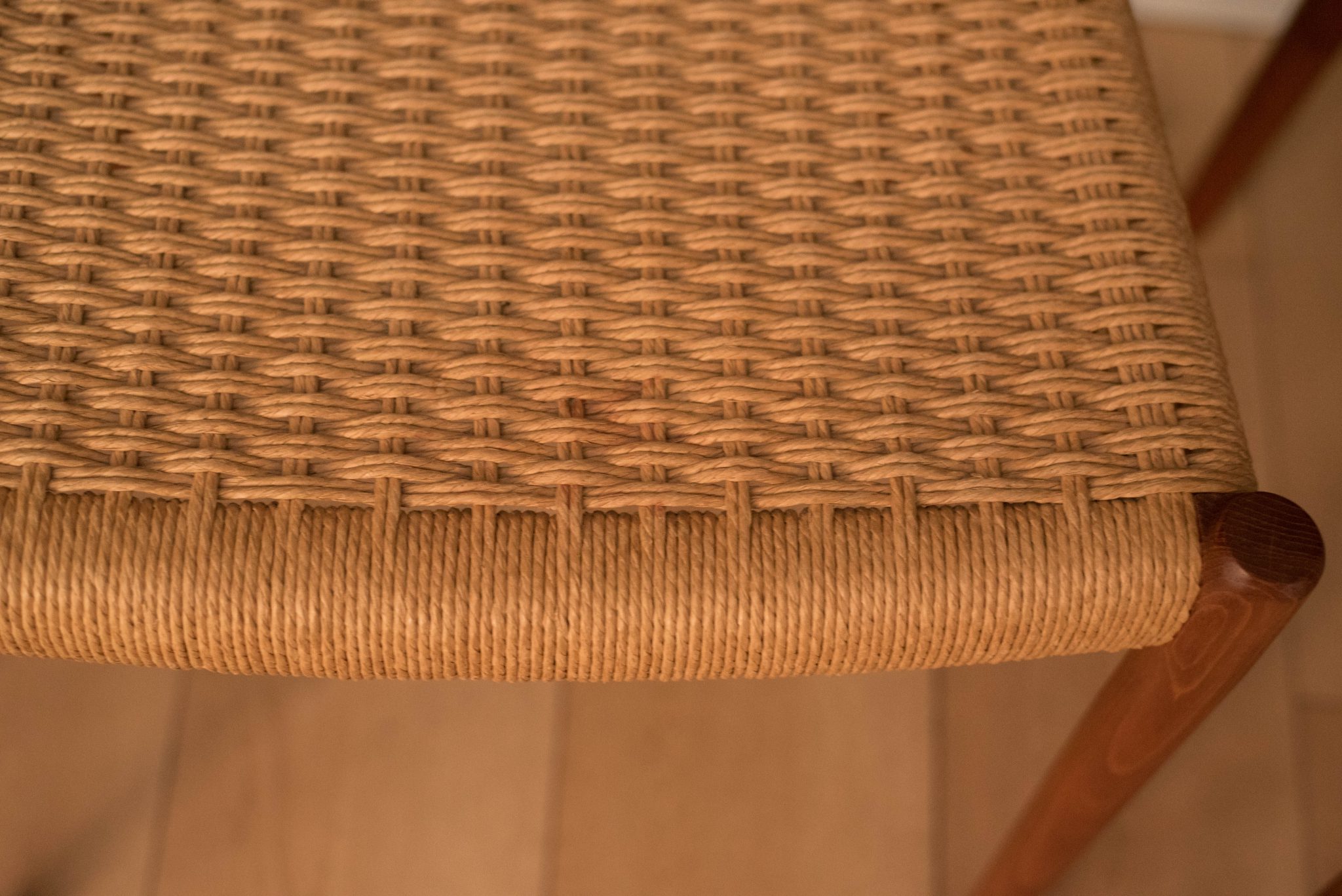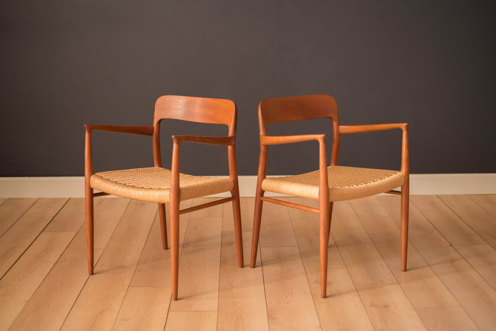 Mid-Century Modern Niels O. Møller dining chairs for J.L. Møller Møbelfabrik in teak. This set includes four Moller no. 75 side chairs and two no. 56 armchairs. Seats have original papercord seating all intact.