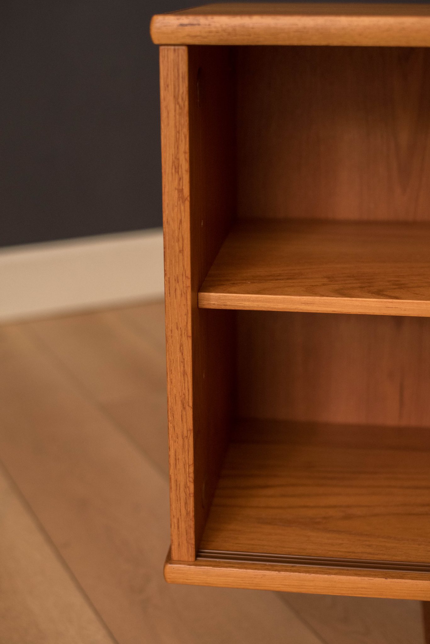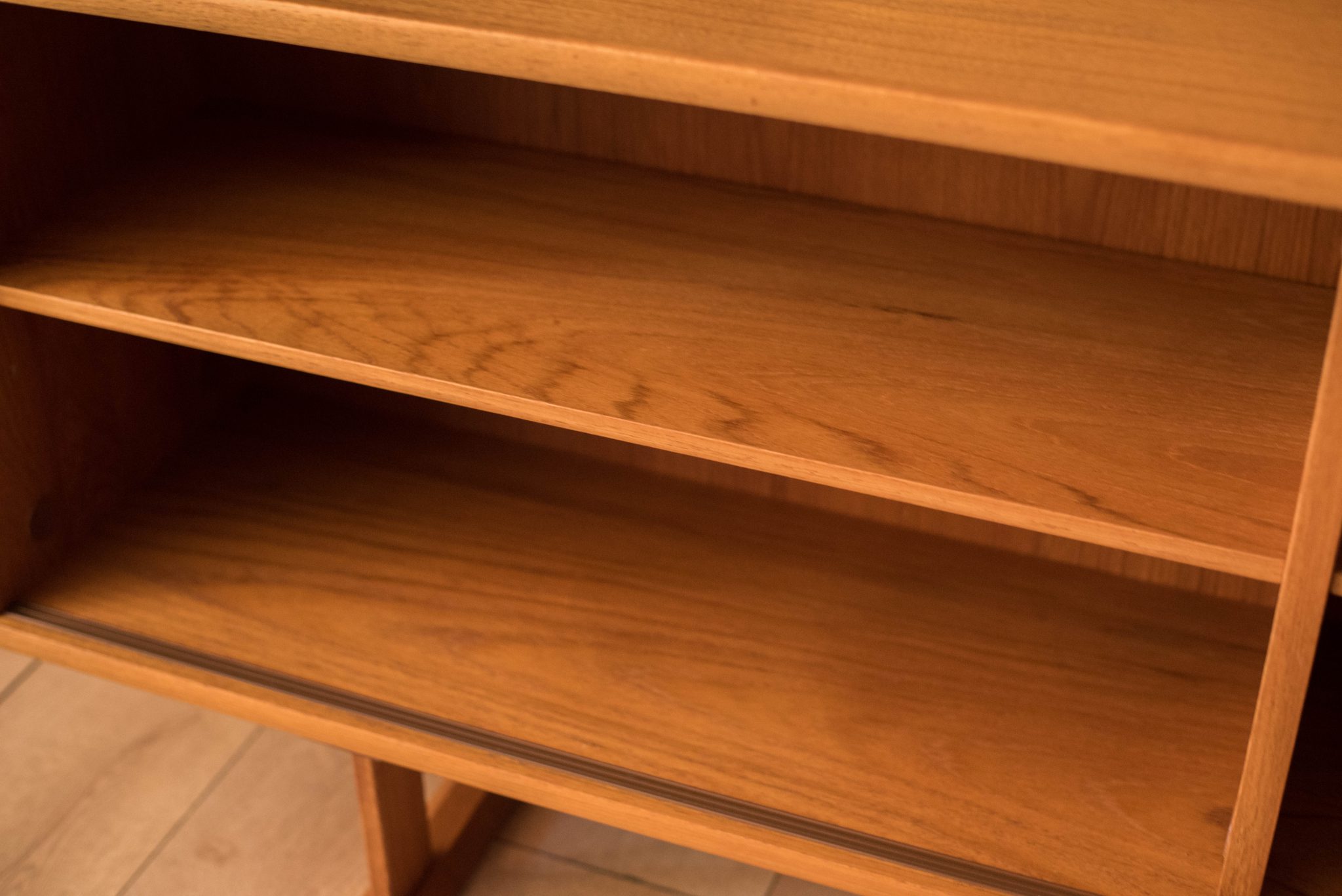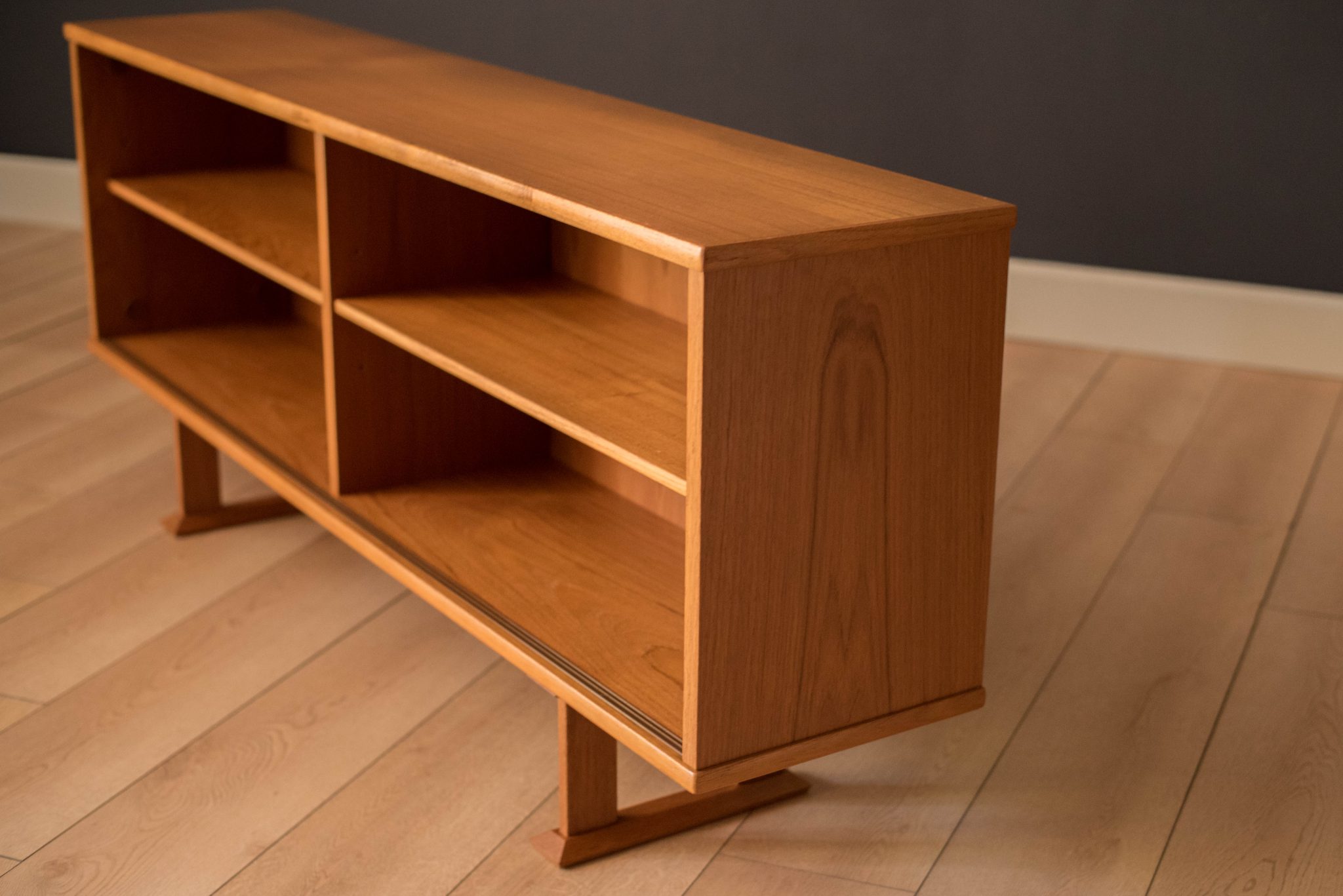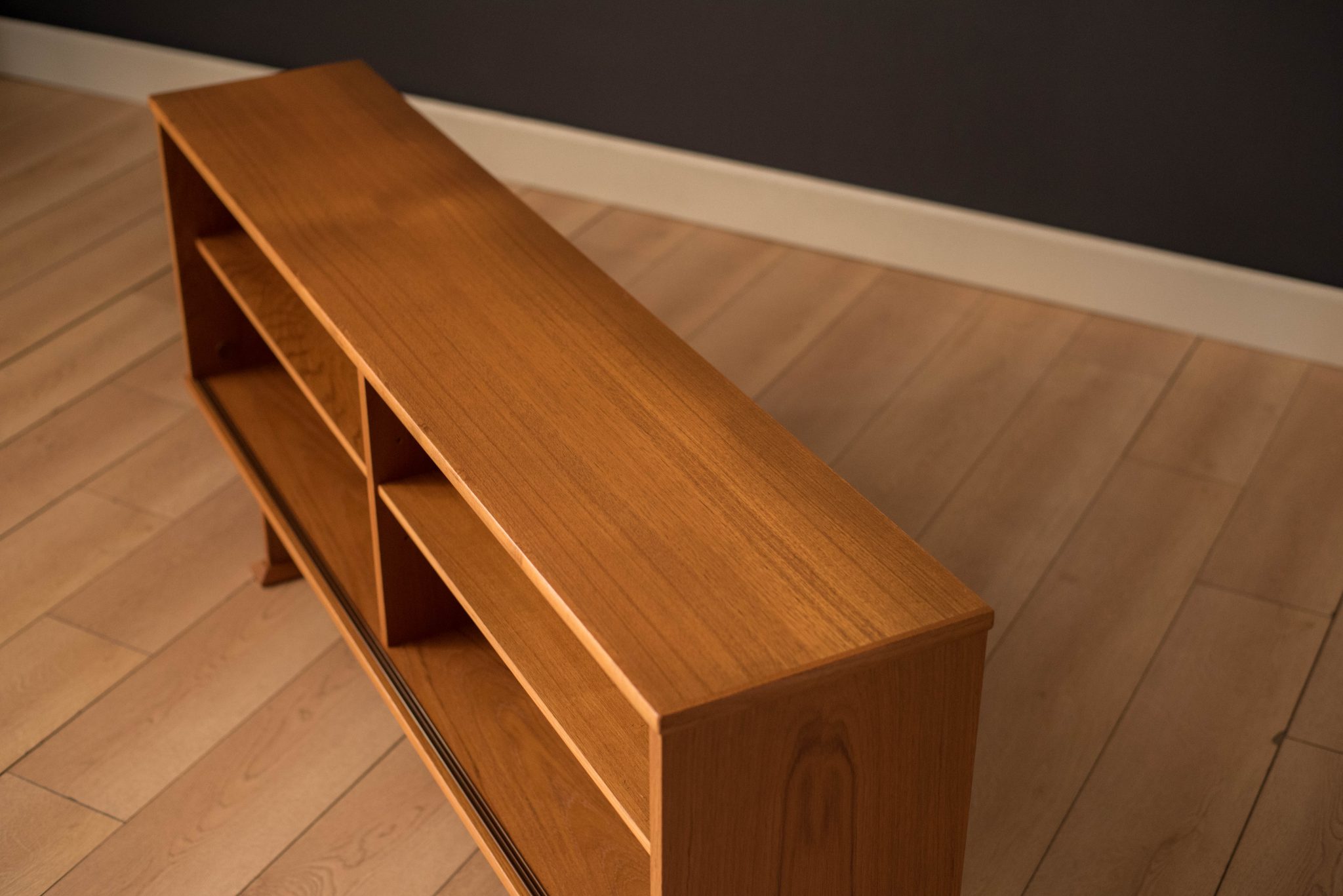 Mid-Century Modern bookcase console display cabinet by Dyrlund in teak, circa 1960s. This piece displays a slim low profile with plenty of storage. Includes adjustable shelving with sliding glass doors.