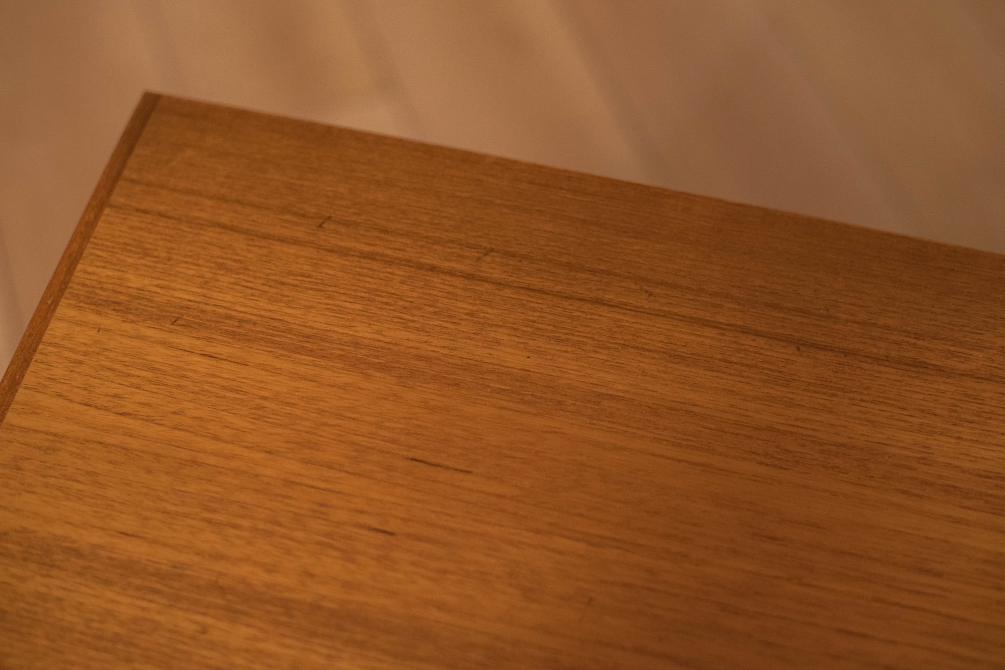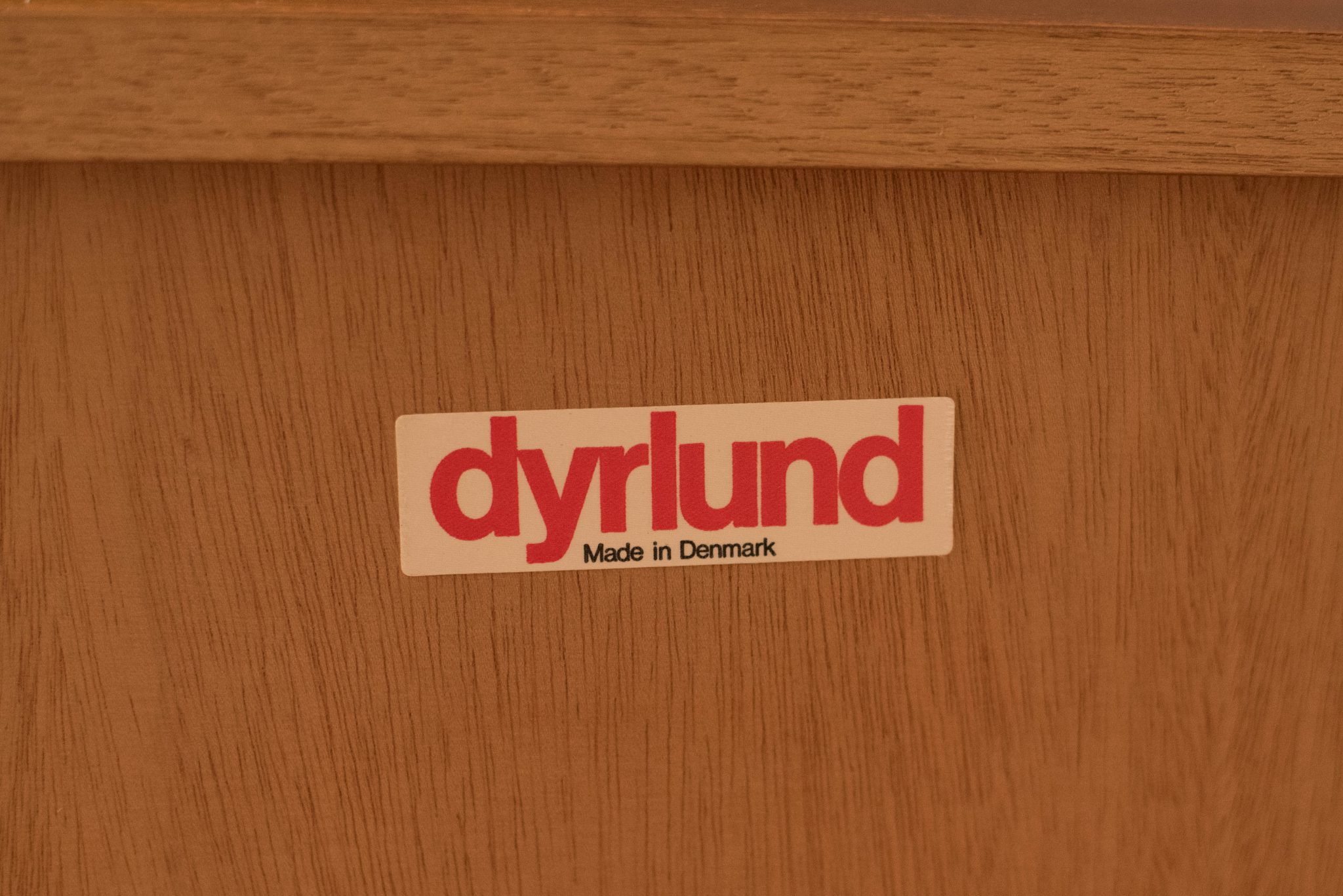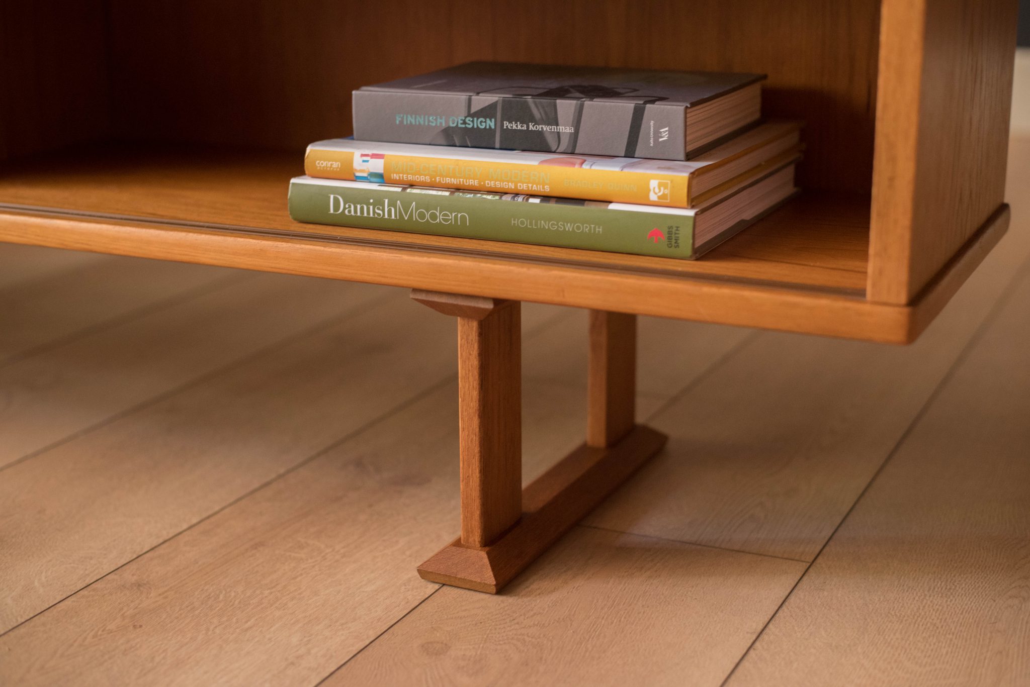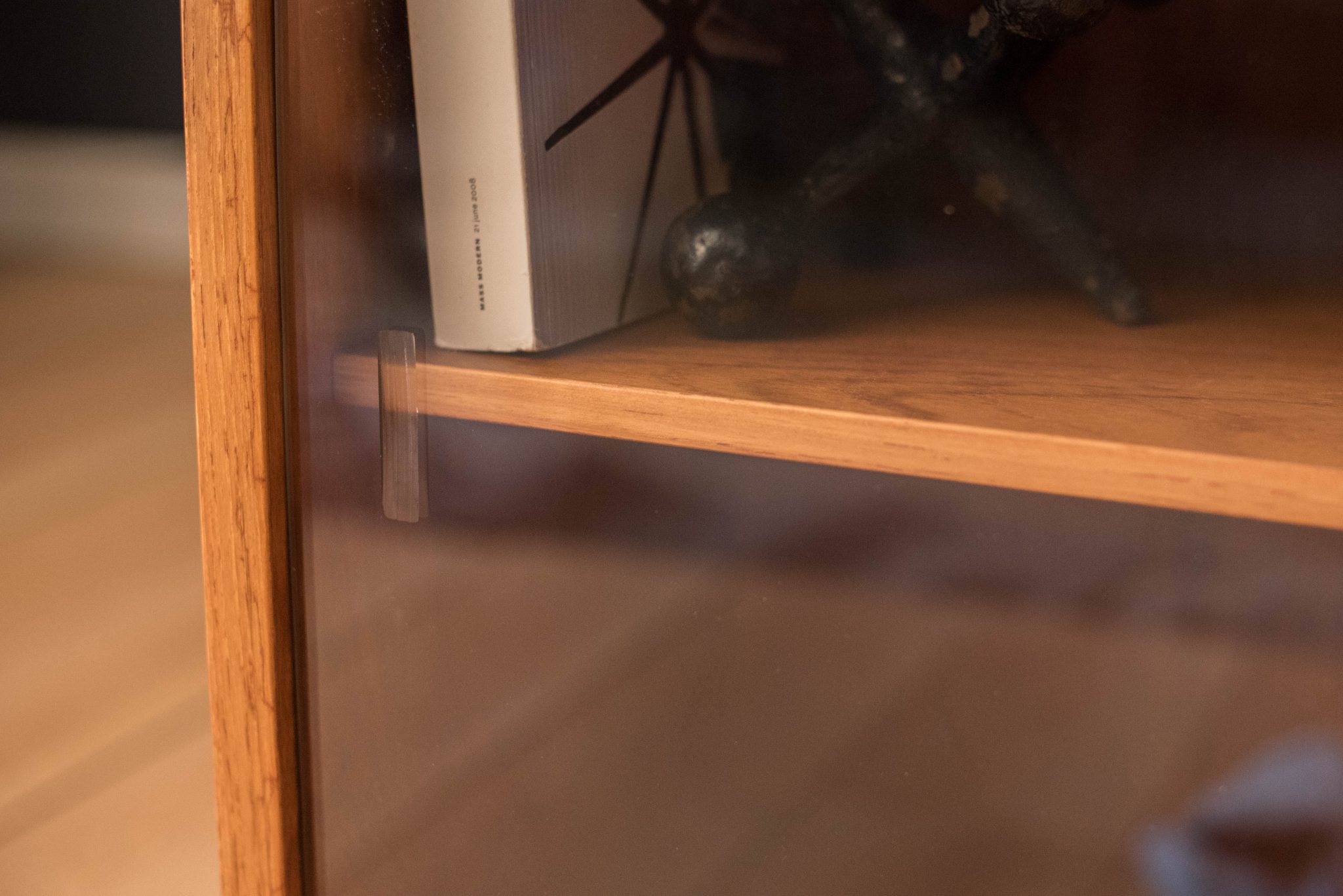 Mid-Century Modern bookcase console display cabinet by Dyrlund in teak, circa 1960s. This piece displays a slim low profile with plenty of storage. Includes adjustable shelving with sliding glass doors.