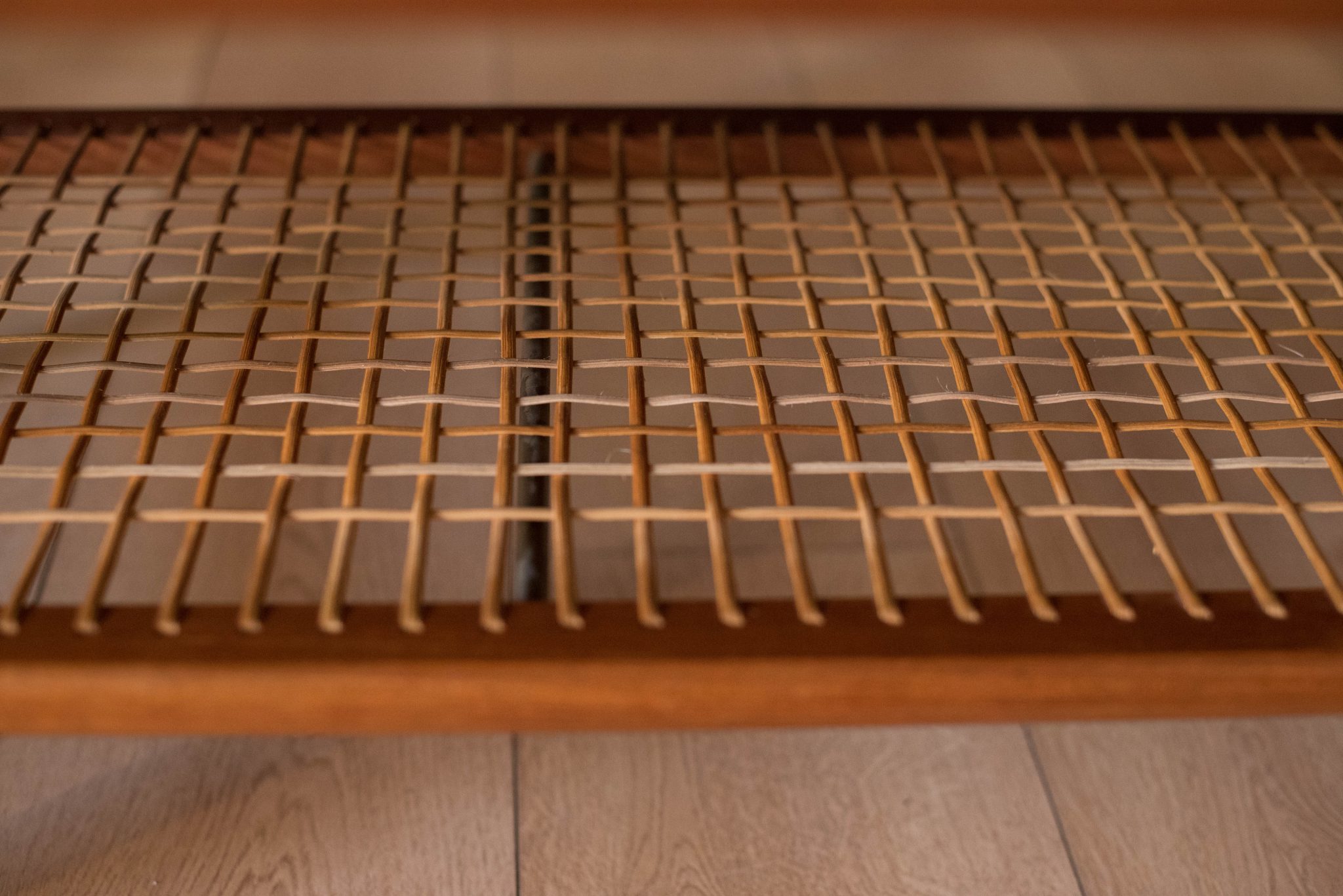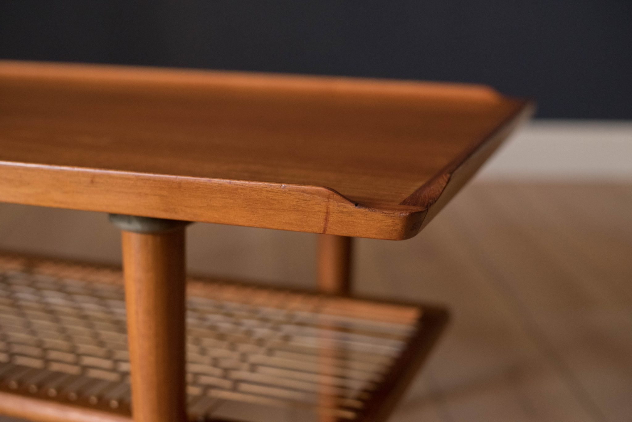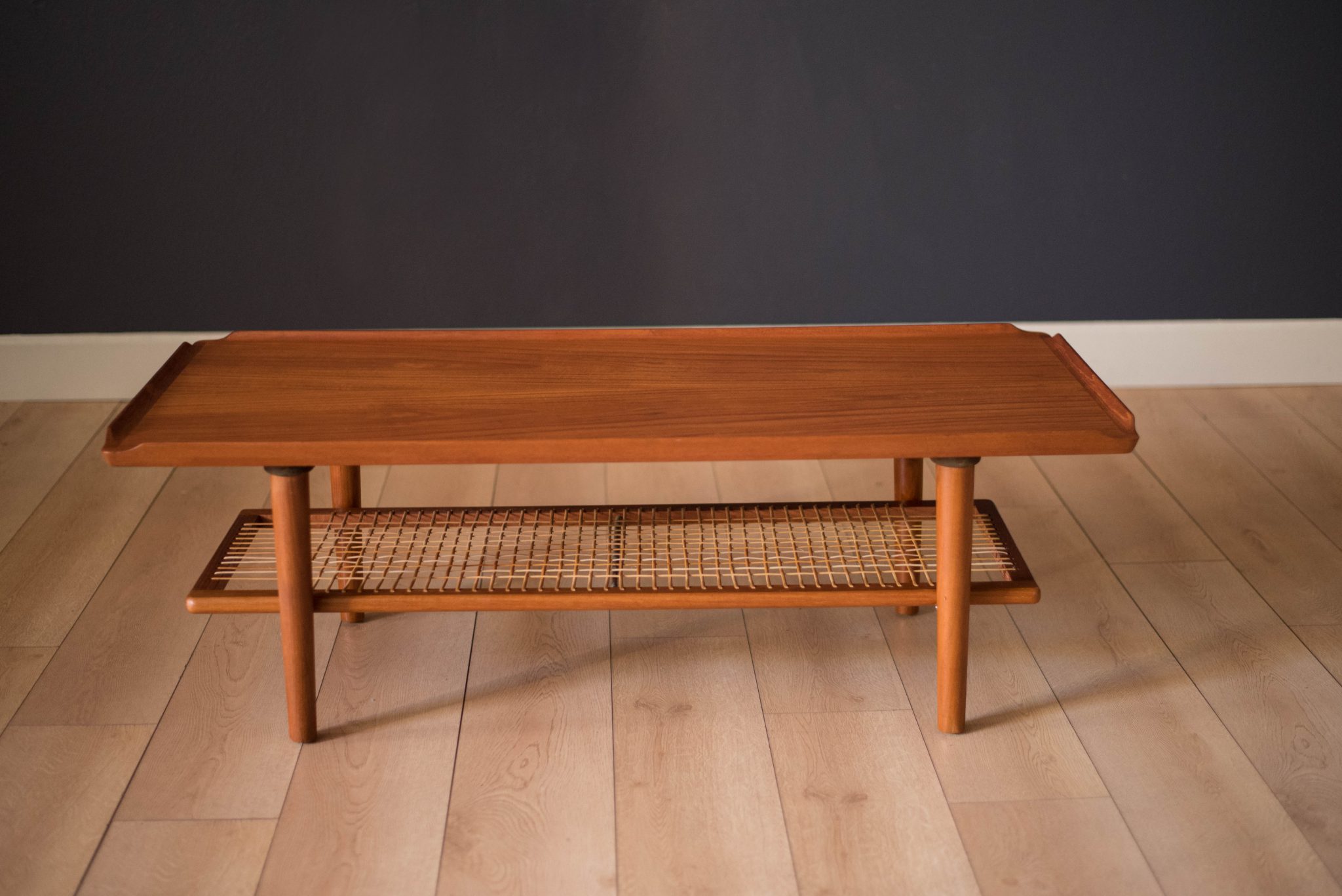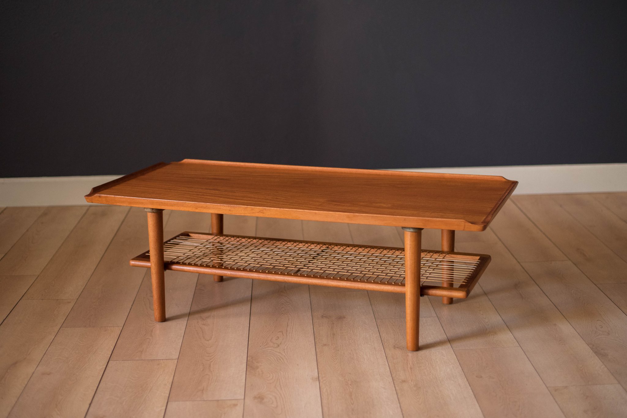 Mid century modern coffee table attributed to Georg Jensen for Kubus. This piece features a unique sculpted border and a lower woven cane magazine shelf. Displays well from all angles.