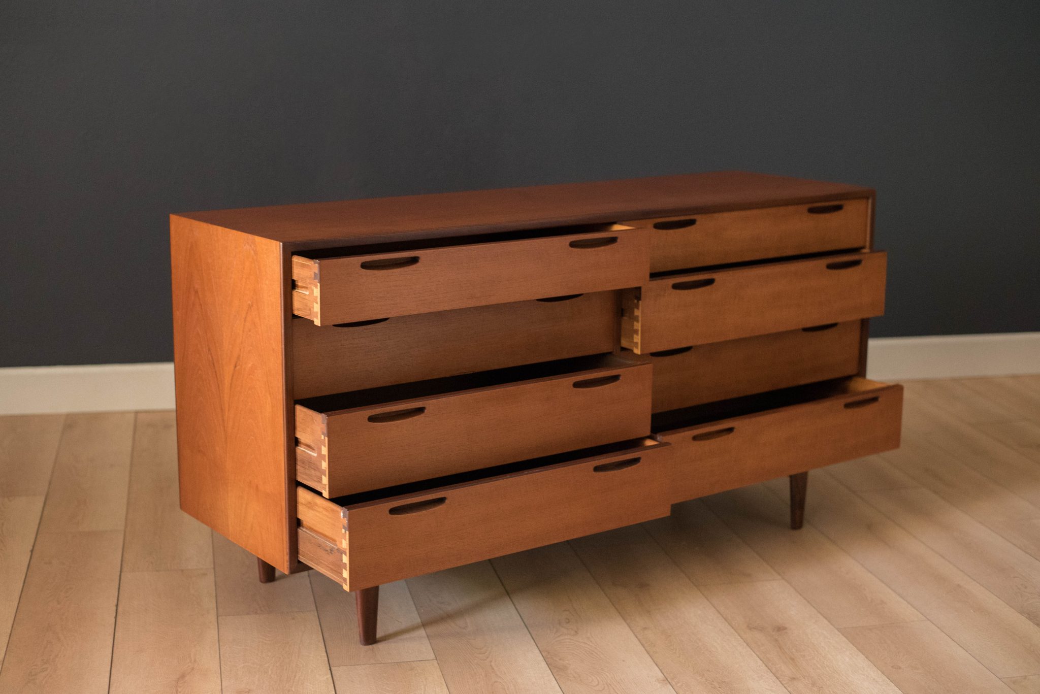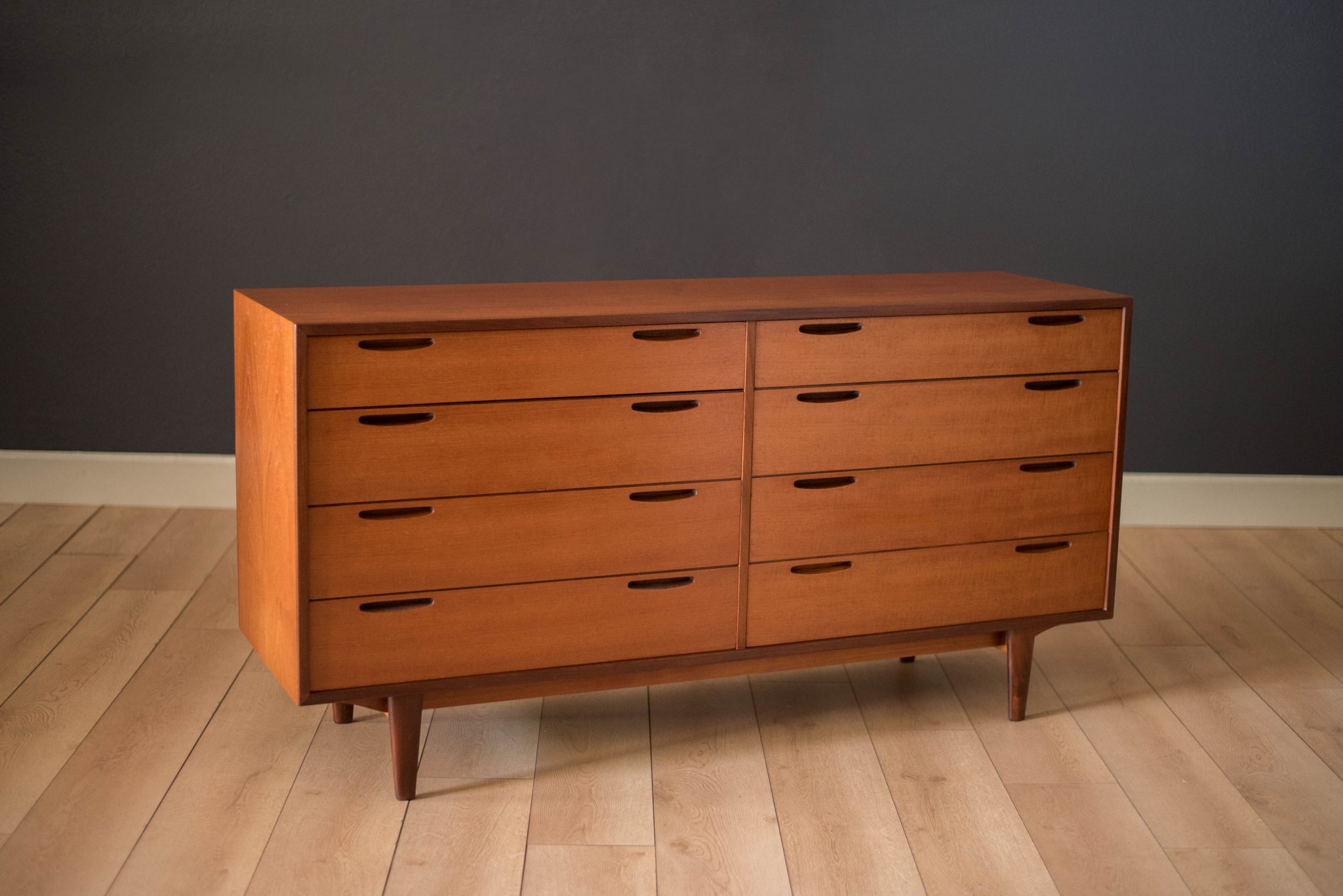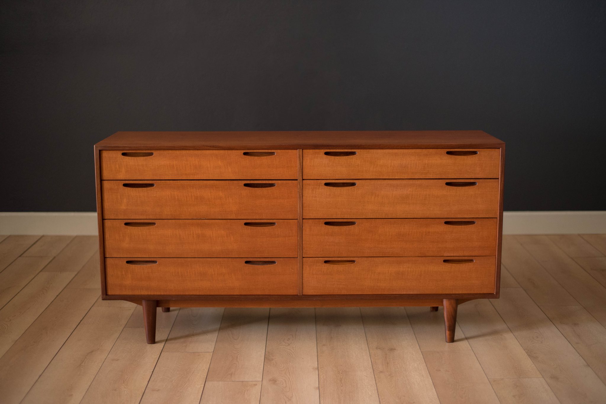 Mid-Century Modern dresser designed by Ib Kofod Larsen for J. Clausen Brande Møbelfabrik. This piece features sculpted inset handles and solid teak edge banding. Includes eight dovetailed drawers lined with teak interior. Backside is finished and can be displayed at any angle.