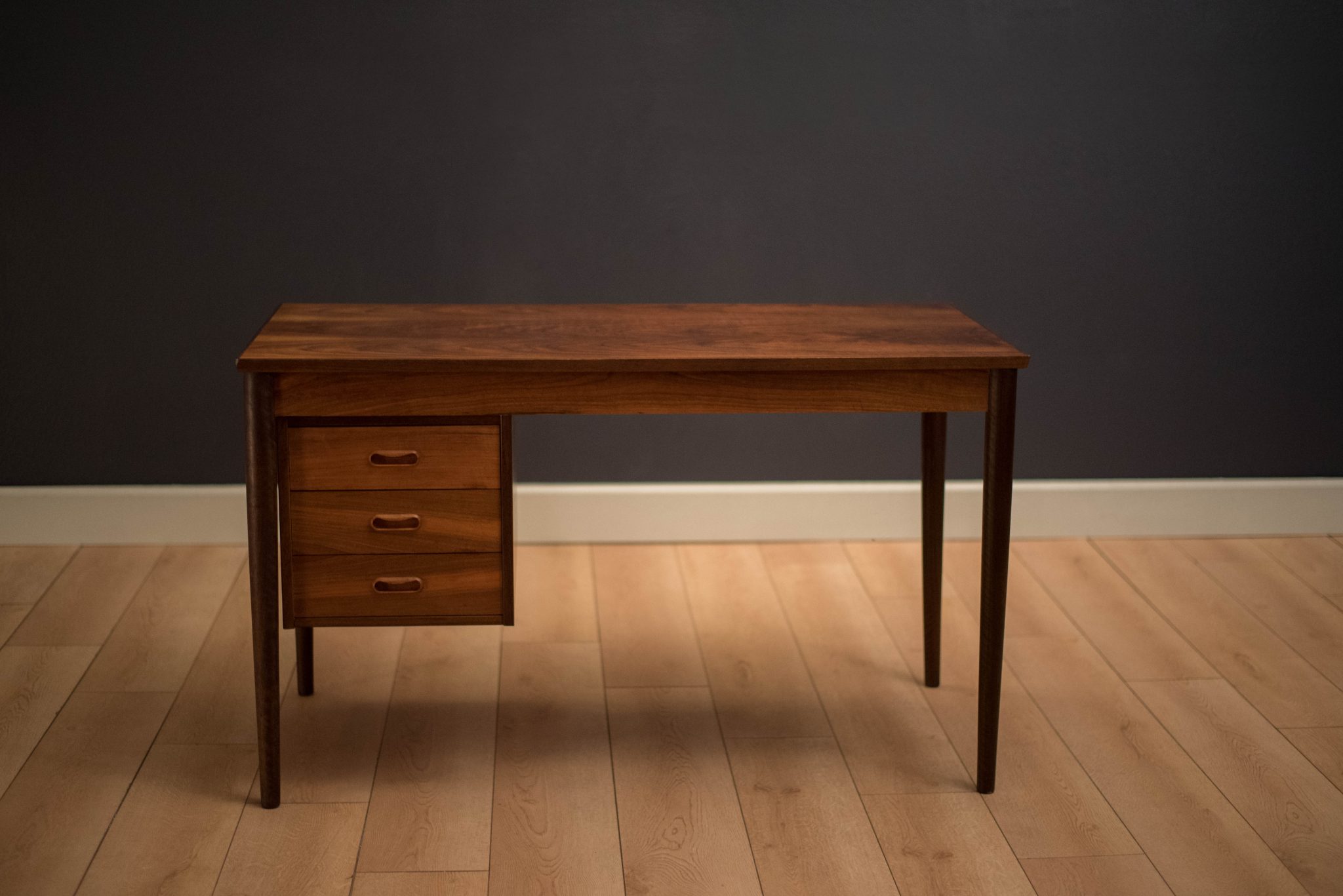 Mid century modern drop leaf desk in teak c. 1960’s. This piece is equipped with three dovetailed drawers attached to an adjustable sliding bank. Desktop can be extended by sliding the drop leaf extension to maximize the work surface area. Finished on the backside and can be displayed at any angle.