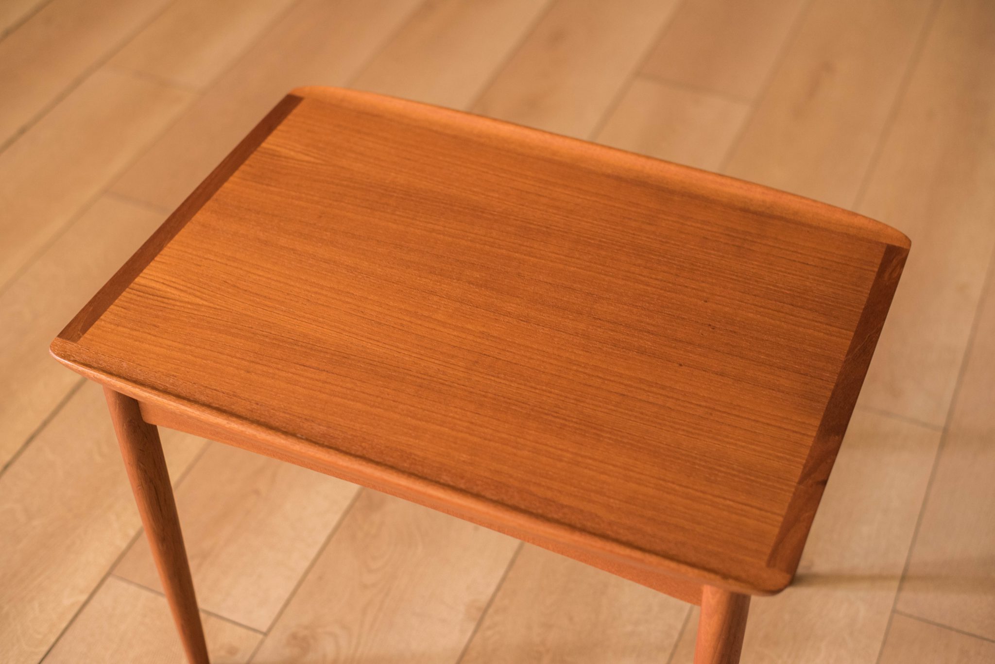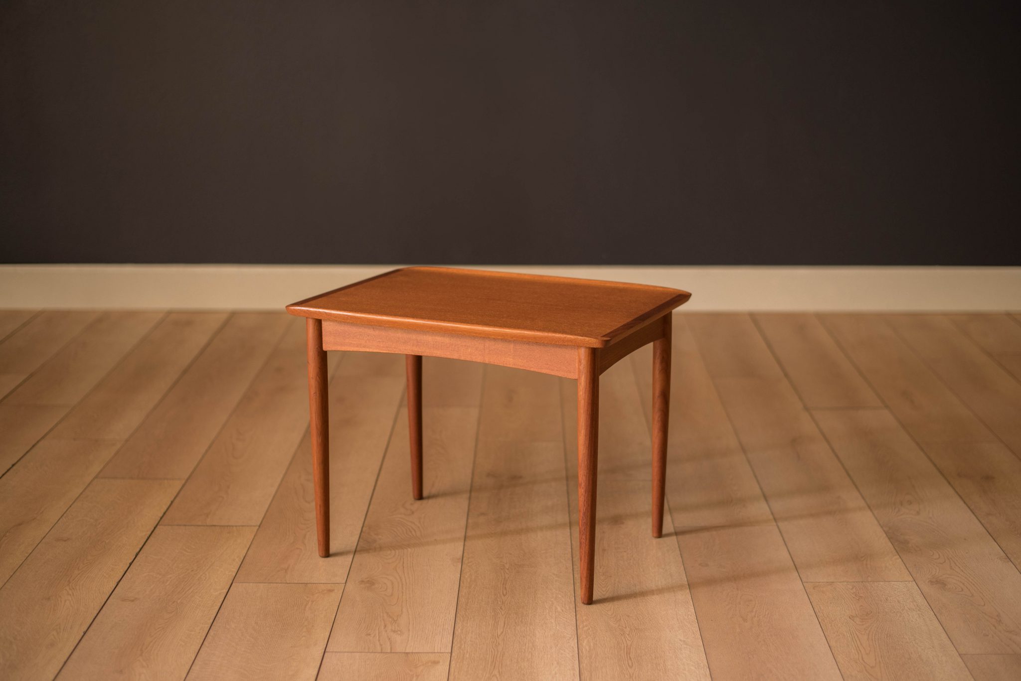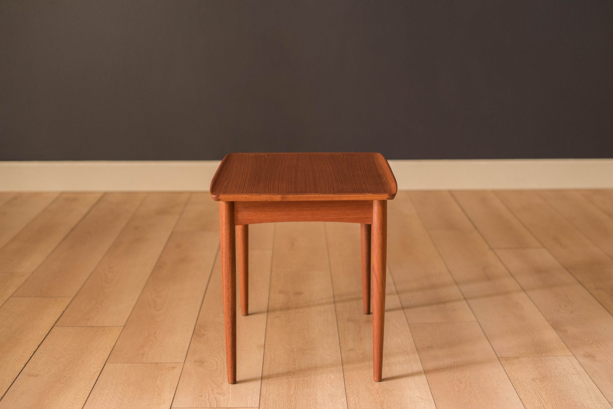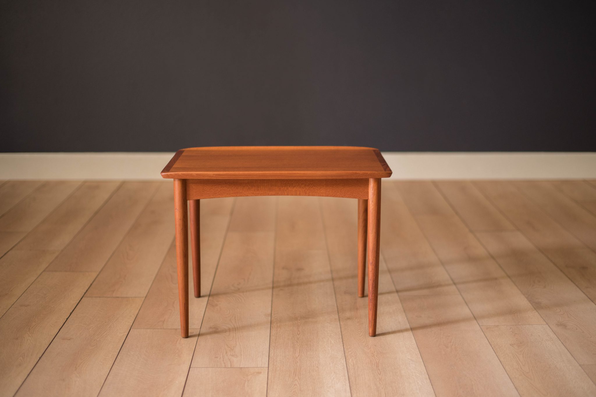 Mid-century modern teak side table manufactured by Mobelintarsia, Denmark, circa 1960s. Features a sculpted raised lip with a contrasting edge band well-fitted by finger joinery. Finished with classic dowel legs and a supporting apron.