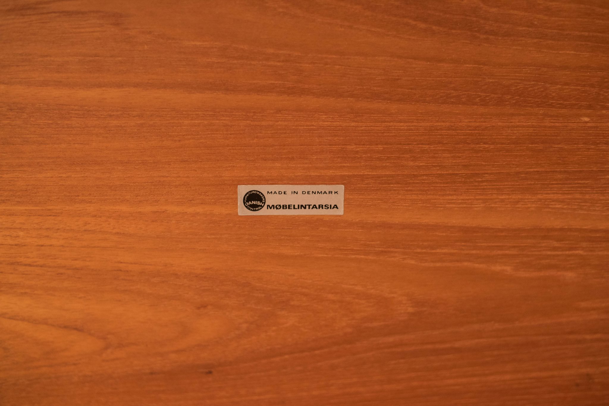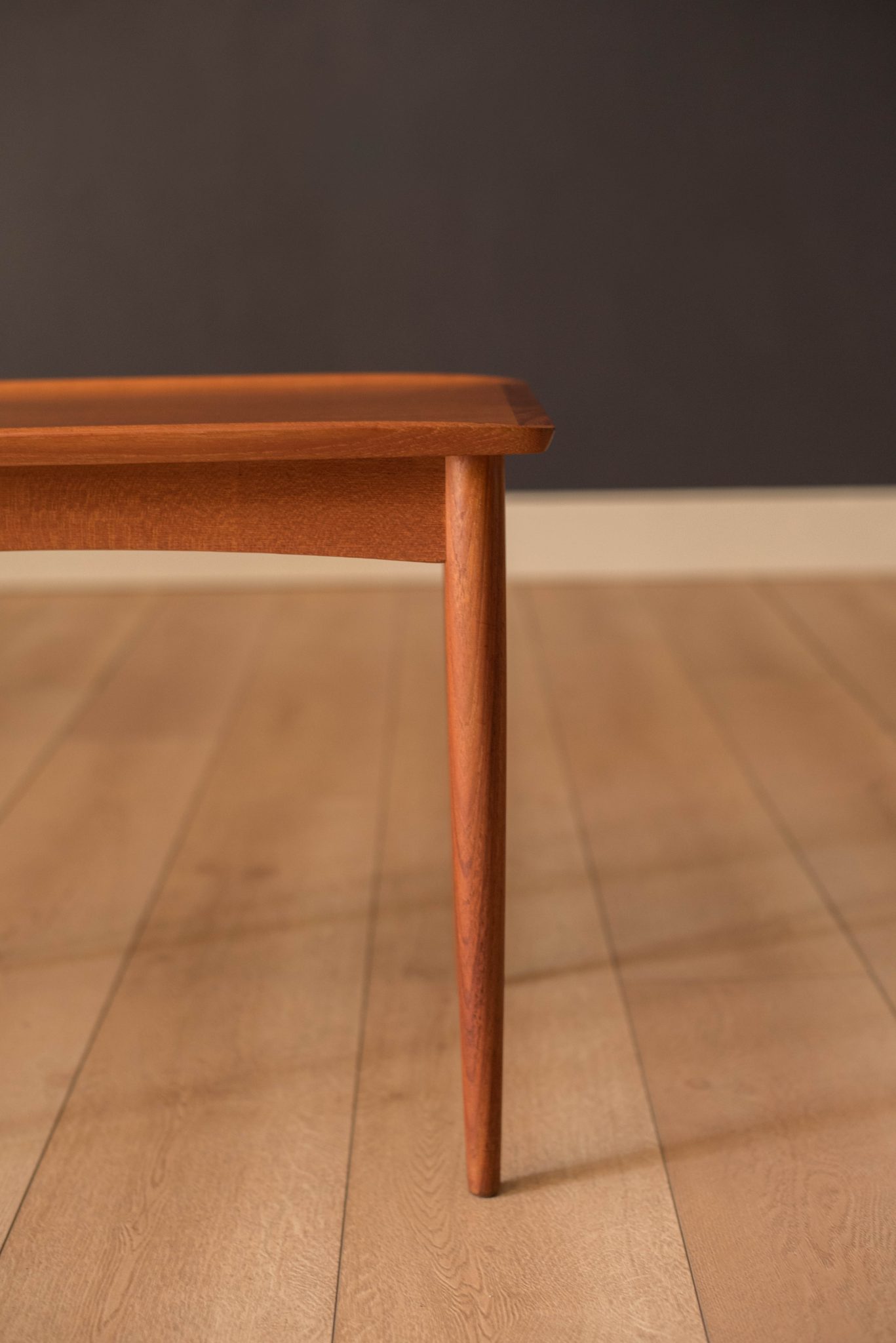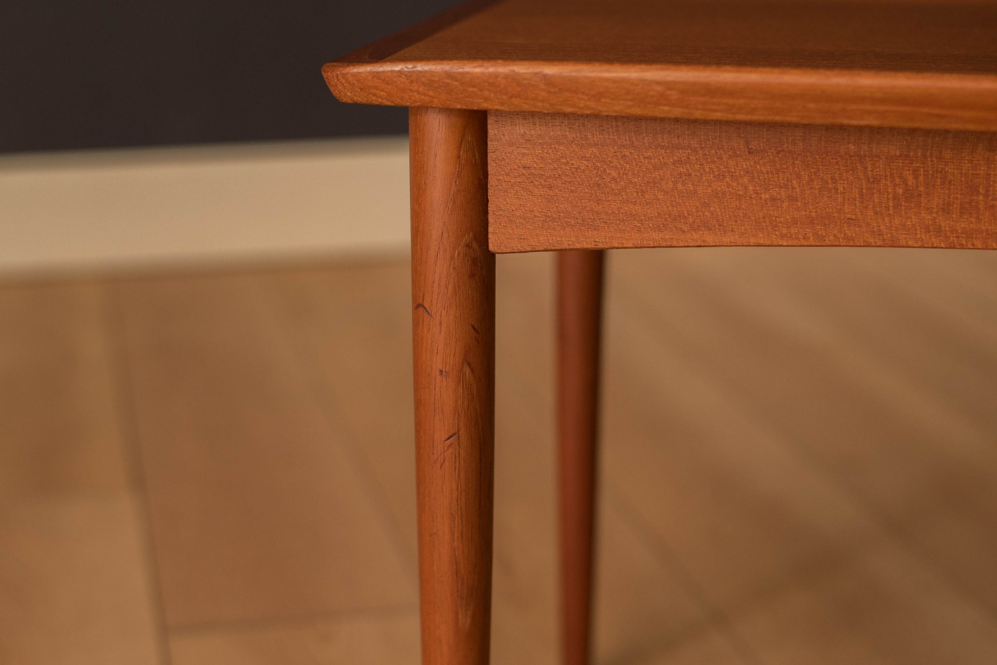 Mid-century modern teak side table manufactured by Mobelintarsia, Denmark, circa 1960s. Features a sculpted raised lip with a contrasting edge band well-fitted by finger joinery. Finished with classic dowel legs and a supporting apron.