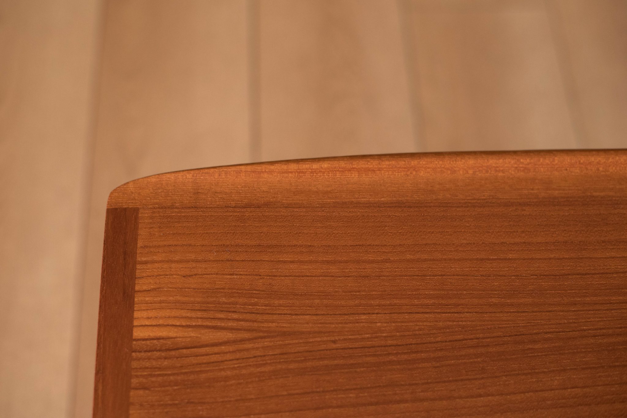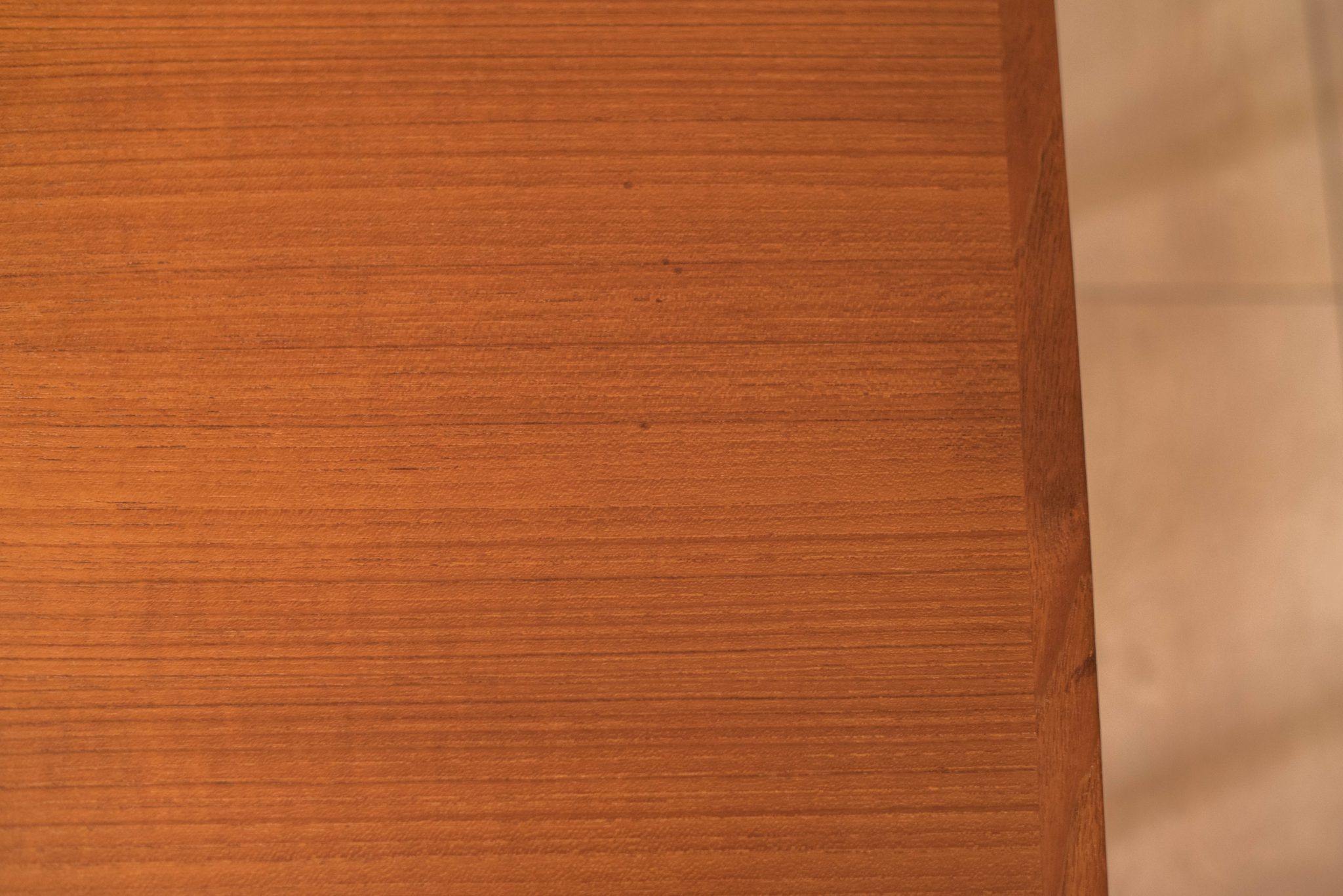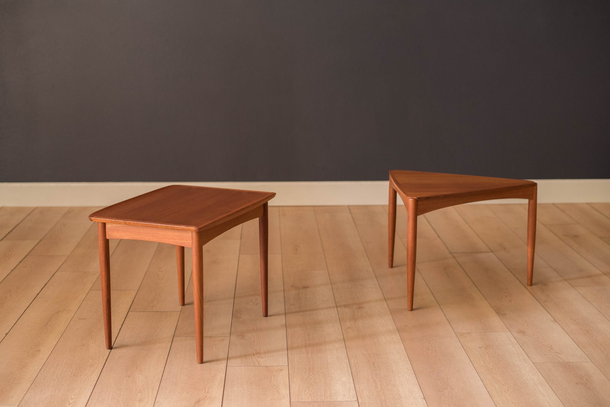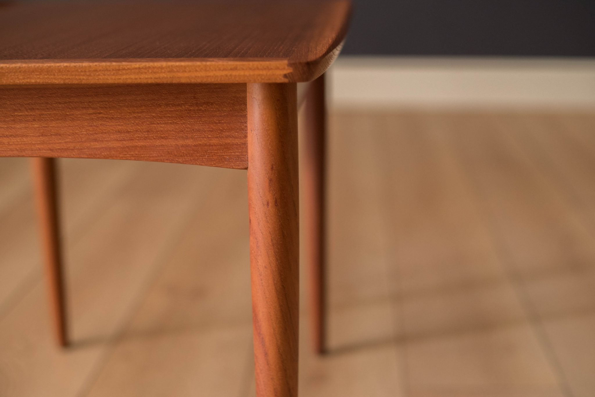 Mid-century modern teak side table manufactured by Mobelintarsia, Denmark, circa 1960s. Features a sculpted raised lip with a contrasting edge band well-fitted by finger joinery. Finished with classic dowel legs and a supporting apron.