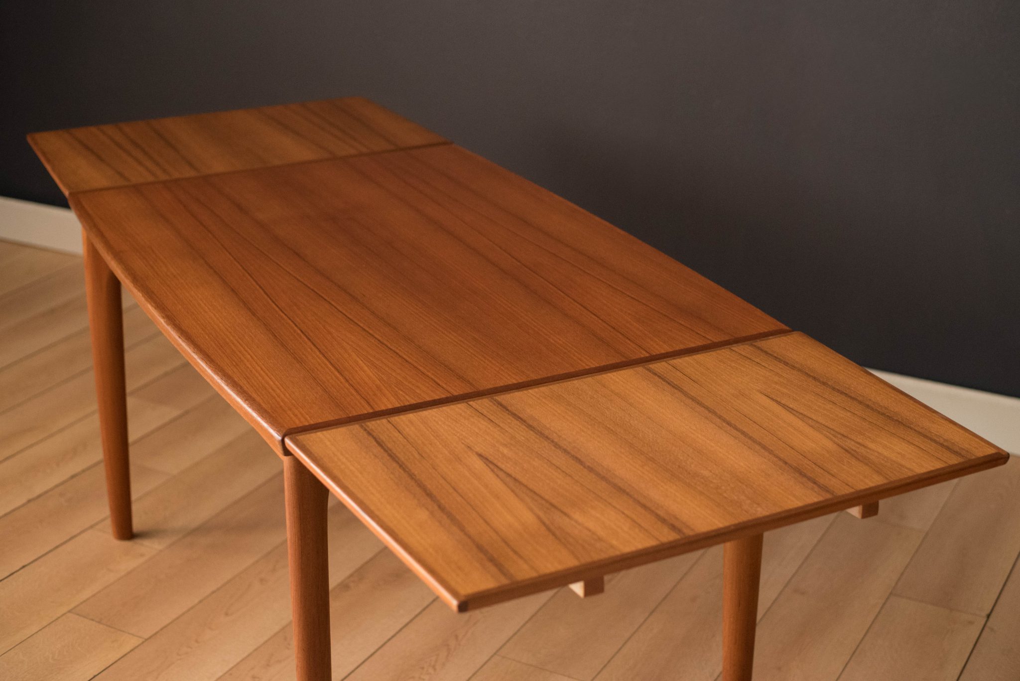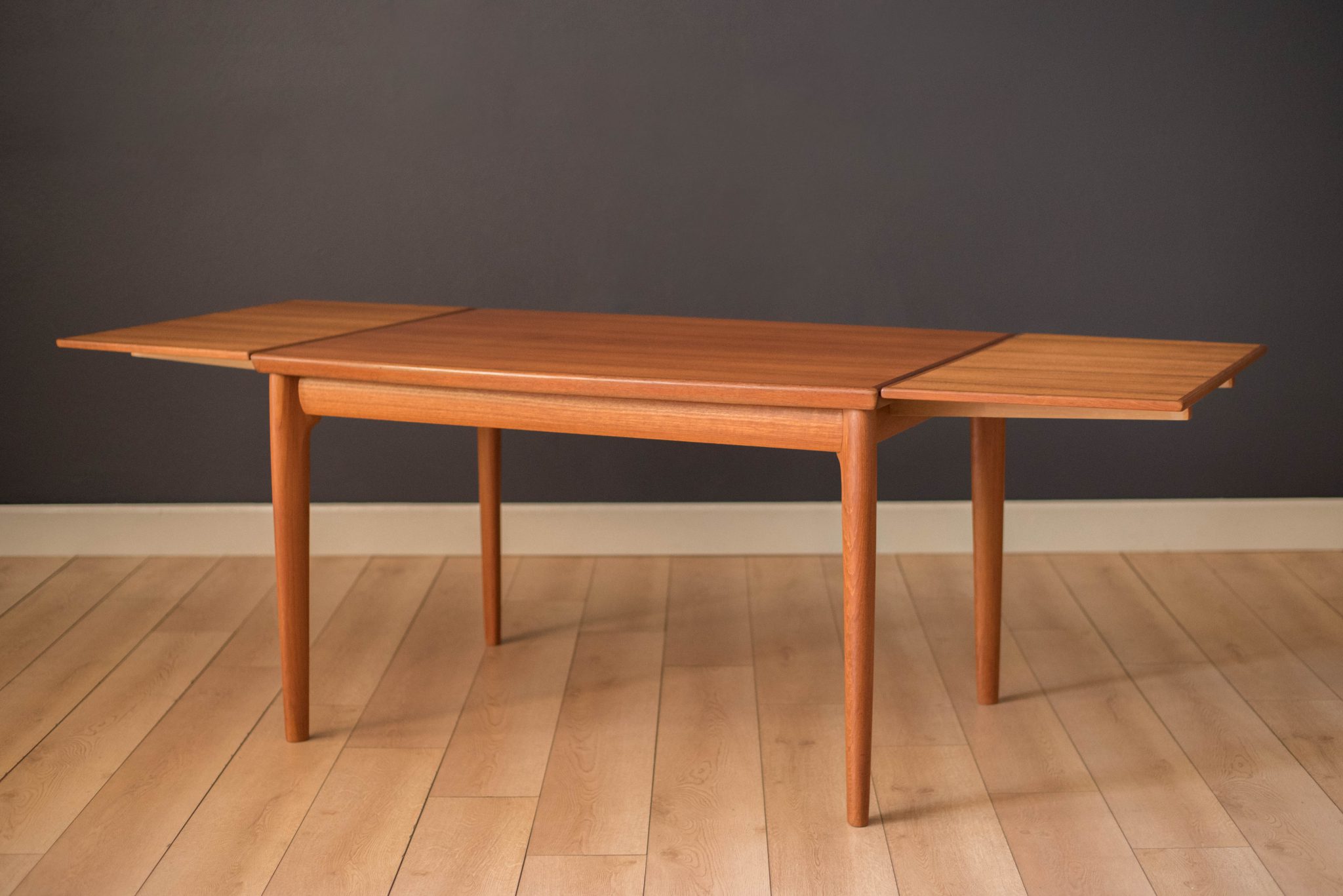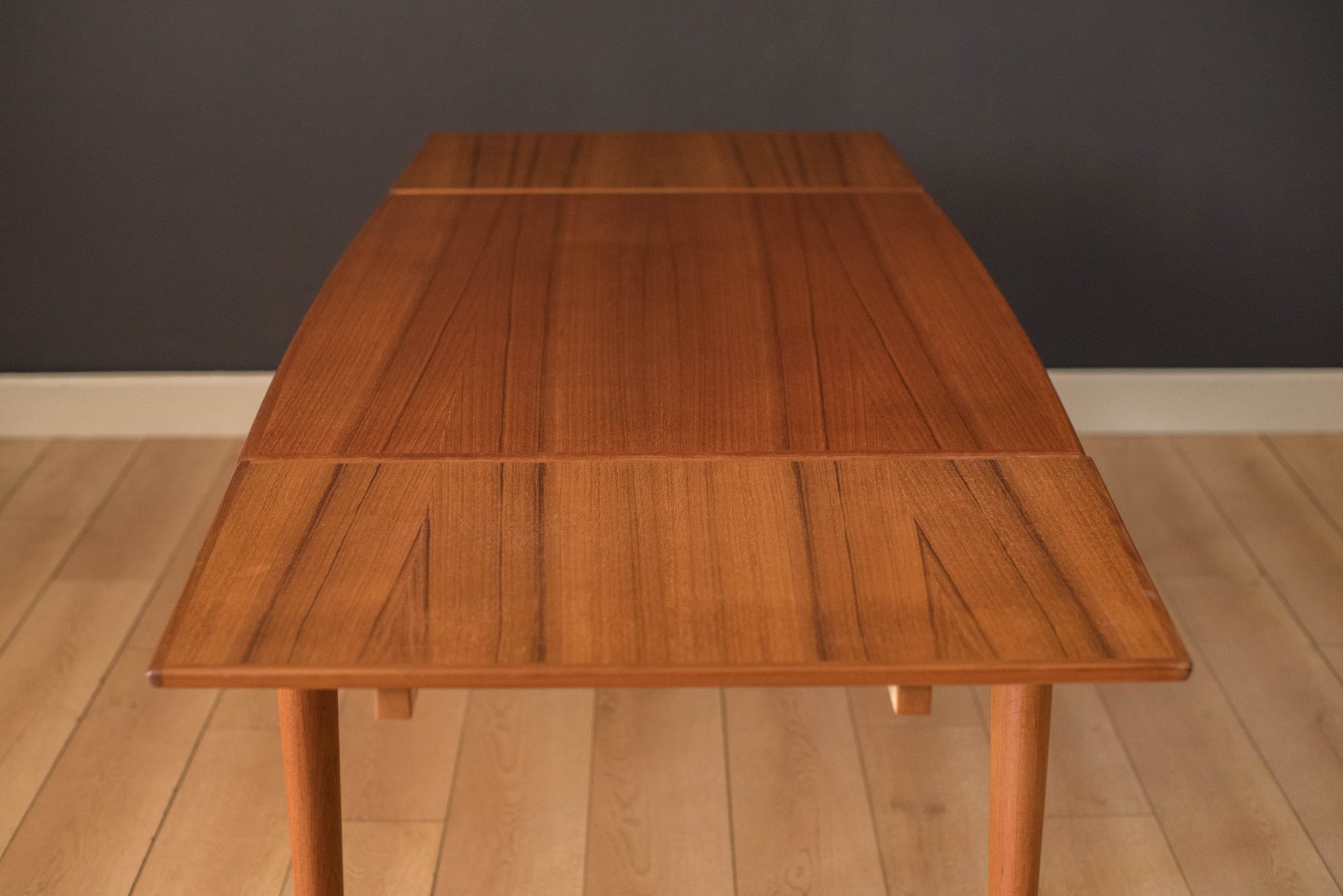 Mid-Century Modern draw leaf dining table designed by Grete Jalk for Glostrup Møbelfabrik in teak, circa 1960s. This piece features signature sculpted legs and a unique boat shaped tabletop. Includes two expandable draw leaves that cleverly store underneath the top.