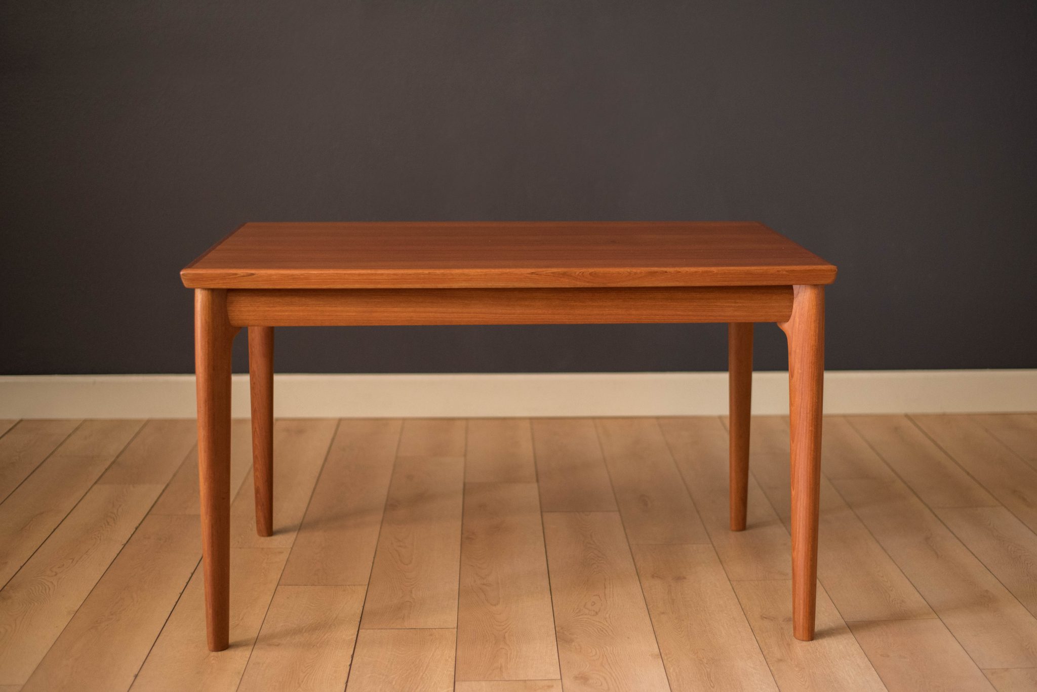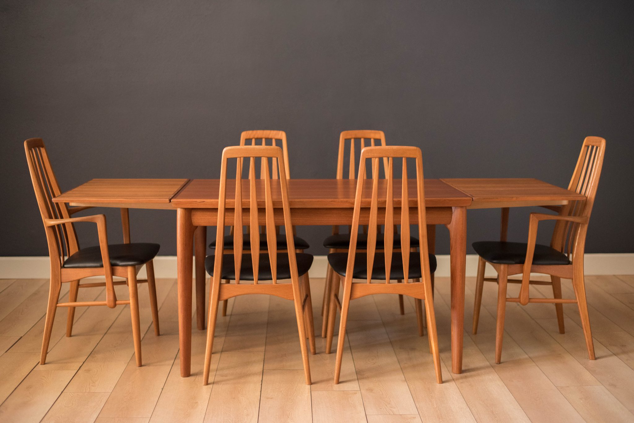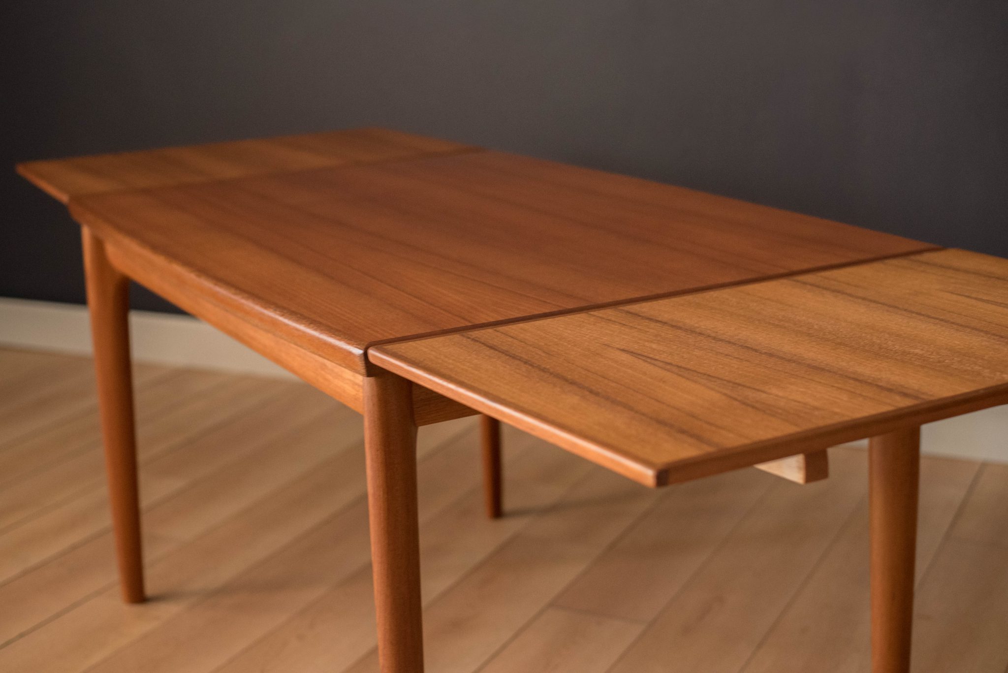 Mid-Century Modern draw leaf dining table designed by Grete Jalk for Glostrup Møbelfabrik in teak, circa 1960s. This piece features signature sculpted legs and a unique boat shaped tabletop. Includes two expandable draw leaves that cleverly store underneath the top.