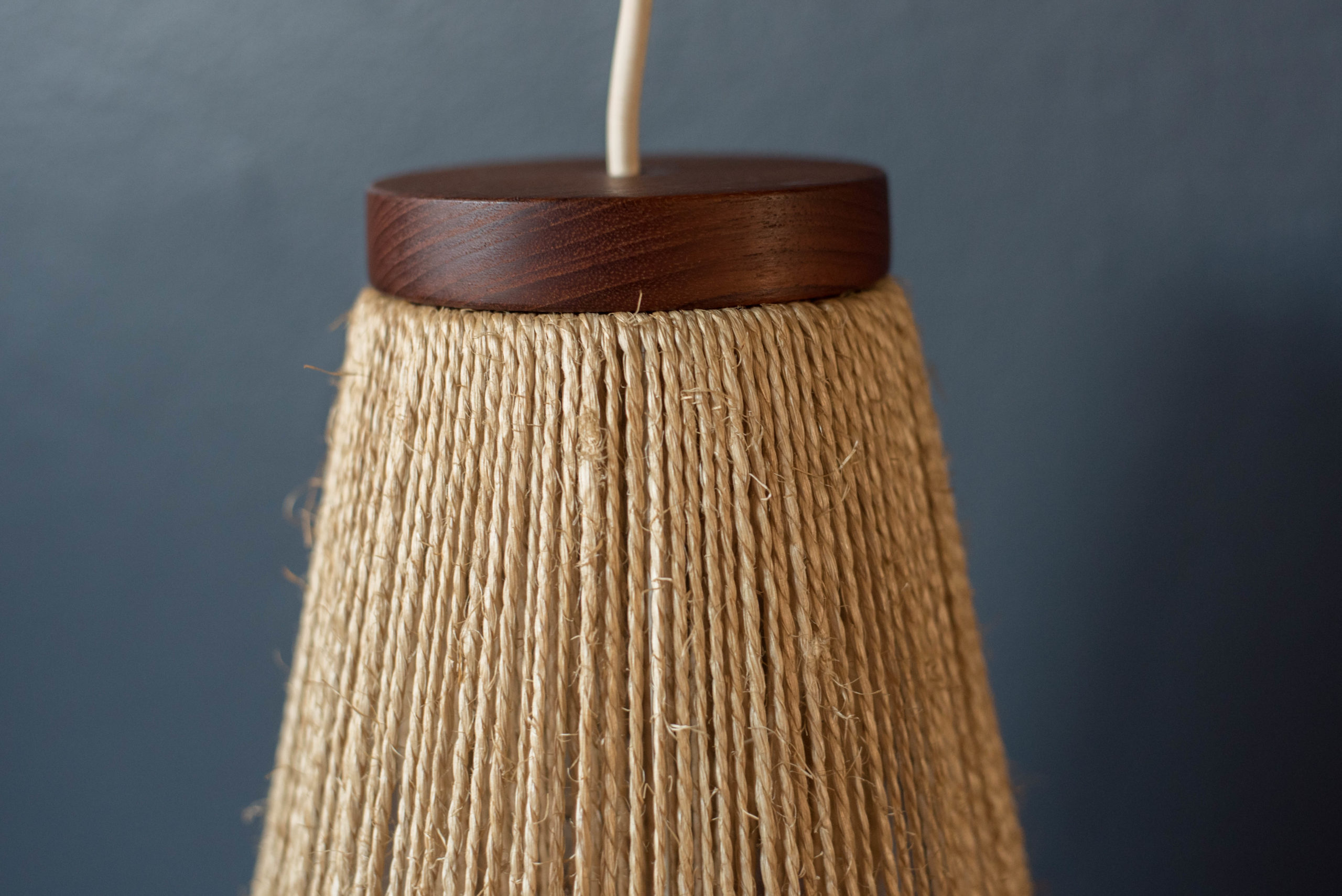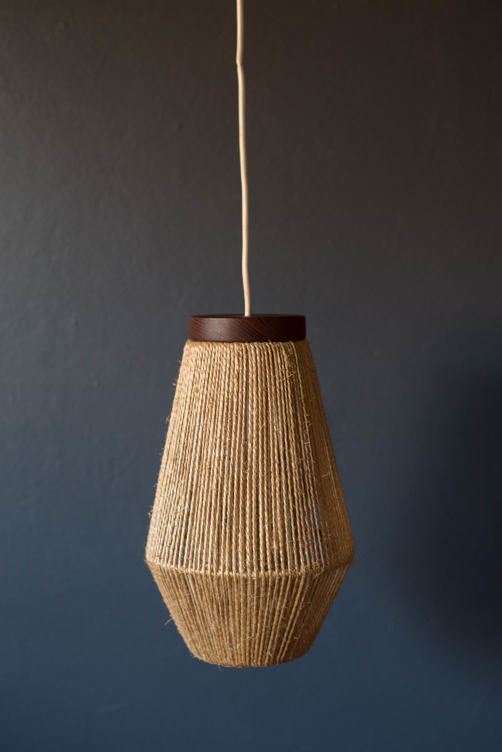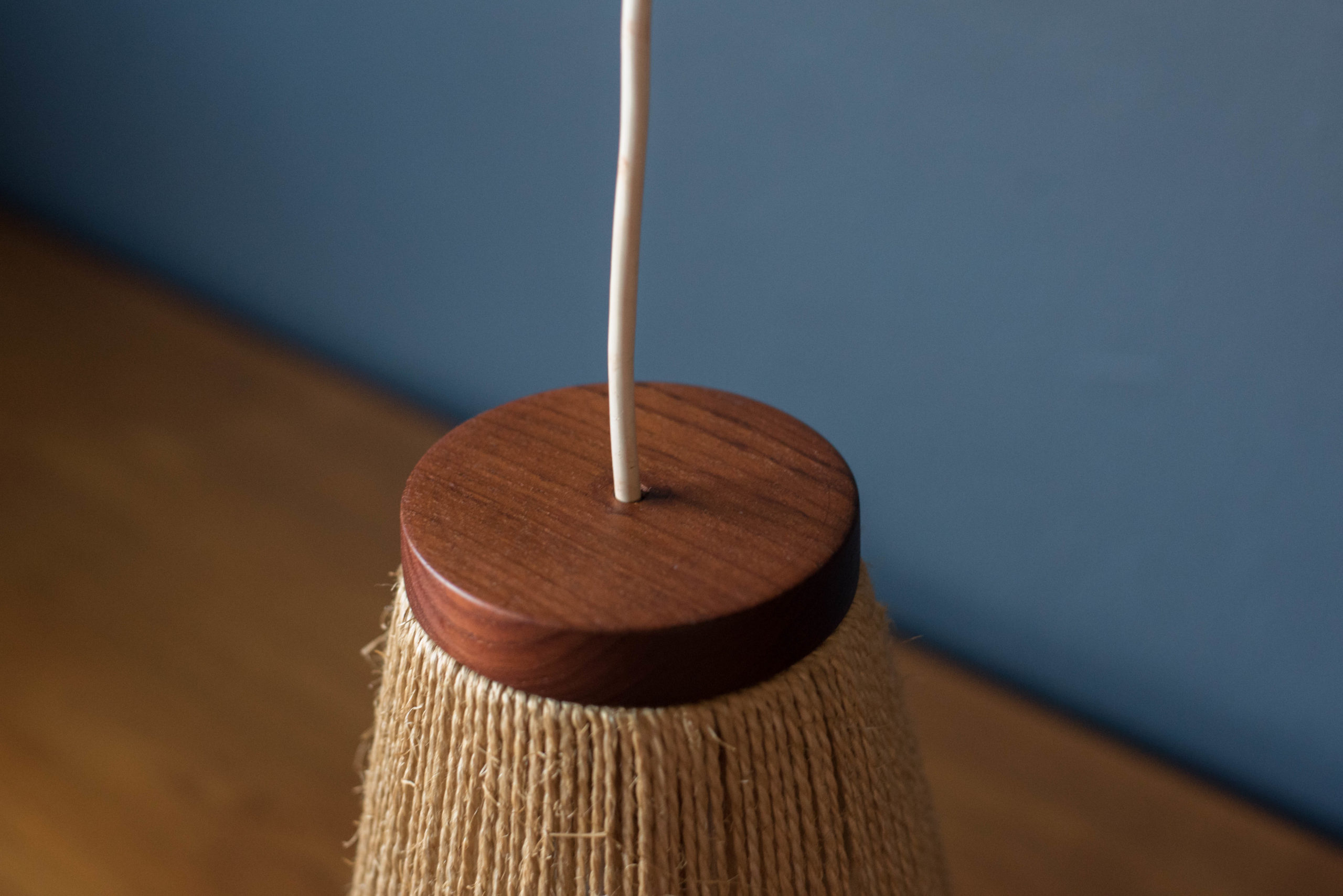 Mid-Century Modern hanging pendant light designed by Ib Fabiansen for Fog and Morup, circa 1960s. This piece displays a unique symmetrical shape wrapped in natural sisal fibers accented in teak.