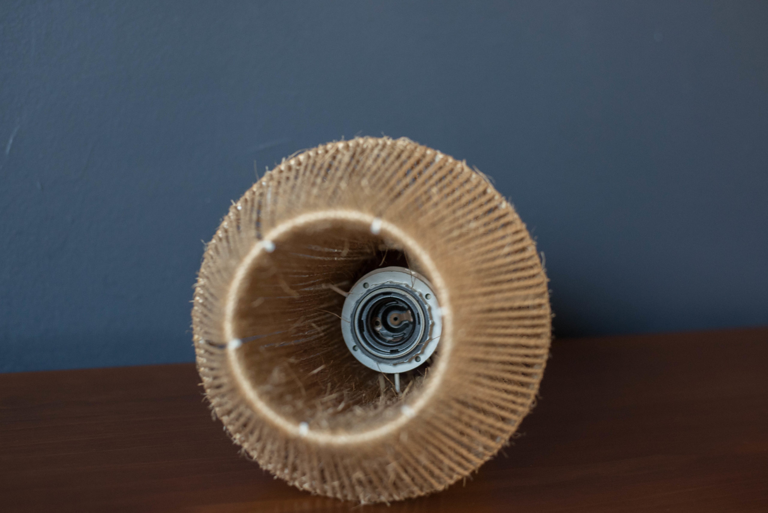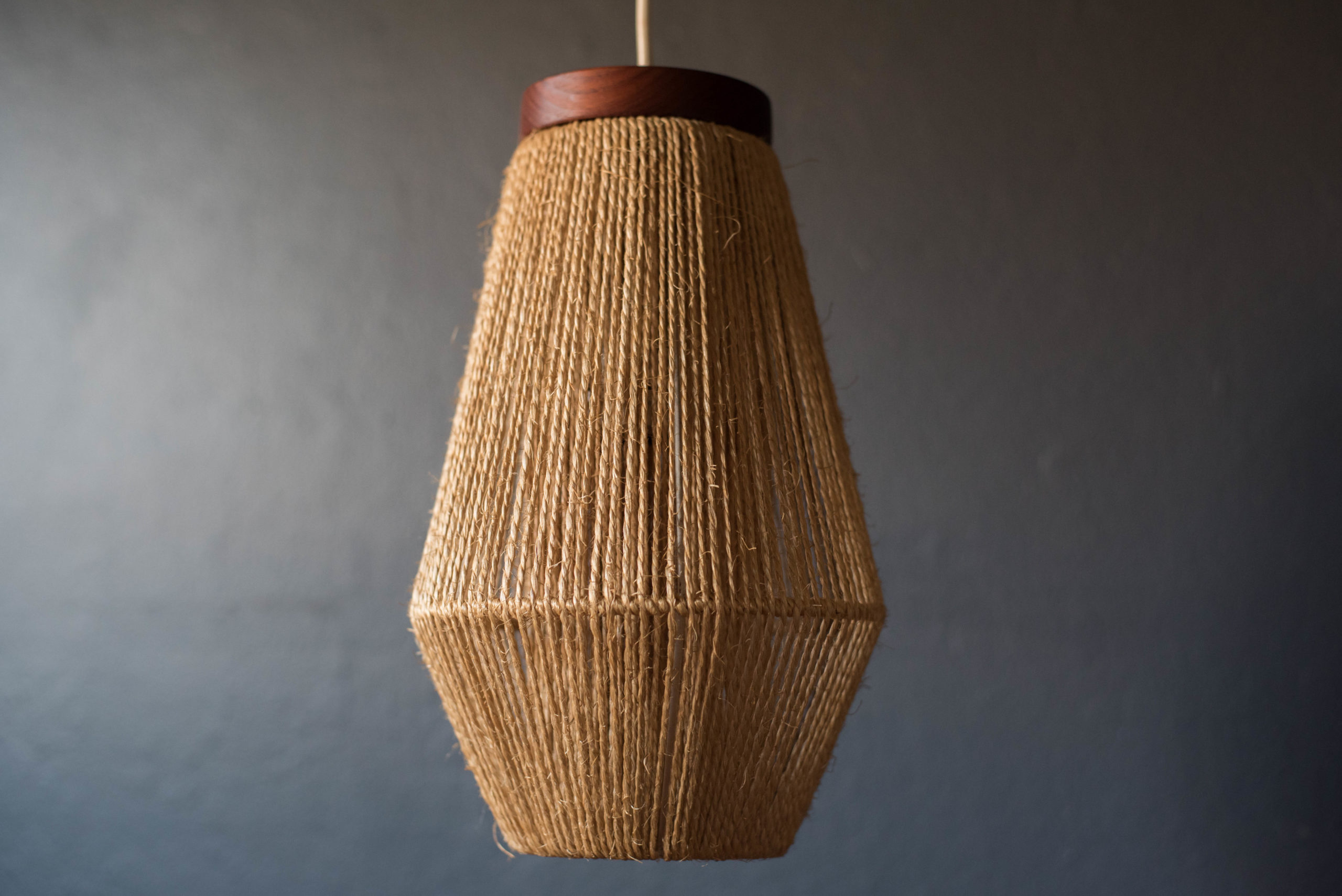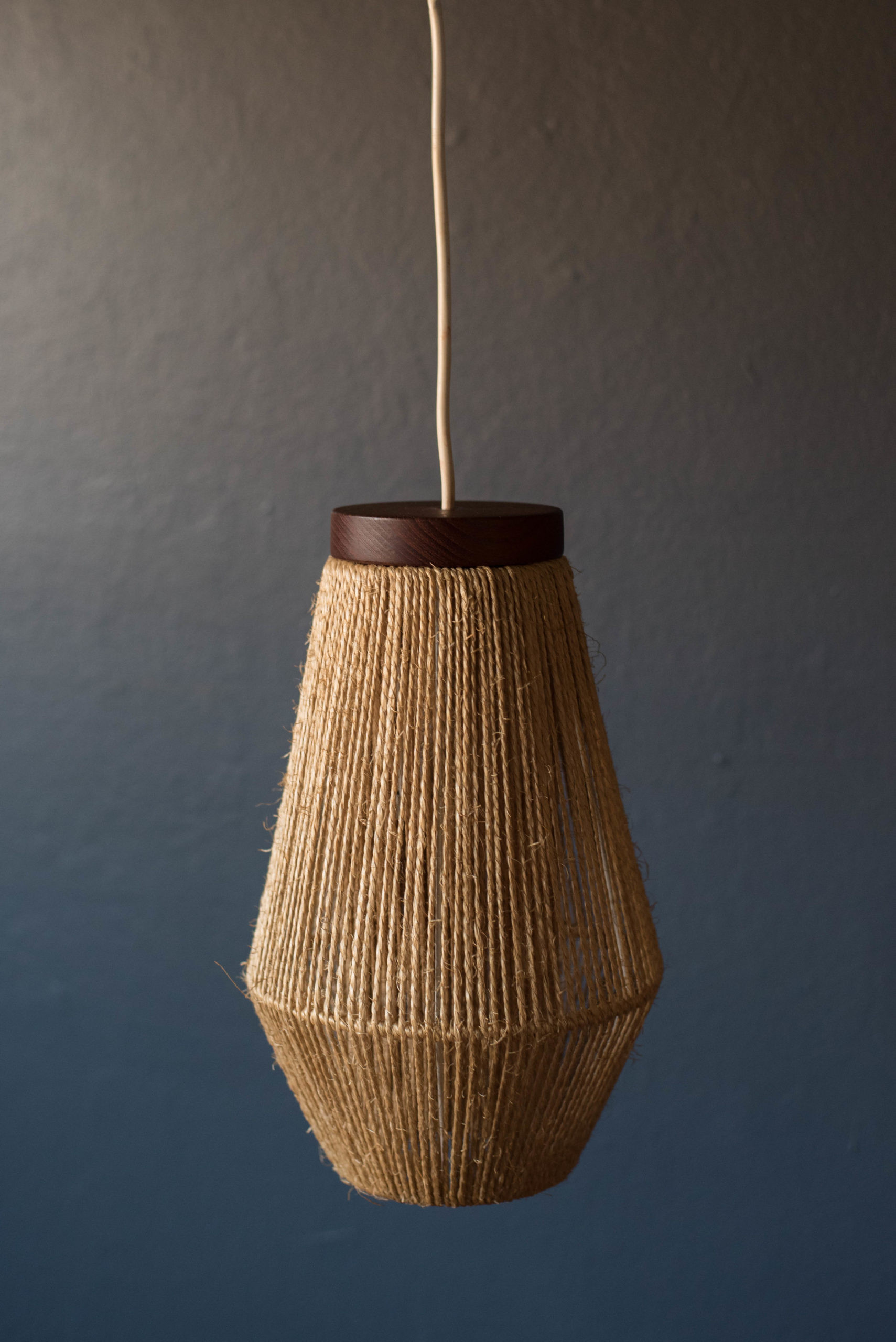 Mid-Century Modern hanging pendant light designed by Ib Fabiansen for Fog and Morup, circa 1960s. This piece displays a unique symmetrical shape wrapped in natural sisal fibers accented in teak.