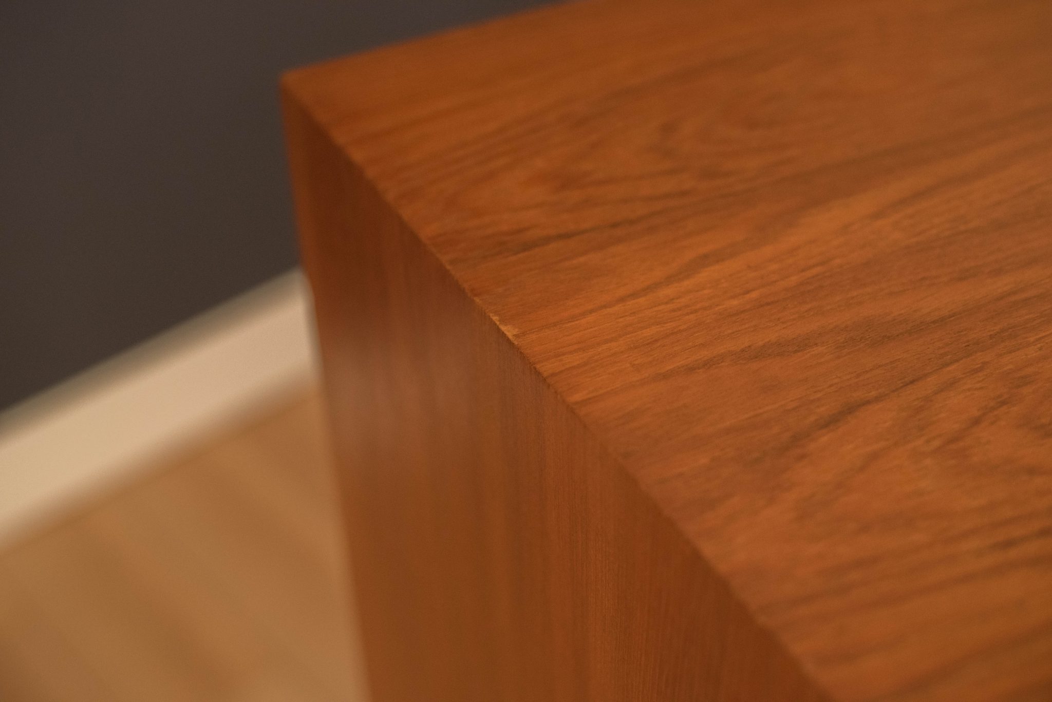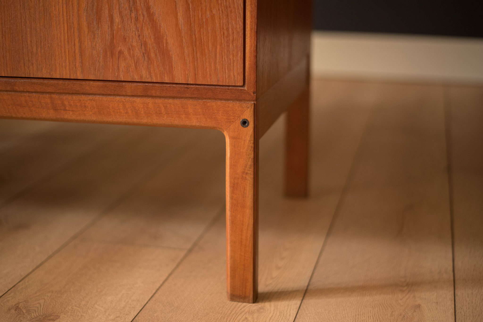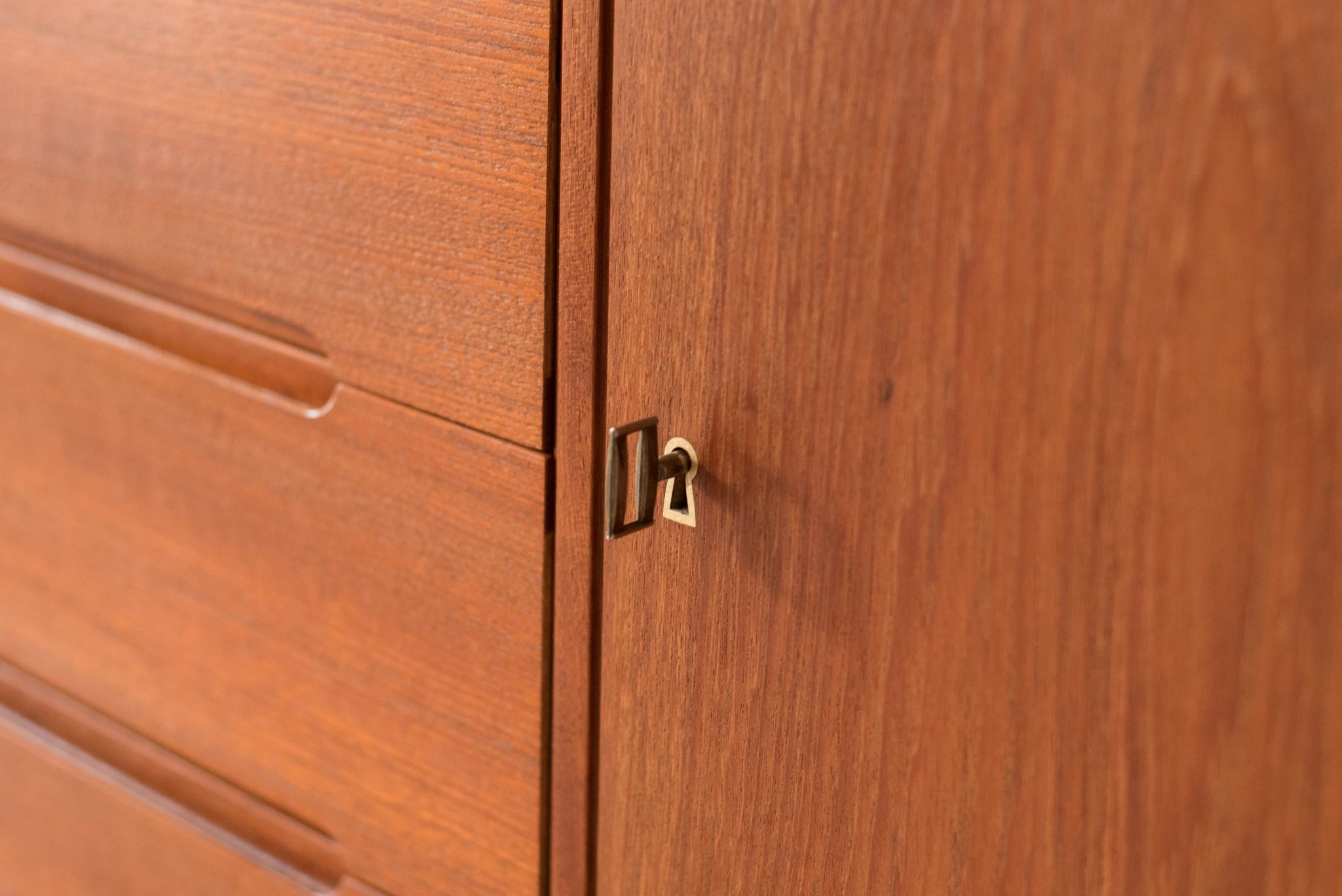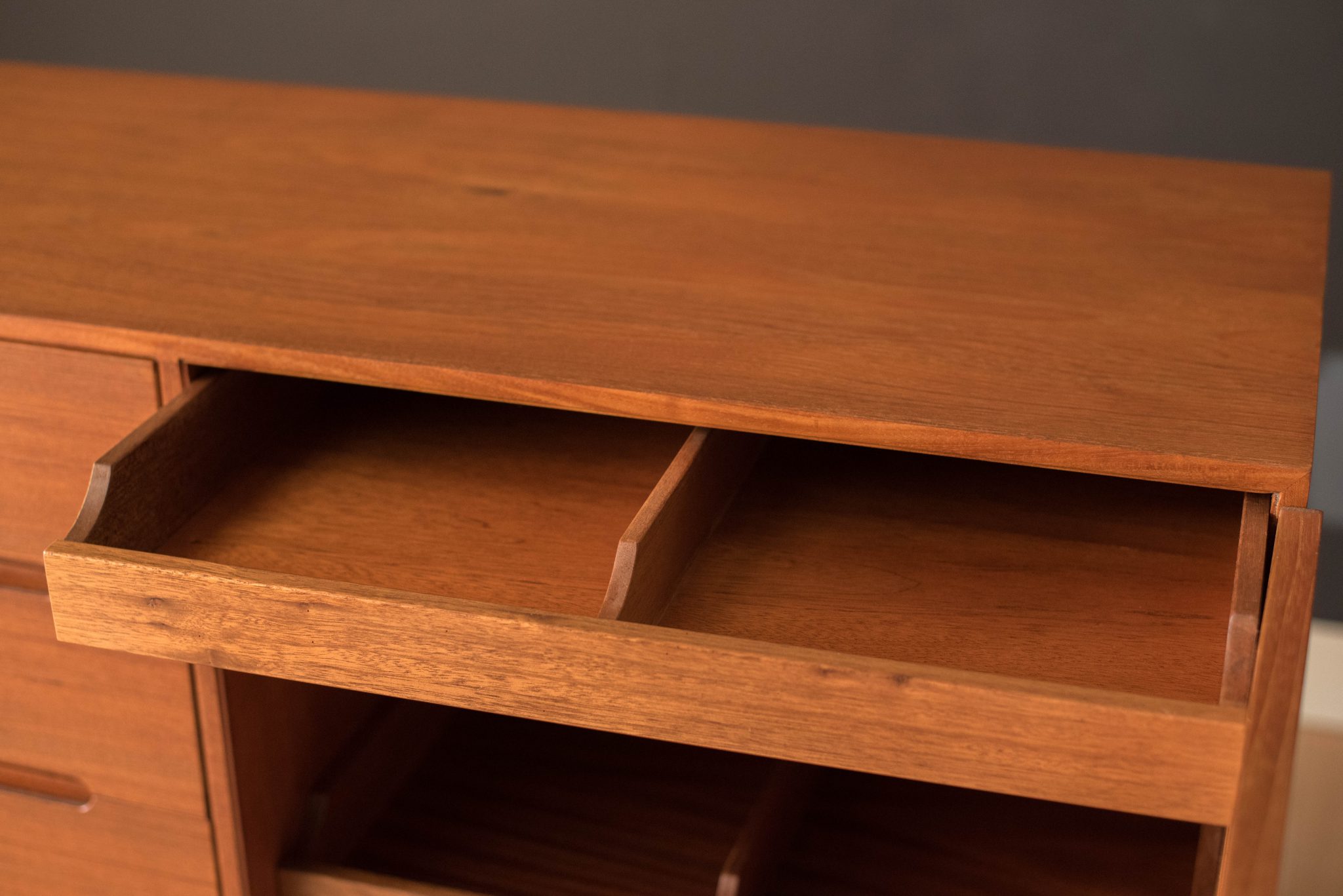 Mid century dresser chest in teak designed by Arne Wahl Iversen for Vinde Møbelfabrik. This piece offers plenty of storage including six dovetailed drawers with inset sculpted handles. A locking cabinet door provides an additional six smaller drawers with dividers. All interior drawers are lined in mahogany. Skeleton key is included.