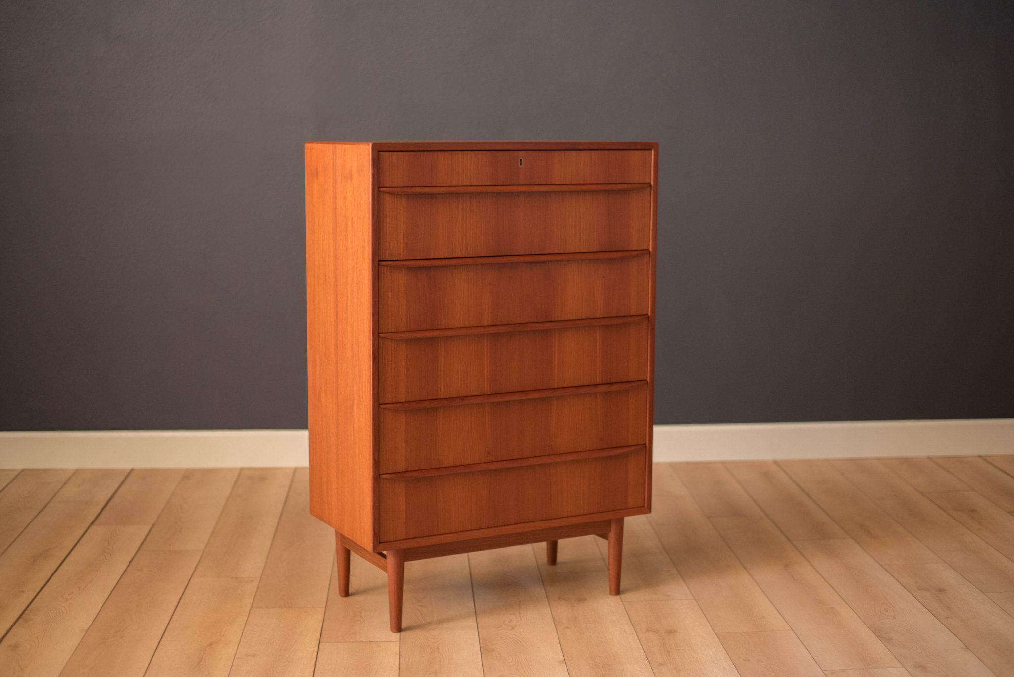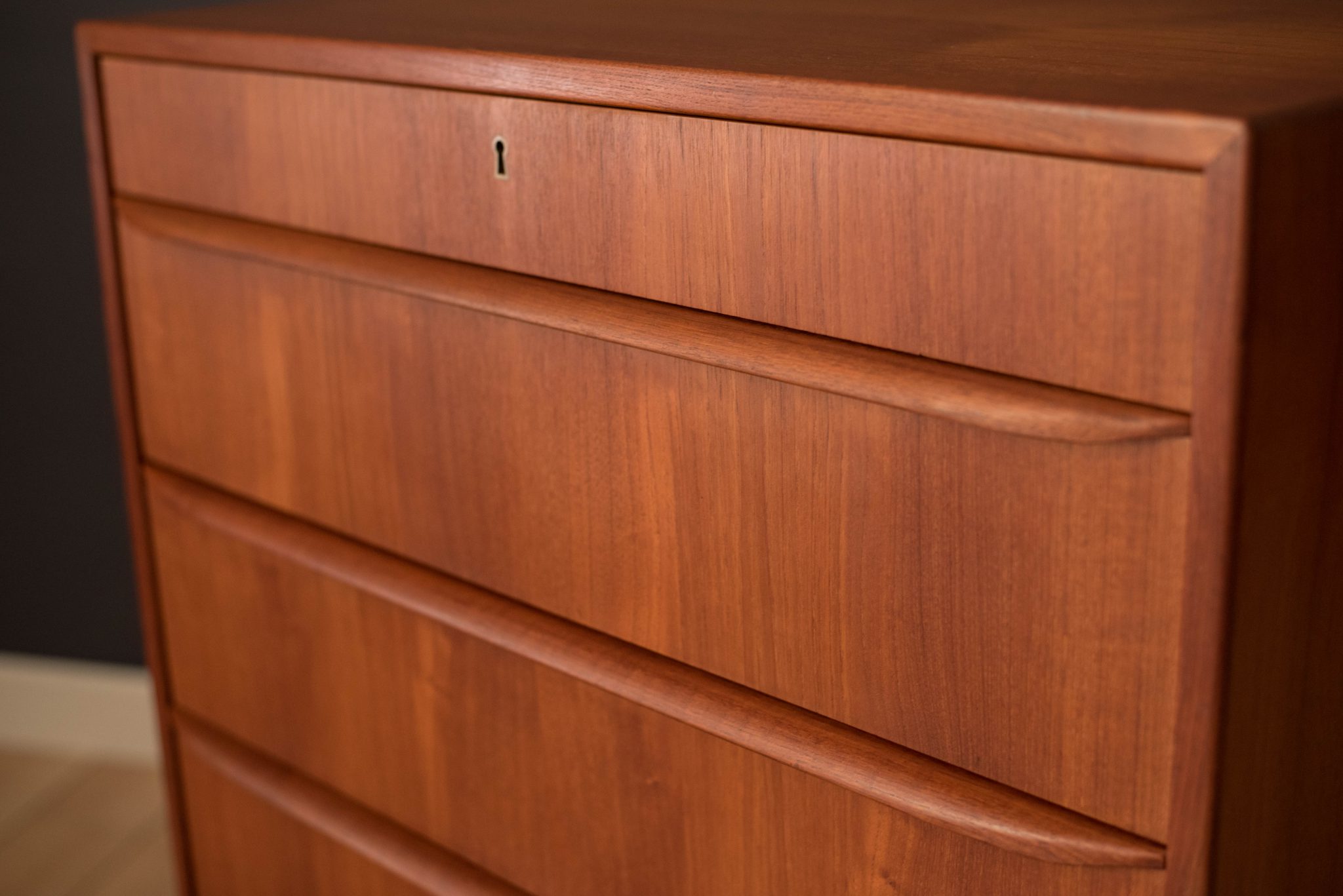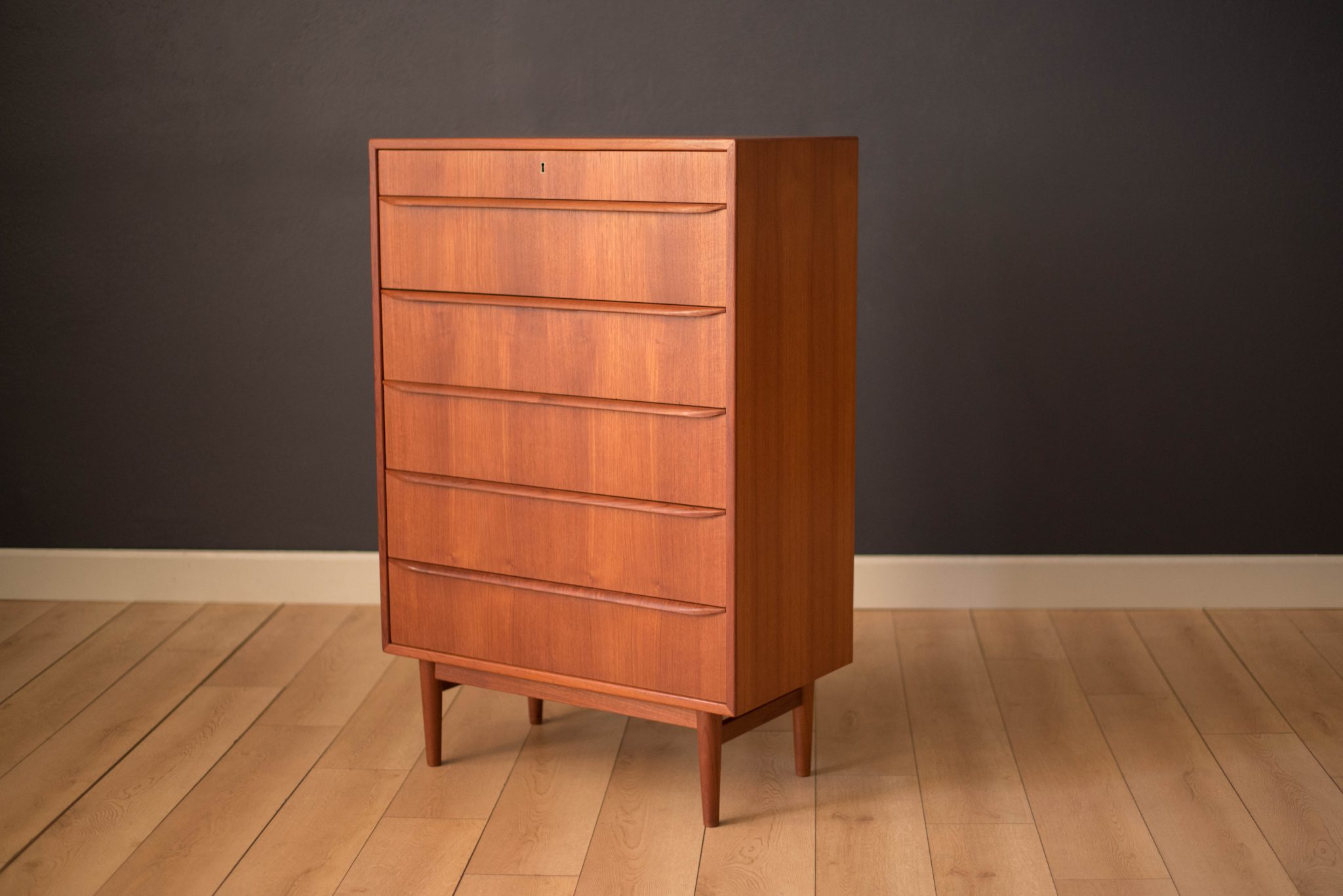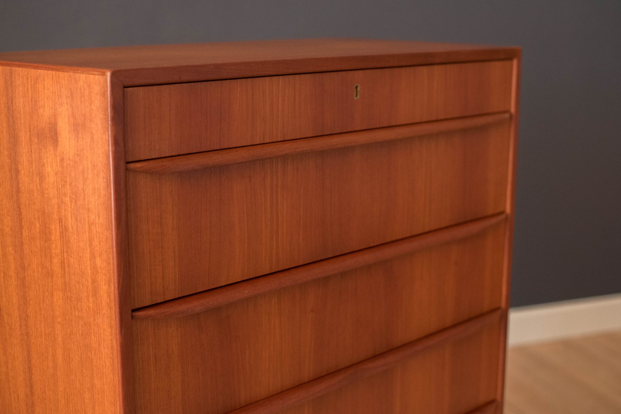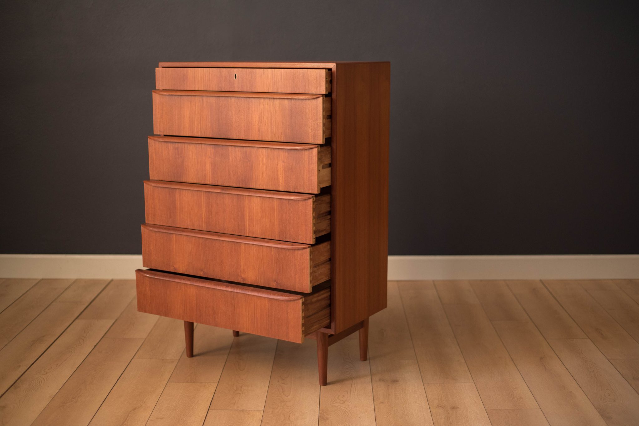 Mid-Century Modern tall dresser in teak circa 1960s, Denmark. This piece features six dovetailed drawers with sculpted wood handles. Interior of drawers are lined with mahogany. Top drawer opens with a skeleton key that is included. Matching low dresser available in separate listing.