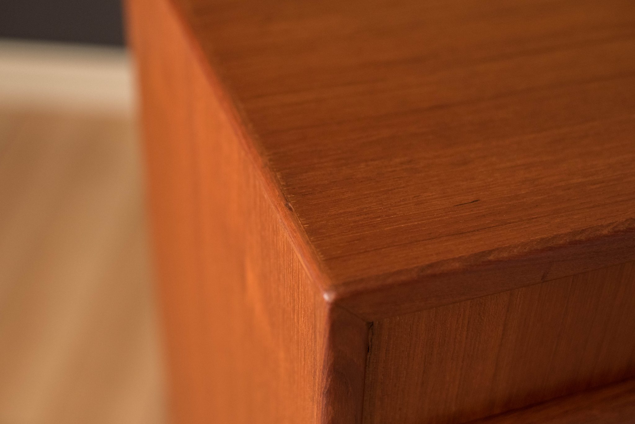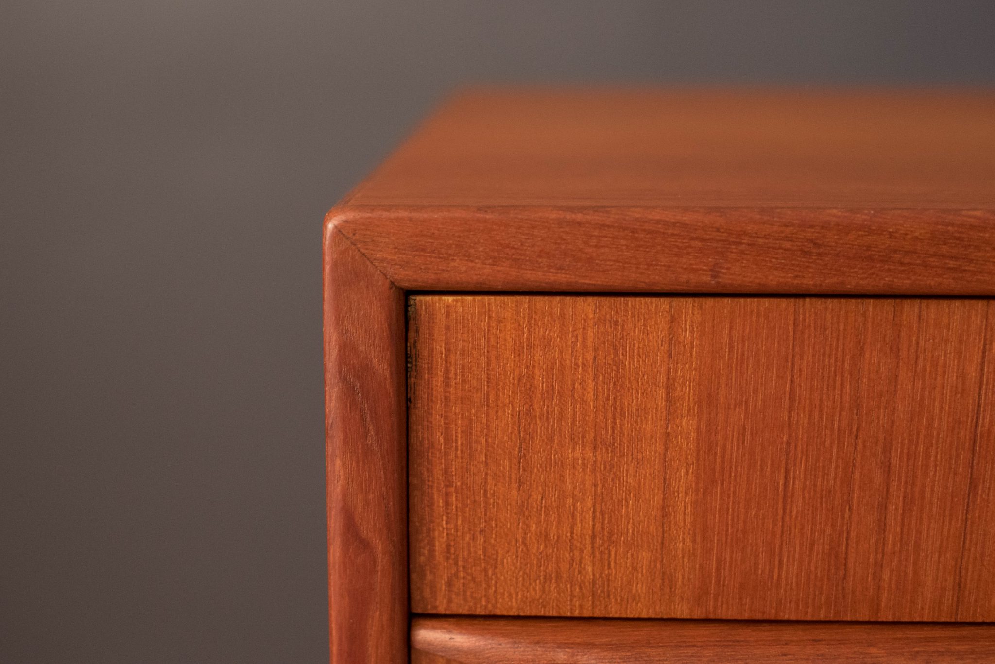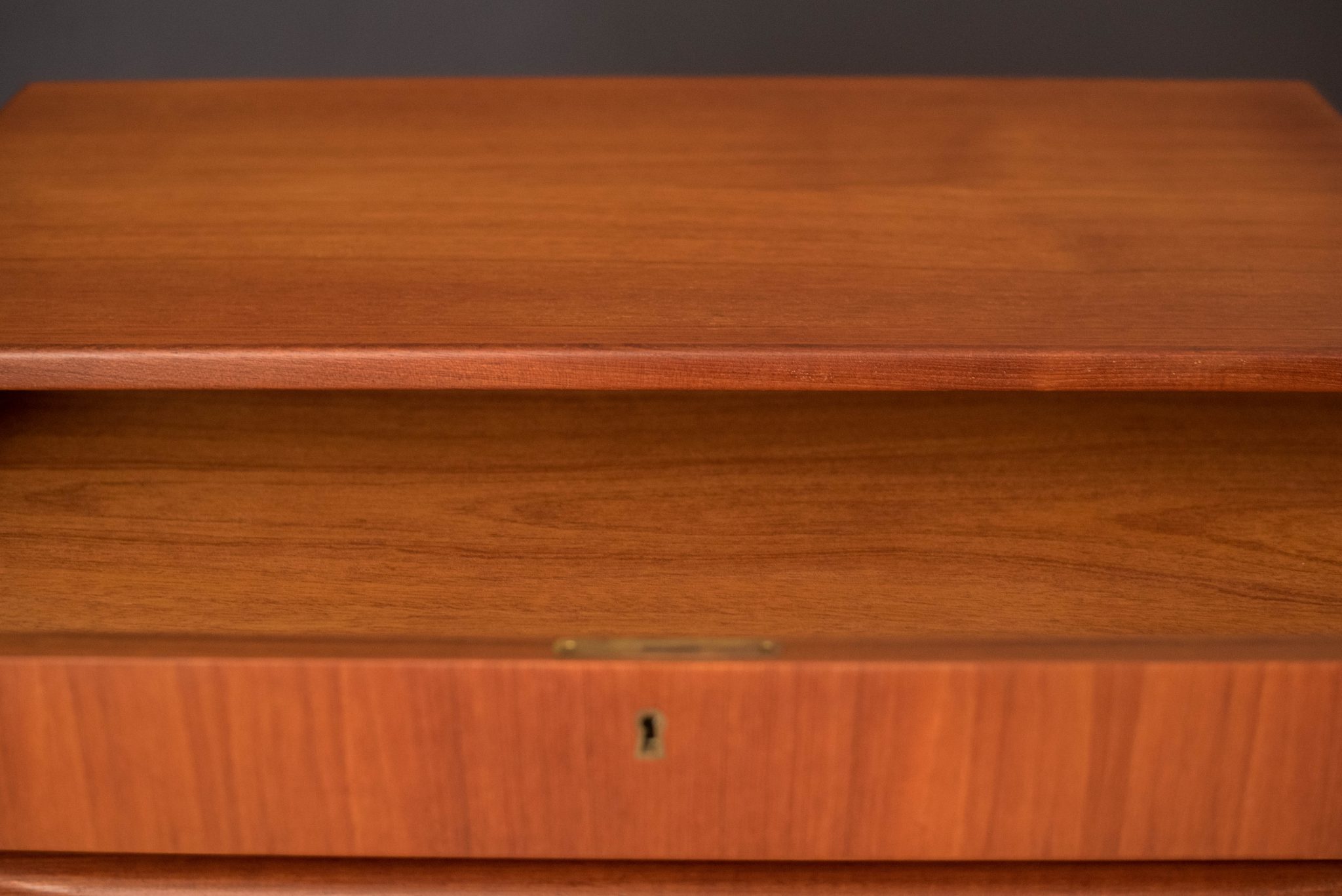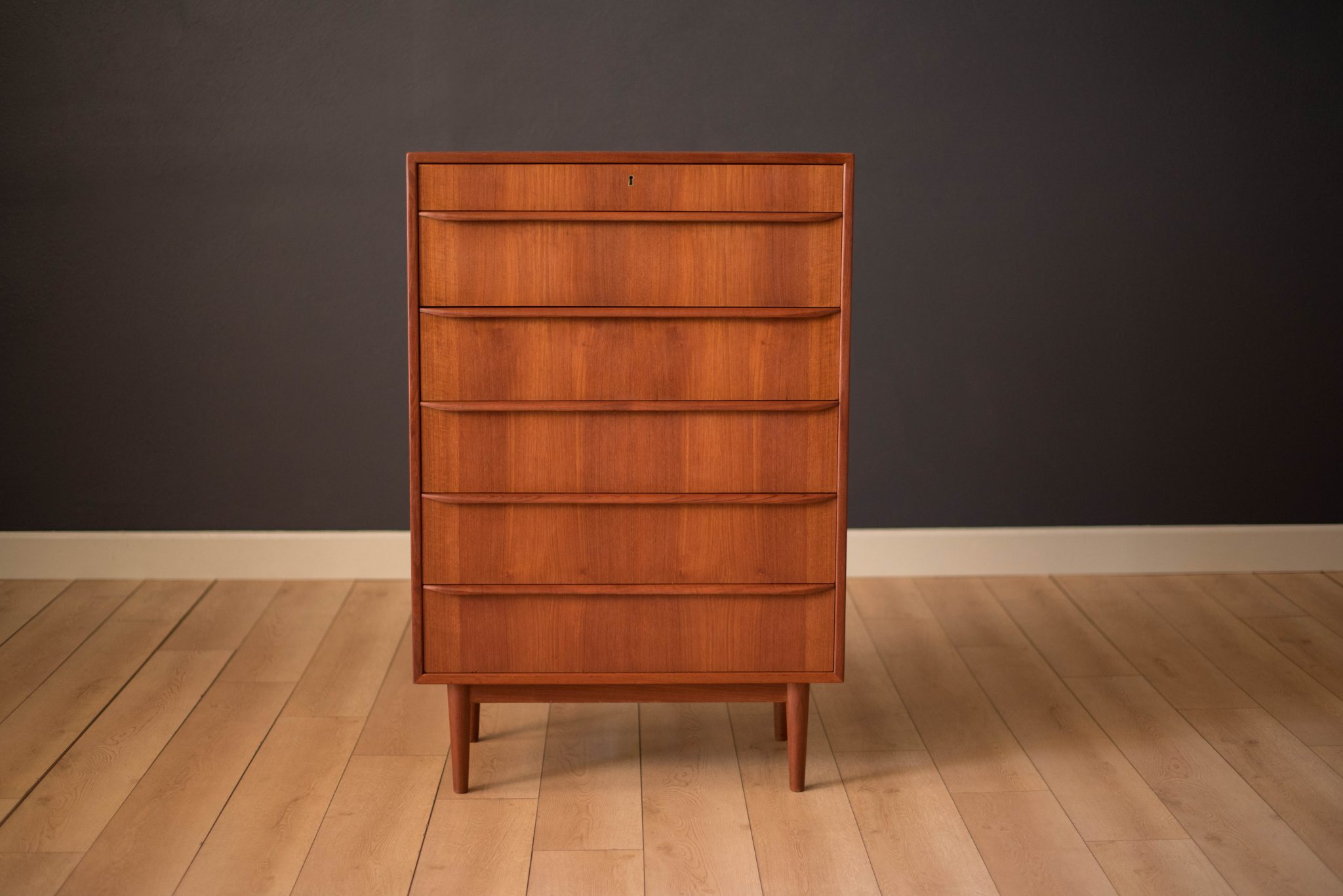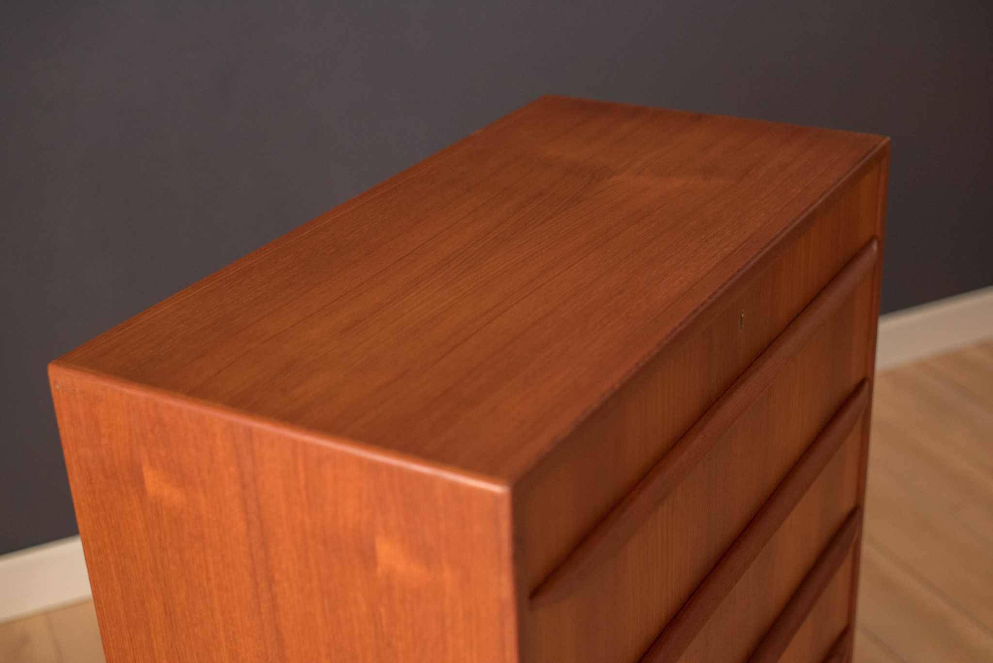 Mid-Century Modern tall dresser in teak circa 1960s, Denmark. This piece features six dovetailed drawers with sculpted wood handles. Interior of drawers are lined with mahogany. Top drawer opens with a skeleton key that is included. Matching low dresser available in separate listing.