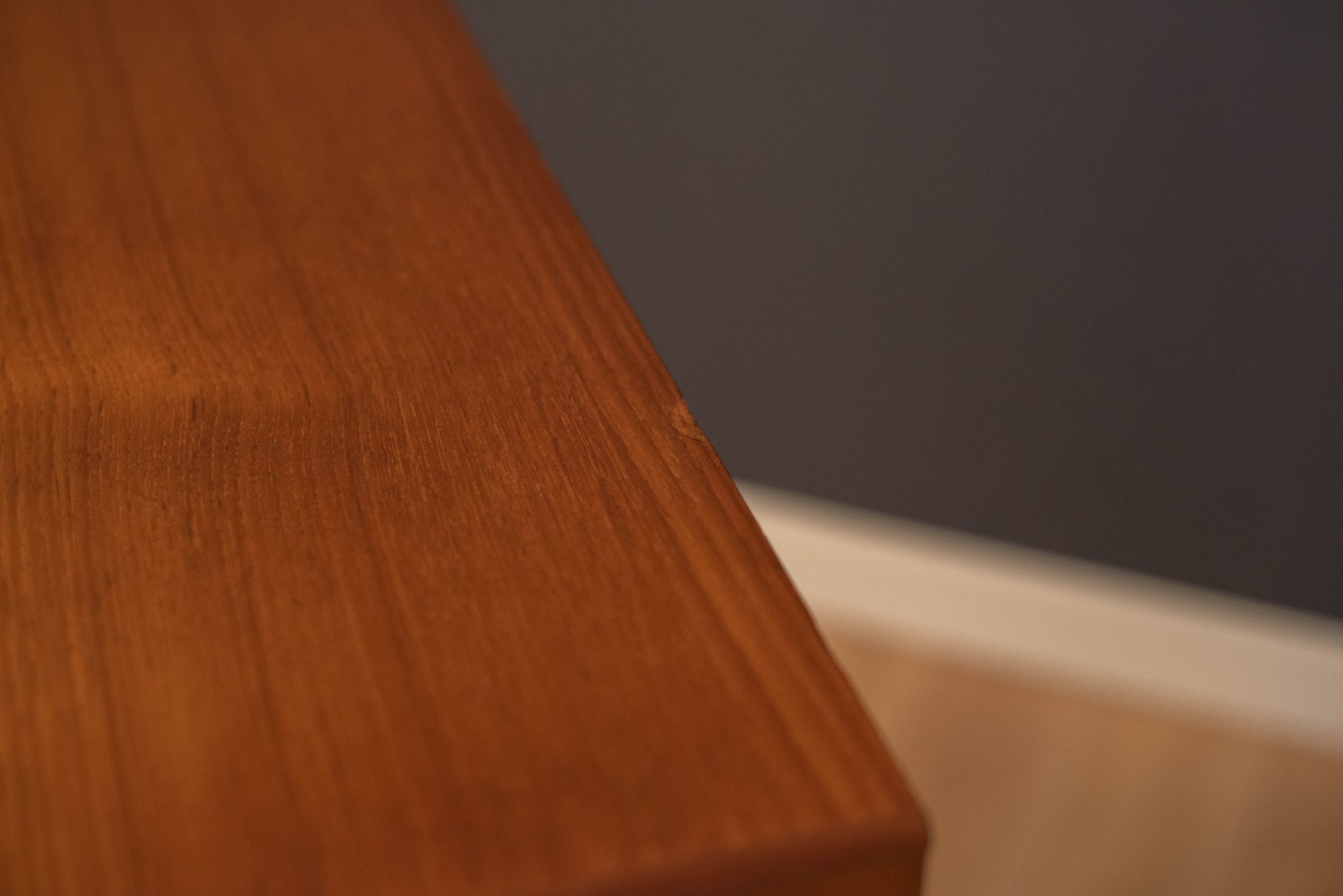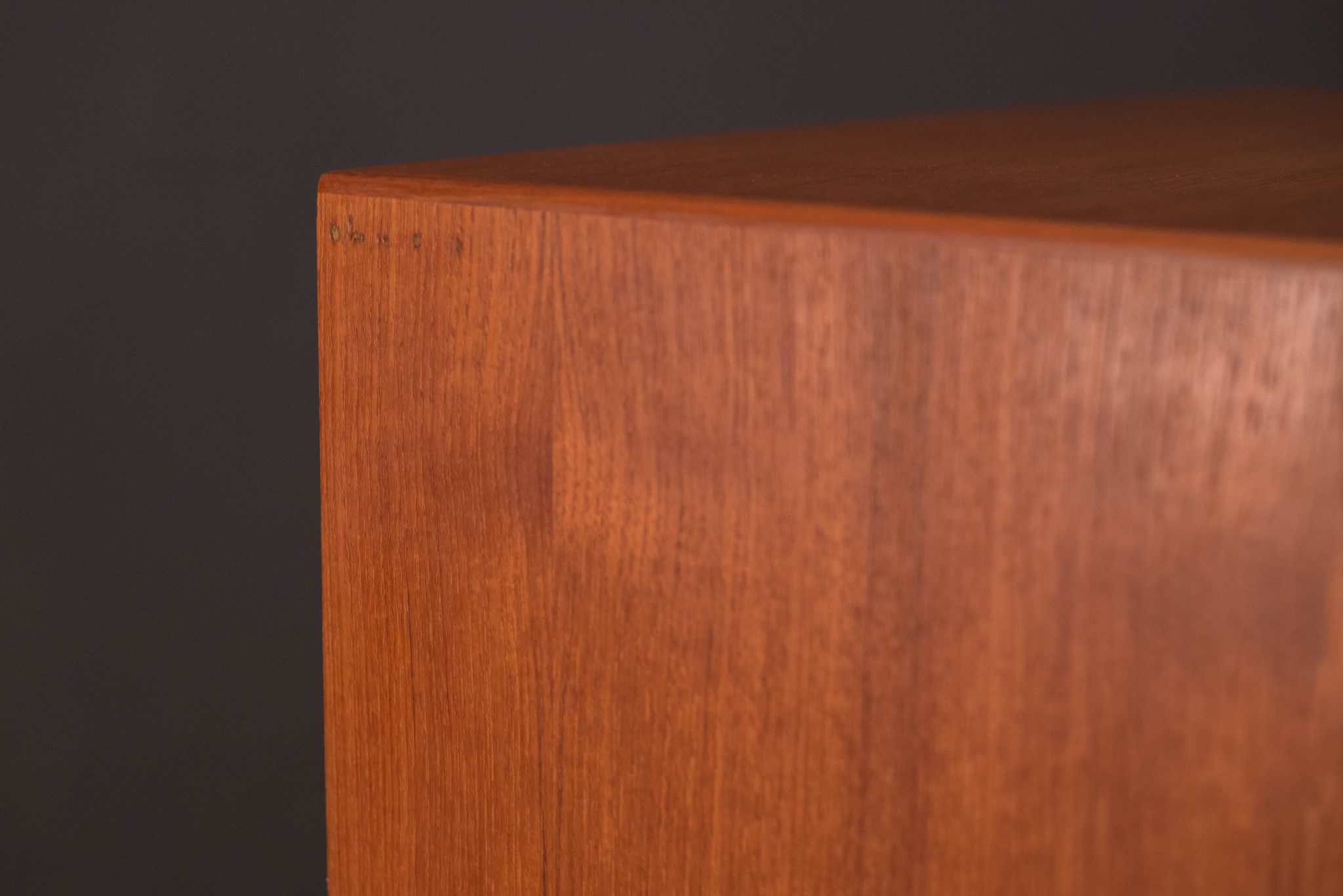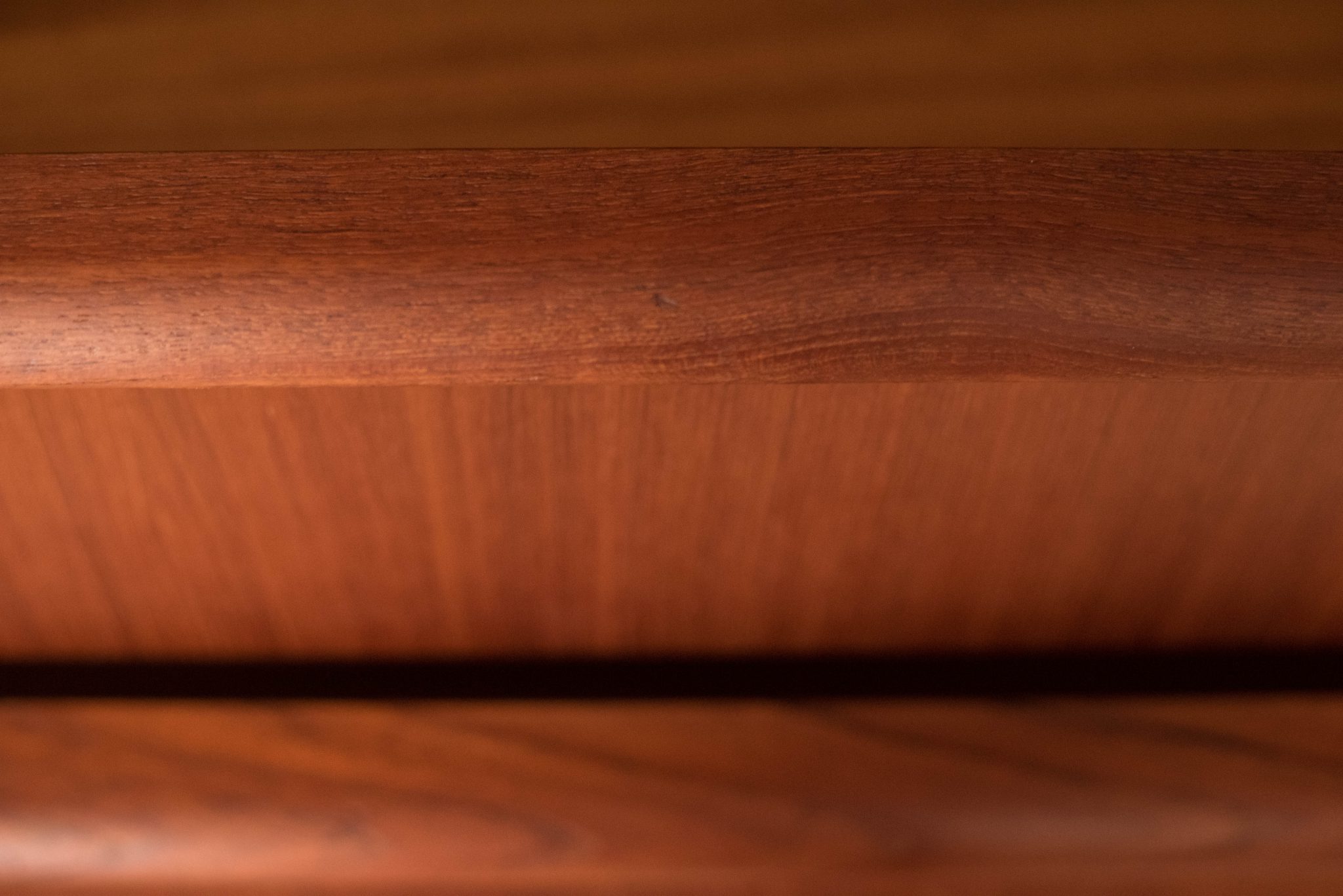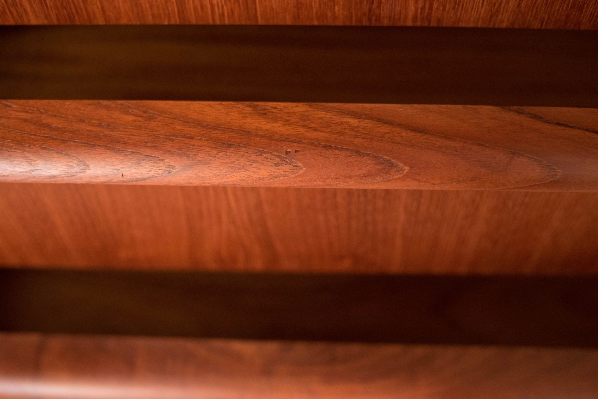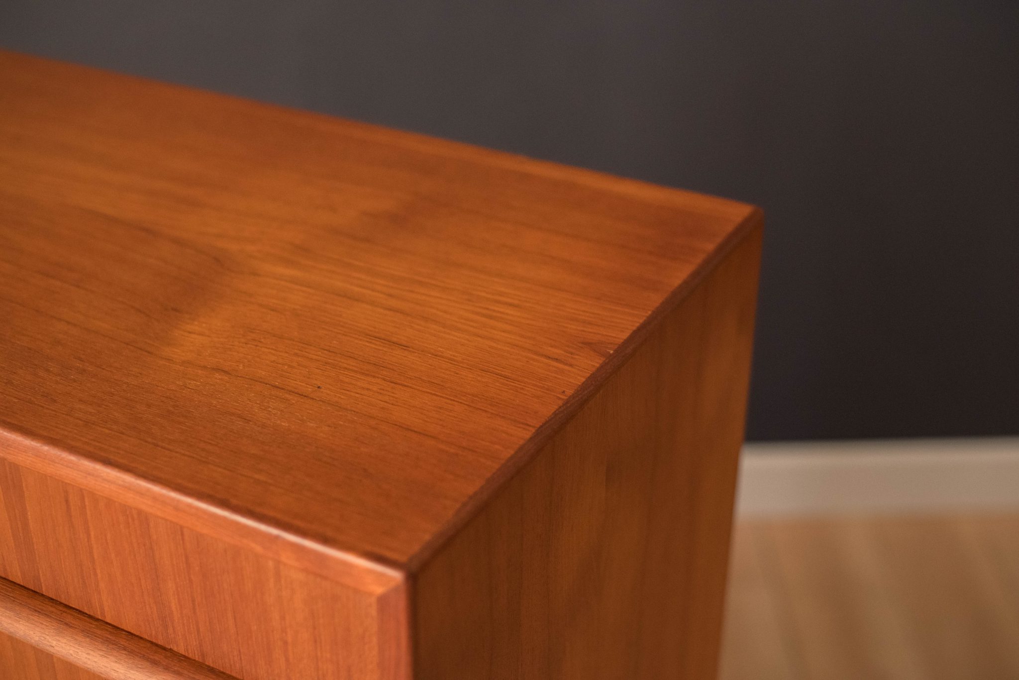 Mid-Century Modern tall dresser in teak circa 1960s, Denmark. This piece features six dovetailed drawers with sculpted wood handles. Interior of drawers are lined with mahogany. Top drawer opens with a skeleton key that is included. Matching low dresser available in separate listing.