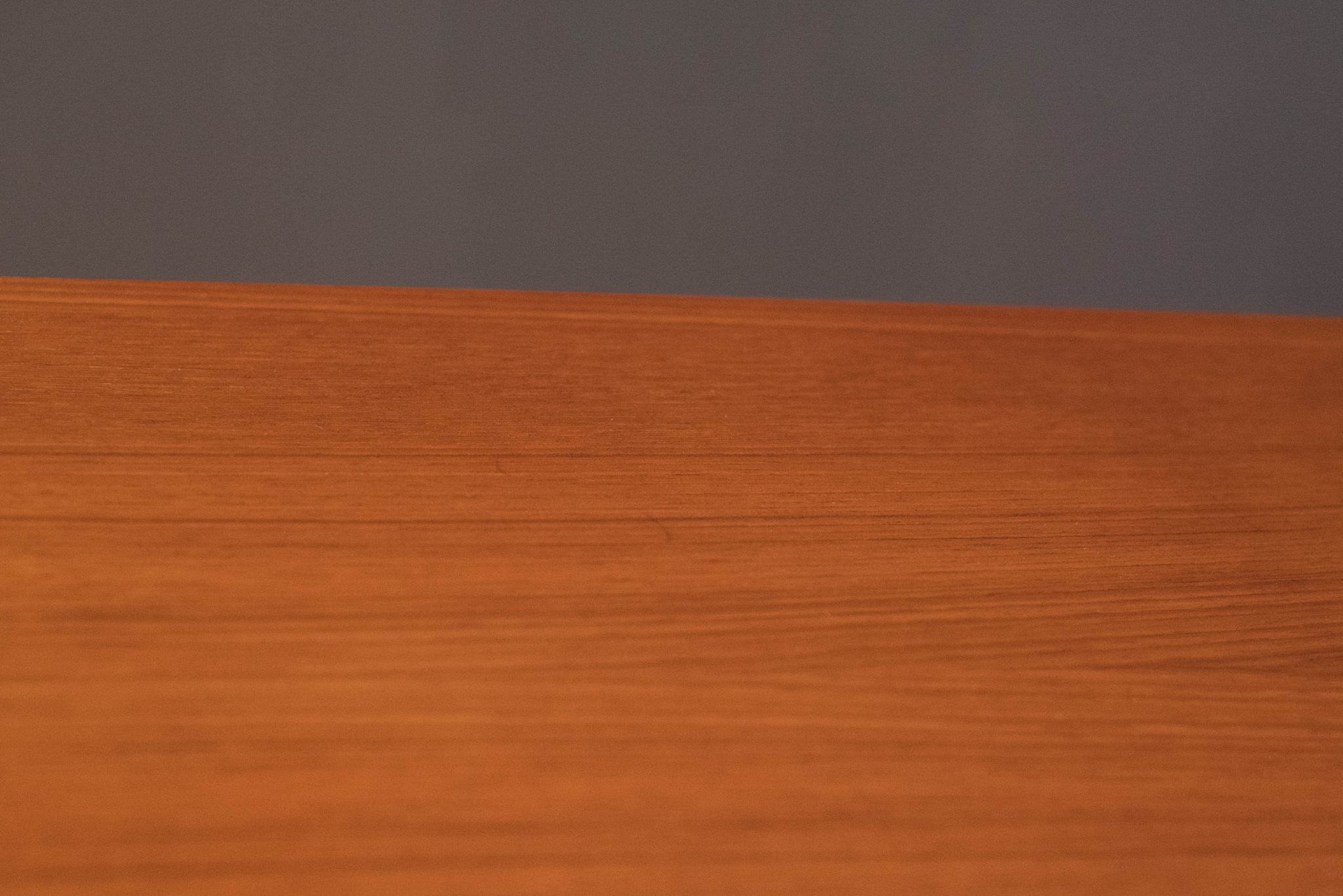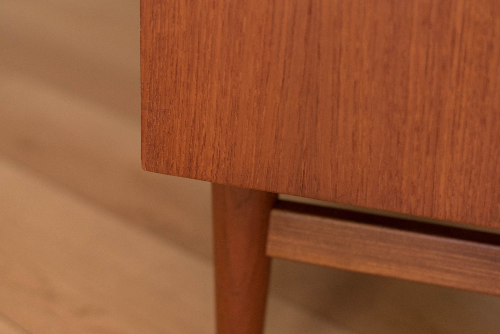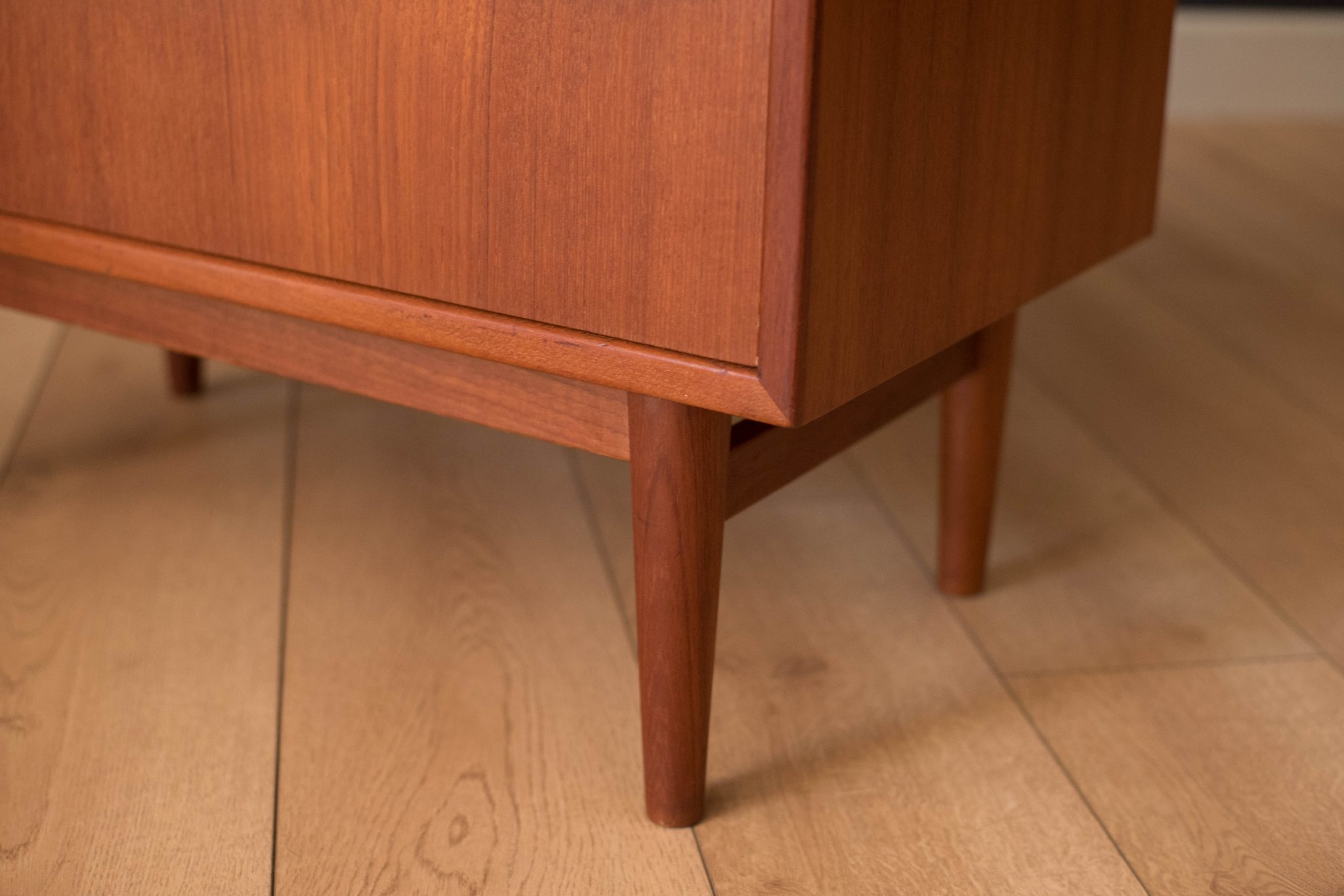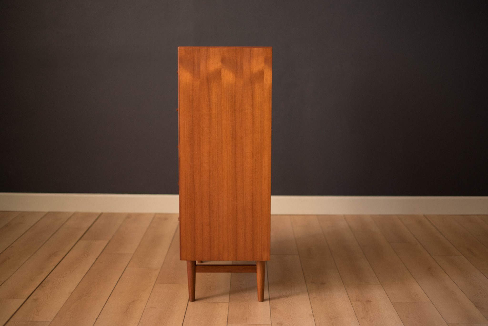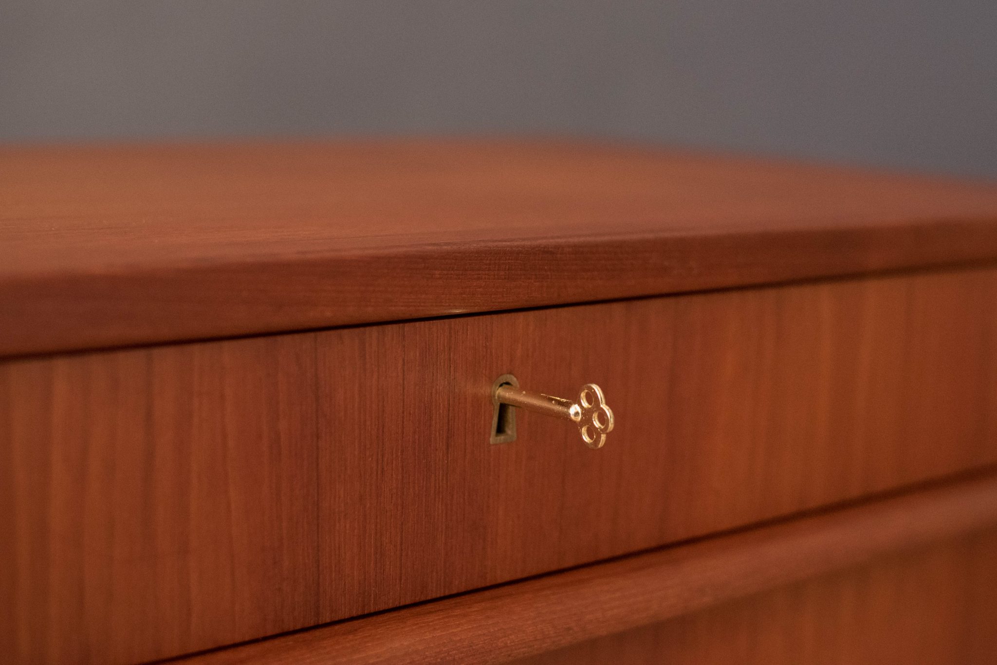 Mid-Century Modern tall dresser in teak circa 1960s, Denmark. This piece features six dovetailed drawers with sculpted wood handles. Interior of drawers are lined with mahogany. Top drawer opens with a skeleton key that is included. Matching low dresser available in separate listing.