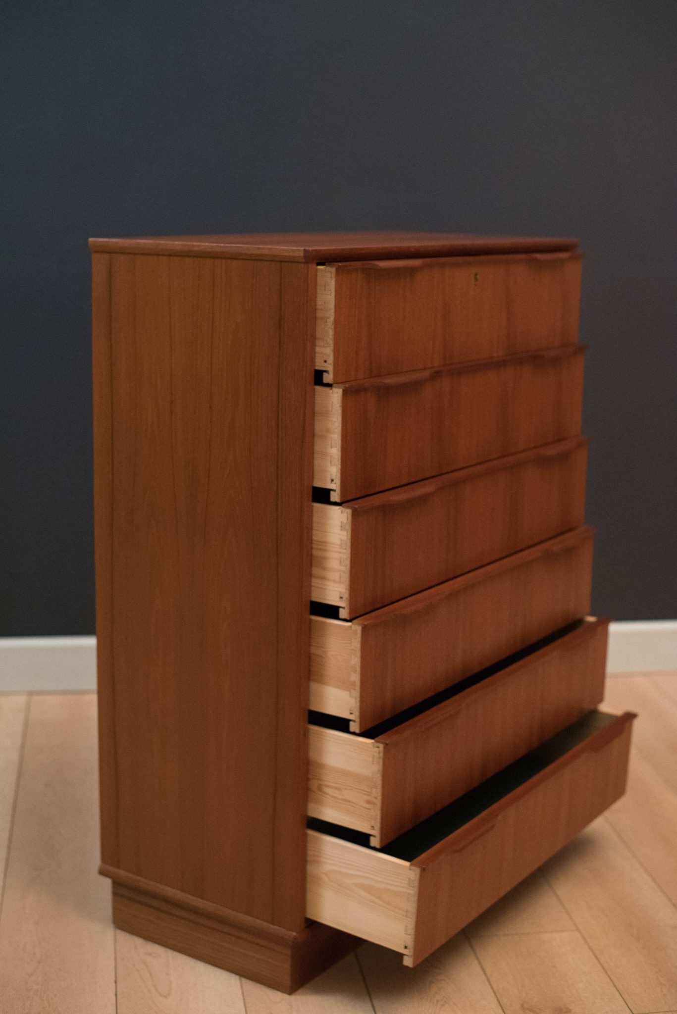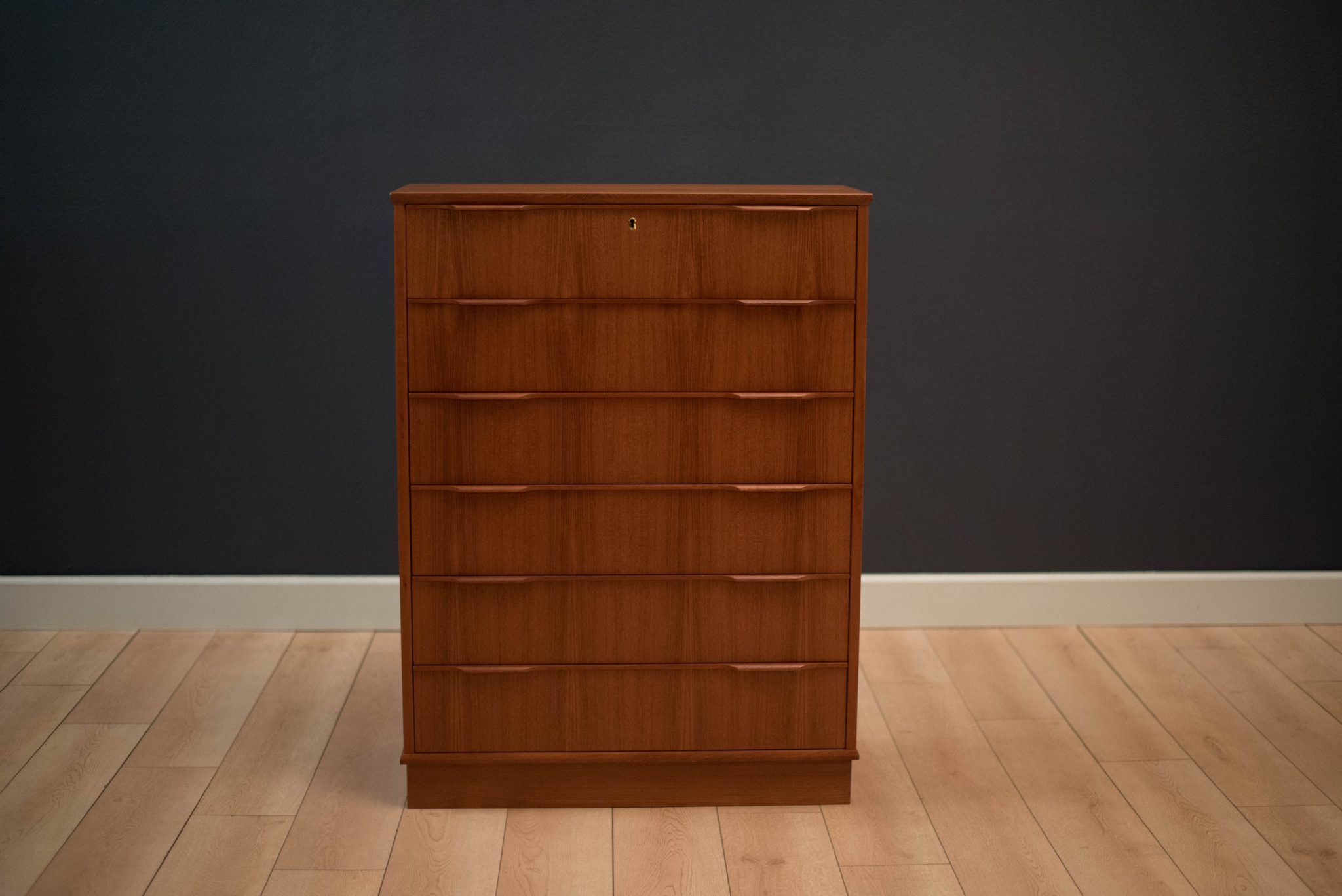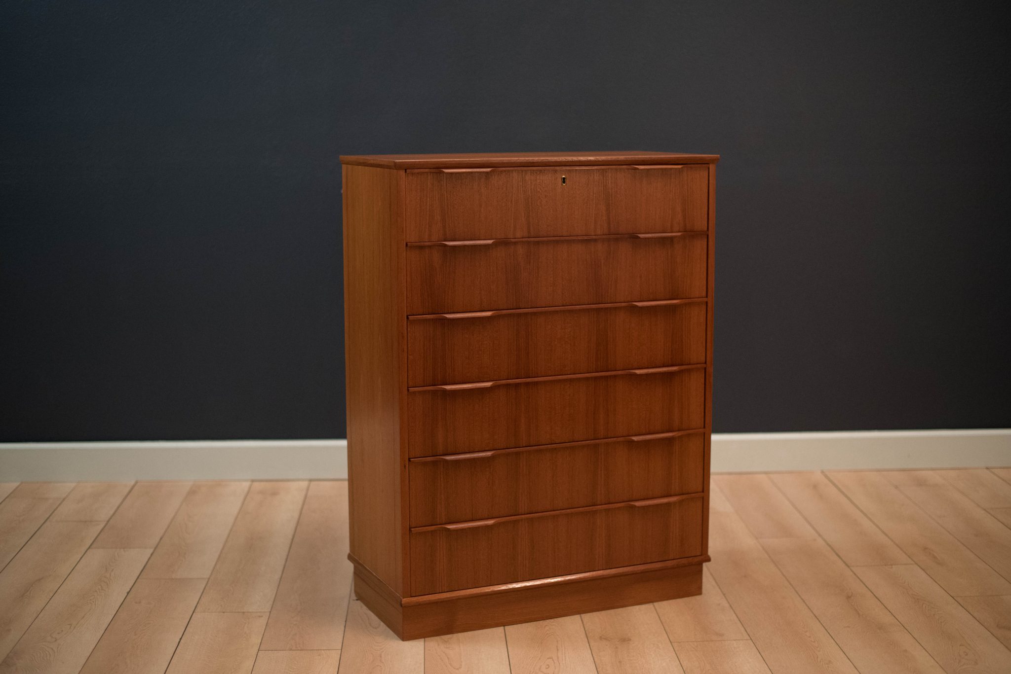 Mid-Century teak tall dresser by Esjing Mobelfabrik, Denmark. This piece includes six spacious dovetailed drawers with sculpted handles.