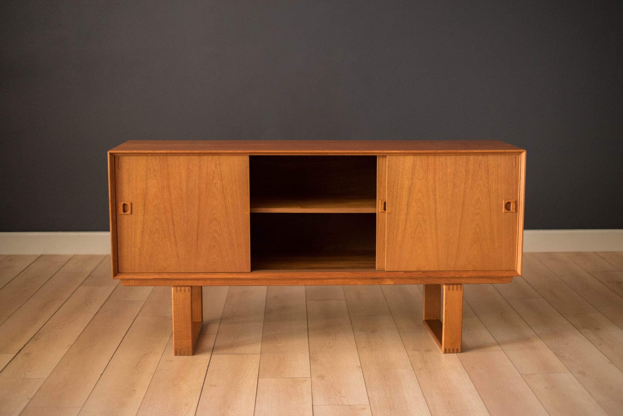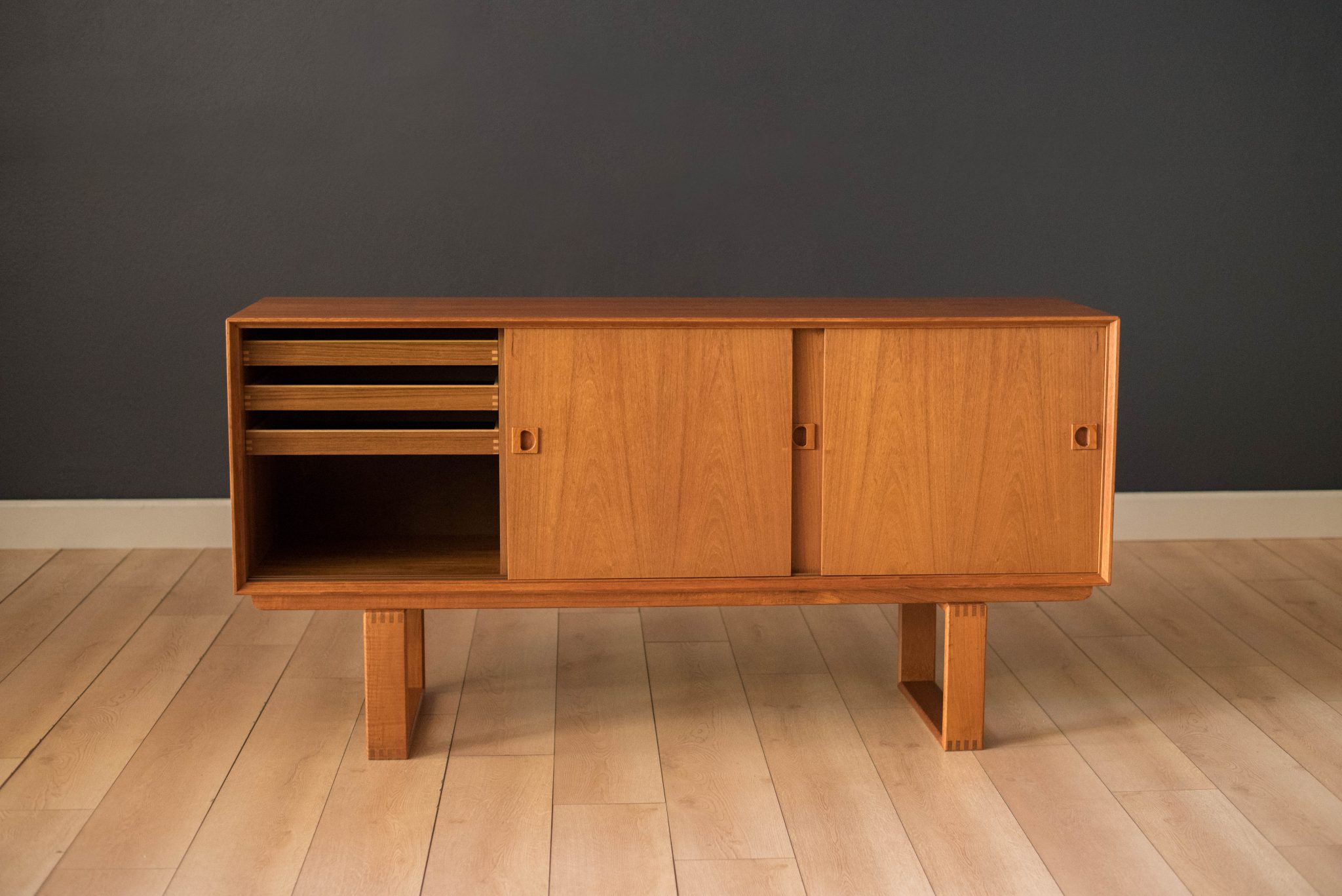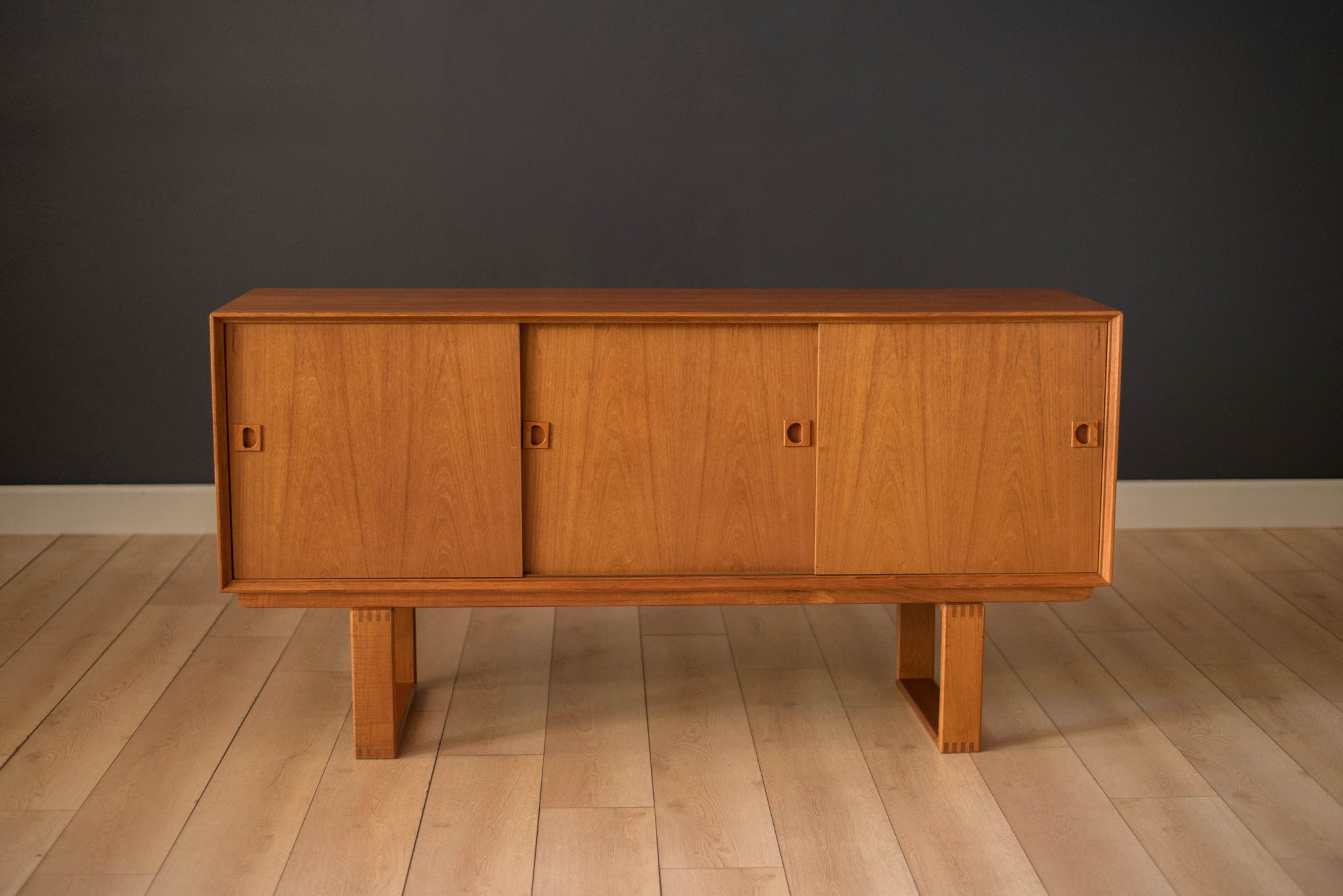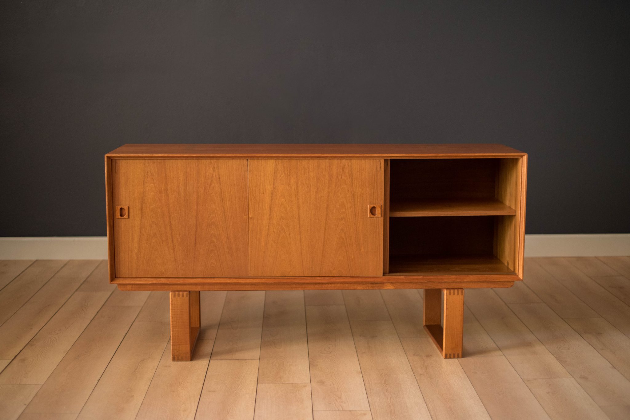 Mid-Century Modern sideboard credenza in teak manufactured by Dyrlund, circa 1960s. This piece features sliding cabinet doors with sculpted handles. Includes three dovetailed drawers and open storage compartments with adjustable shelving. Supported by a solid teak base constructed of finger jointed legs.