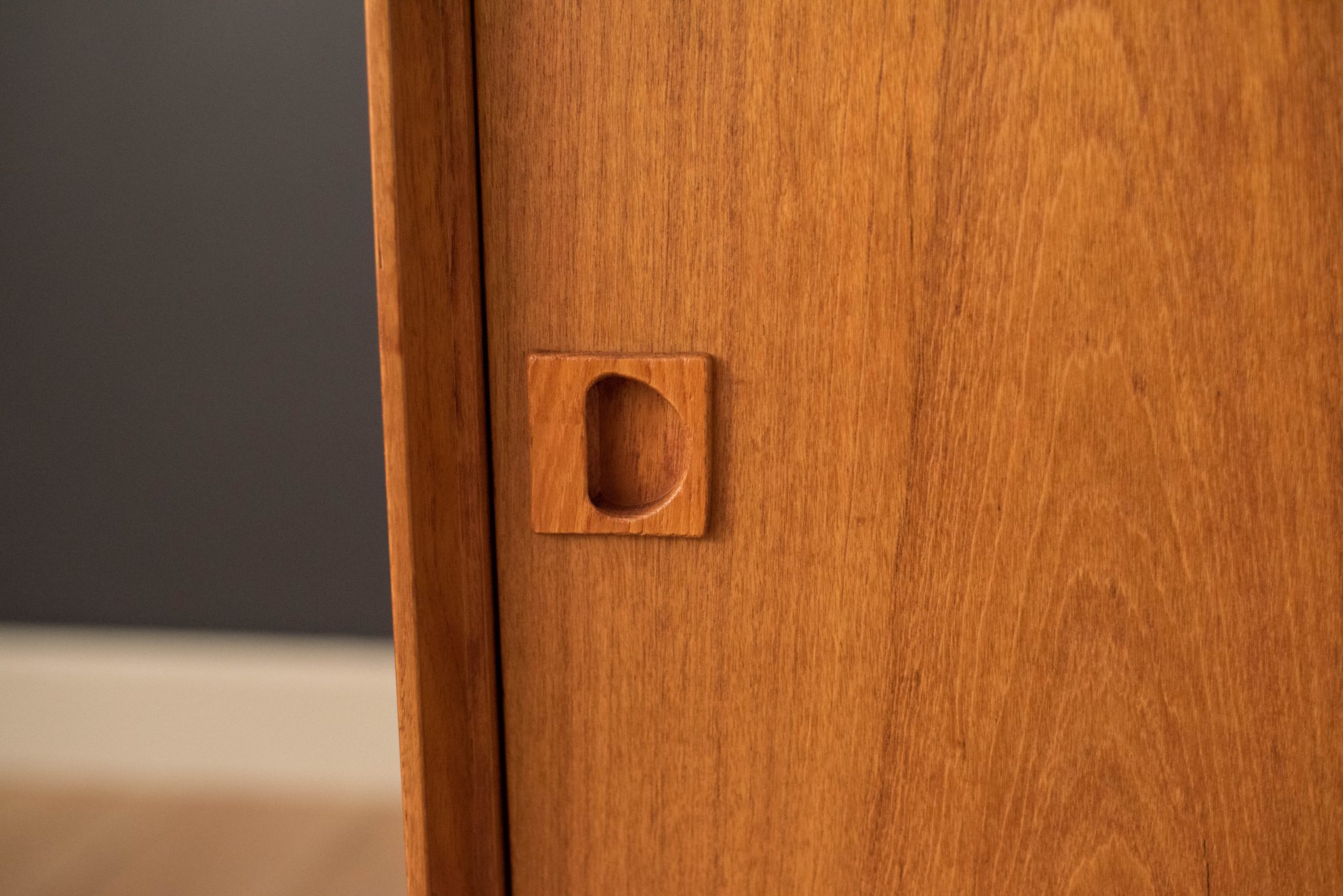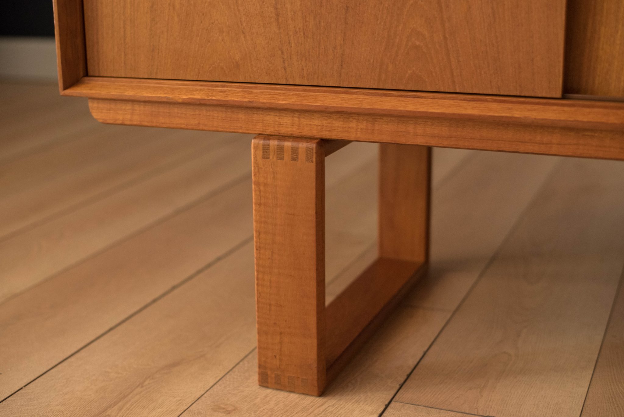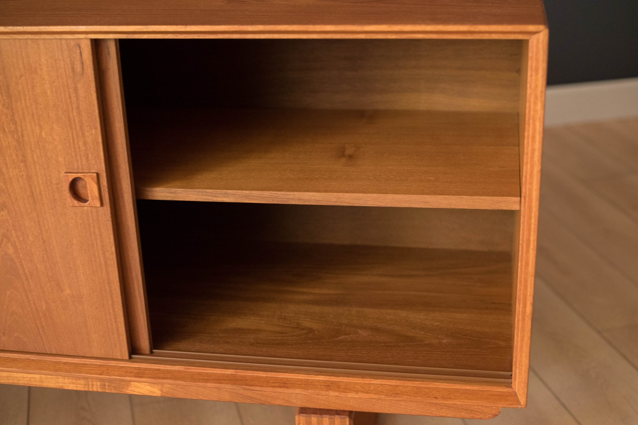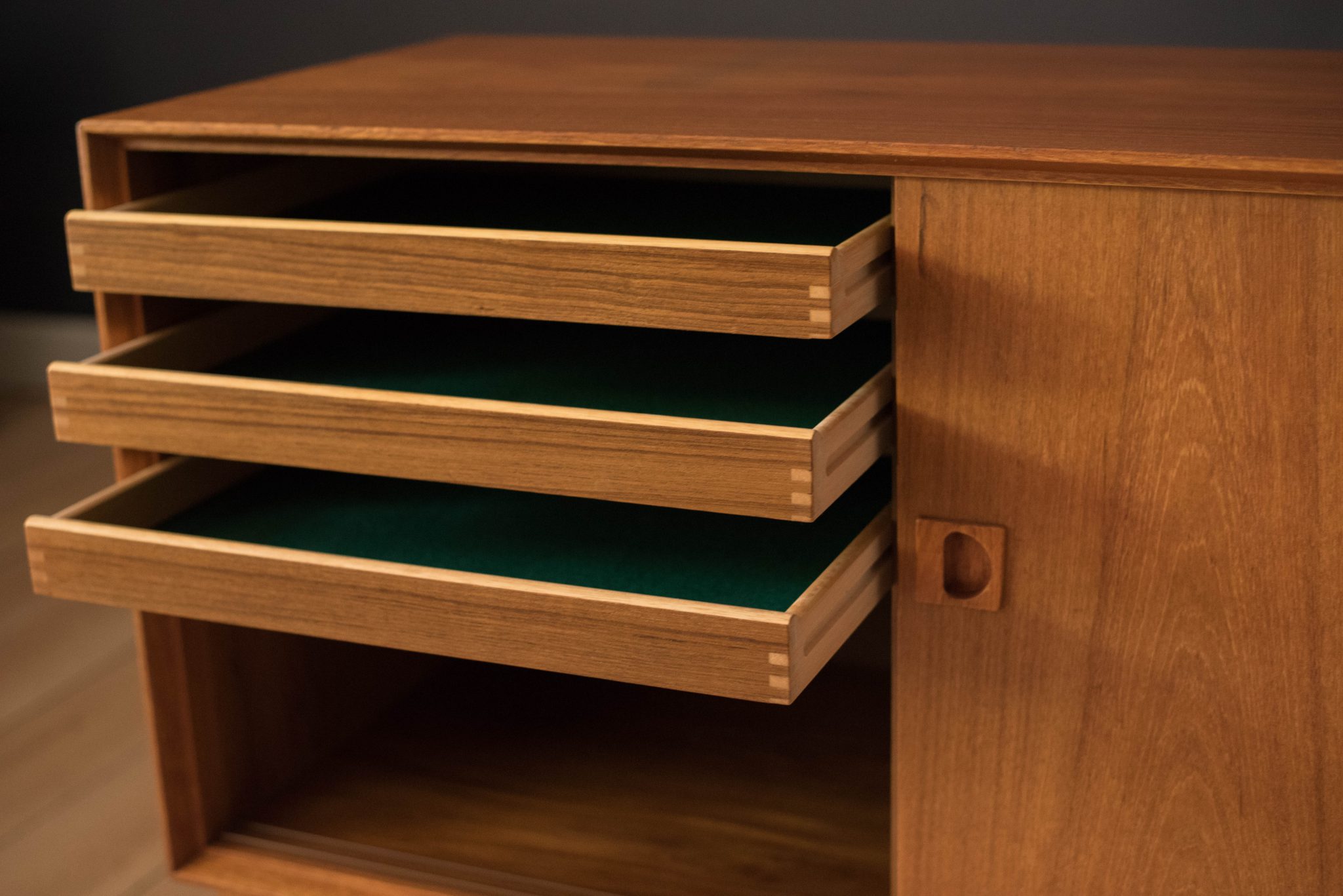 Mid-Century Modern sideboard credenza in teak manufactured by Dyrlund, circa 1960s. This piece features sliding cabinet doors with sculpted handles. Includes three dovetailed drawers and open storage compartments with adjustable shelving. Supported by a solid teak base constructed of finger jointed legs.