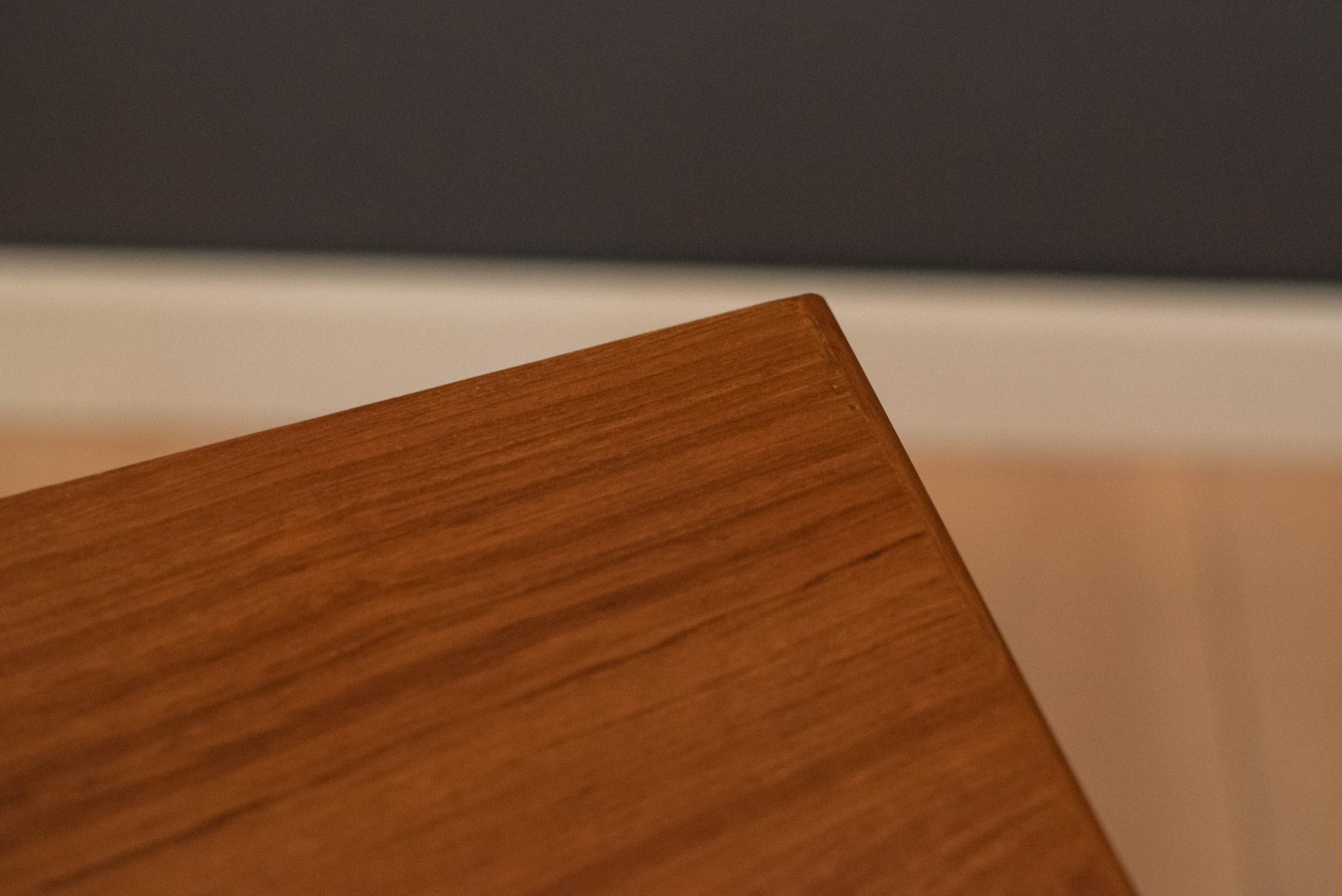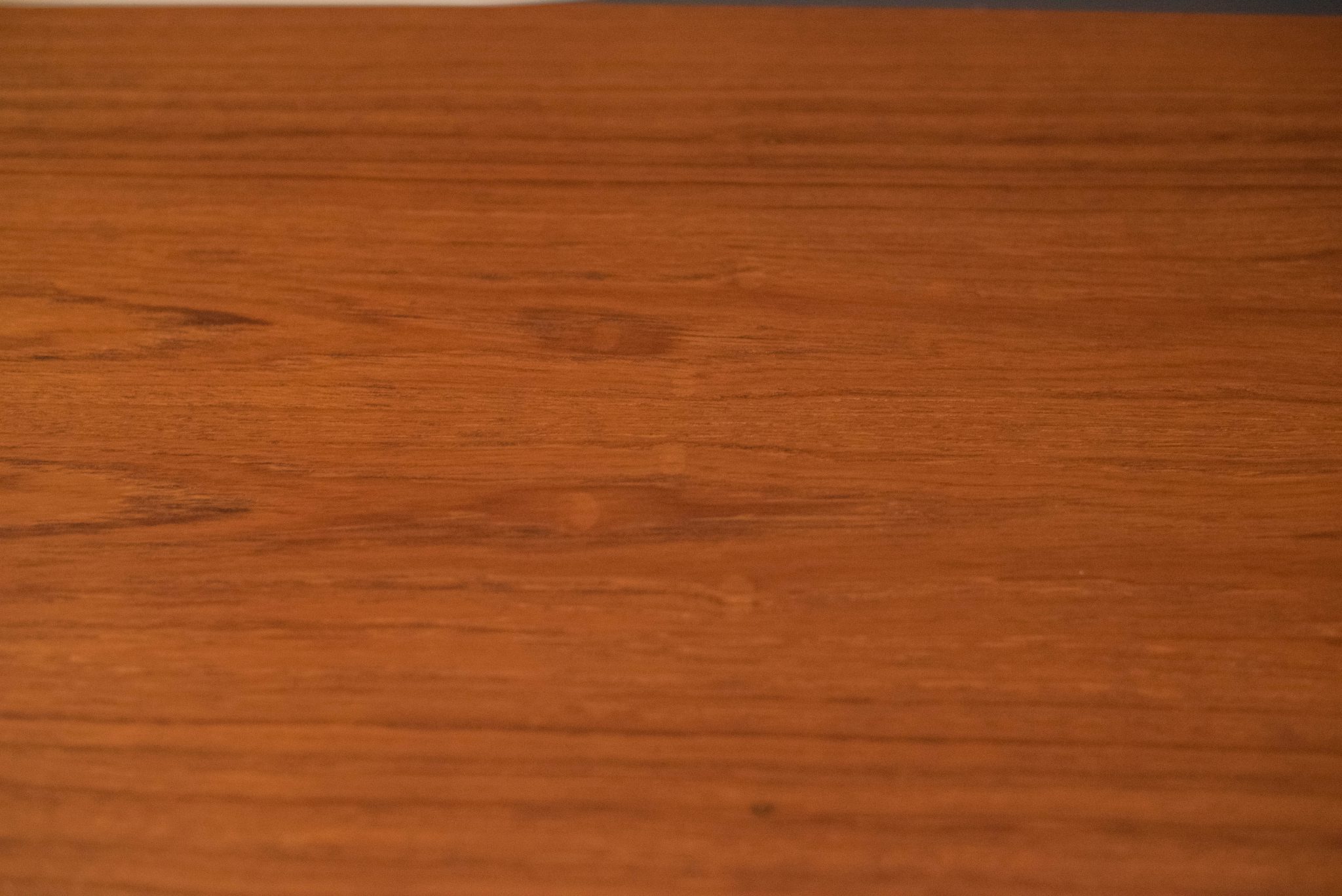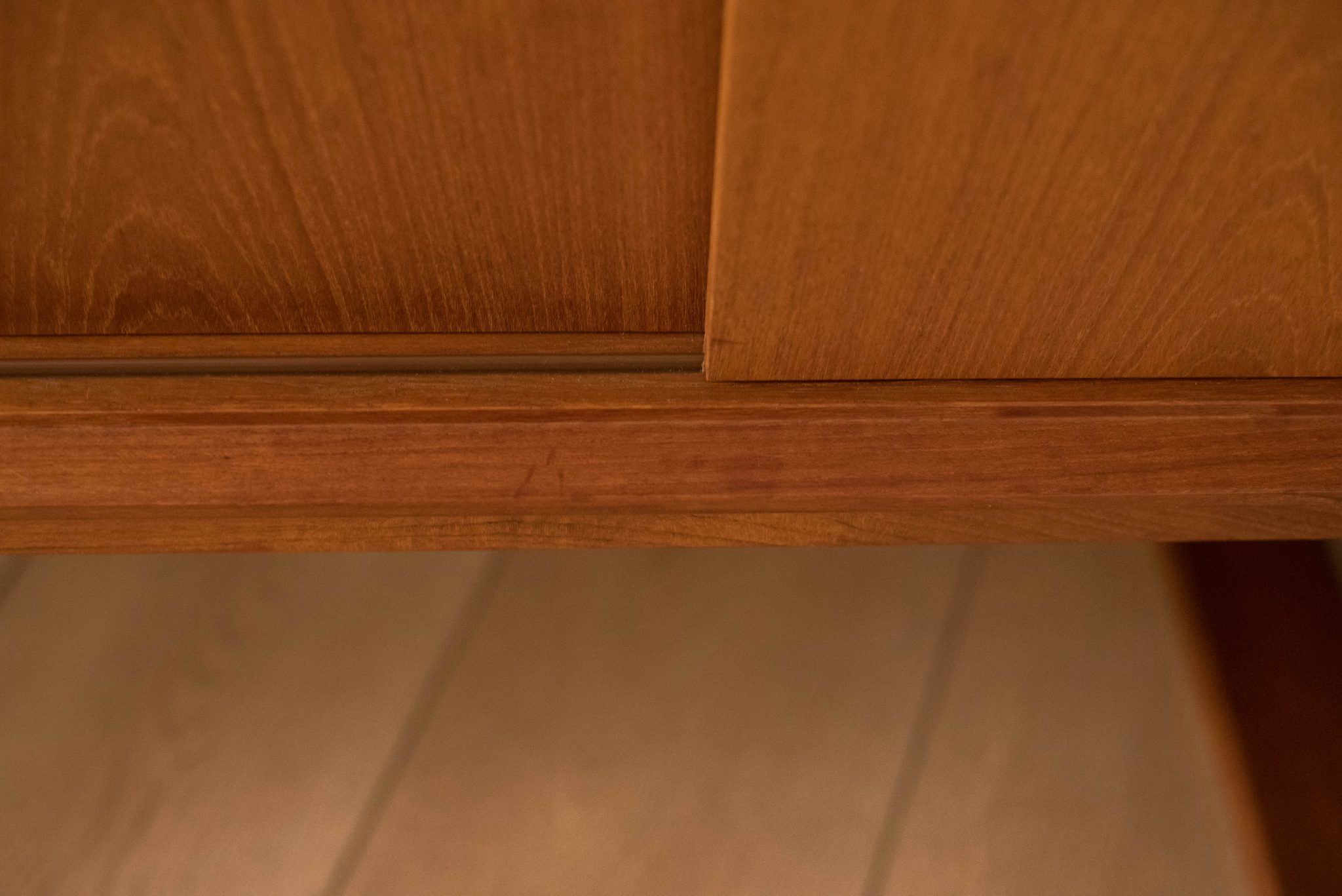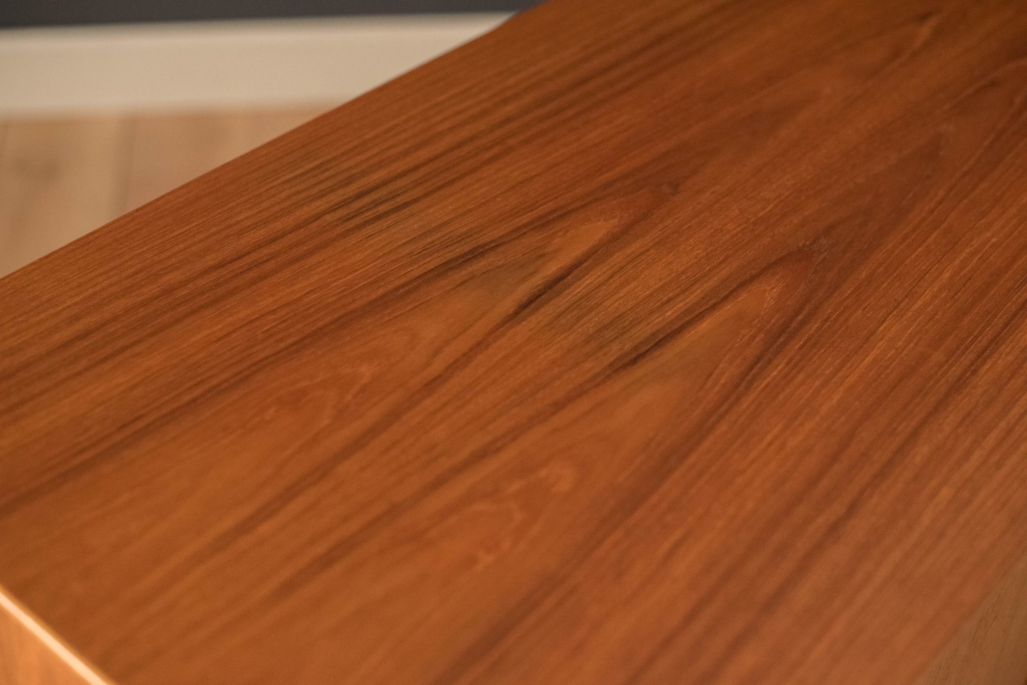 Mid-Century Modern sideboard credenza in teak manufactured by Dyrlund, circa 1960s. This piece features sliding cabinet doors with sculpted handles. Includes three dovetailed drawers and open storage compartments with adjustable shelving. Supported by a solid teak base constructed of finger jointed legs.