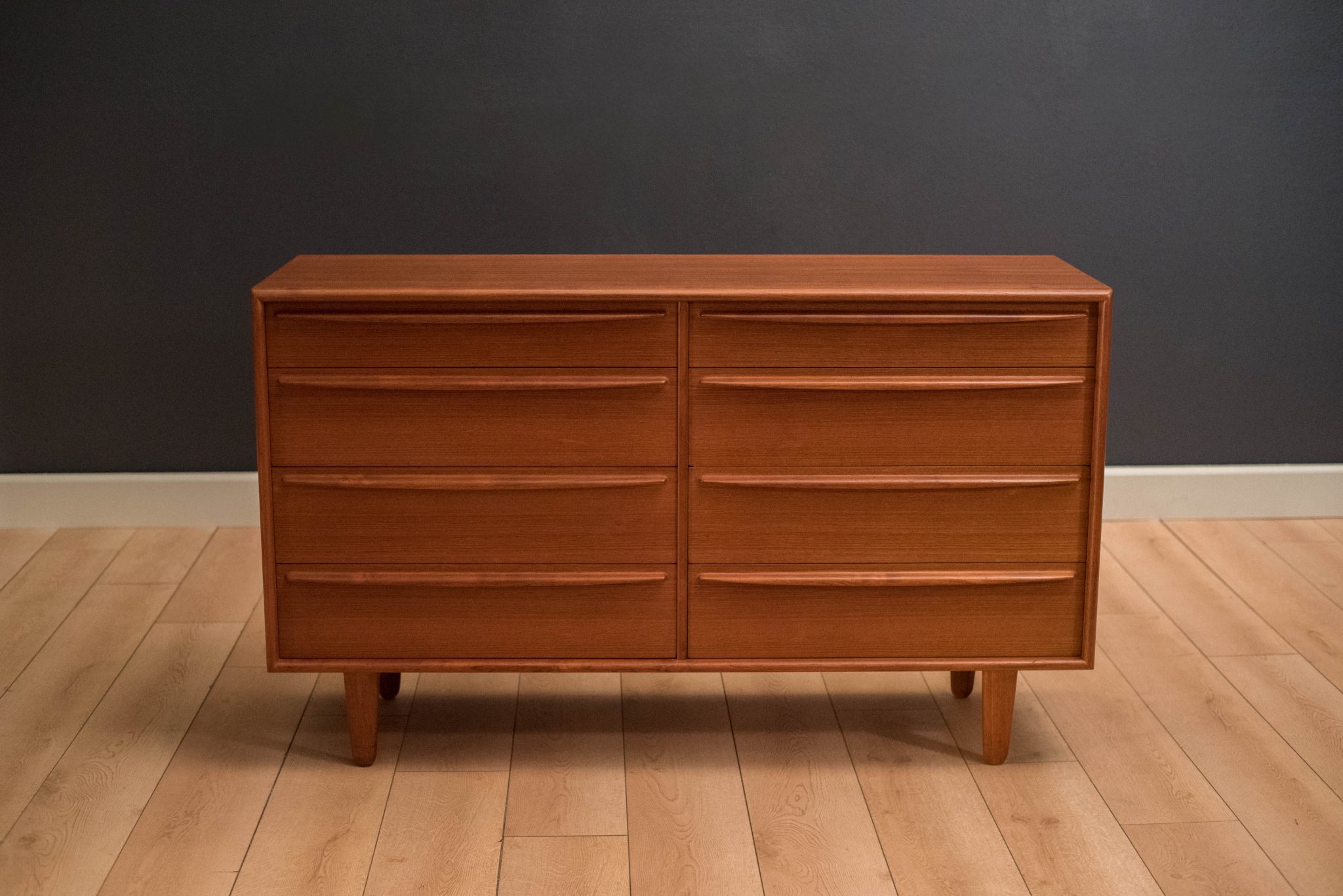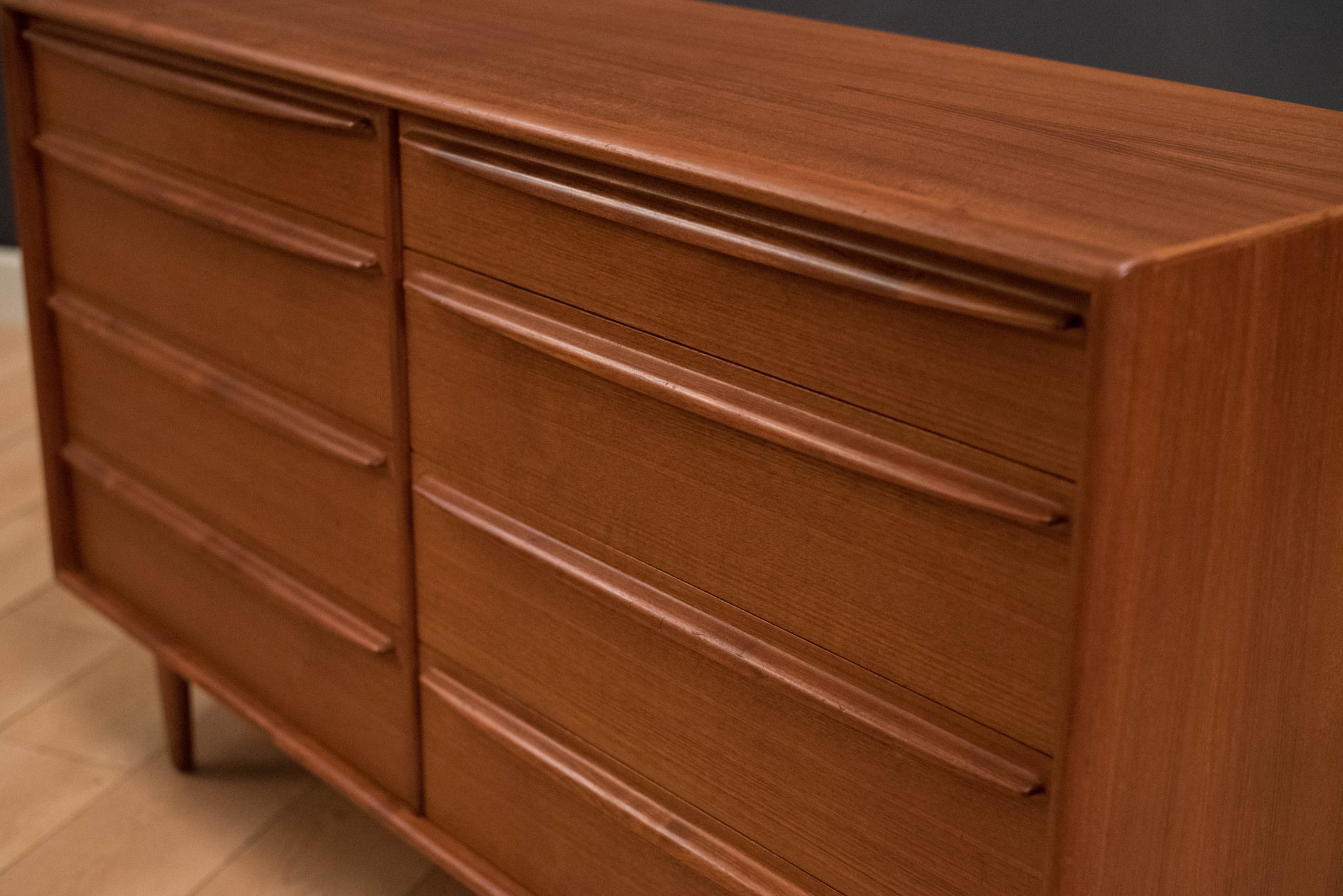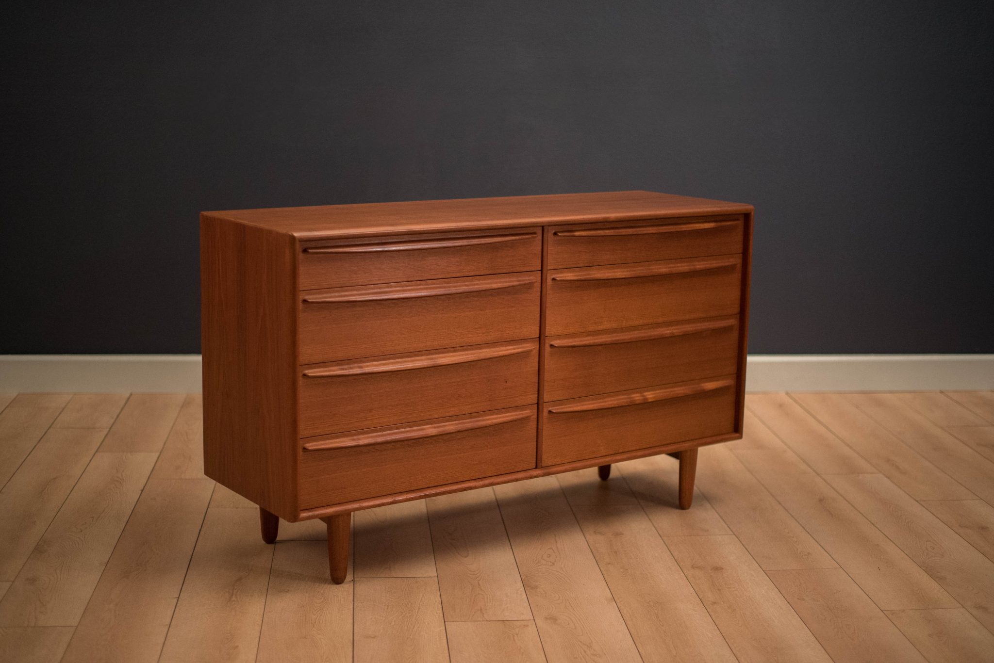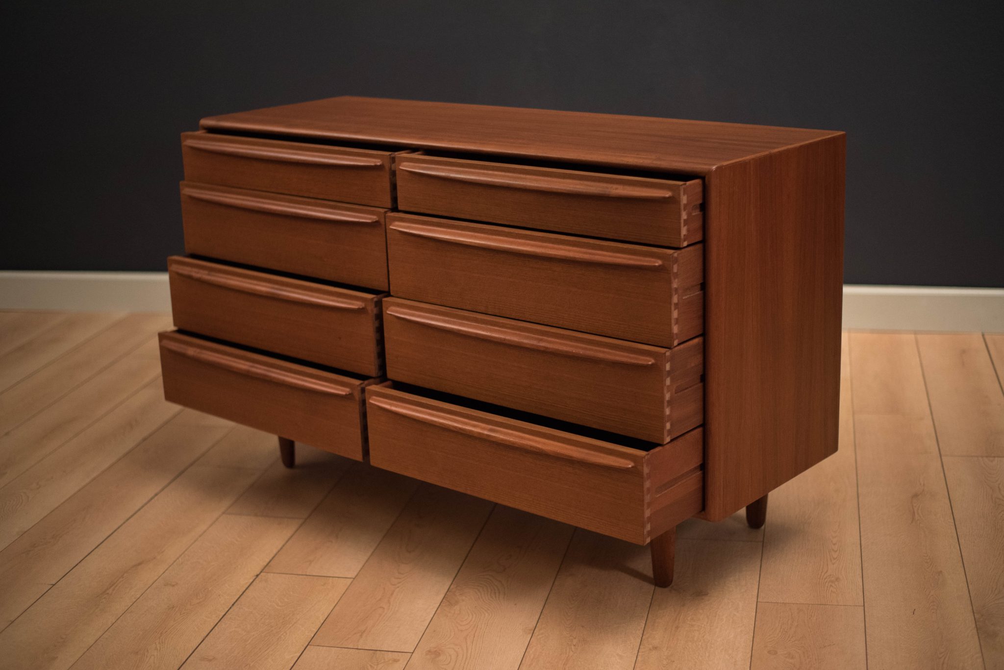 Mid-Century Modern dresser designed by Svend Madsen in teak. This piece features sculpted handles and includes eight dovetailed drawers.