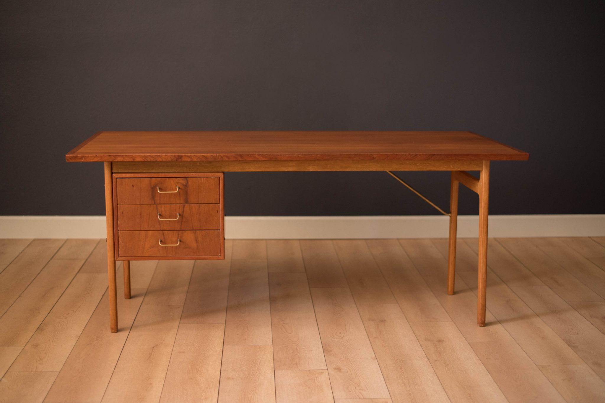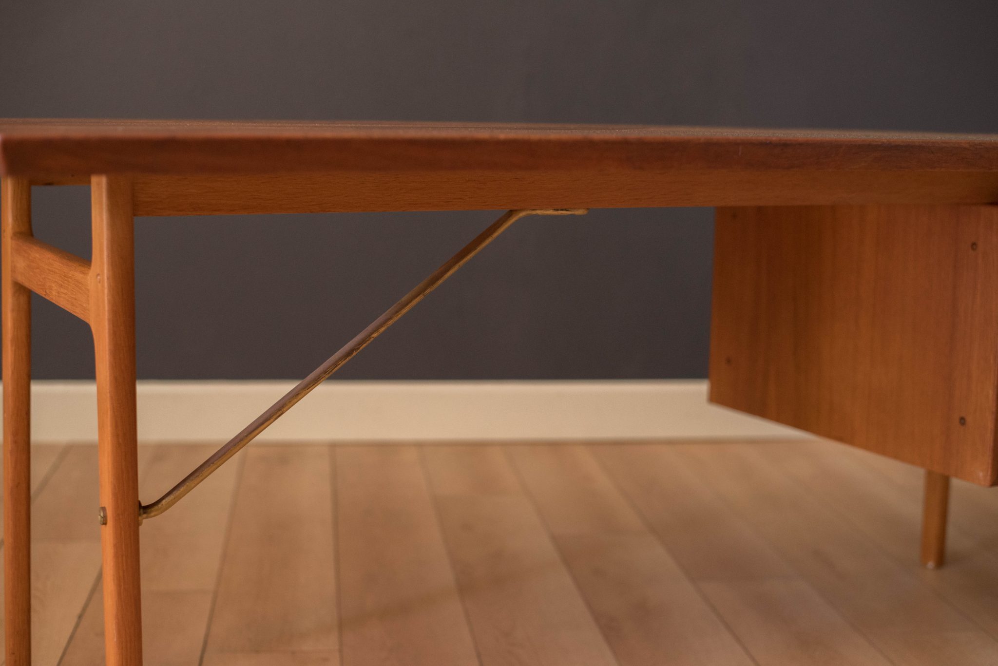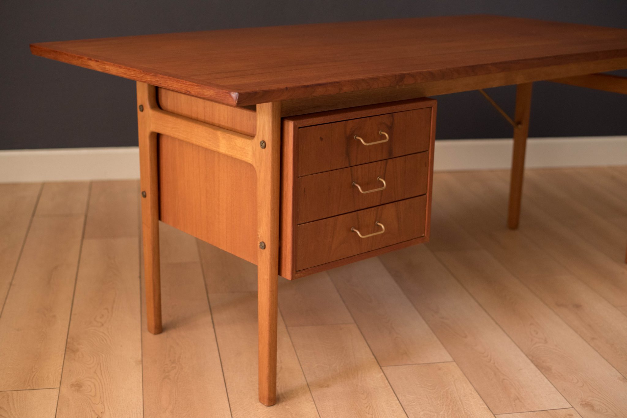 Mid century writing desk designed by Torben Strandgaard for Falster Mobelfabrik. This piece features a large teak desktop equipped with three dovetailed drawers and brass accents. Supporting leg base is made of oak.