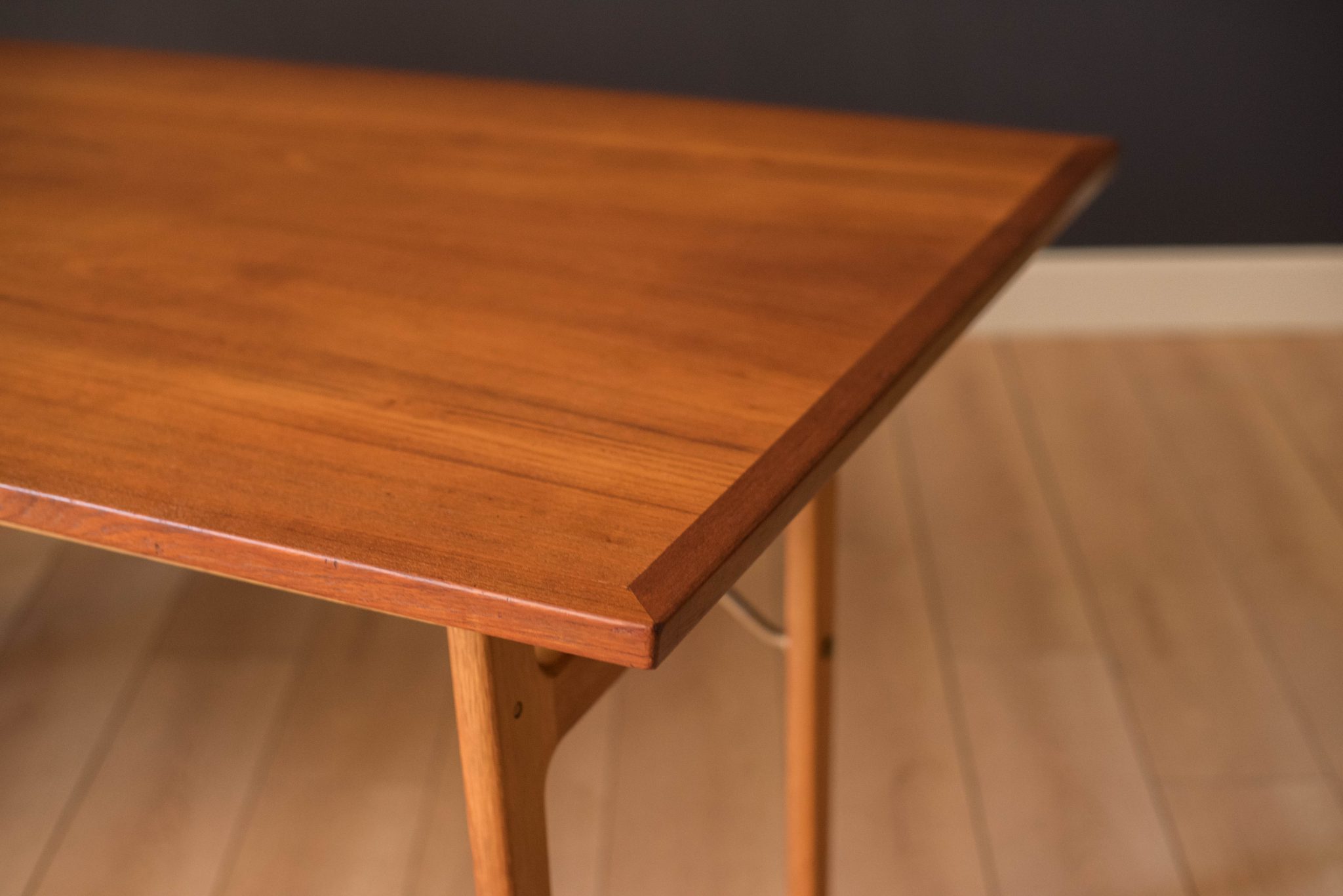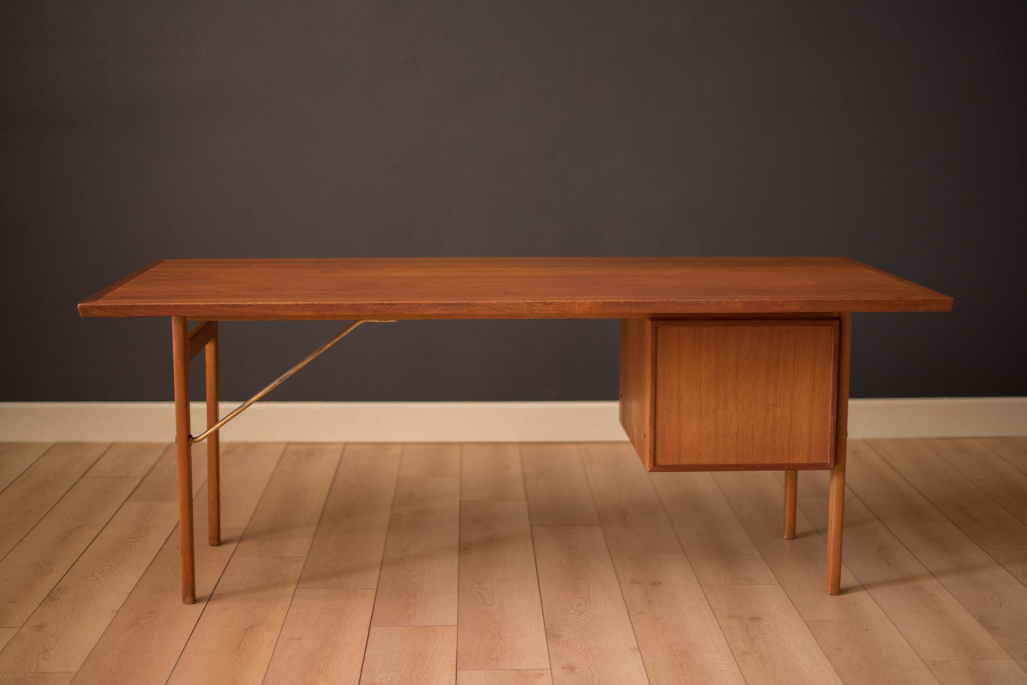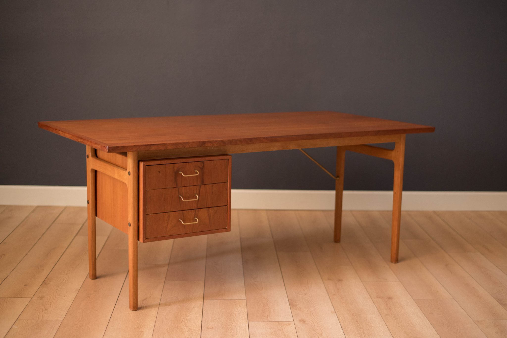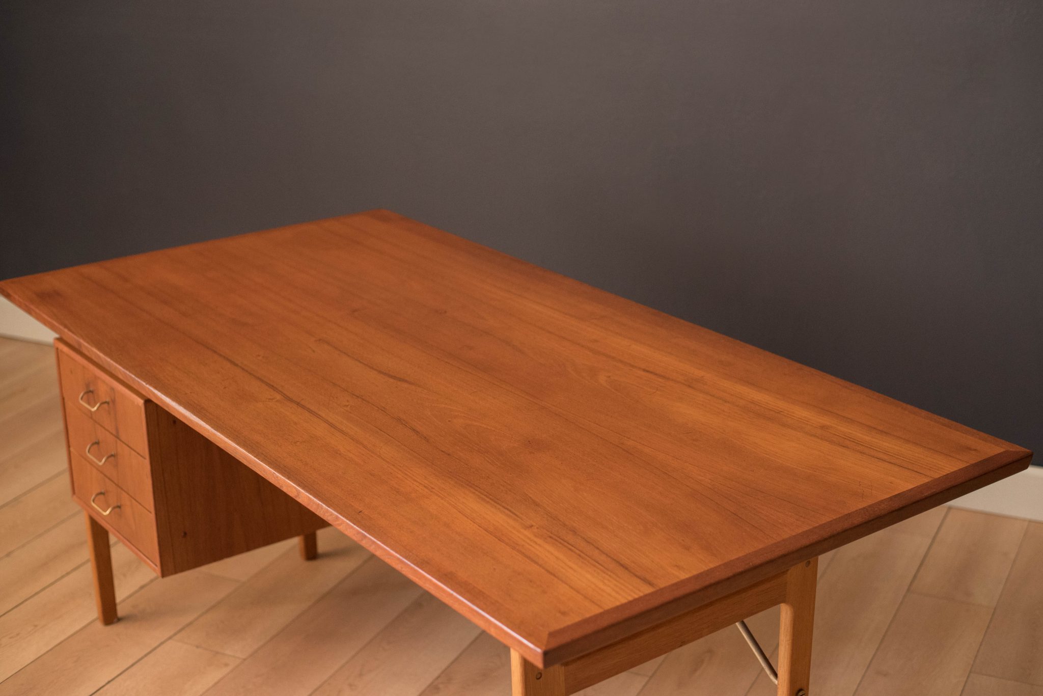 Mid century writing desk designed by Torben Strandgaard for Falster Mobelfabrik. This piece features a large teak desktop equipped with three dovetailed drawers and brass accents. Supporting leg base is made of oak.