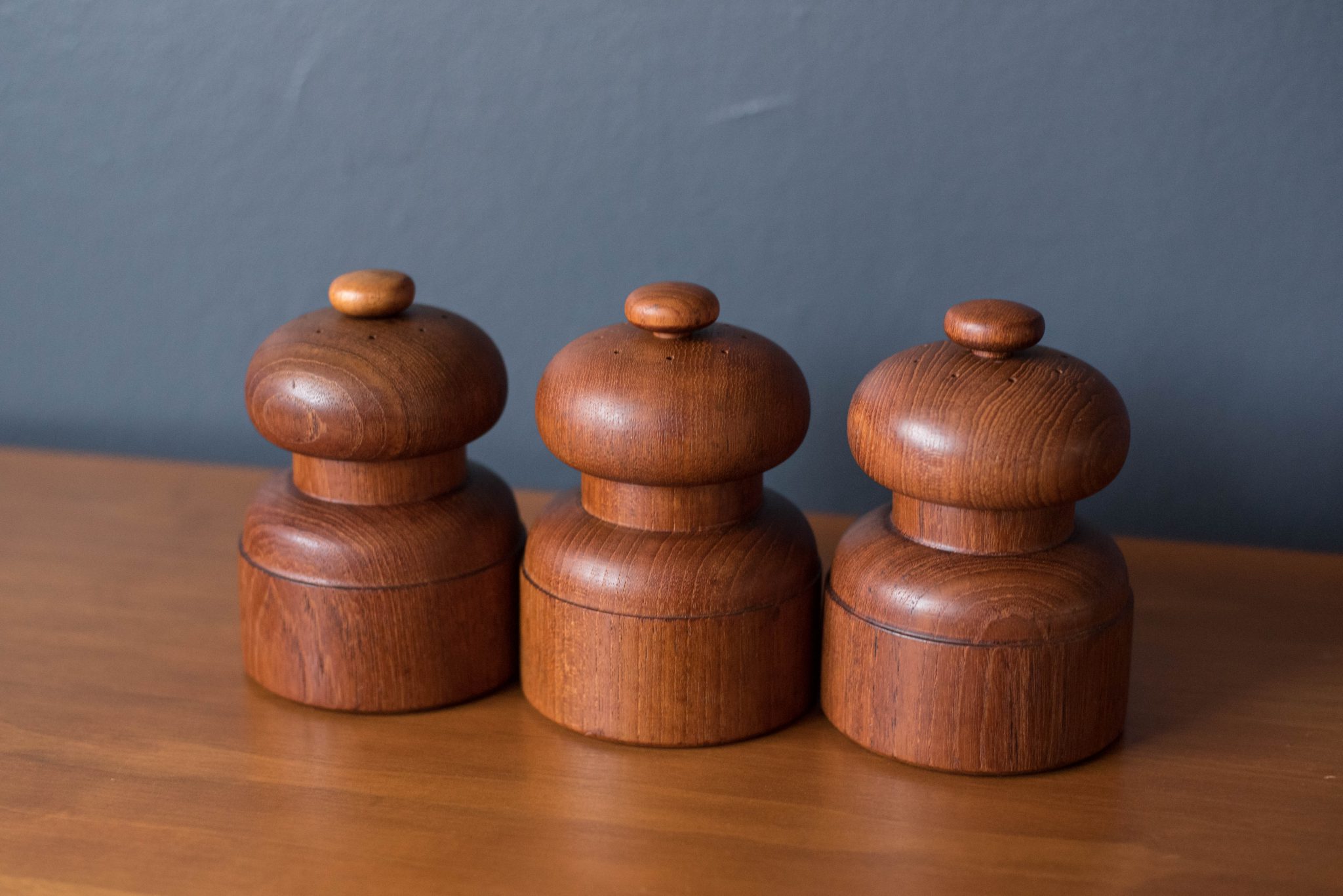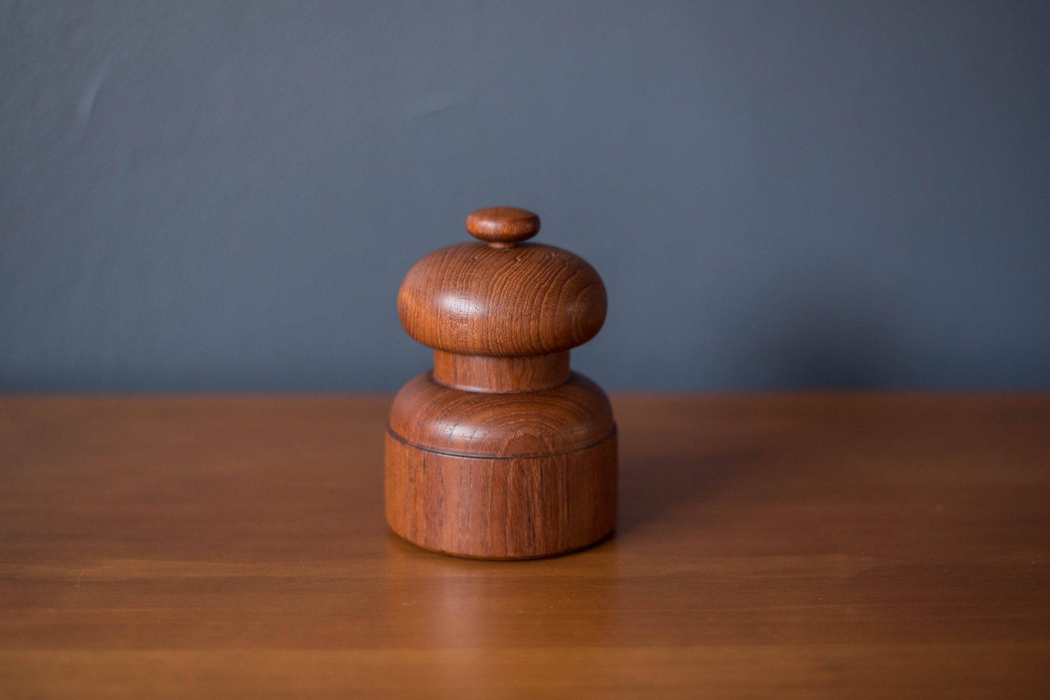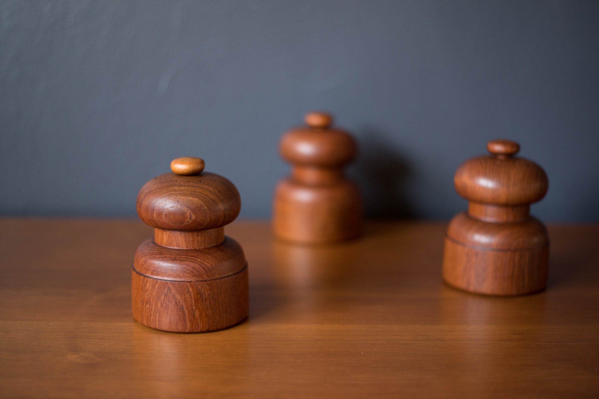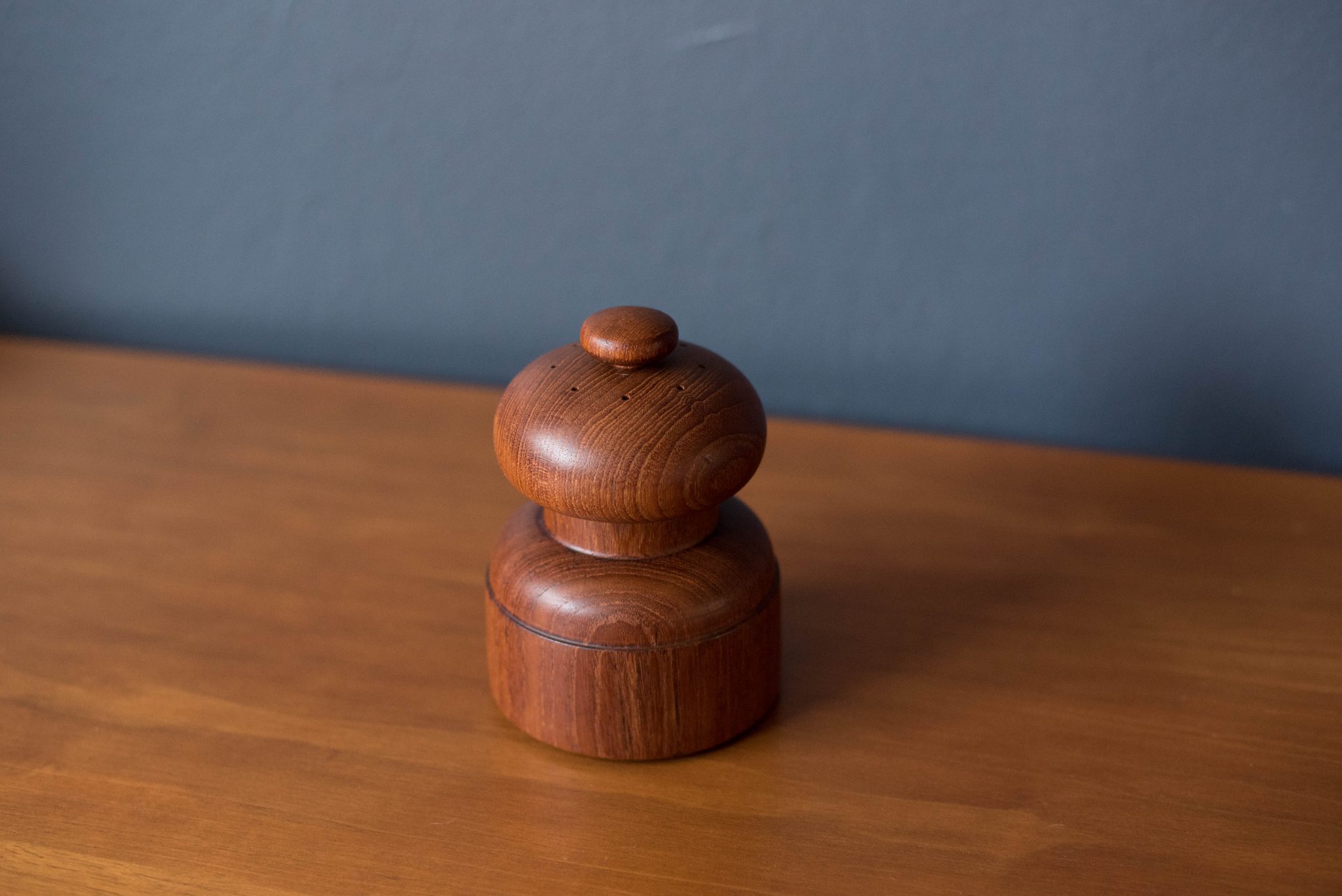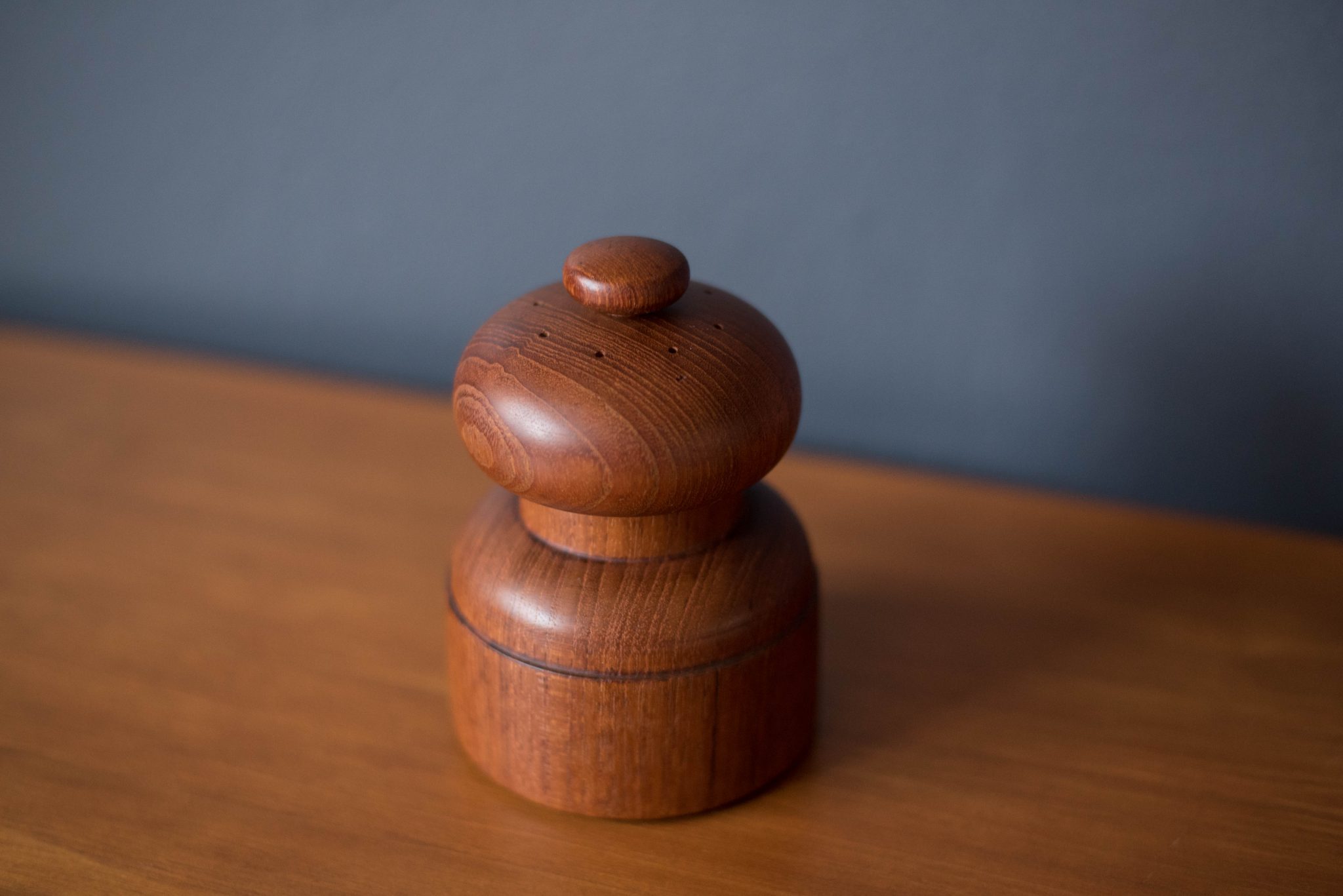 Mid-century modern collectible pepper grinders designed by Jens Quistgaard for Dansk. Each piece is made of teak with a salt dispenser on the top. Marked Denmark on the bottom. Price is for each, two left.