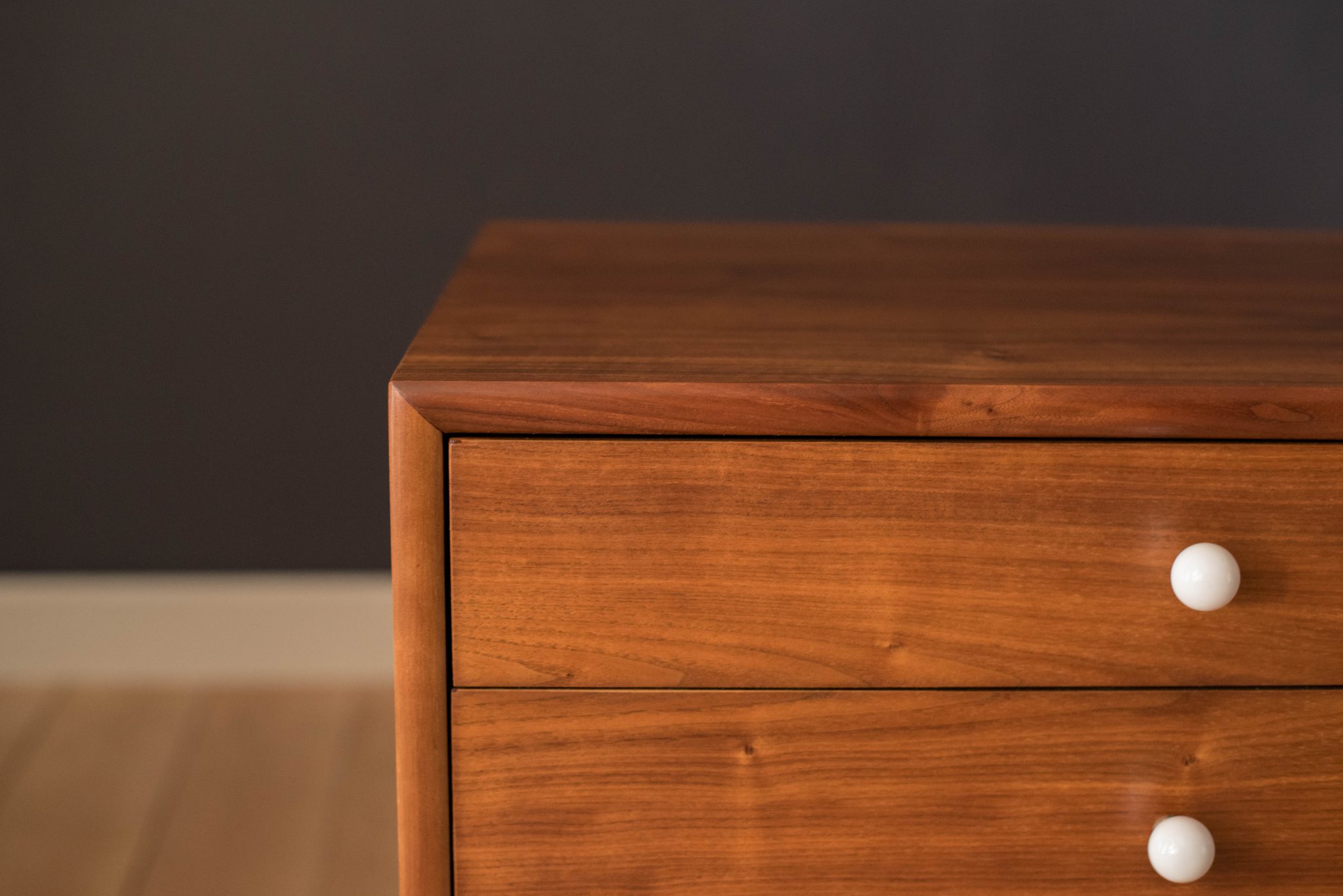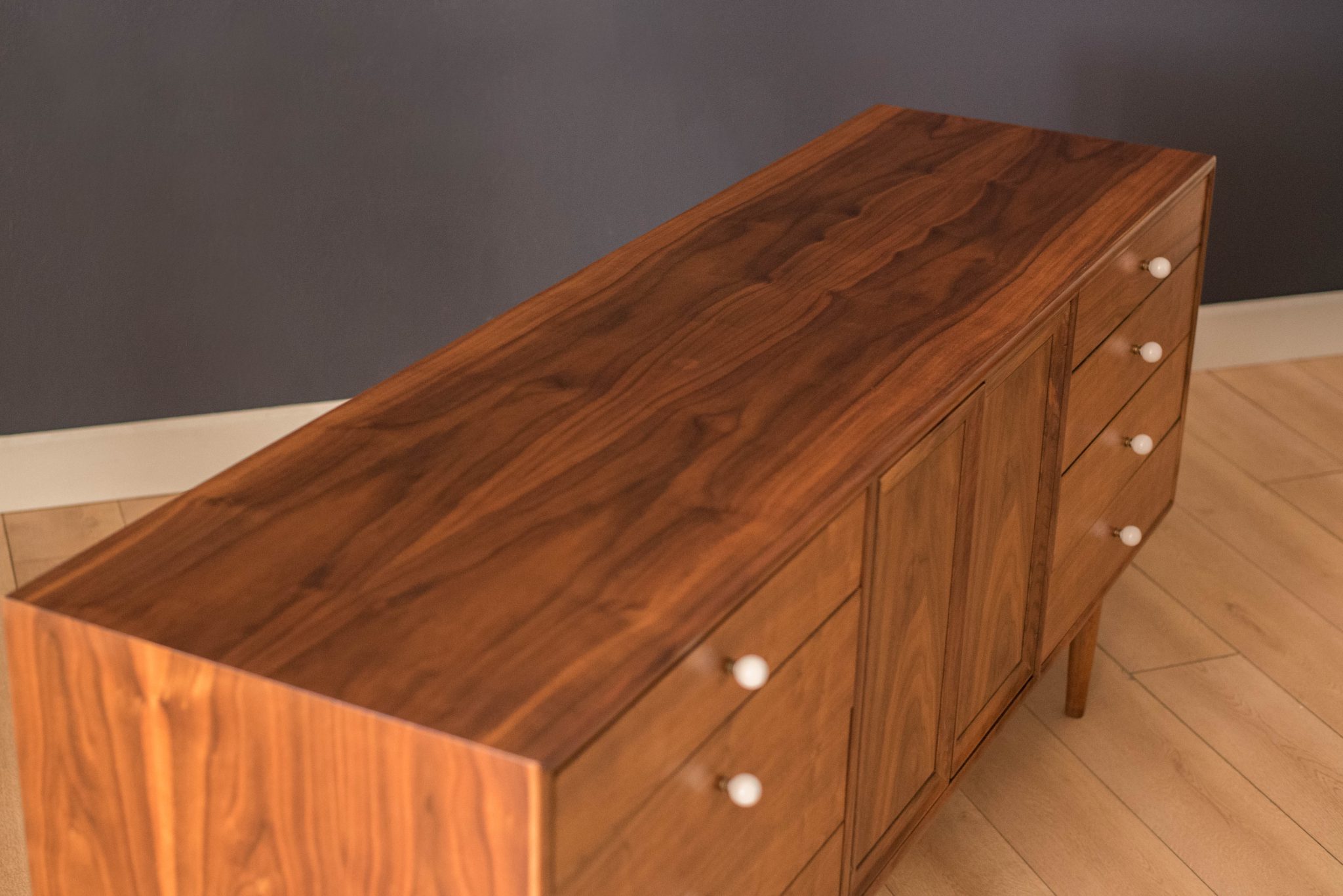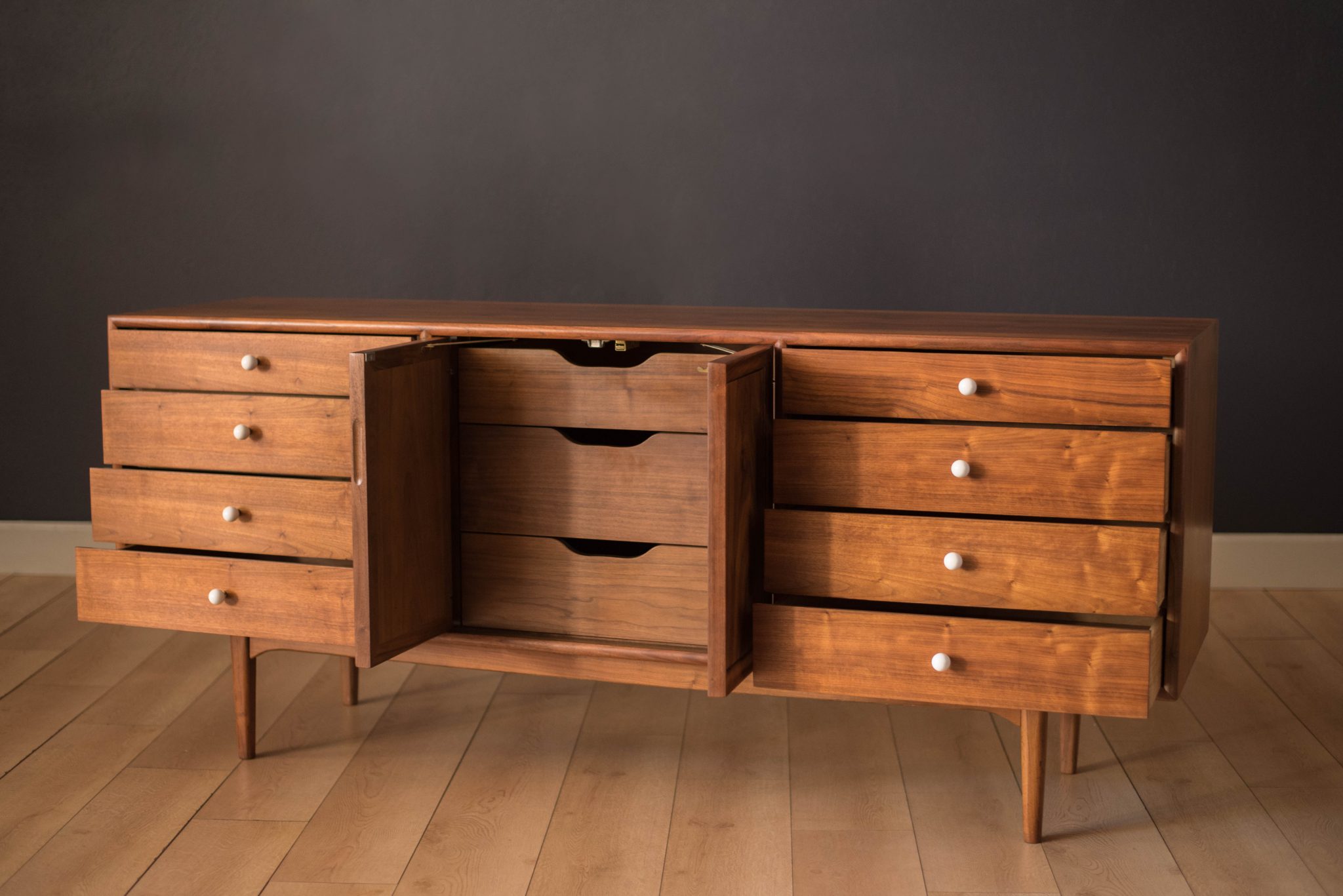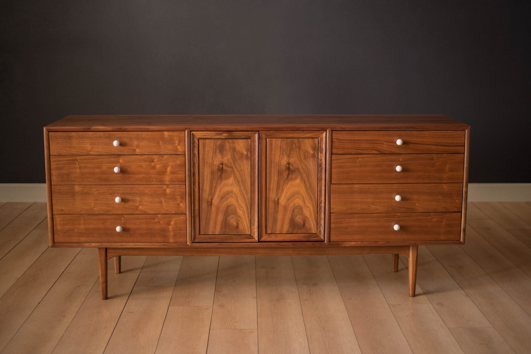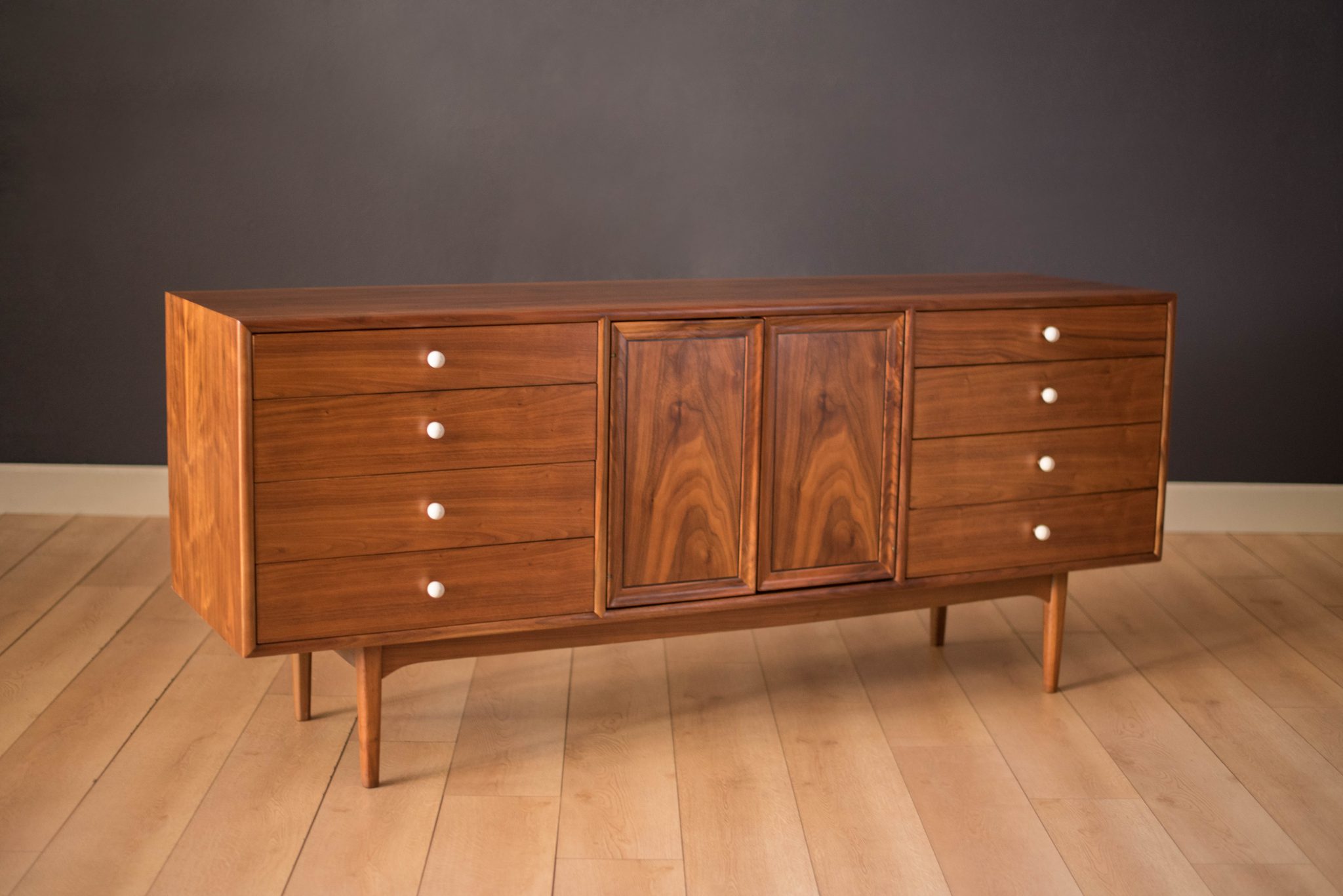 Mid century Drexel declaration dresser designed by Kipp Stewart and Stewart MacDougall. This piece features bookmatched black walnut grains highlighted by the collection’s signature white porcelain and brass pulls. Offers plenty of storage including eleven dovetailed drawers.