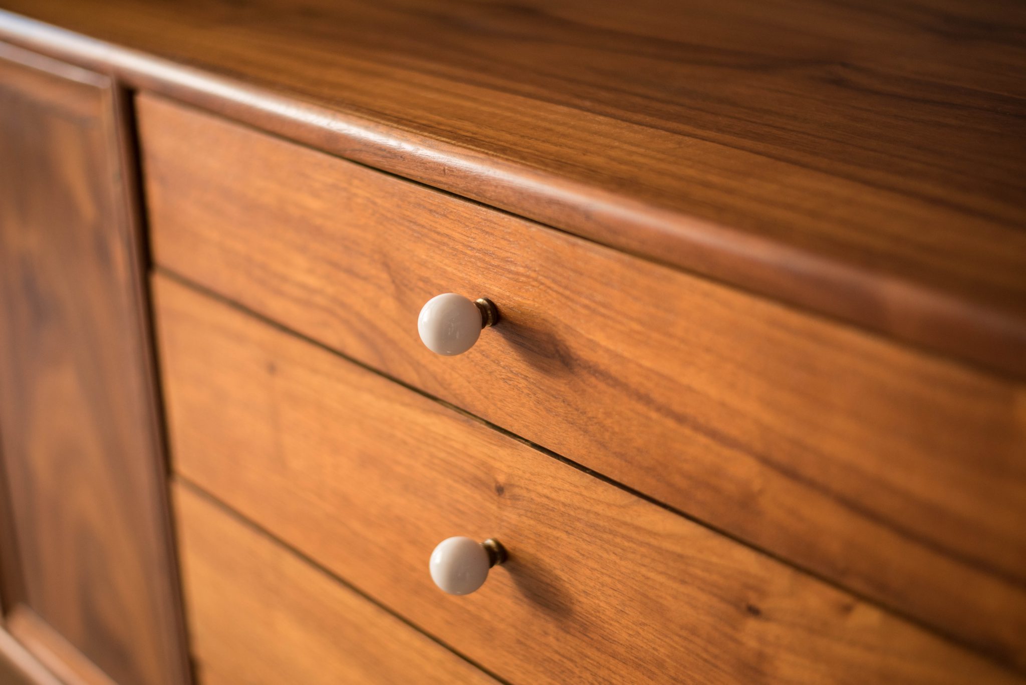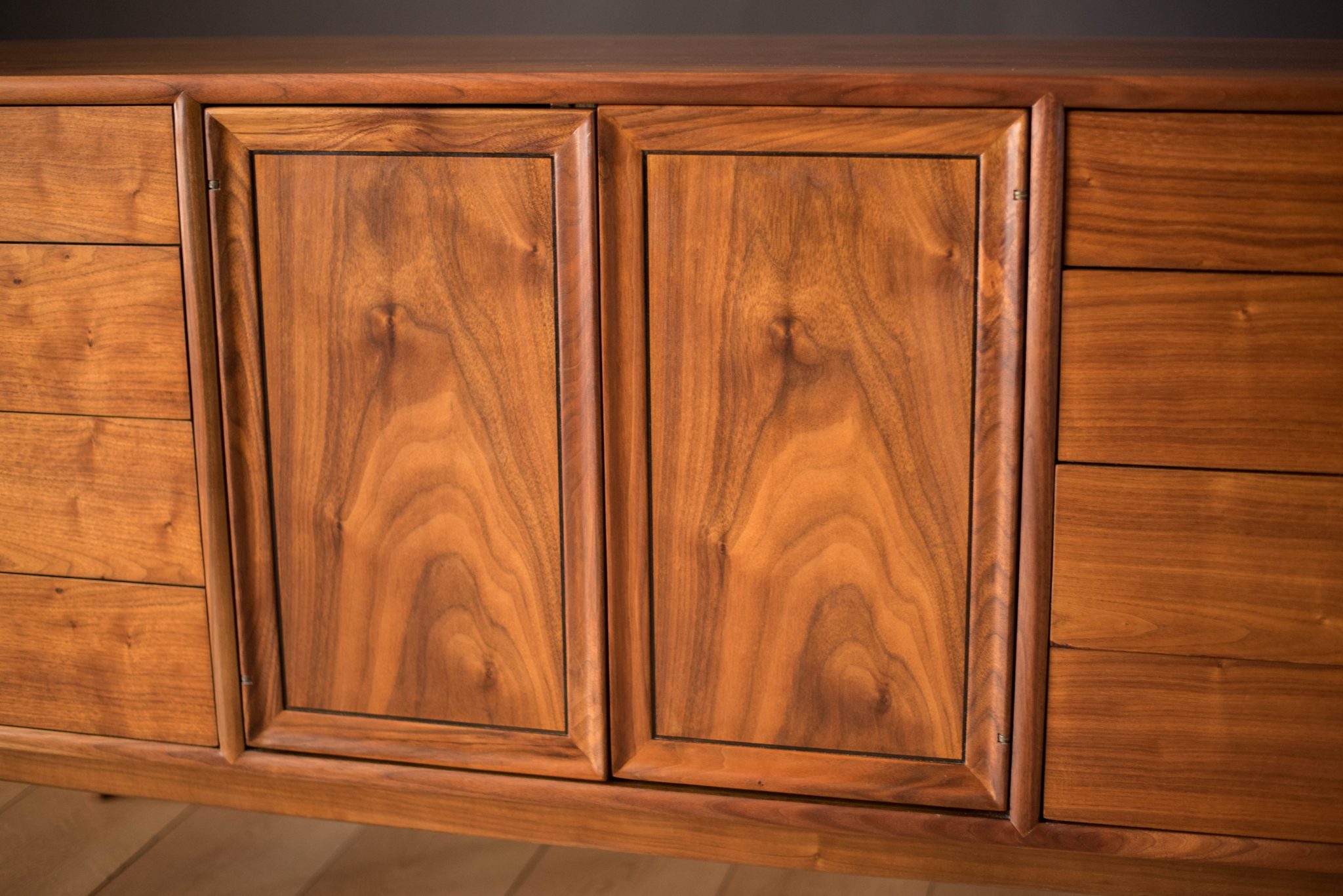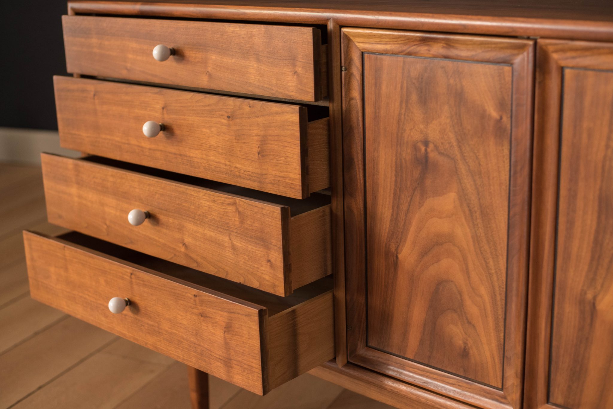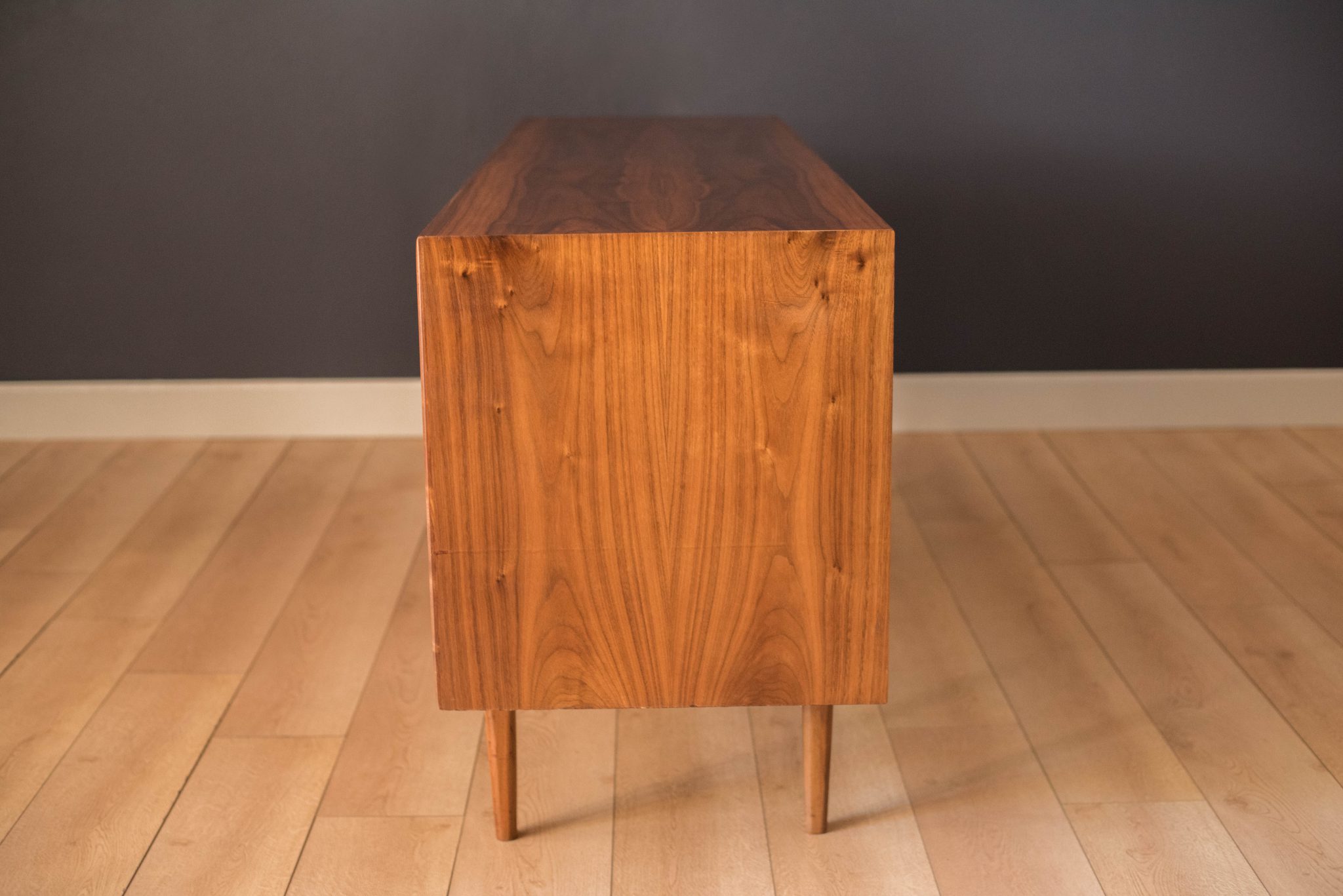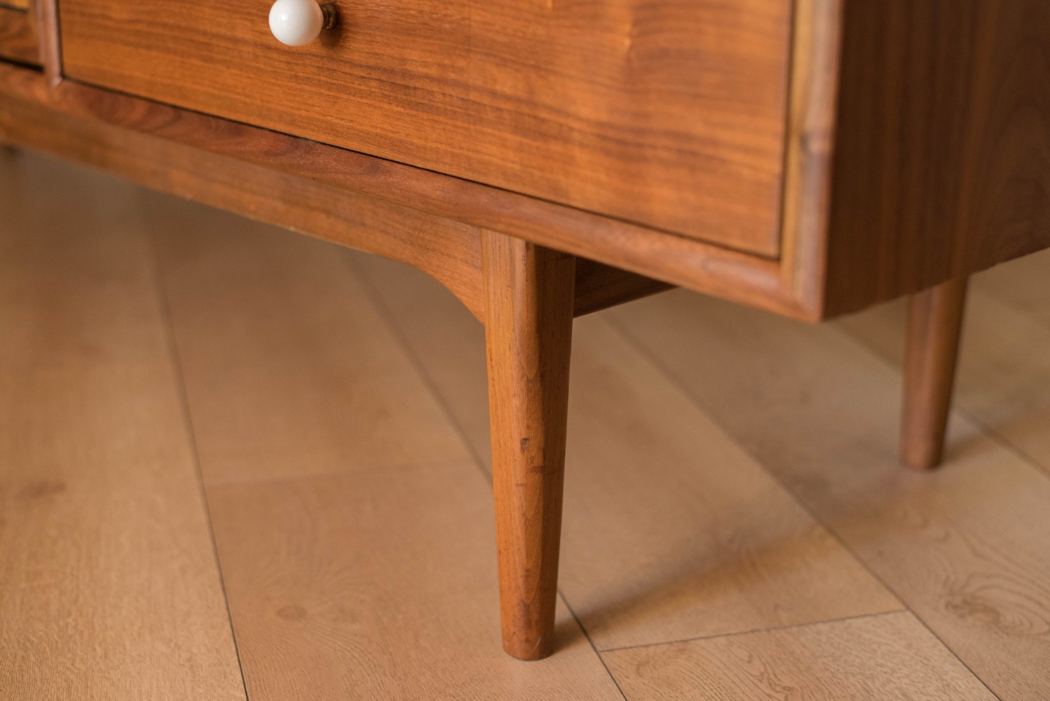 Mid century Drexel declaration dresser designed by Kipp Stewart and Stewart MacDougall. This piece features bookmatched black walnut grains highlighted by the collection’s signature white porcelain and brass pulls. Offers plenty of storage including eleven dovetailed drawers.