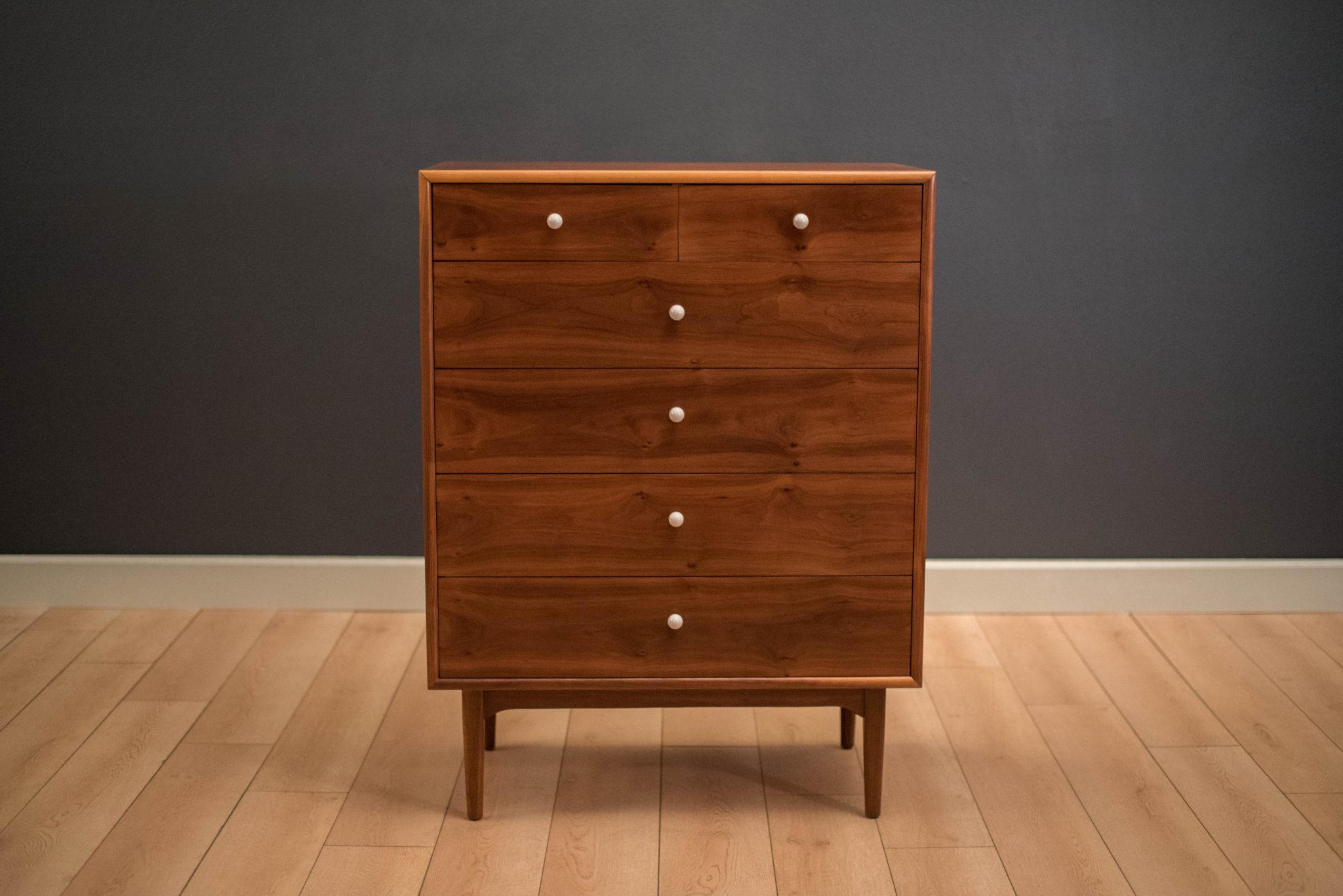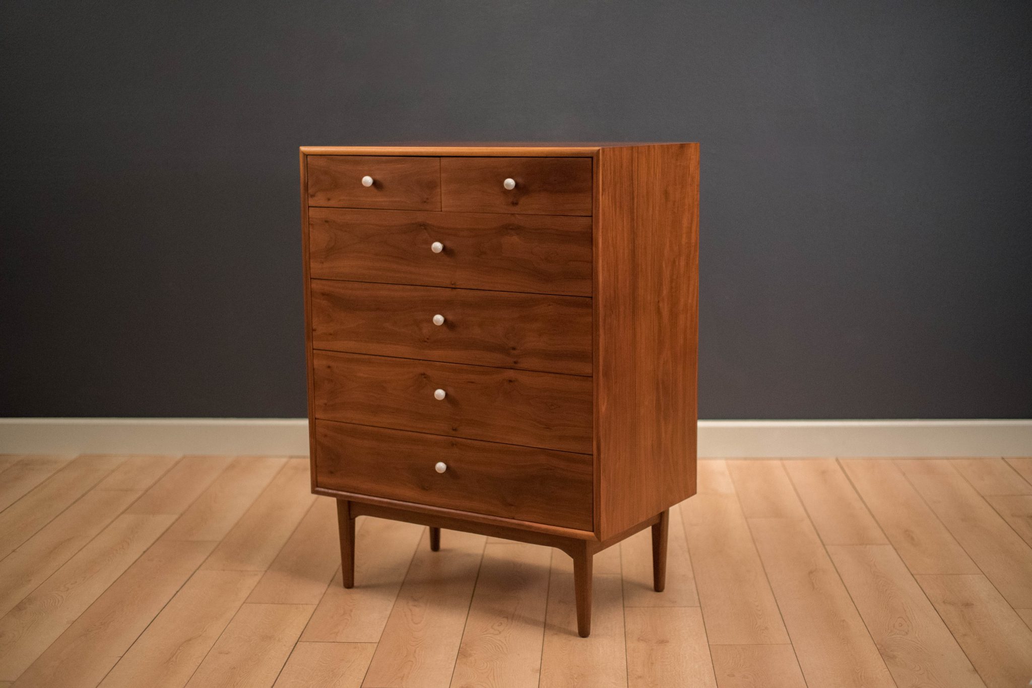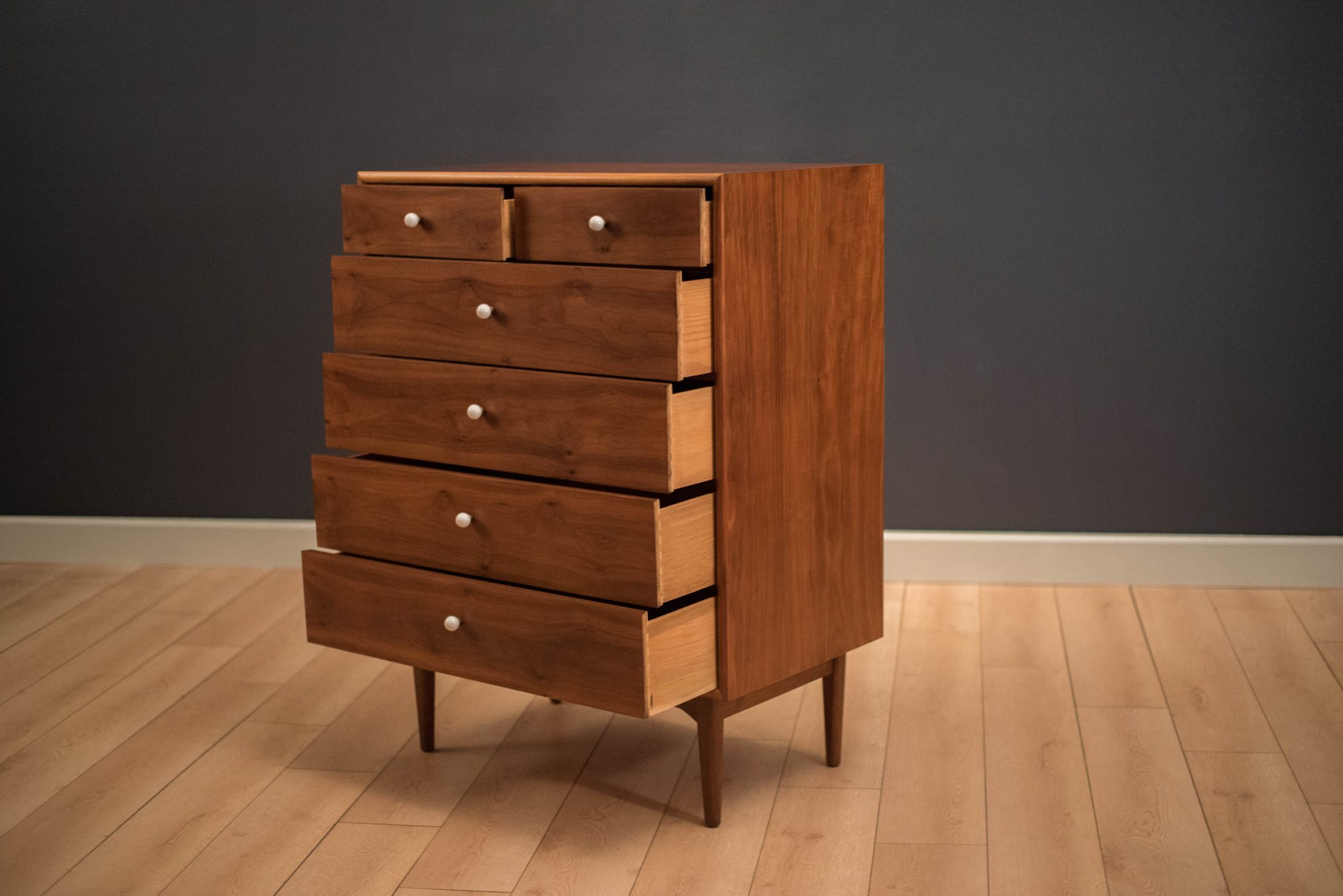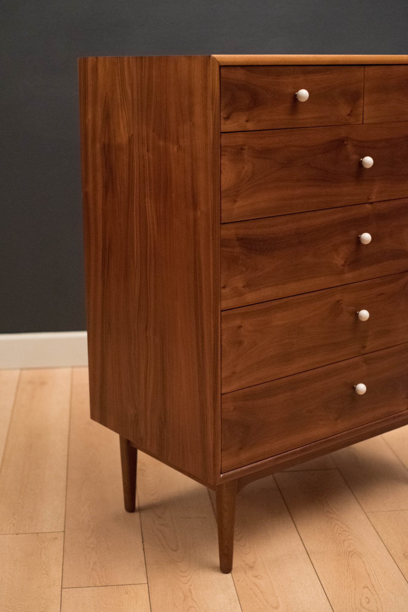 Mid Century Drexel declaration highboy dresser by Kipp Stewart & Stewart McDougall. This piece displays continuous black walnut grains and includes six dovetailed drawers with the original porcelain white knobs.
