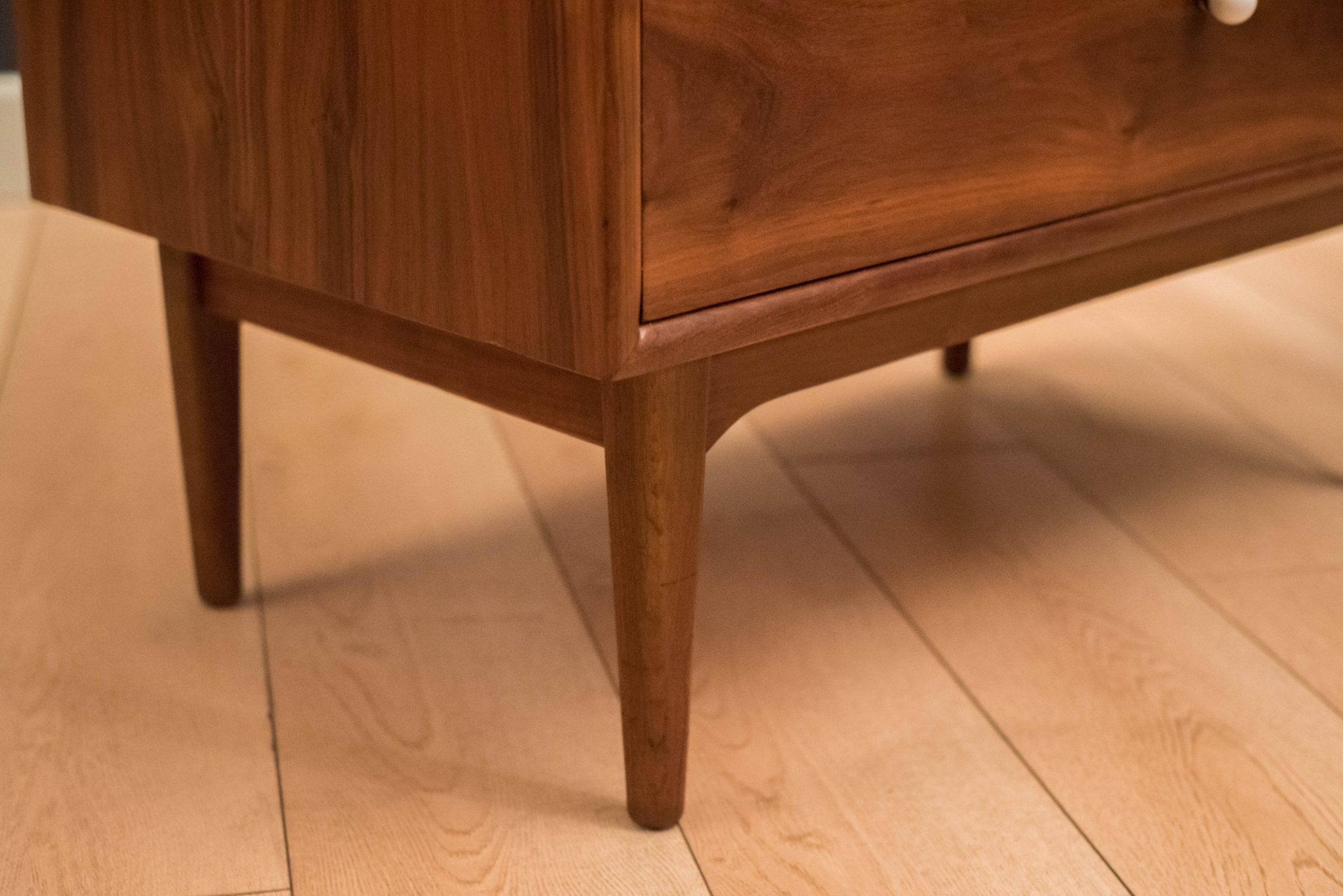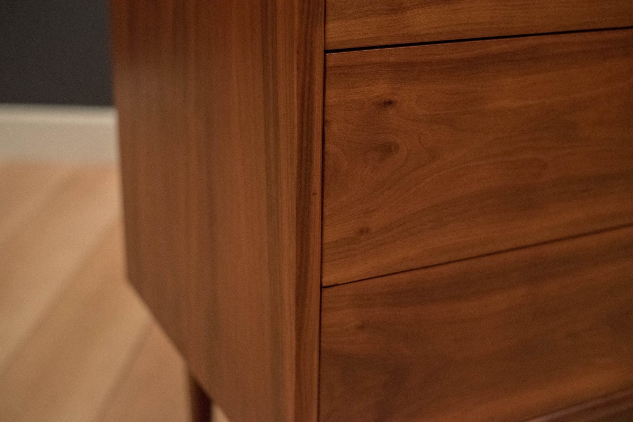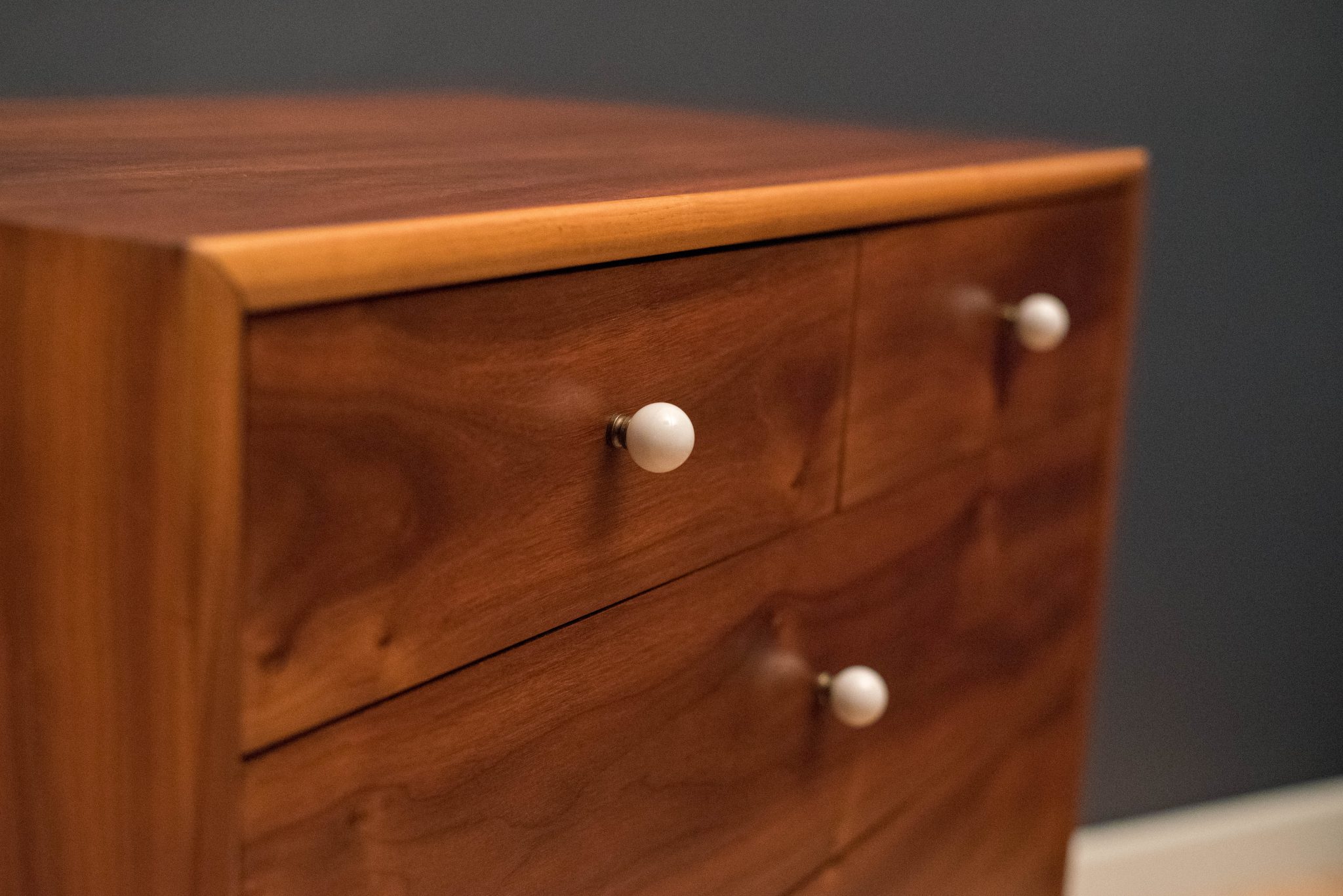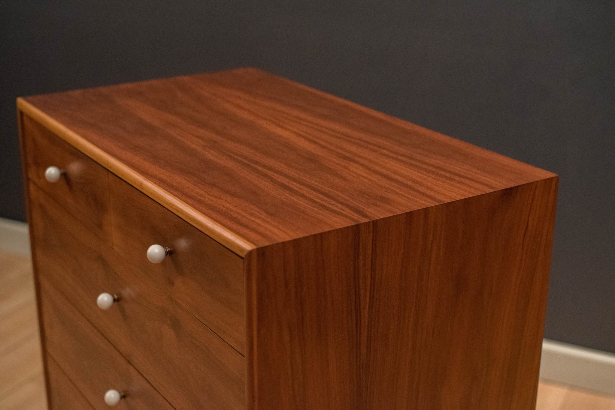 Mid Century Drexel declaration highboy dresser by Kipp Stewart & Stewart McDougall. This piece displays continuous black walnut grains and includes six dovetailed drawers with the original porcelain white knobs.
